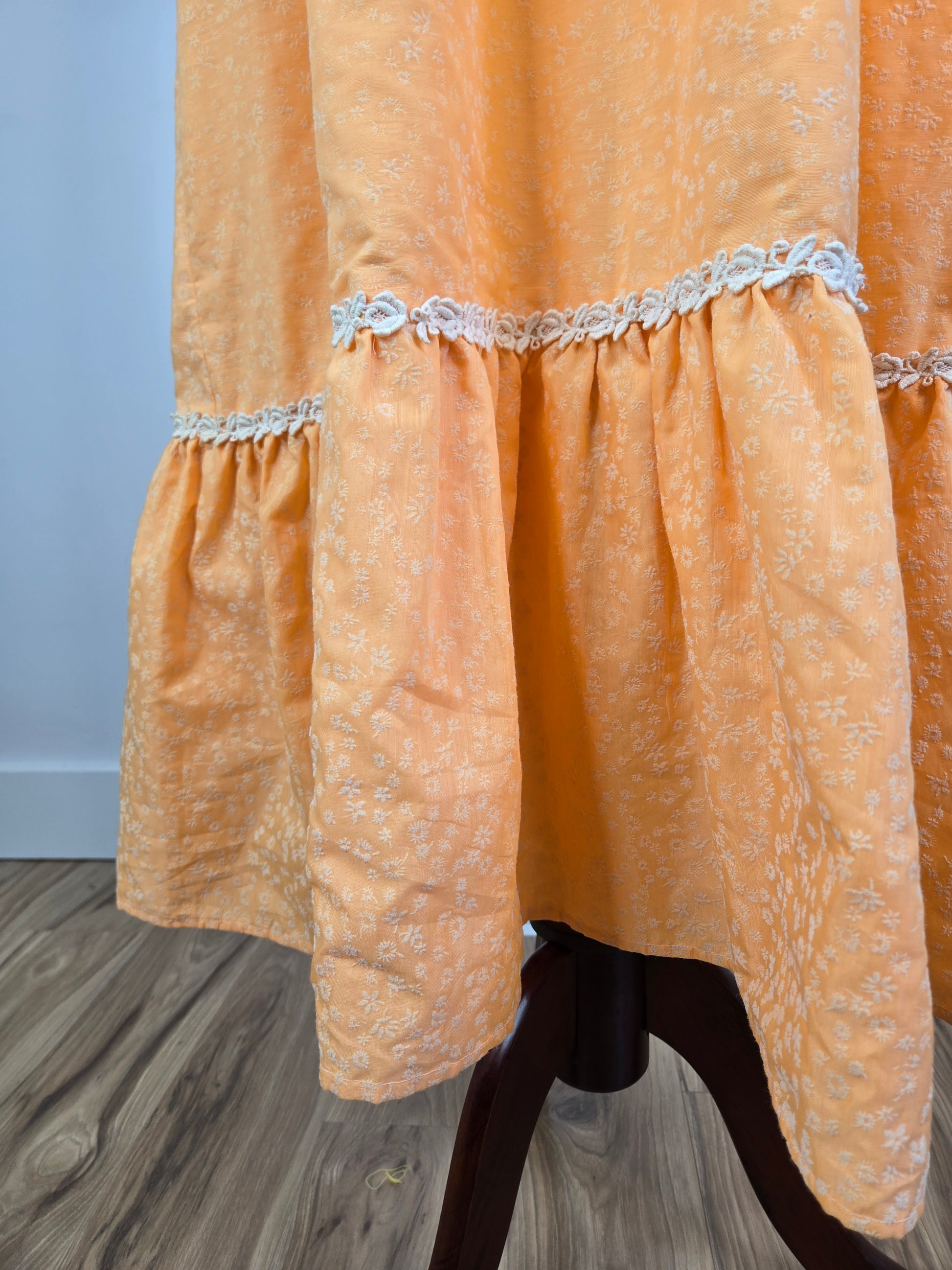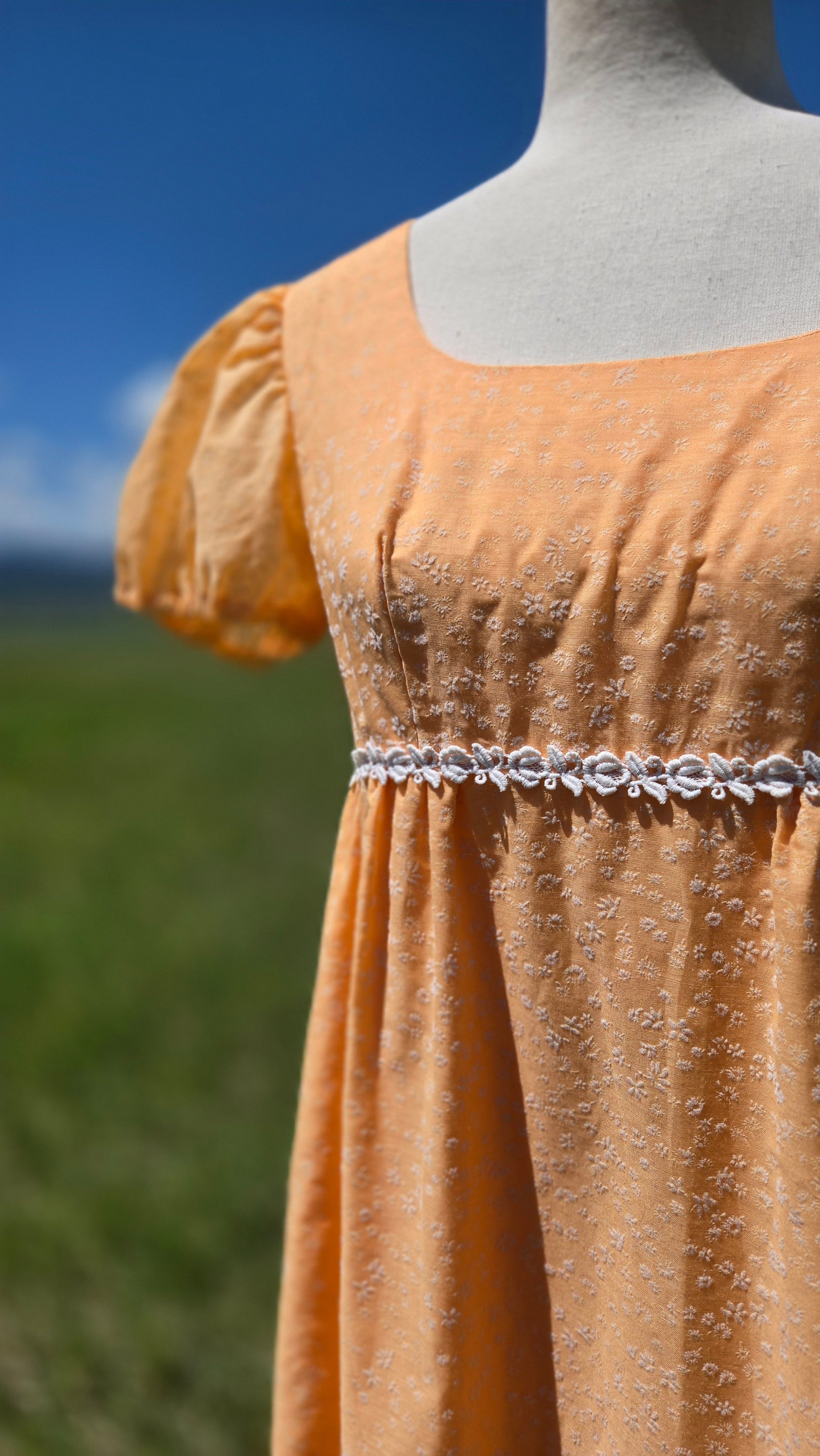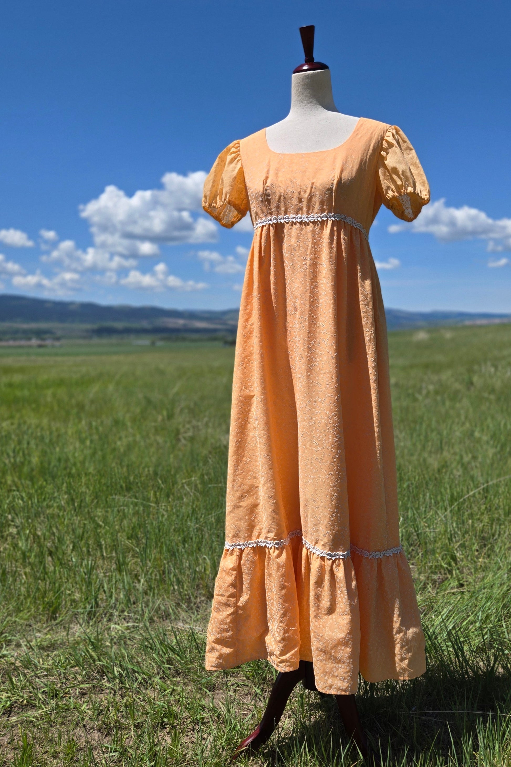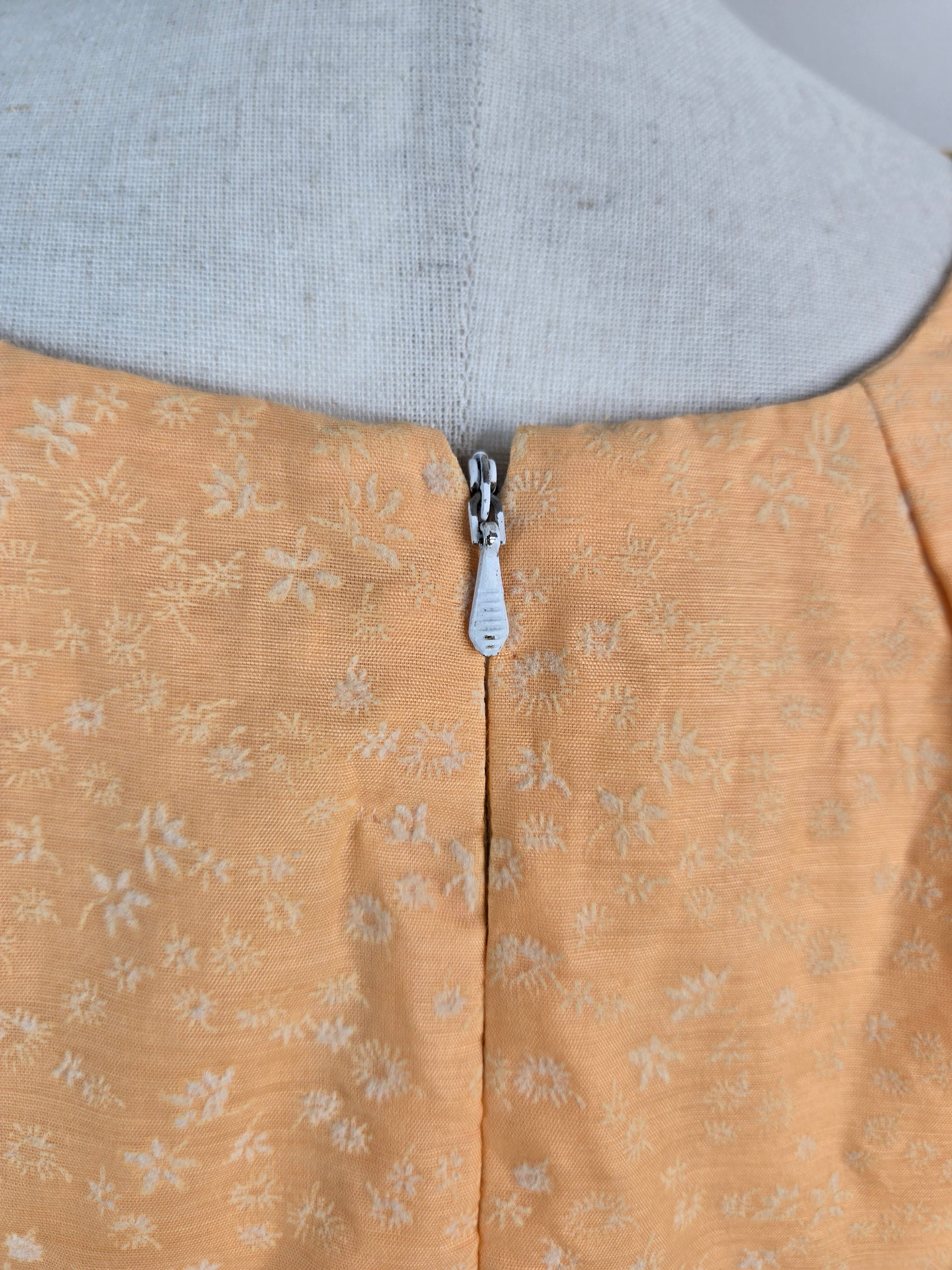 Vintage 1960s peach colored cotton coquette style empire waist dress. She has a textured floral jaquard throughout the main fabric and small lace details at the empire waist and around the bottom hem ruffle. There are small shear puff sleeves that have a corded band to create the ruching effect, but it is not elastic, so it is loose and there is no stretch. This was intentional and is not an imperfection. There is a metal zipper down center back and she is in perfect condition and has been cleaned.