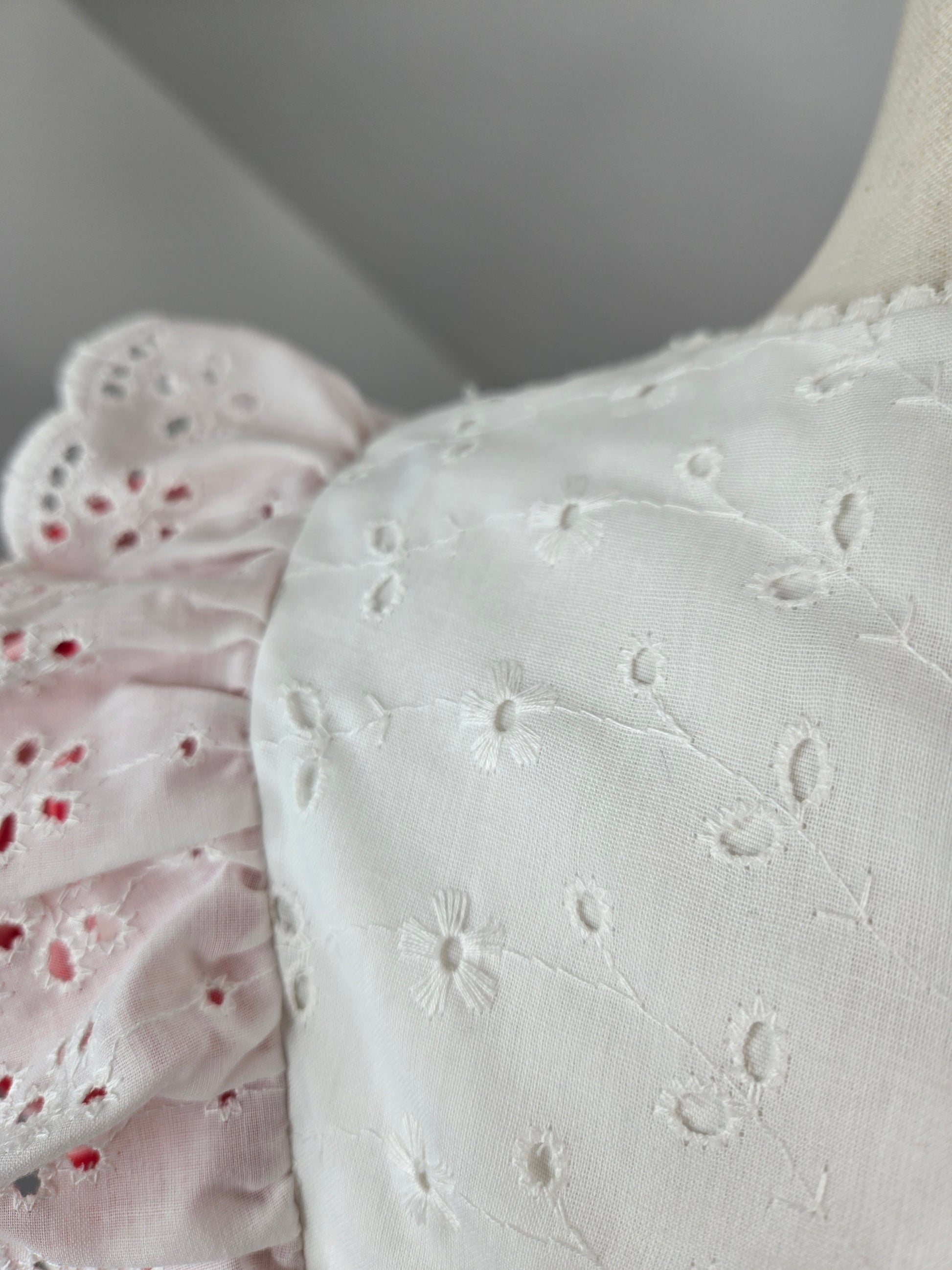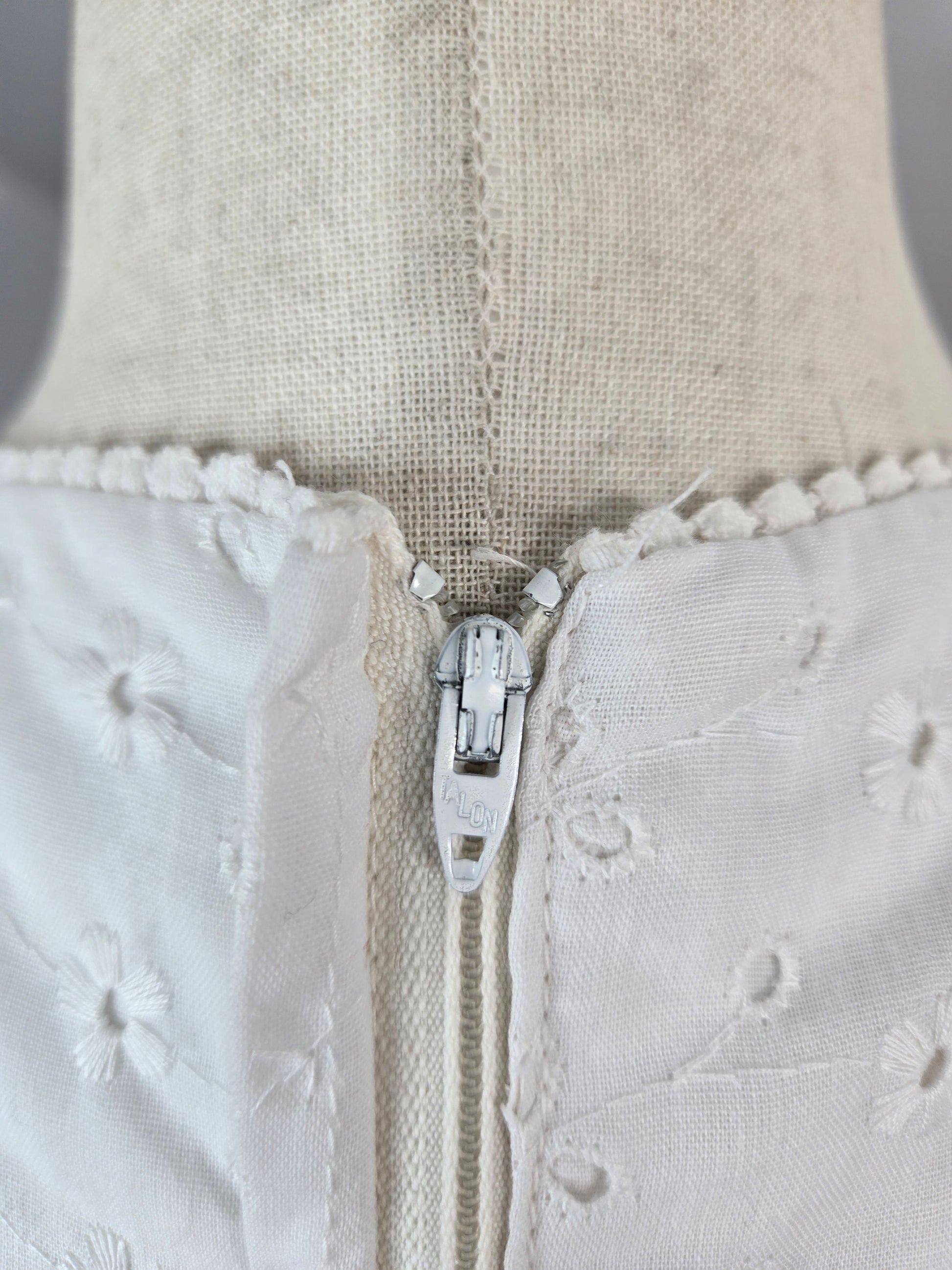 Vintage 1960s praire/western dress in a classic red gingham print, eyelet lace throughout with ruffle details at the chest and hem, and little puff sleeves that have elastic at the end. Elastic is in good working order. It also has an attached waist tie at the back and a talon zipper closure. This dress has no tags, so is most likely hand made, but it is really well done and in a gorgeous cotton fabric.