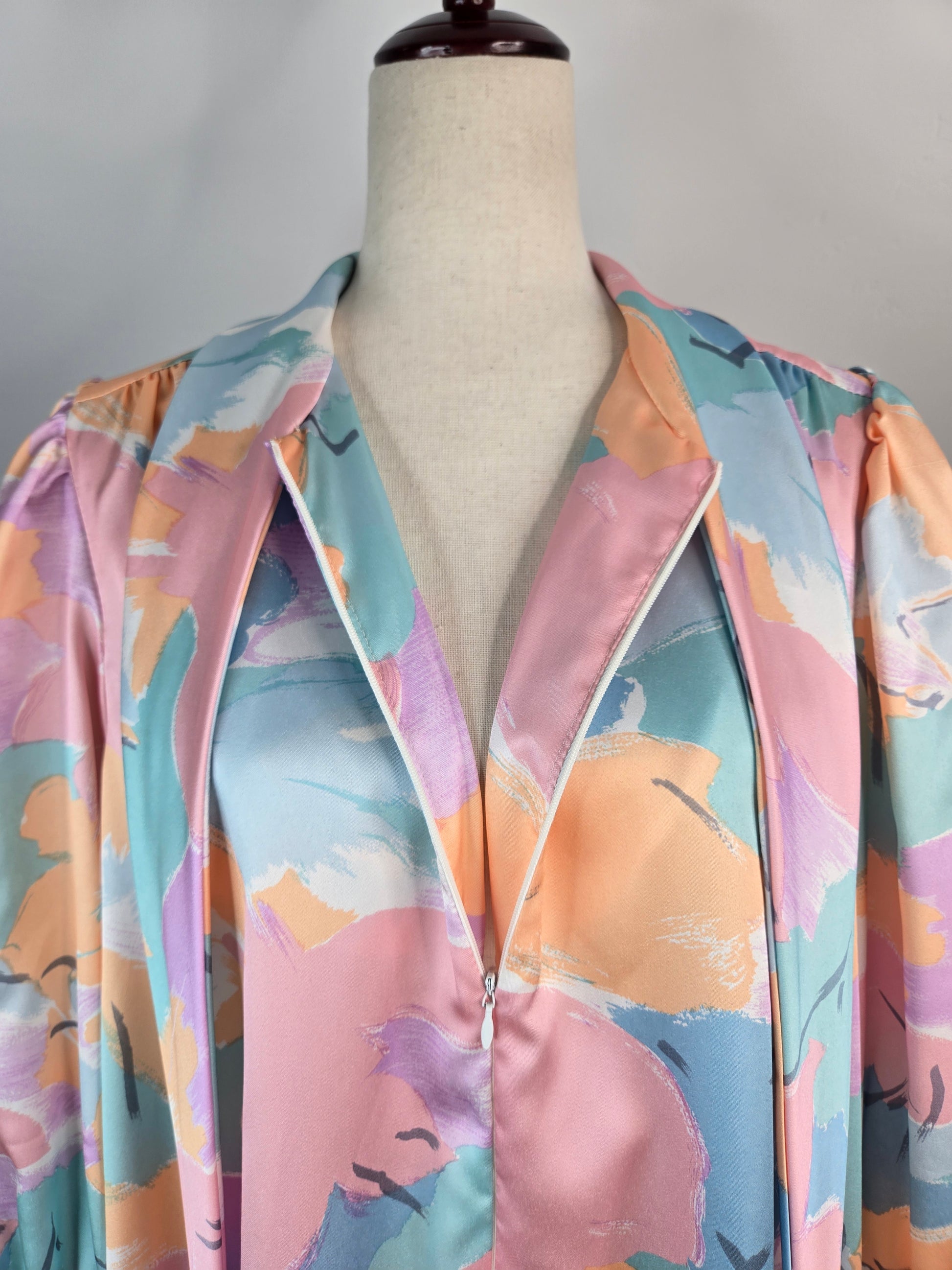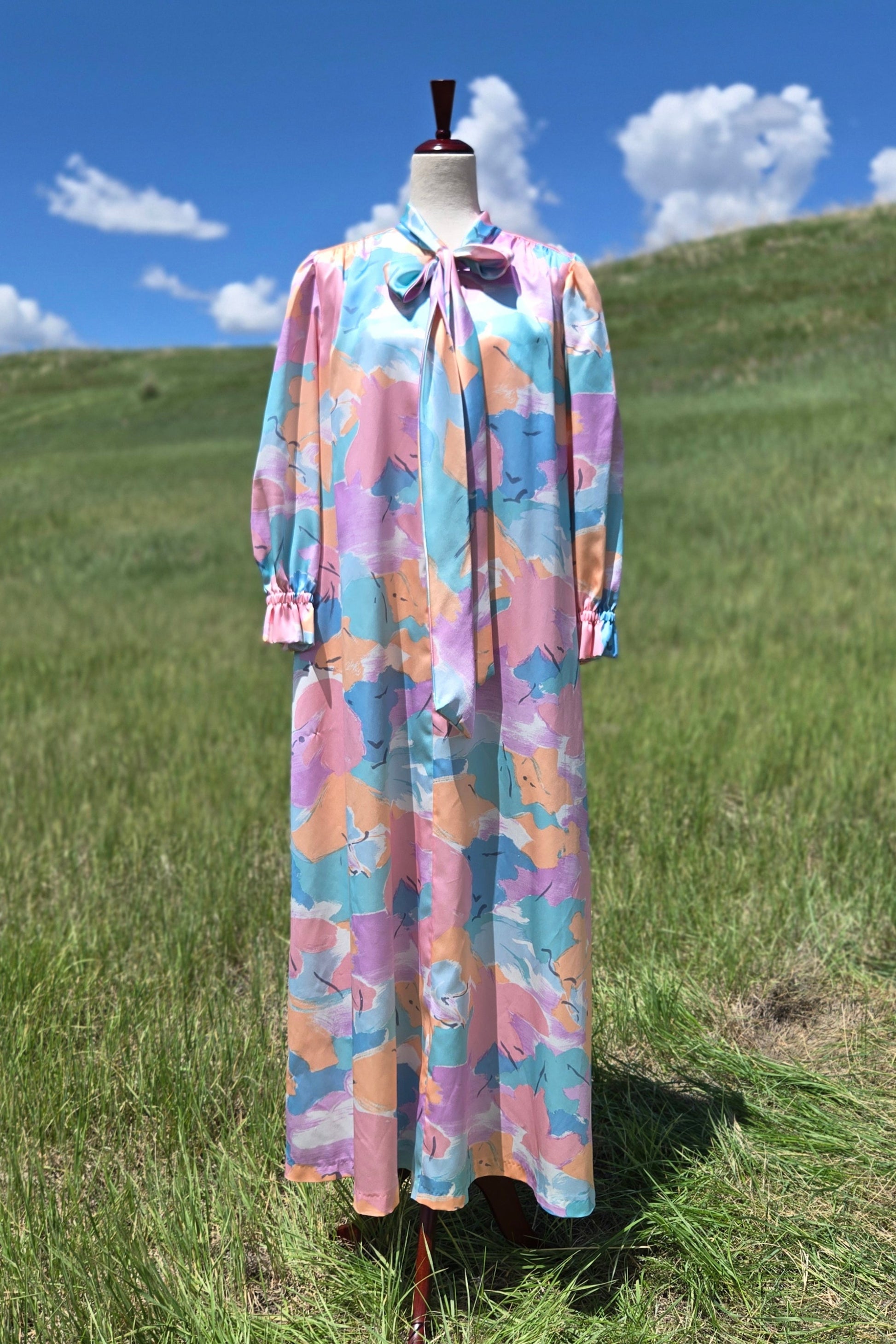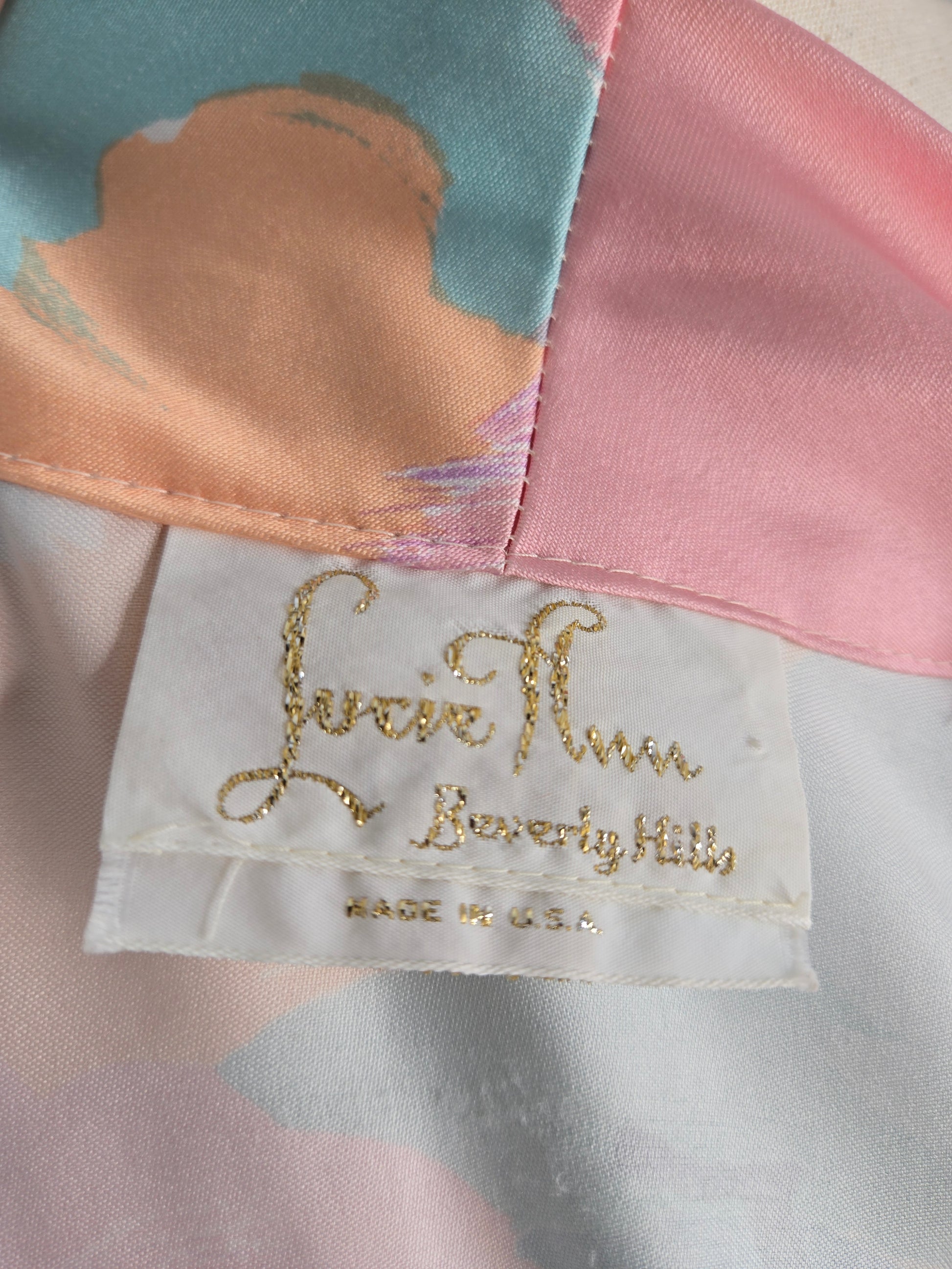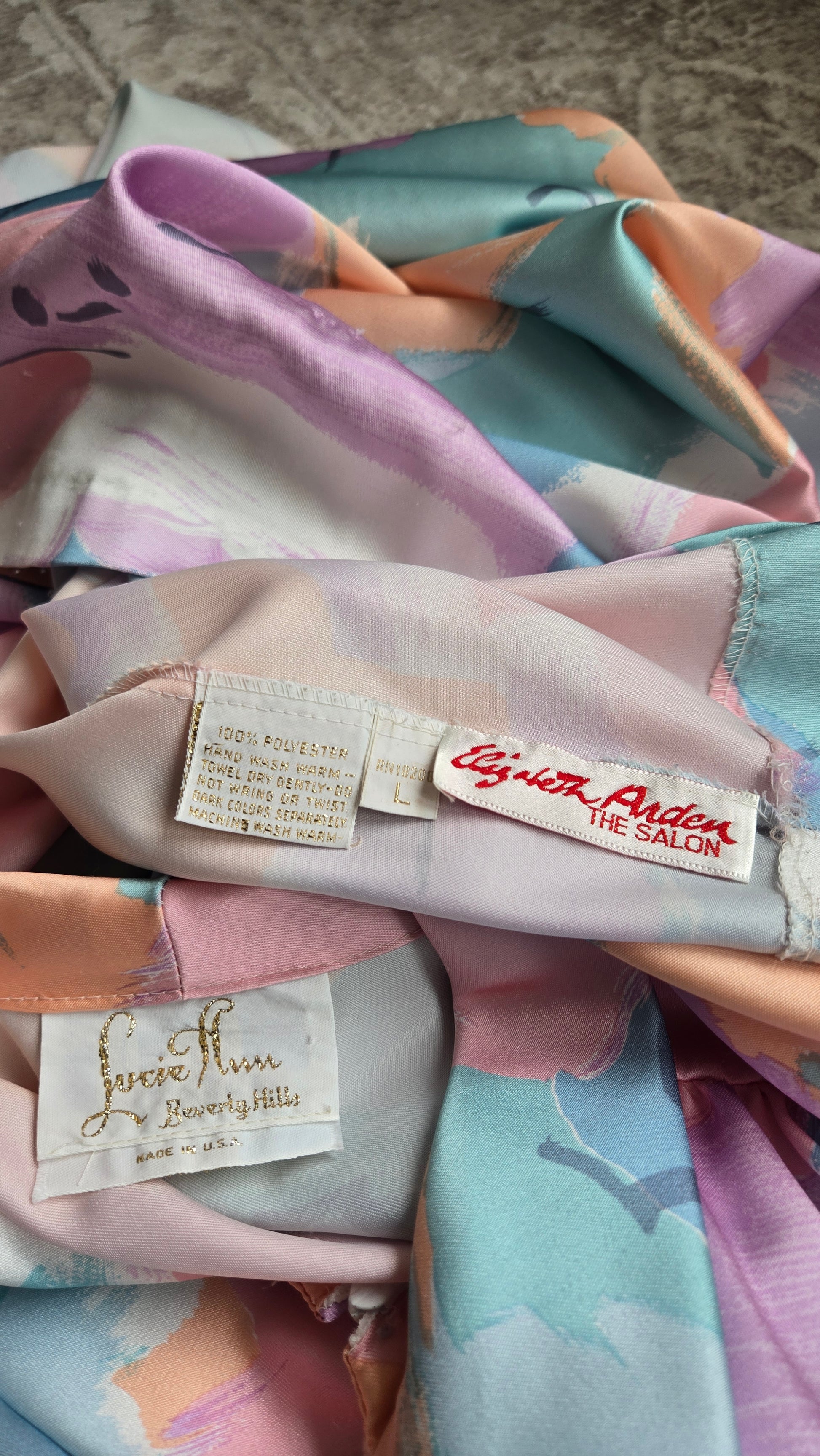 Rare Lucie Ann of Beverly Hills vintage 1960s caftan style house dress. It is from the Elizabeth Arden The Salon series and is absolutely stunning! There is an attached tie around the neckline and a zipper down center front about 3/4 the way down the dress. There is an elastic at the cuff with a small ruffle following it. It is a looser fit with a stunning heavier, high quality, silky polyester fabric that has a gorgeous drape. No imperfections to note, she is in amazing condition. Found similar comps on other sites for $625.