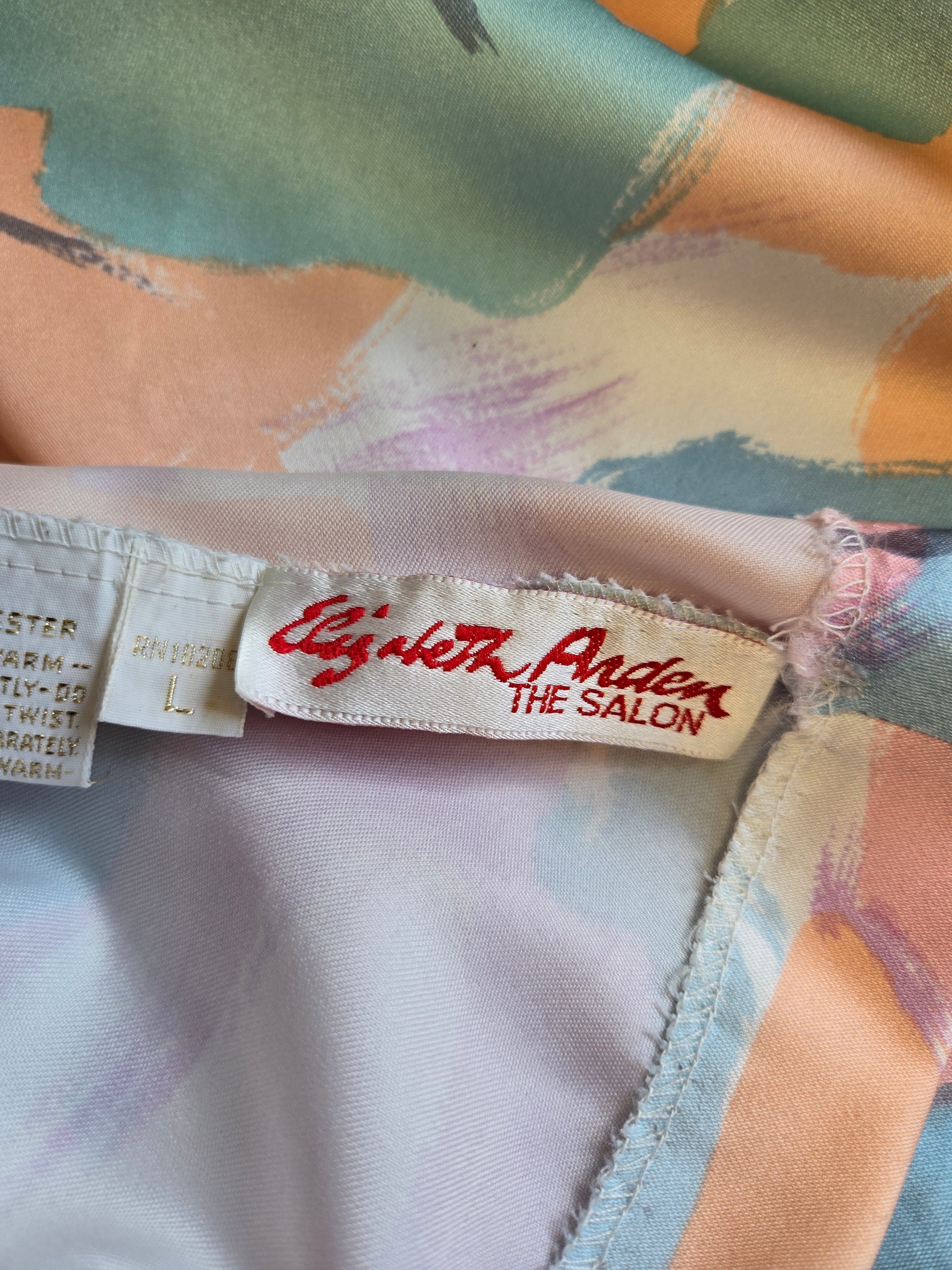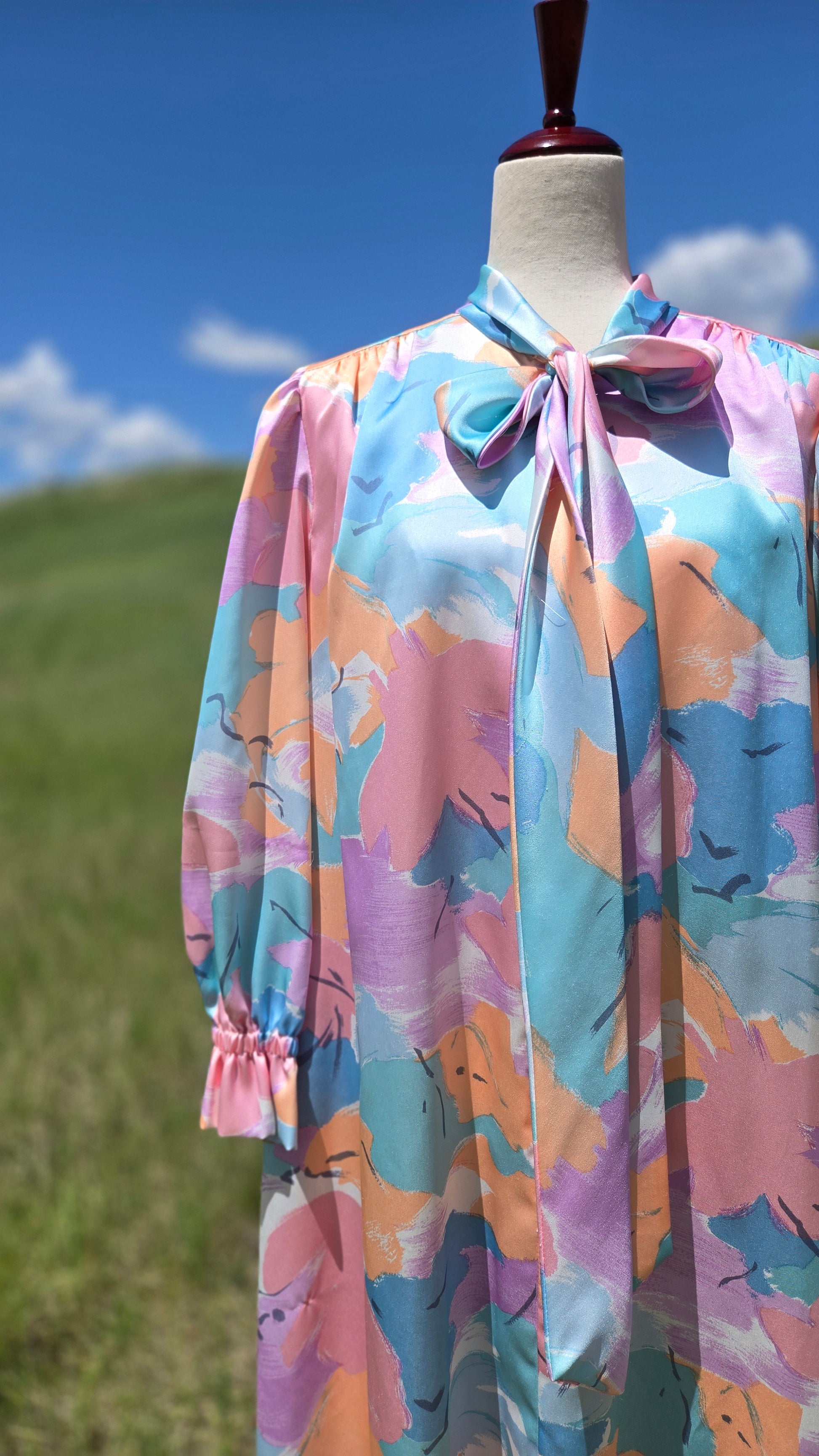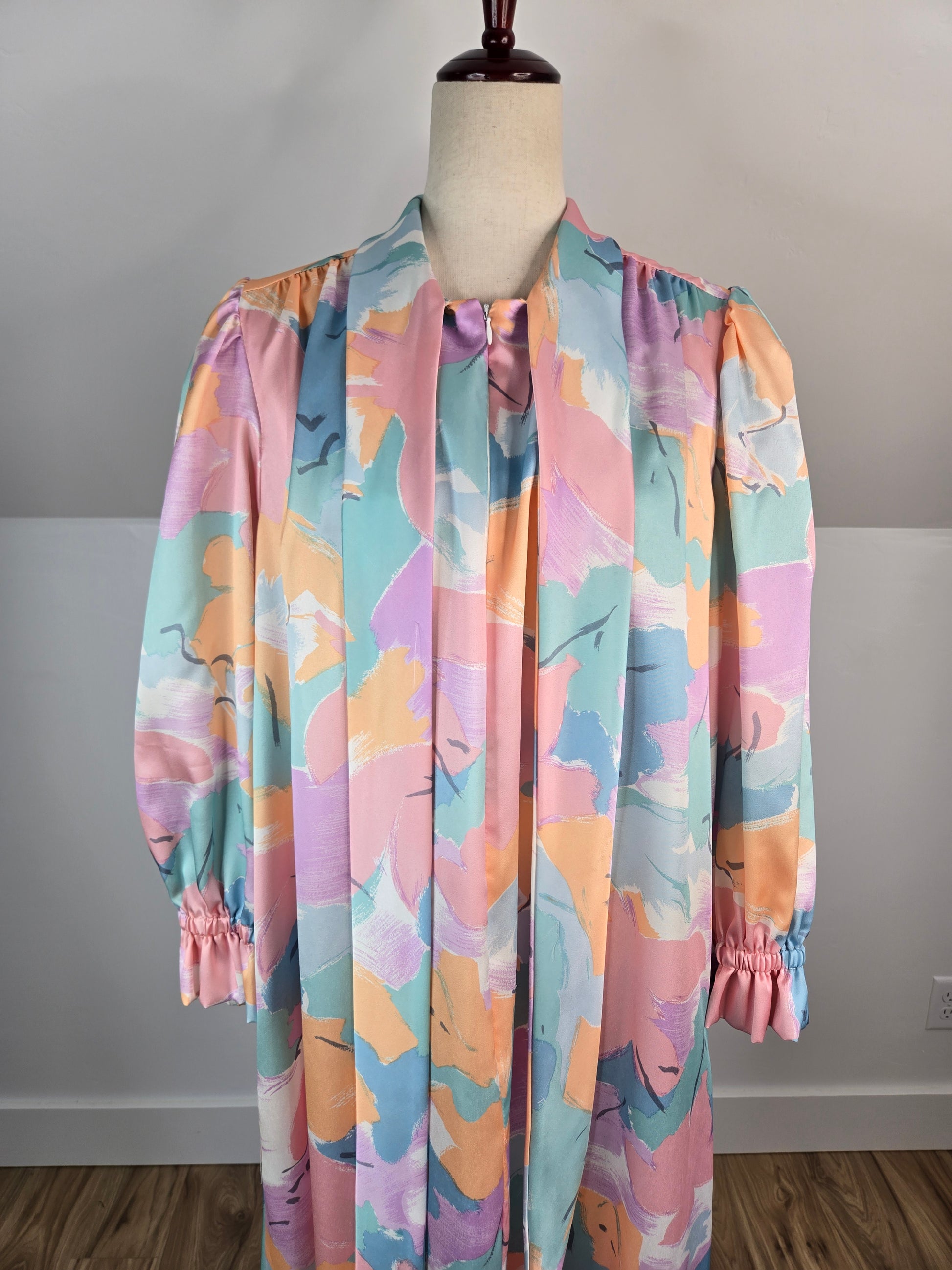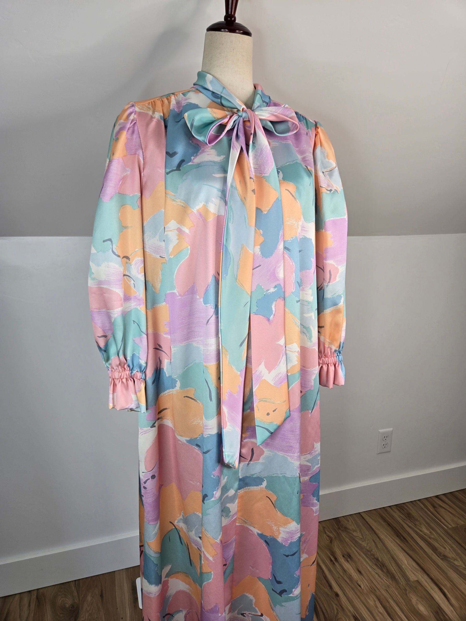 Rare Lucie Ann of Beverly Hills vintage 1960s caftan style house dress. It is from the Elizabeth Arden The Salon series and is absolutely stunning! There is an attached tie around the neckline and a zipper down center front about 3/4 the way down the dress. There is an elastic at the cuff with a small ruffle following it. It is a looser fit with a stunning heavier, high quality, silky polyester fabric that has a gorgeous drape. No imperfections to note, she is in amazing condition. Found similar comps on other sites for $625.