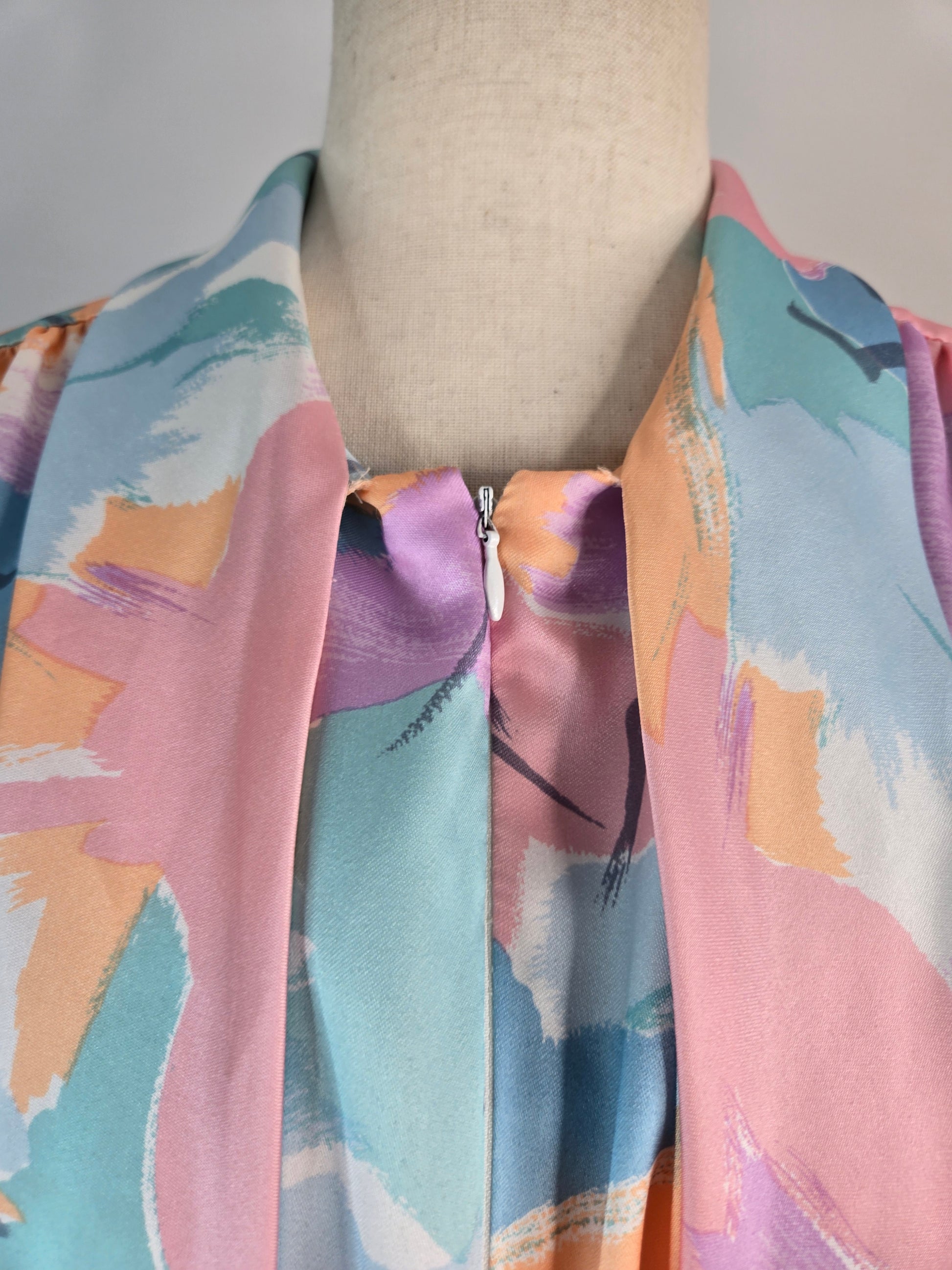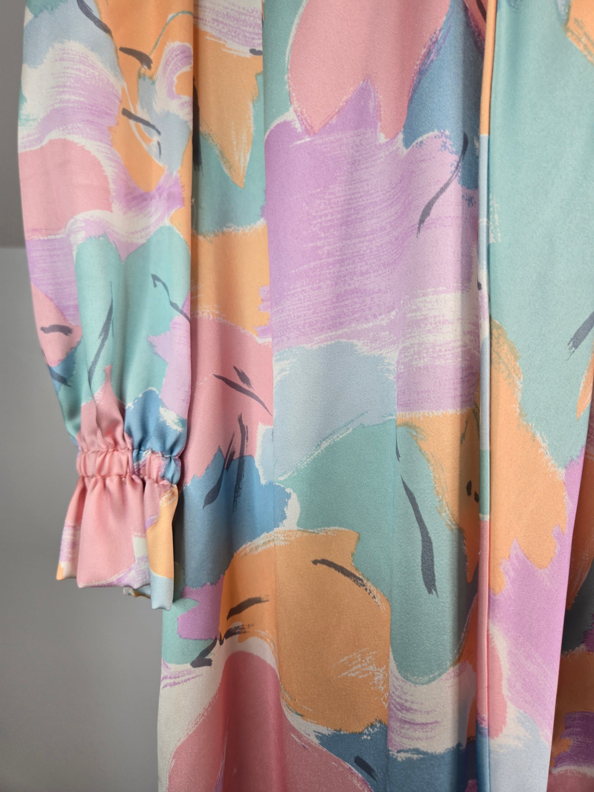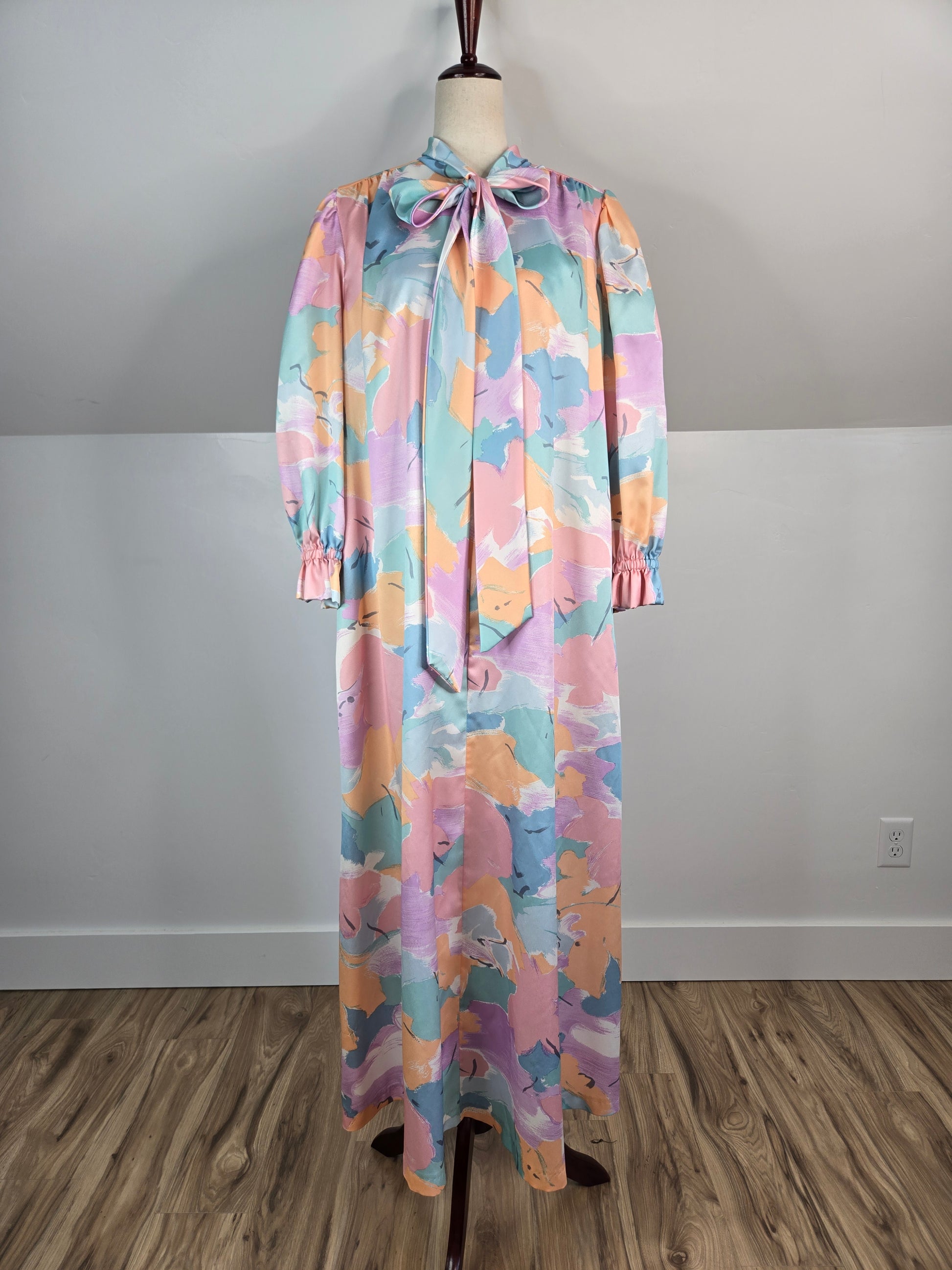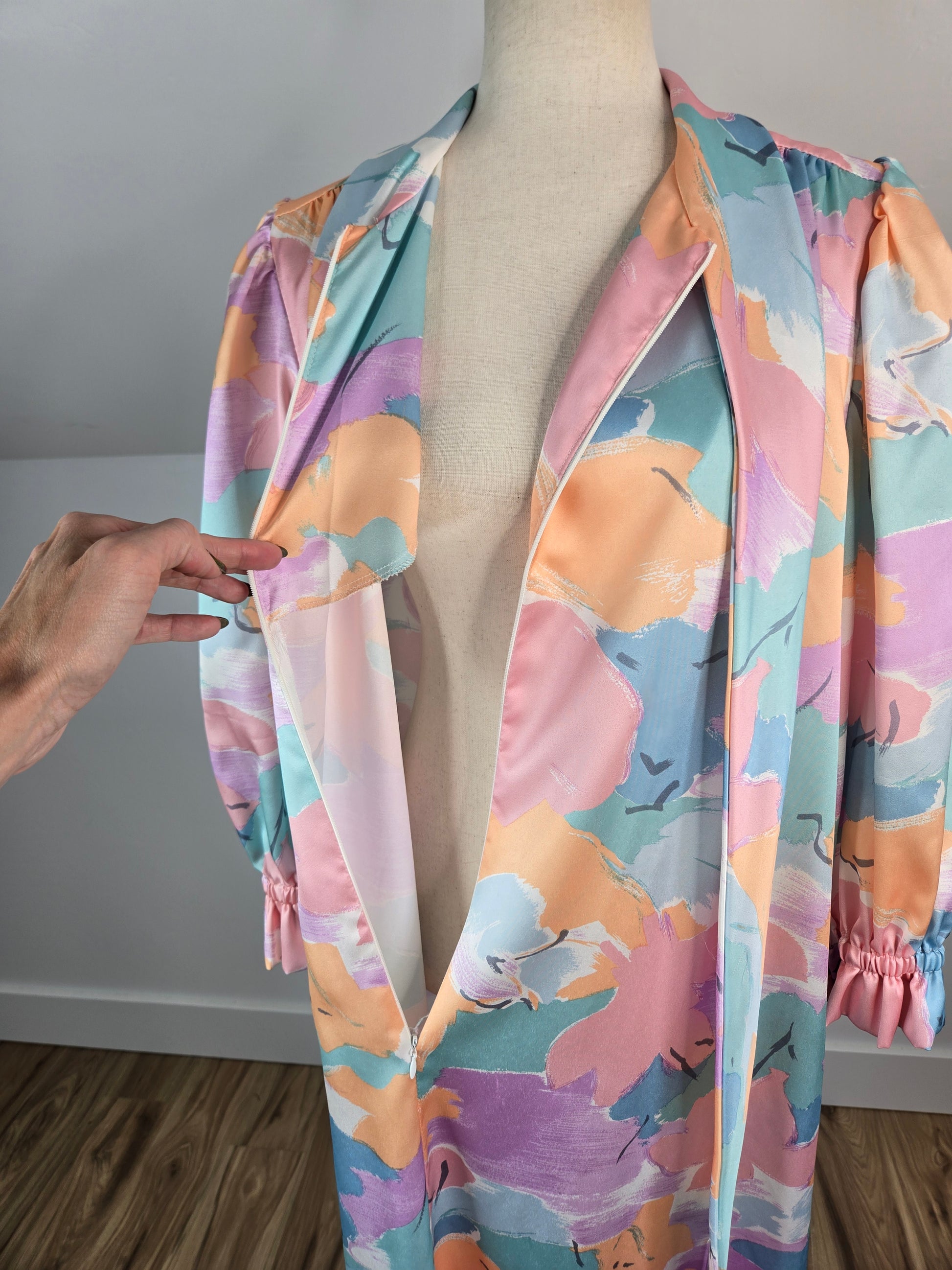 Rare Lucie Ann of Beverly Hills vintage 1960s caftan style house dress. It is from the Elizabeth Arden The Salon series and is absolutely stunning! There is an attached tie around the neckline and a zipper down center front about 3/4 the way down the dress. There is an elastic at the cuff with a small ruffle following it. It is a looser fit with a stunning heavier, high quality, silky polyester fabric that has a gorgeous drape. No imperfections to note, she is in amazing condition. Found similar comps on other sites for $625.