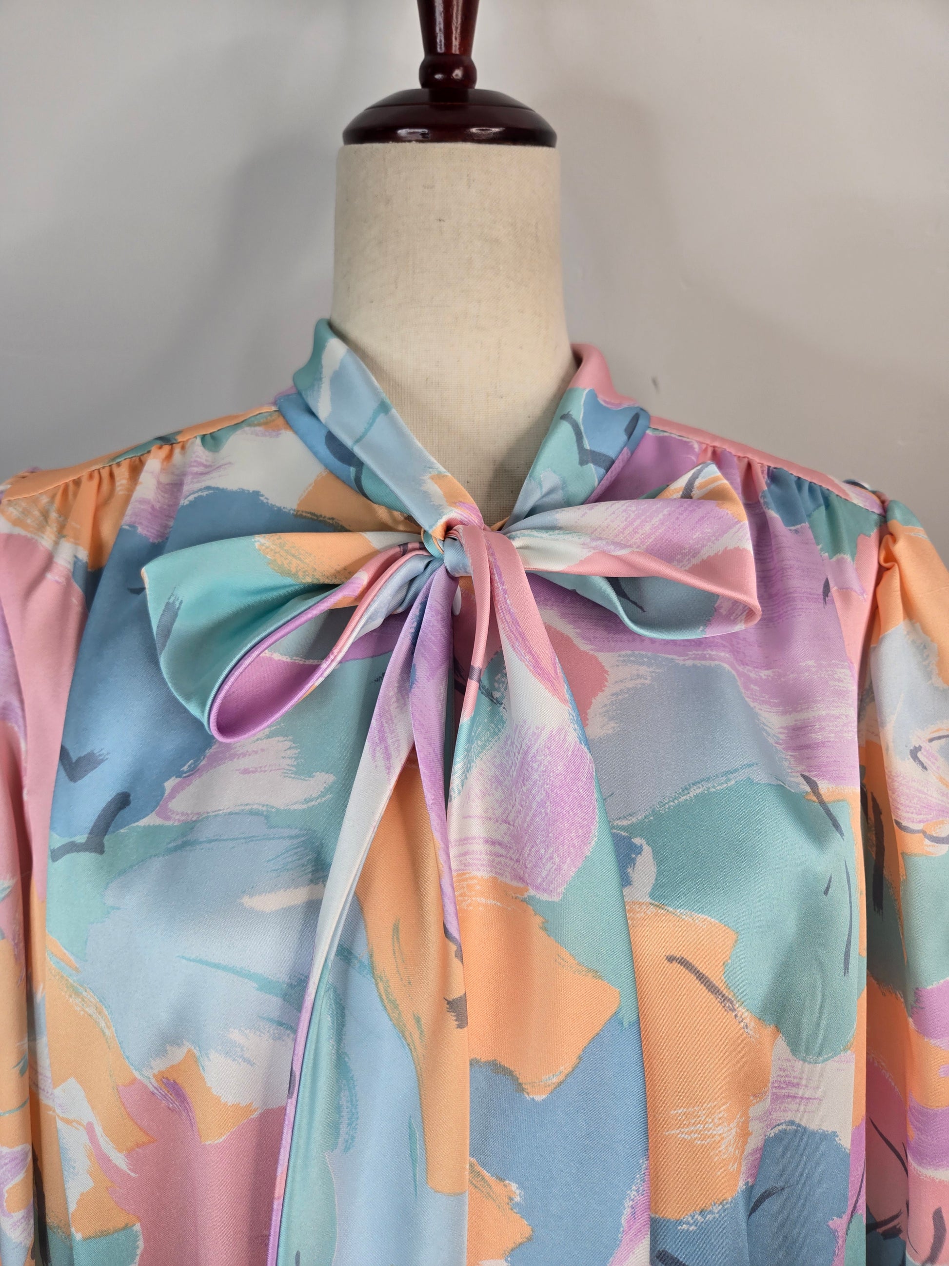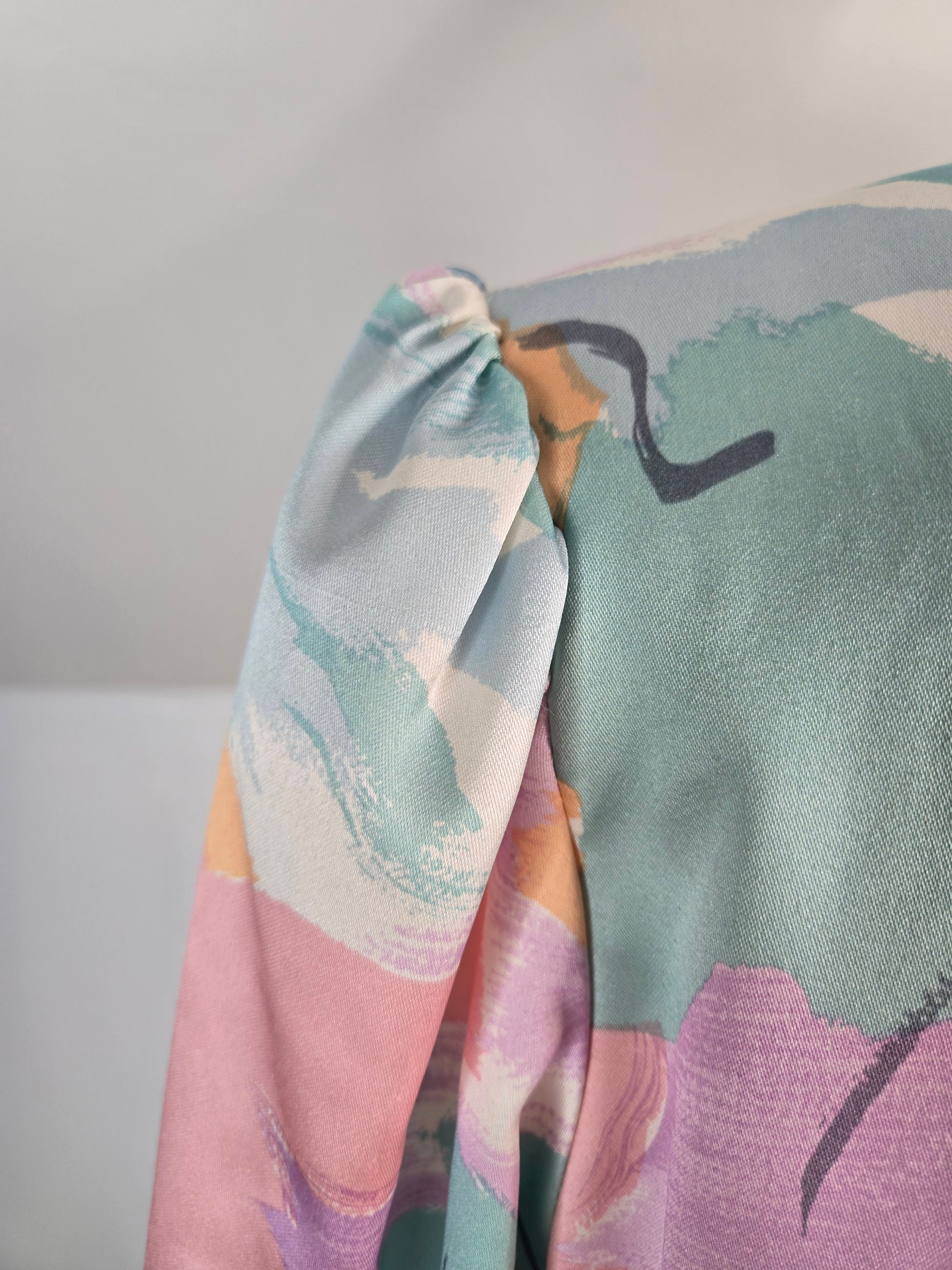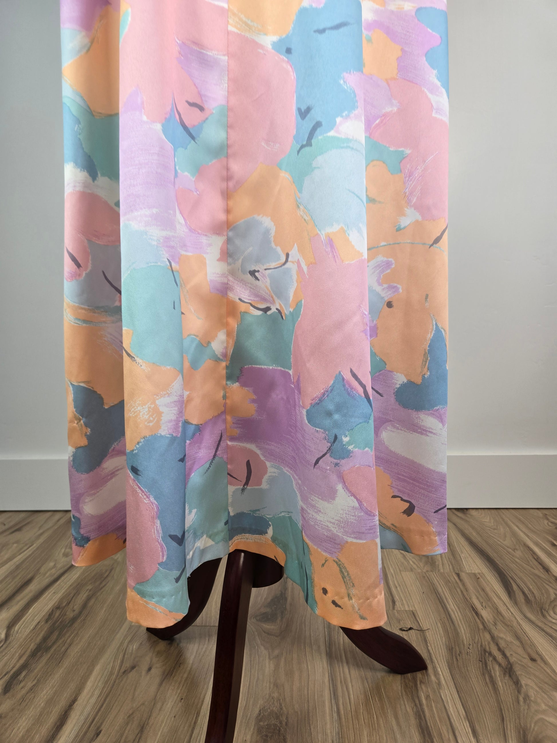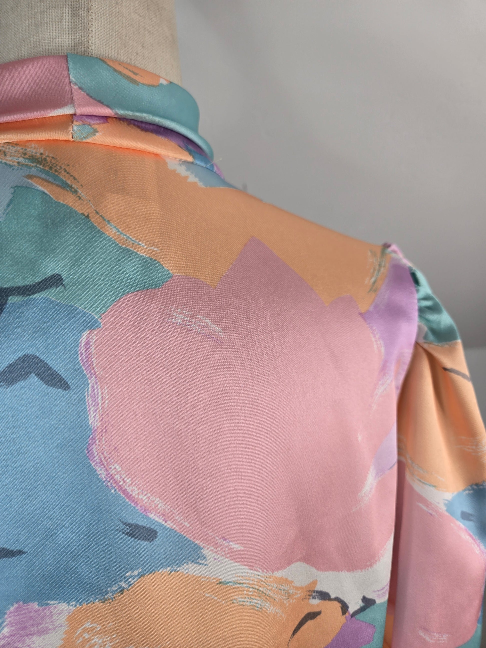 Rare Lucie Ann of Beverly Hills vintage 1960s caftan style house dress. It is from the Elizabeth Arden The Salon series and is absolutely stunning! There is an attached tie around the neckline and a zipper down center front about 3/4 the way down the dress. There is an elastic at the cuff with a small ruffle following it. It is a looser fit with a stunning heavier, high quality, silky polyester fabric that has a gorgeous drape. No imperfections to note, she is in amazing condition. Found similar comps on other sites for $625.