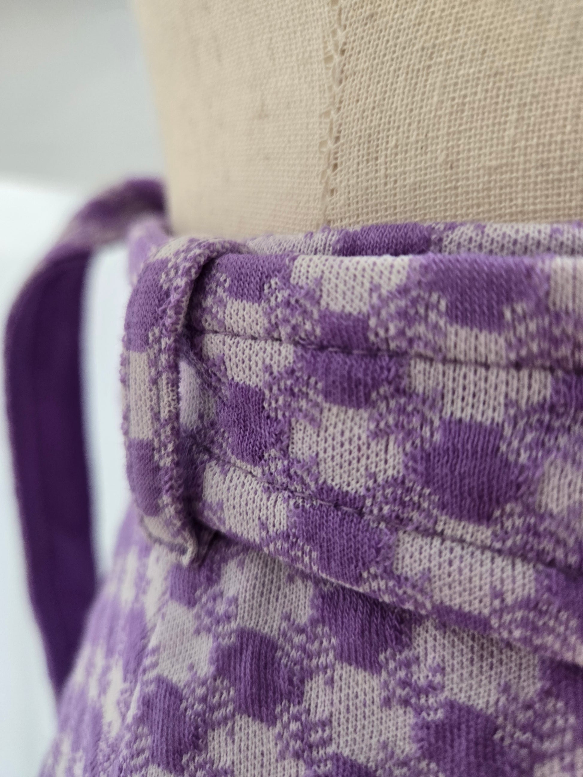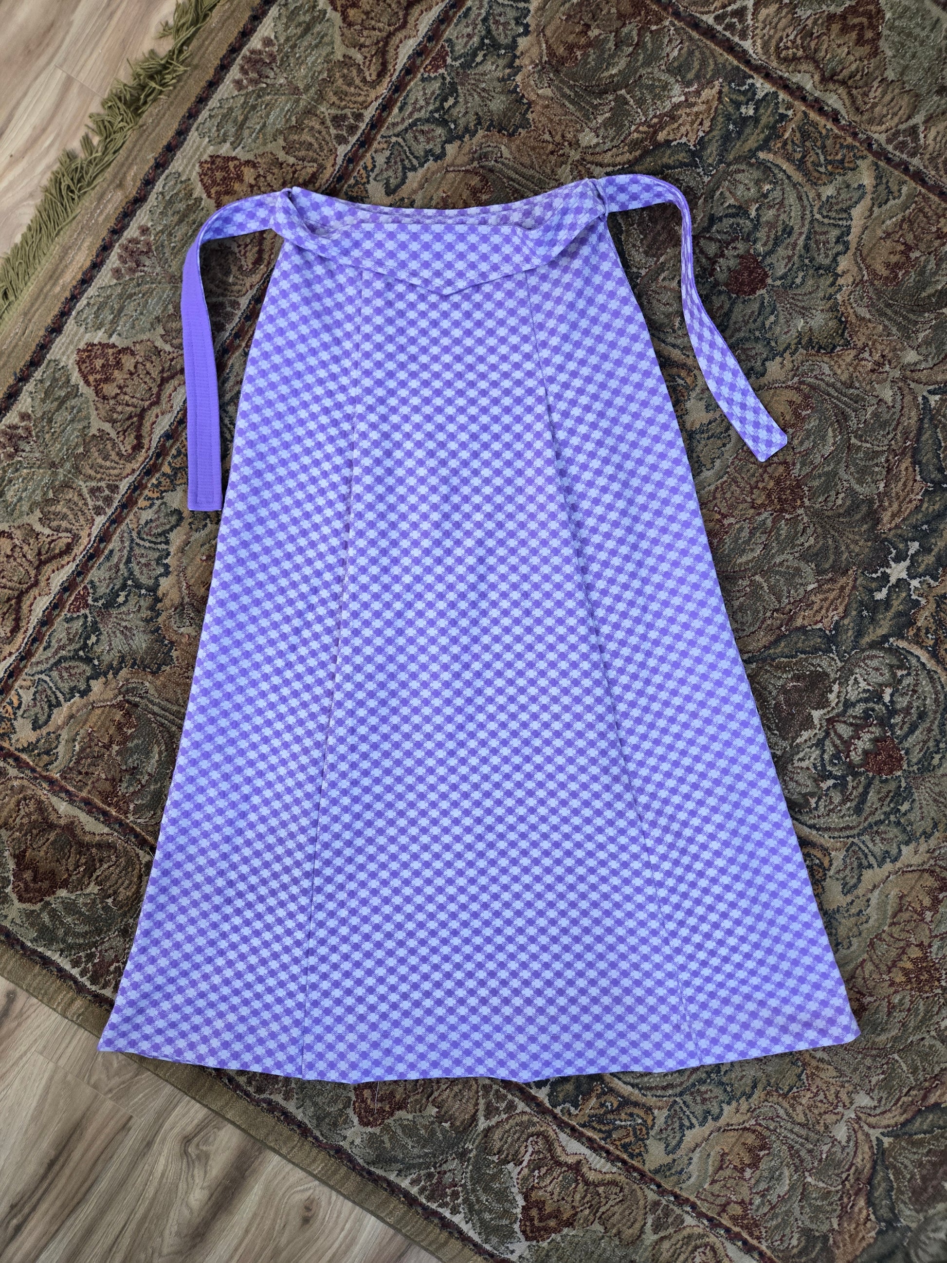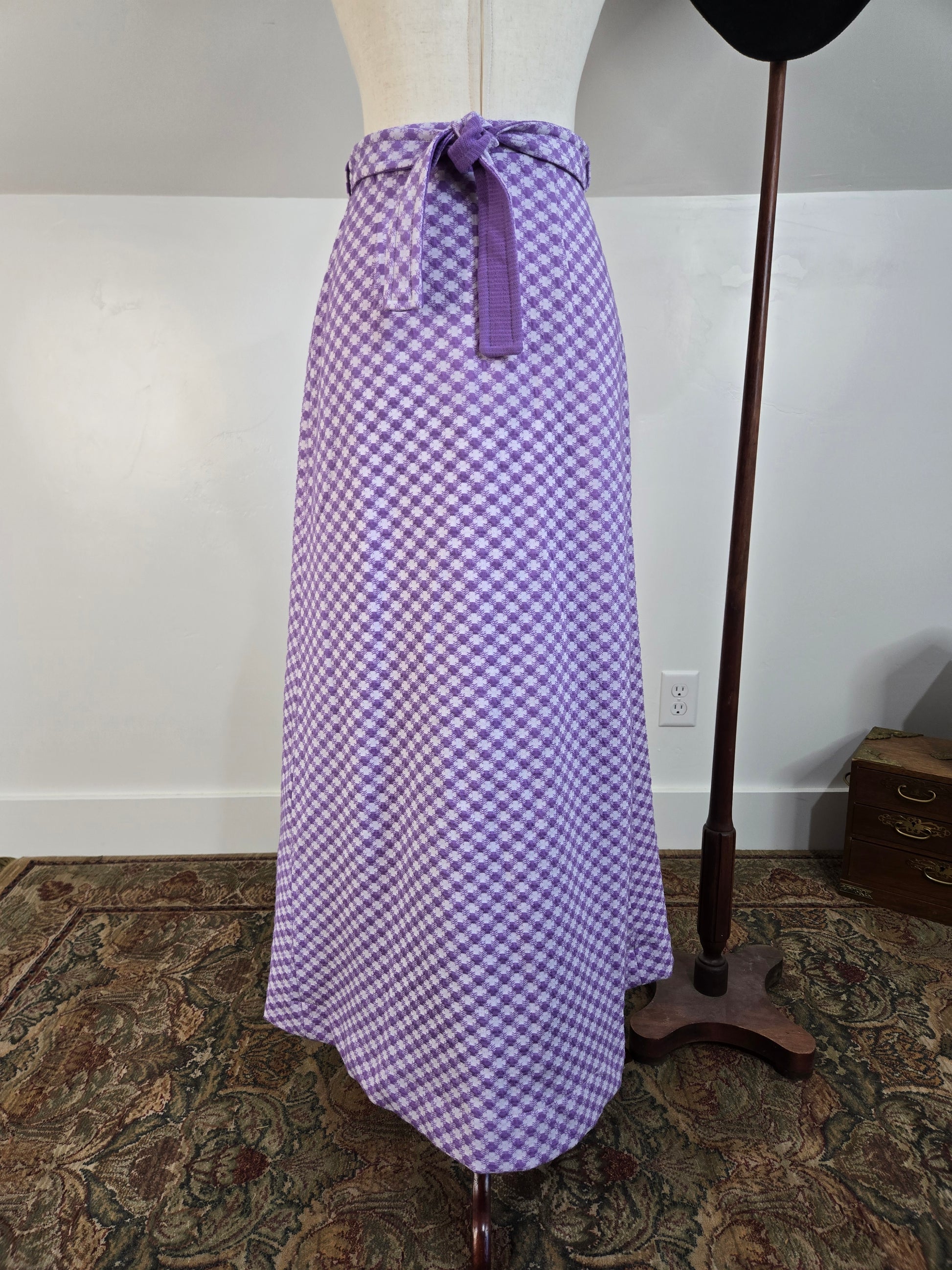 Jantzen vintage 1970s poly knit maxi skirt in a purple and white checkered pattern. It is fully knit, not printed. It comes with a matching belt with a cute western shape to the front that ties in the back but is fully removable. It has an elastic waistband and is in perfect condition.