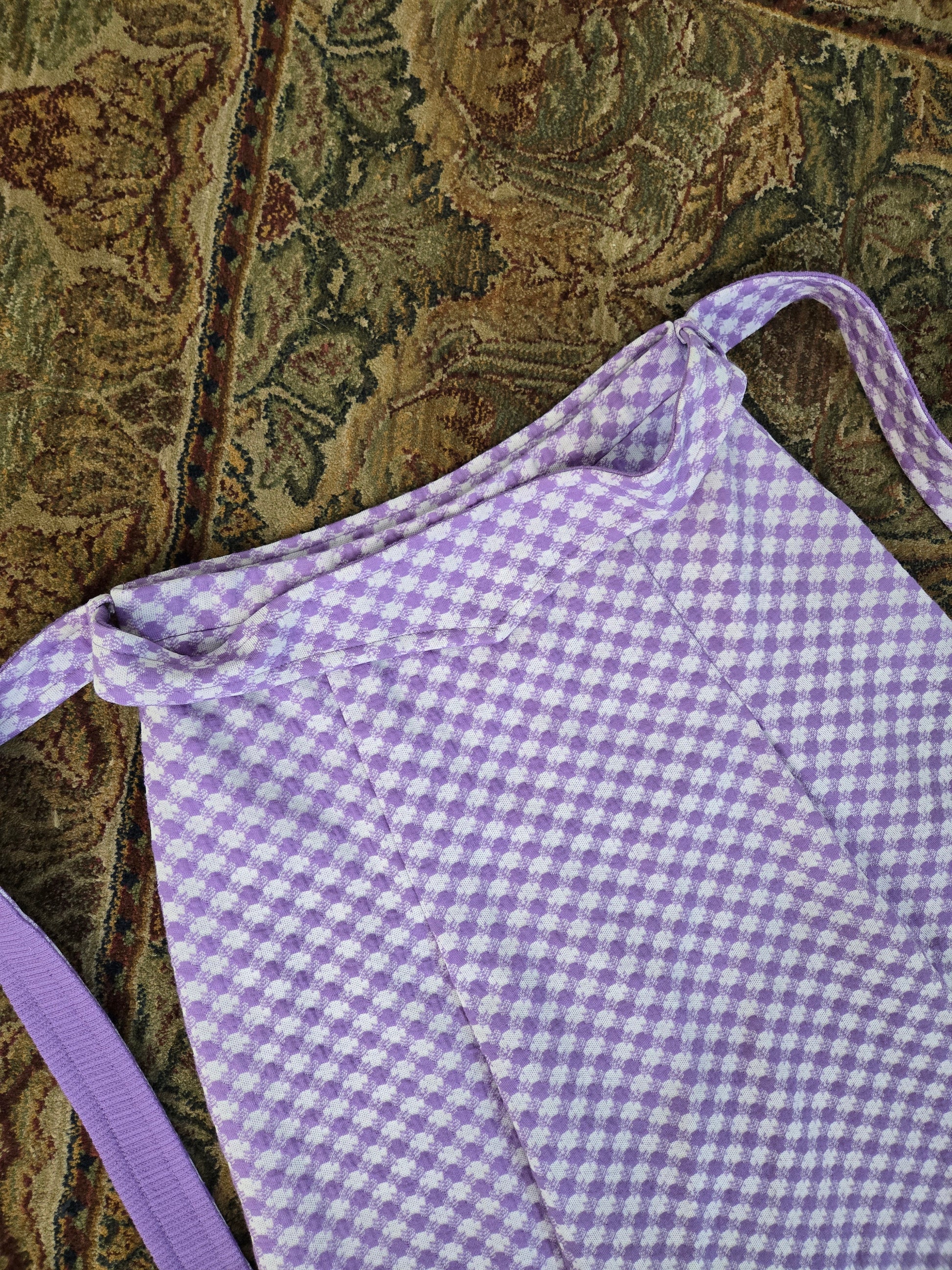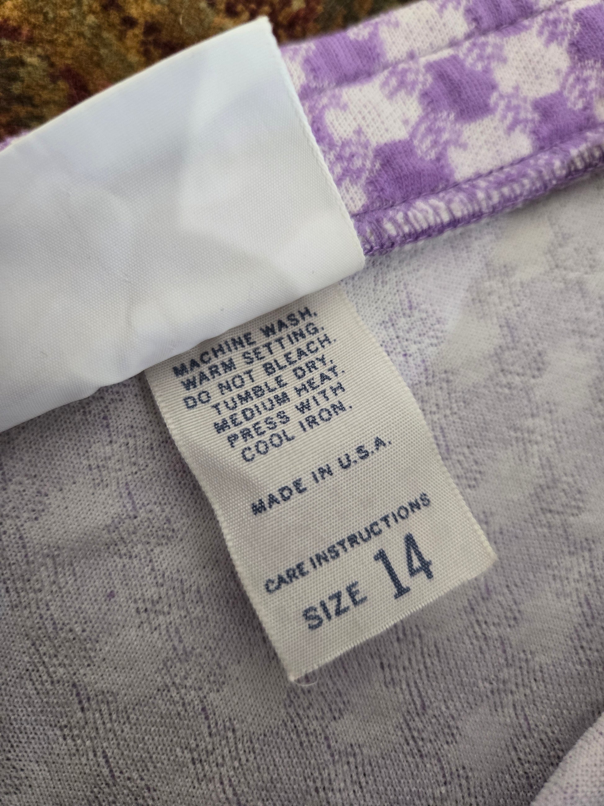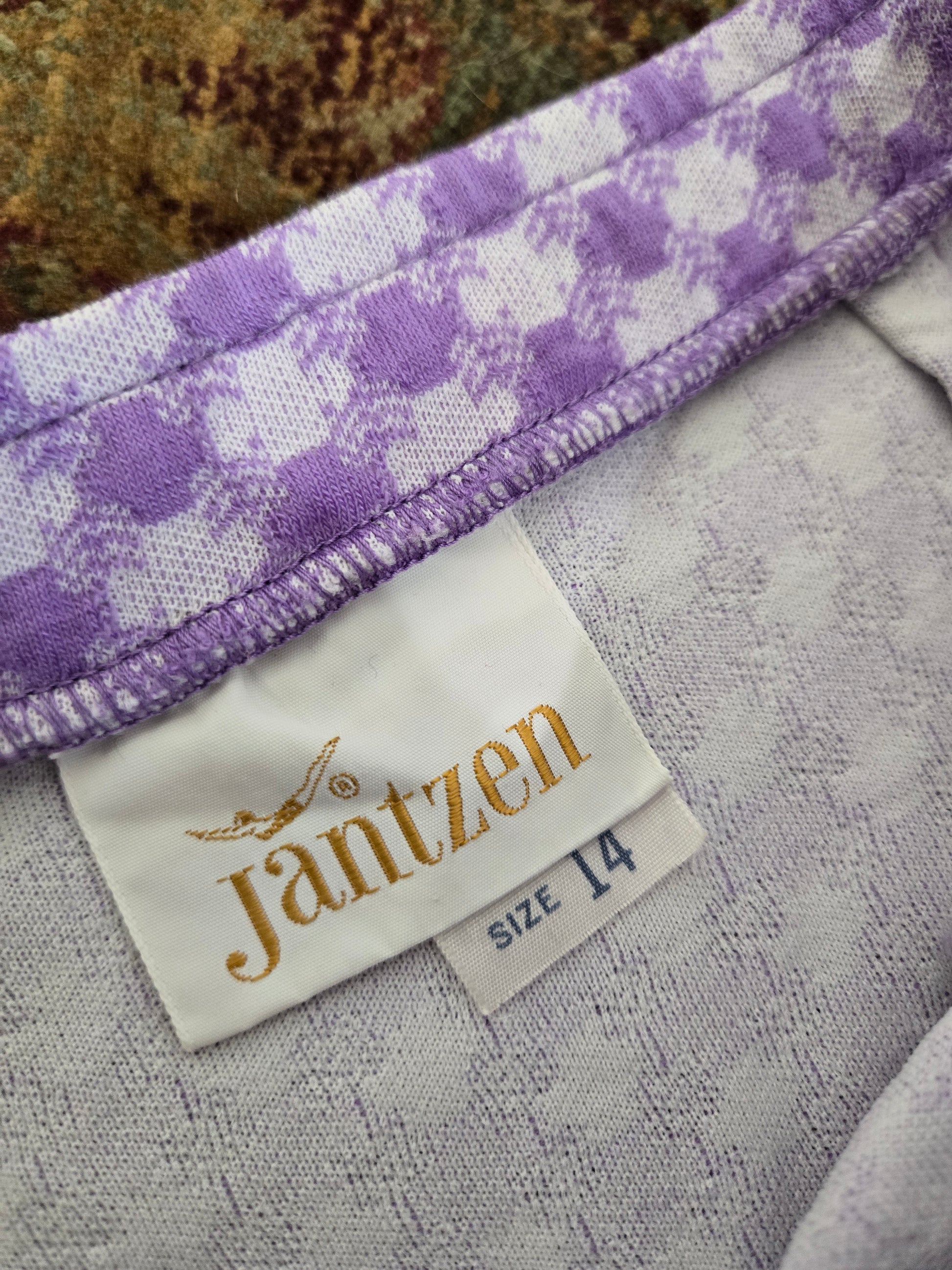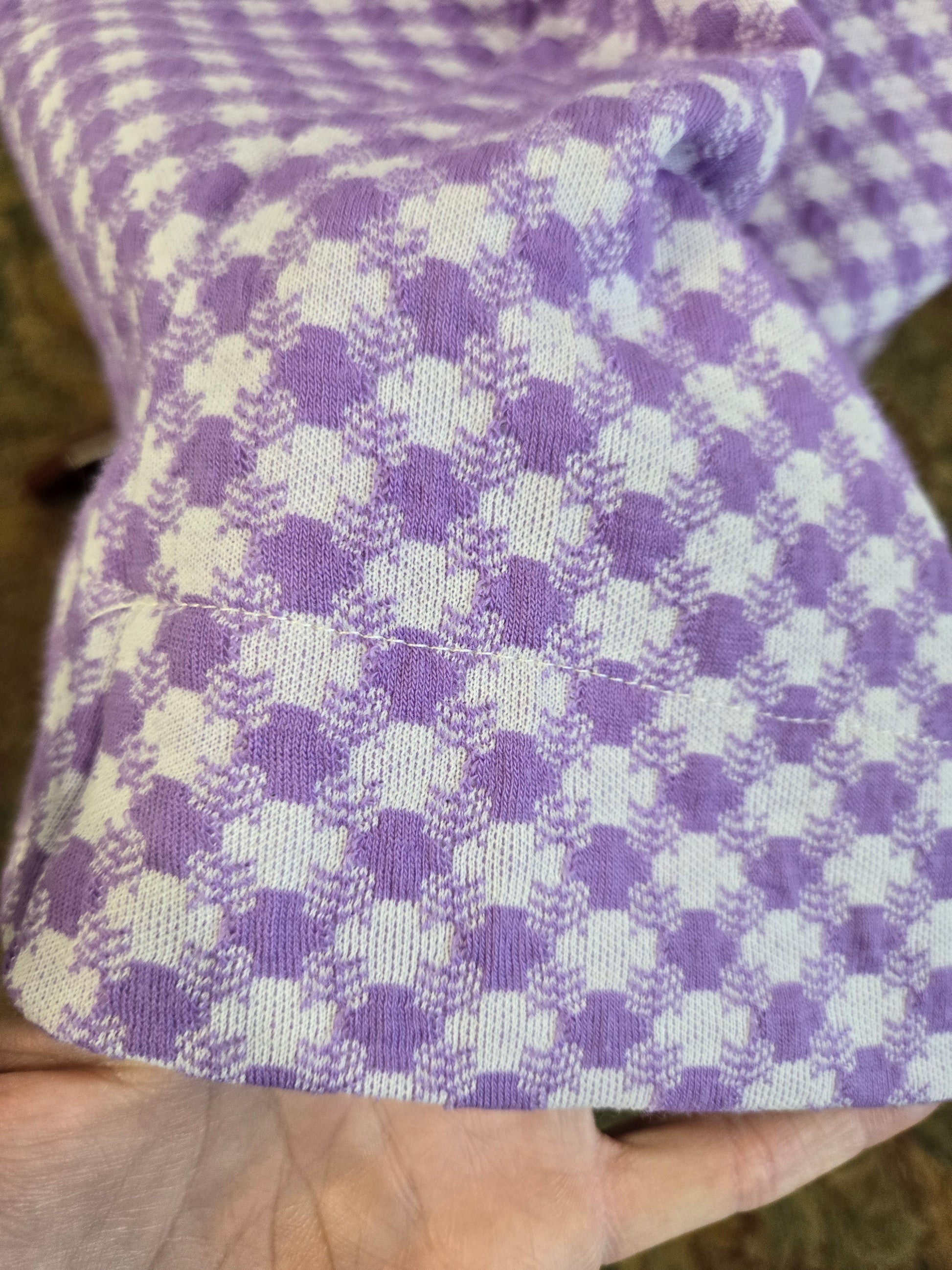 Jantzen vintage 1970s poly knit maxi skirt in a purple and white checkered pattern. It is fully knit, not printed. It comes with a matching belt with a cute western shape to the front that ties in the back but is fully removable. It has an elastic waistband and is in perfect condition.