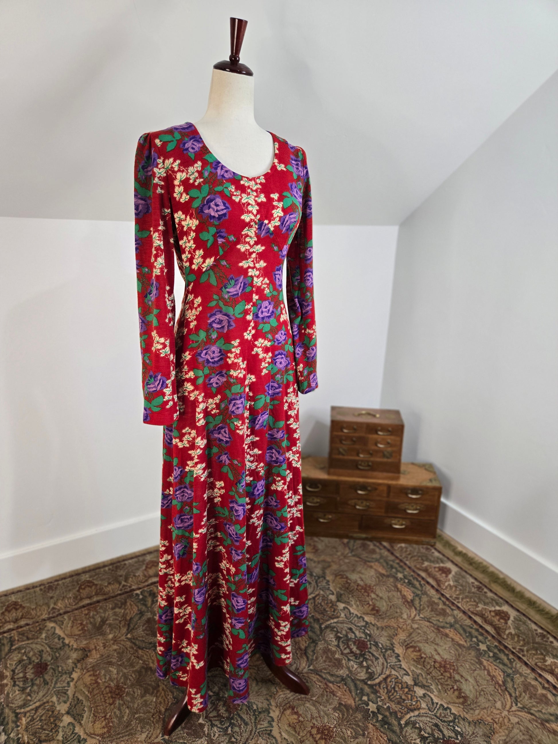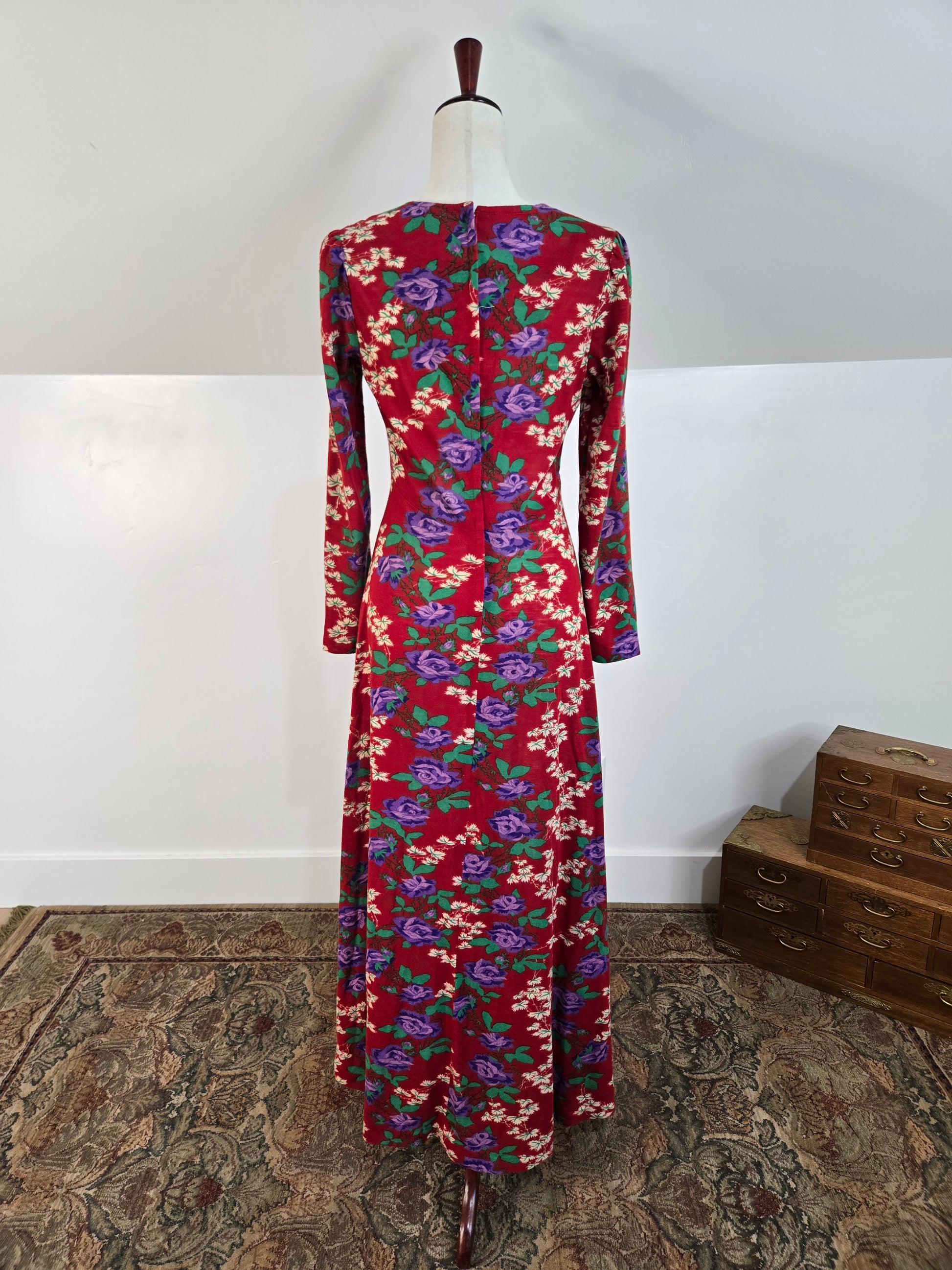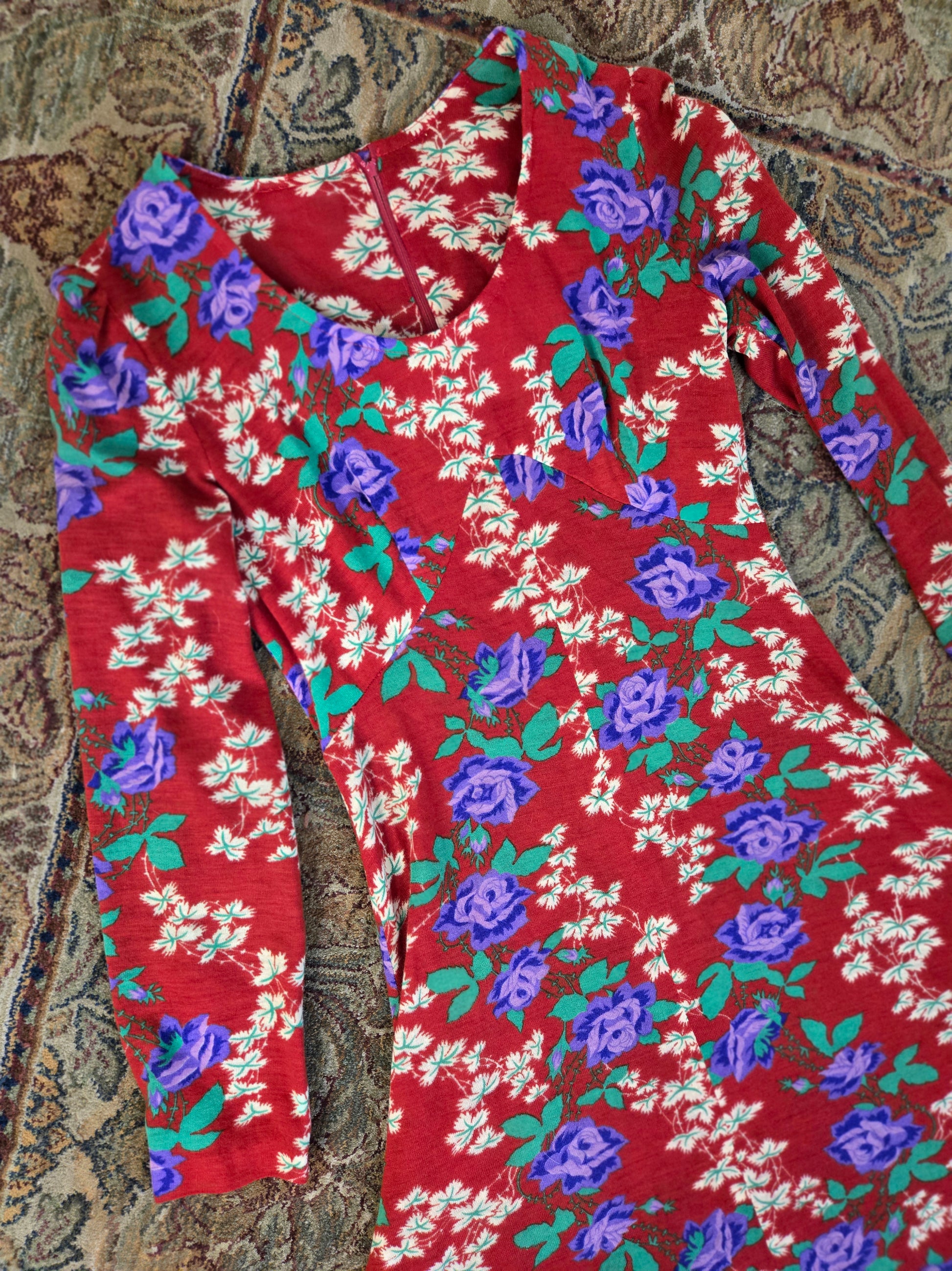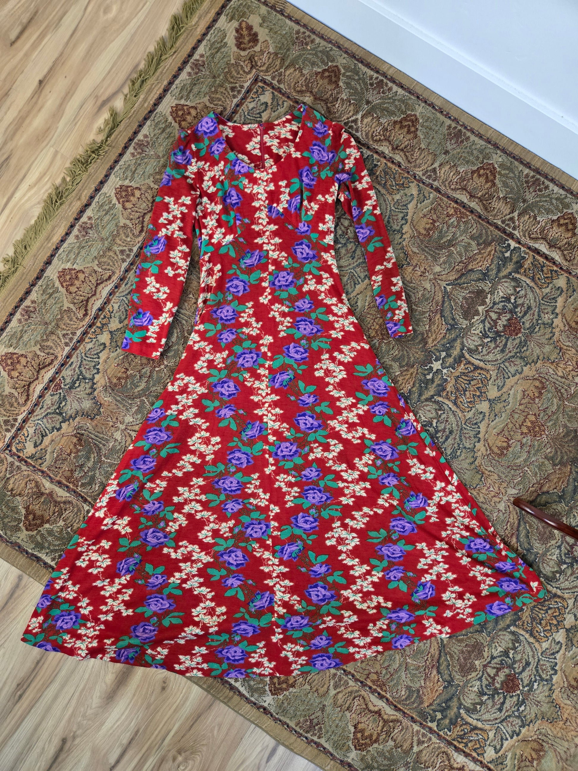 Vintage 1970s dark red maxi dress with a green and purple psychedelic print throughout. It has a zipper in the back to get into it and the fabric is hard to explain. It is a matte, dry feeling very thin poly material. It is very soft and has no imperfections.