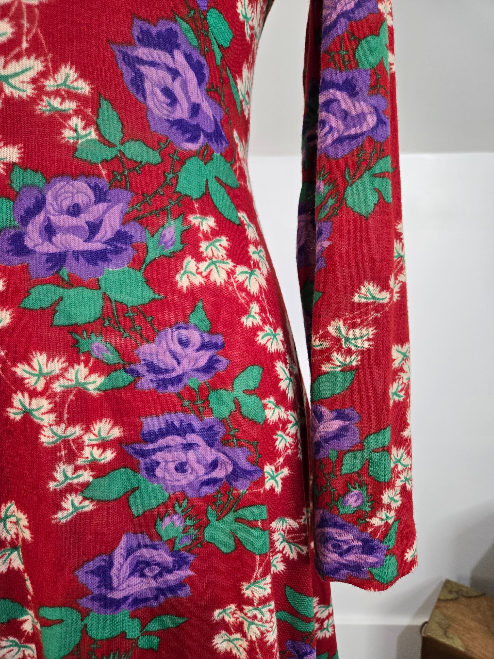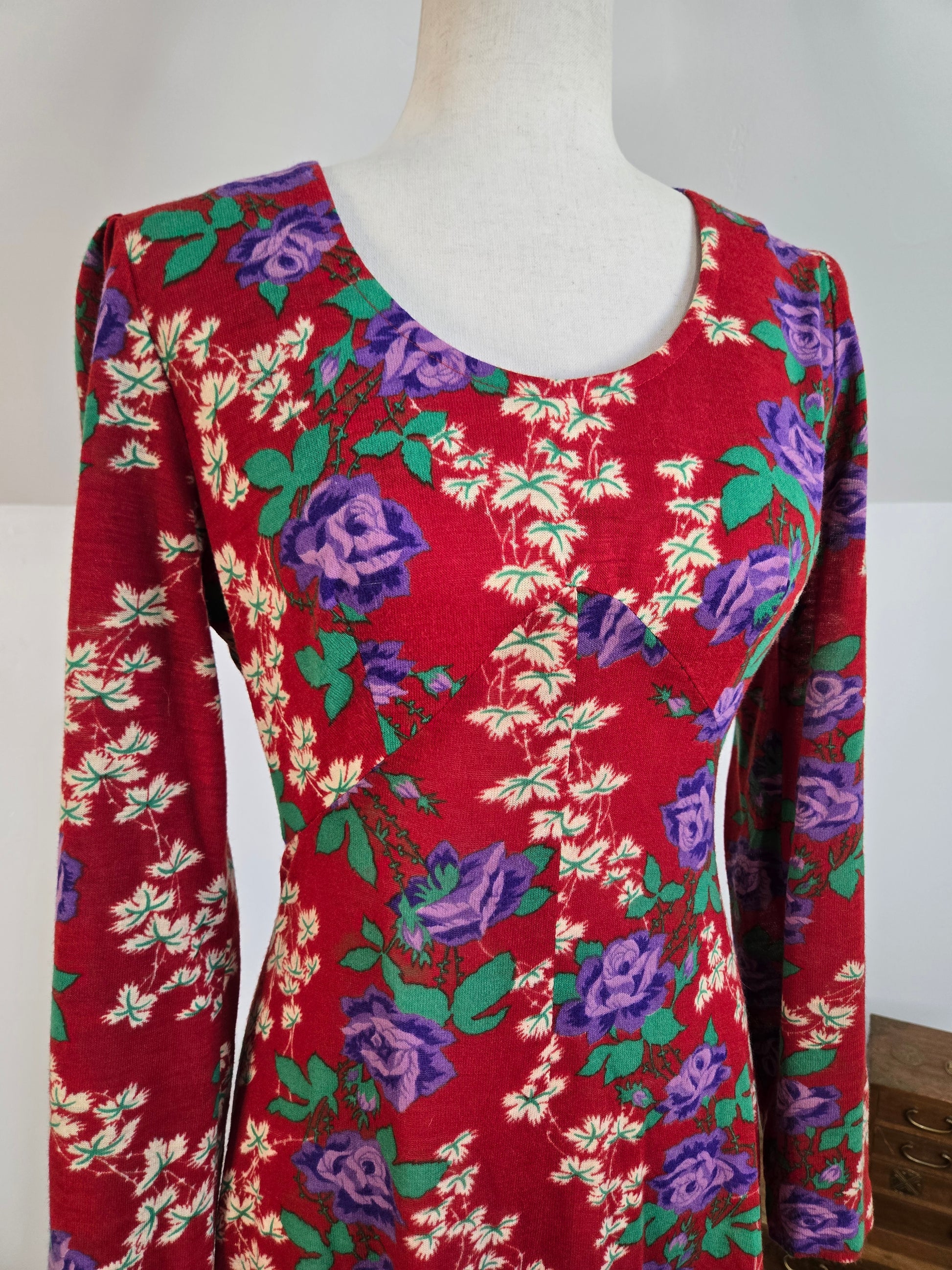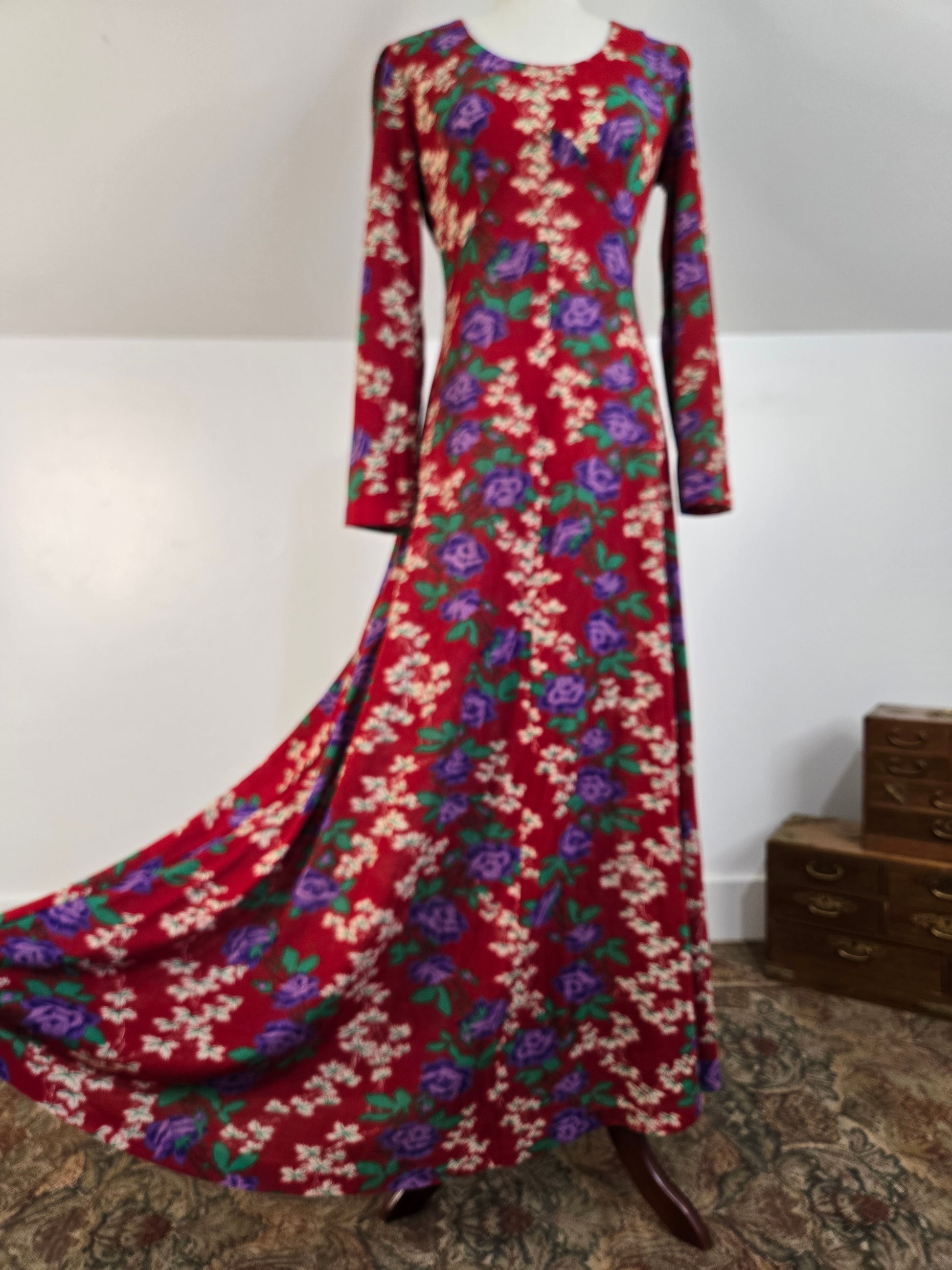 Vintage 1970s dark red maxi dress with a green and purple psychedelic print throughout. It has a zipper in the back to get into it and the fabric is hard to explain. It is a matte, dry feeling very thin poly material. It is very soft and has no imperfections.