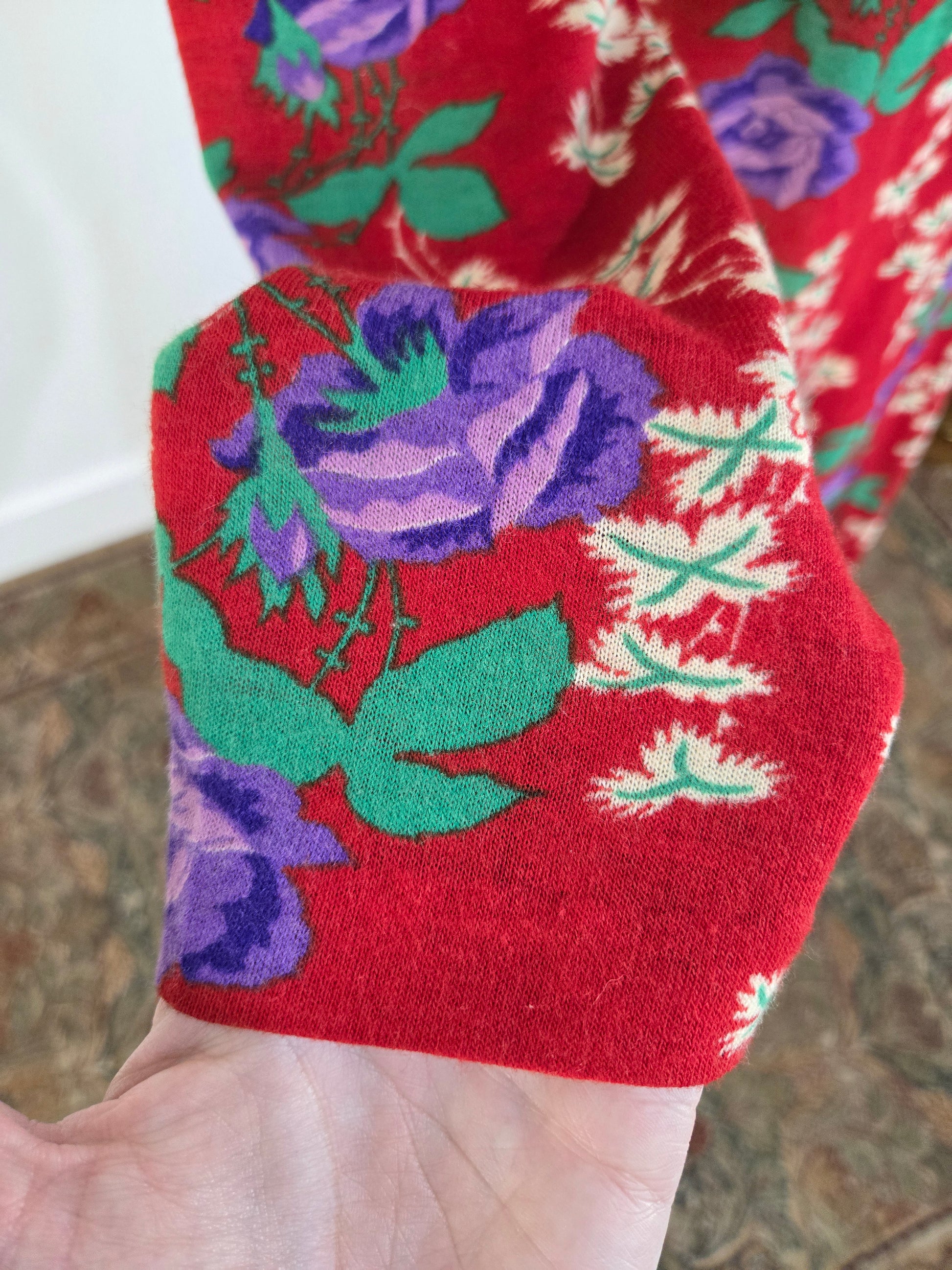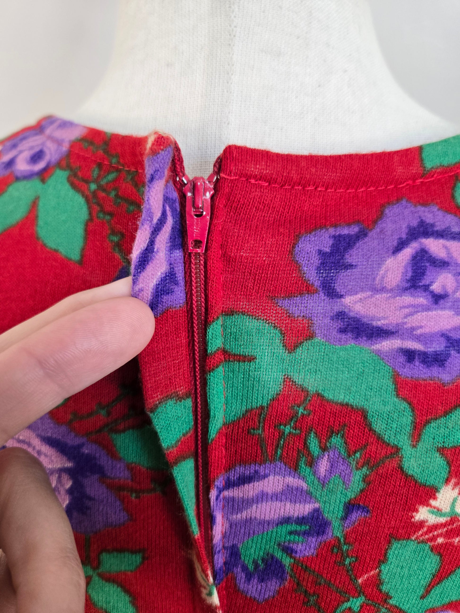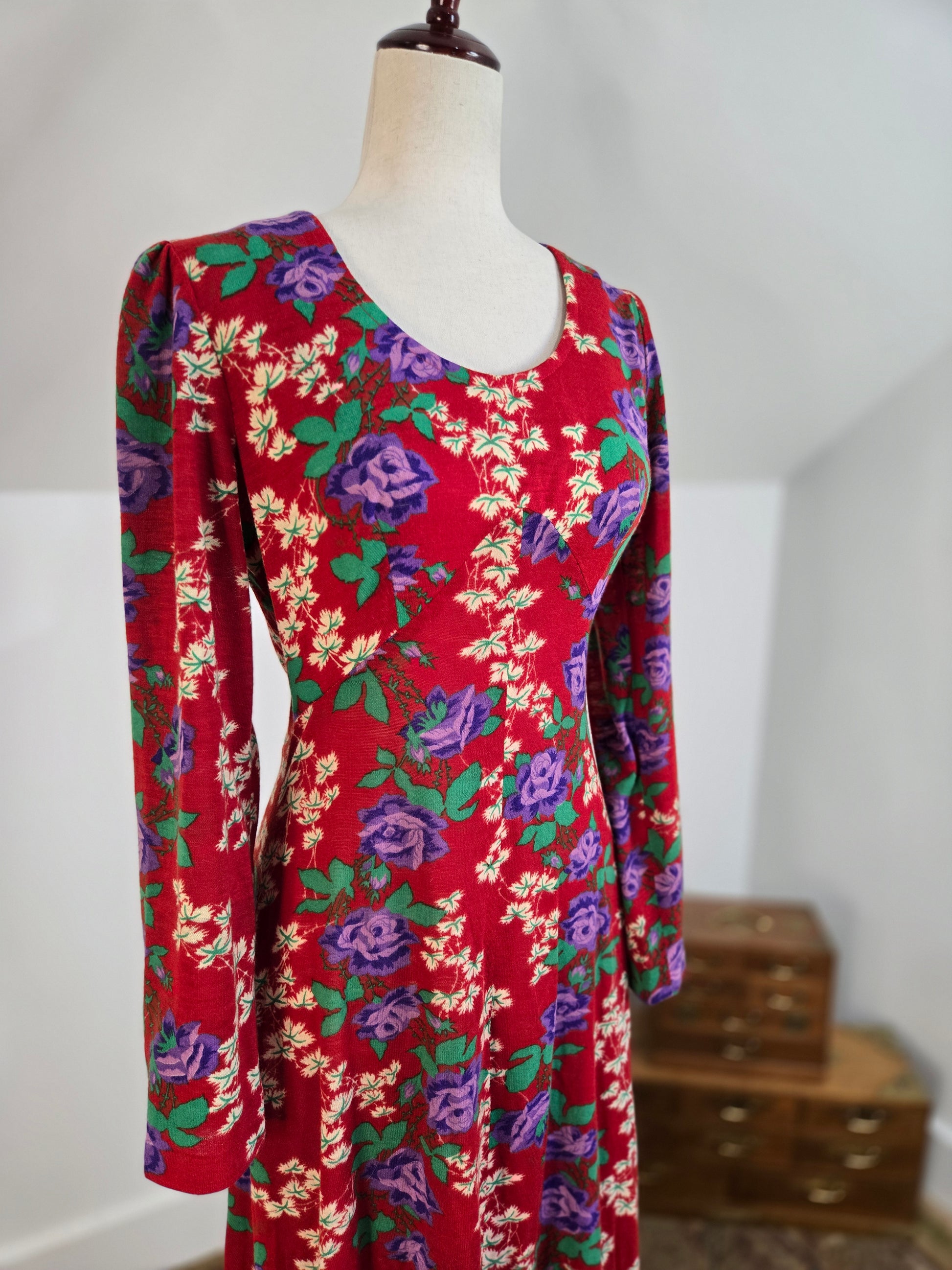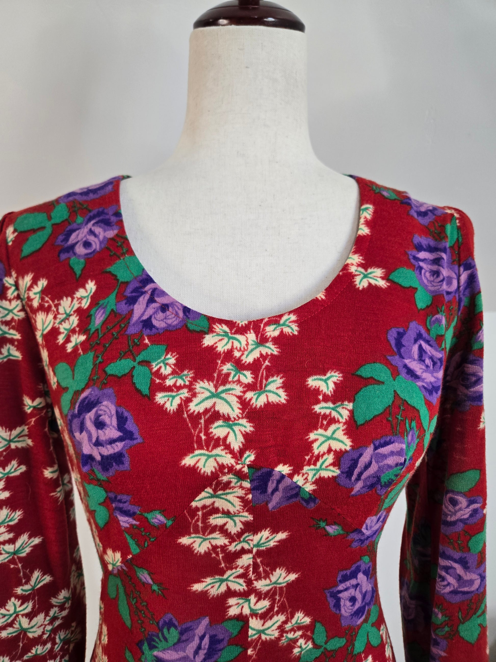 Vintage 1970s dark red maxi dress with a green and purple psychedelic print throughout. It has a zipper in the back to get into it and the fabric is hard to explain. It is a matte, dry feeling very thin poly material. It is very soft and has no imperfections.