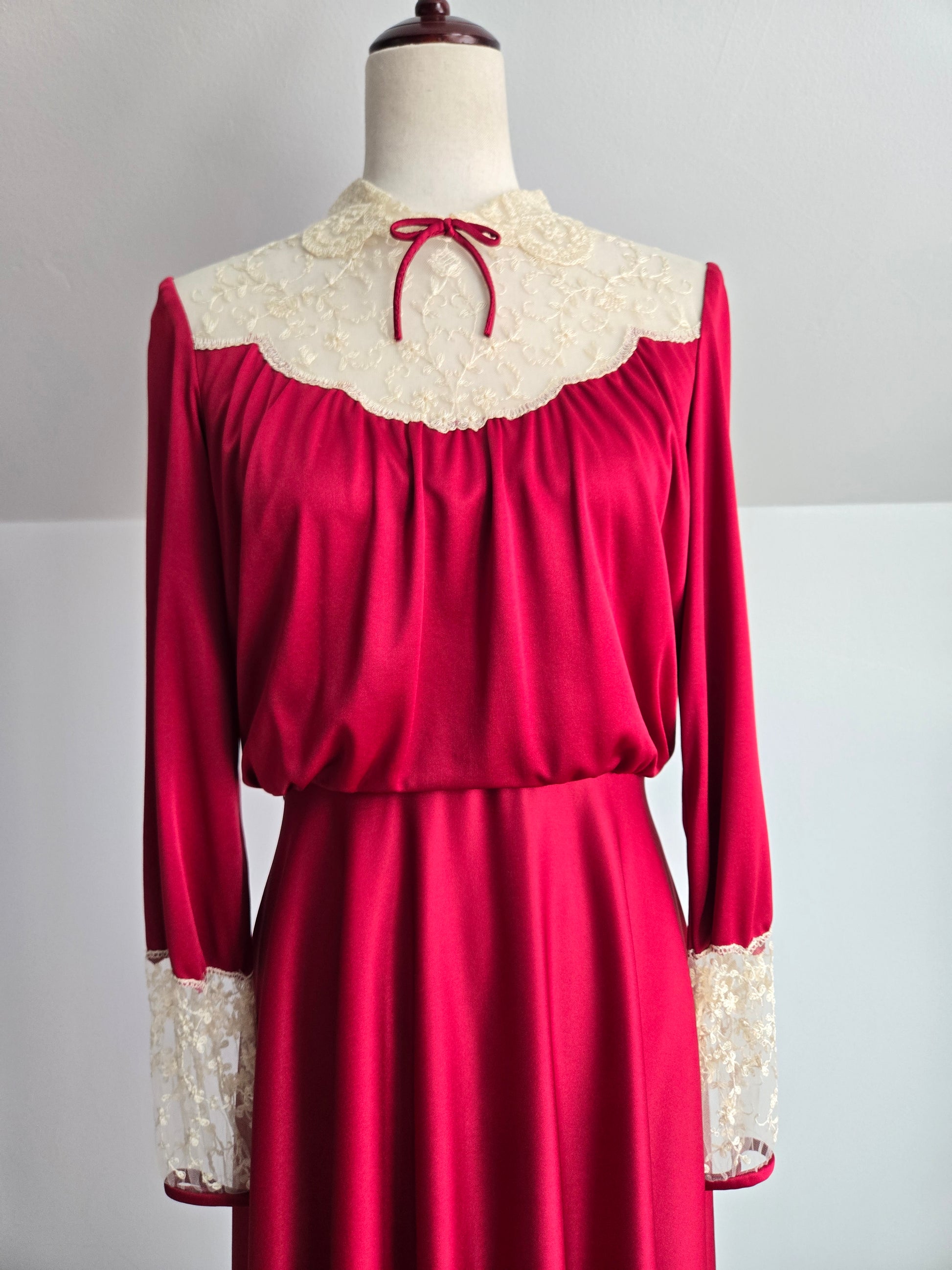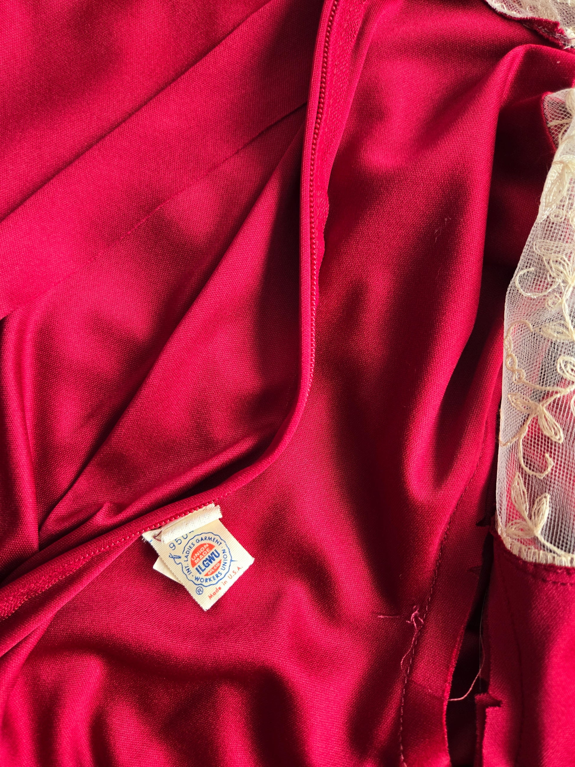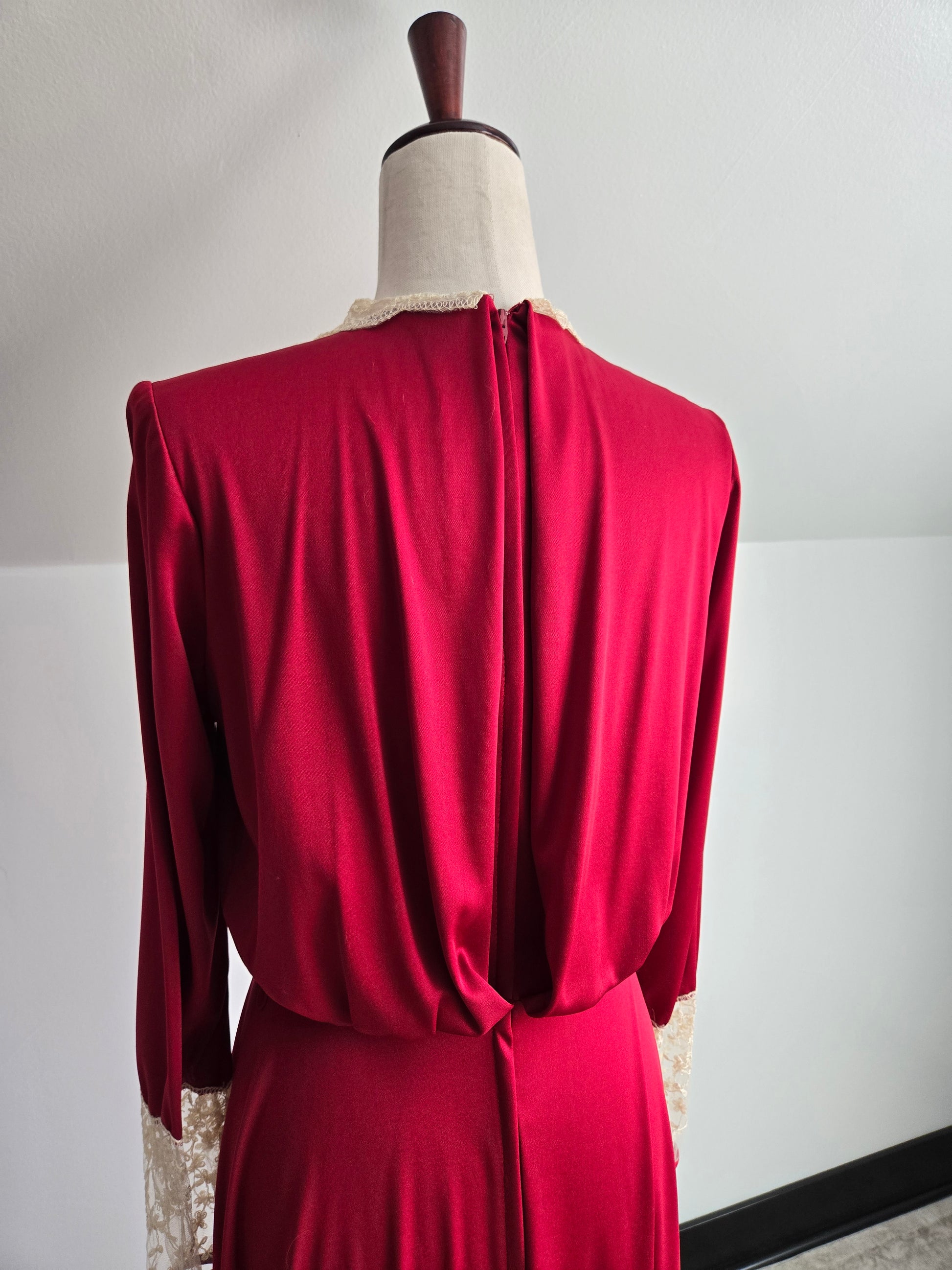 Vintage Union Made dark red slinky maxi dress with creamy colored lace detail at the top neckline and end of the sleeve. It has a stationary waist and zips up the back. It is in amazing condition and has been washed and steamed, so it is ready to wear.