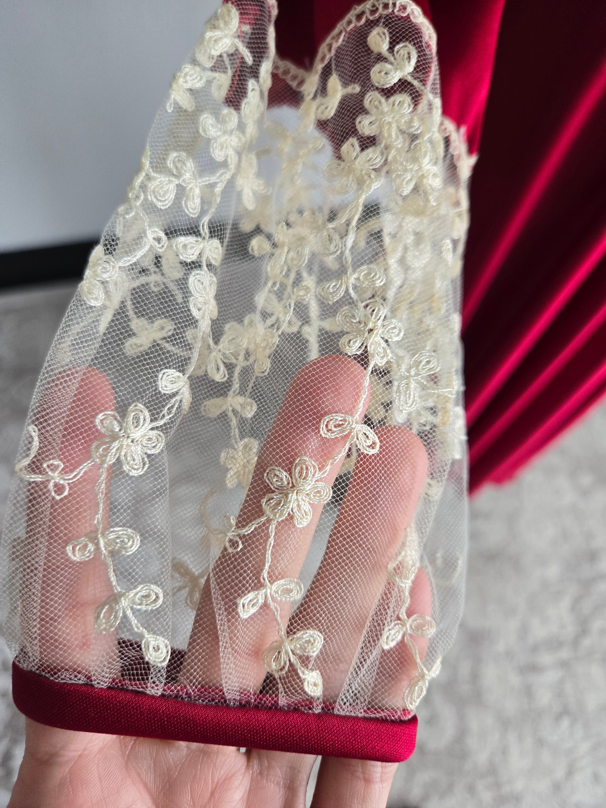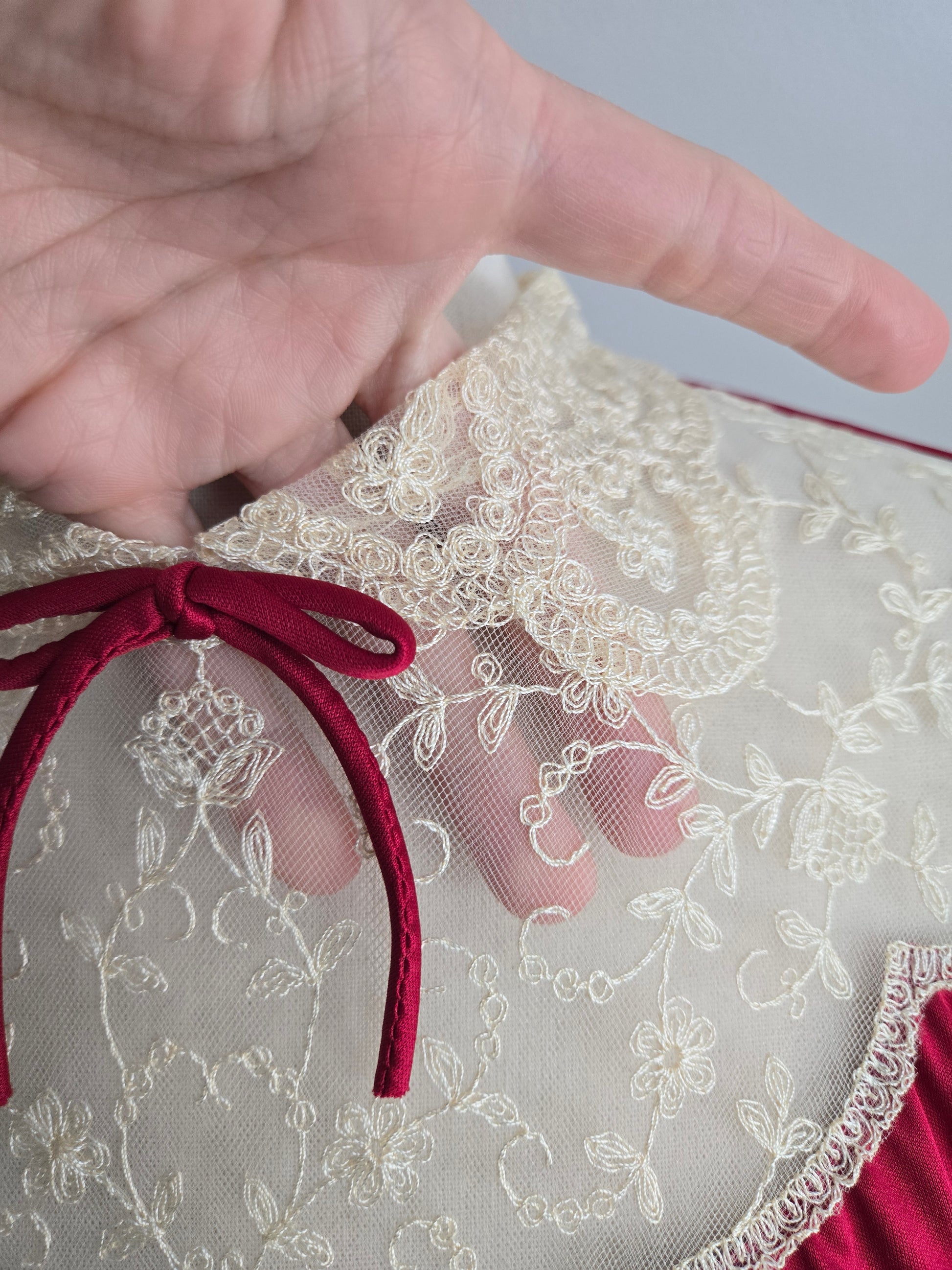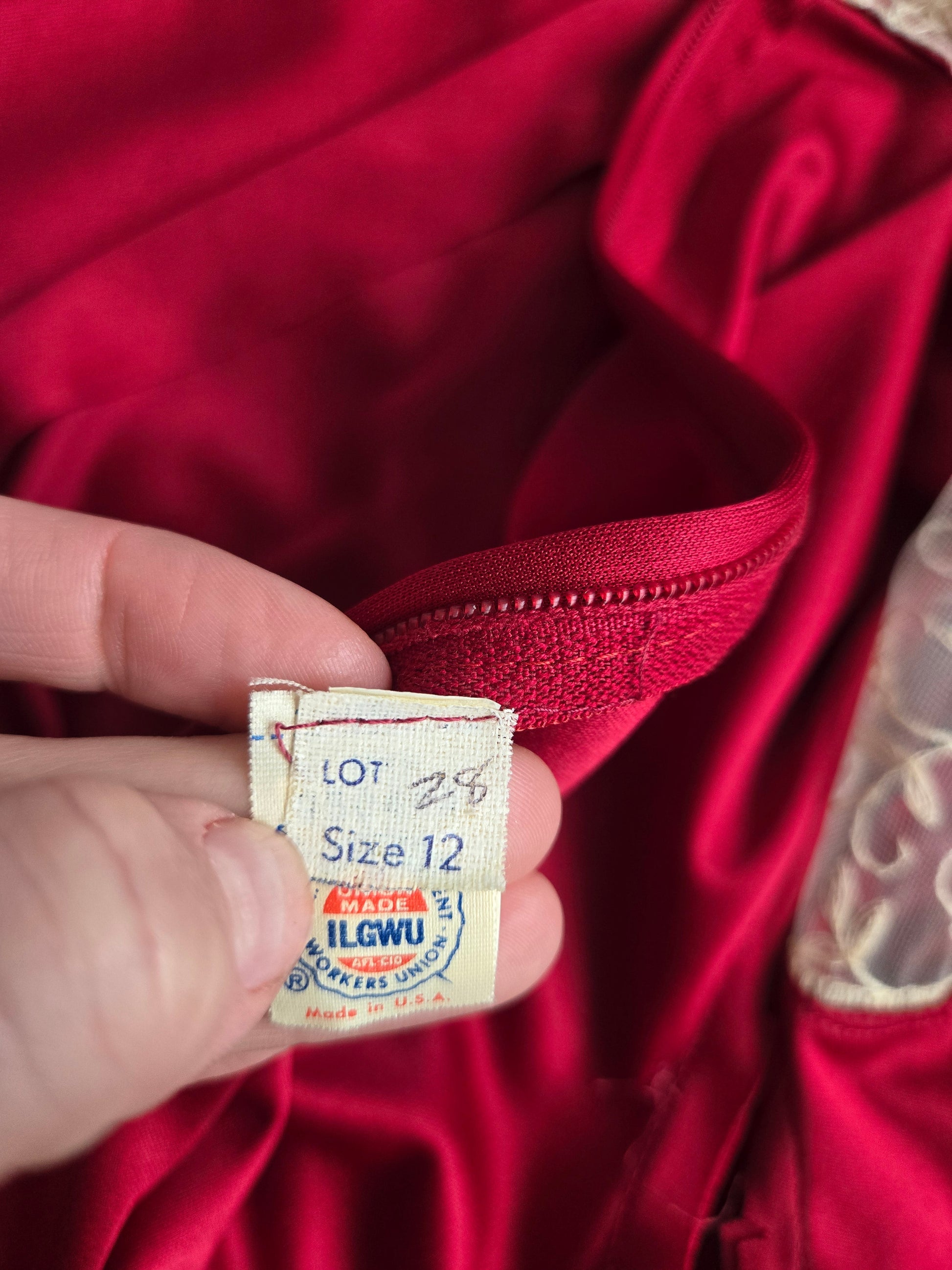Vintage Union Made dark red slinky maxi dress with creamy colored lace detail at the top neckline and end of the sleeve. It has a stationary waist and zips up the back. It is in amazing condition and has been washed and steamed, so it is ready to wear.