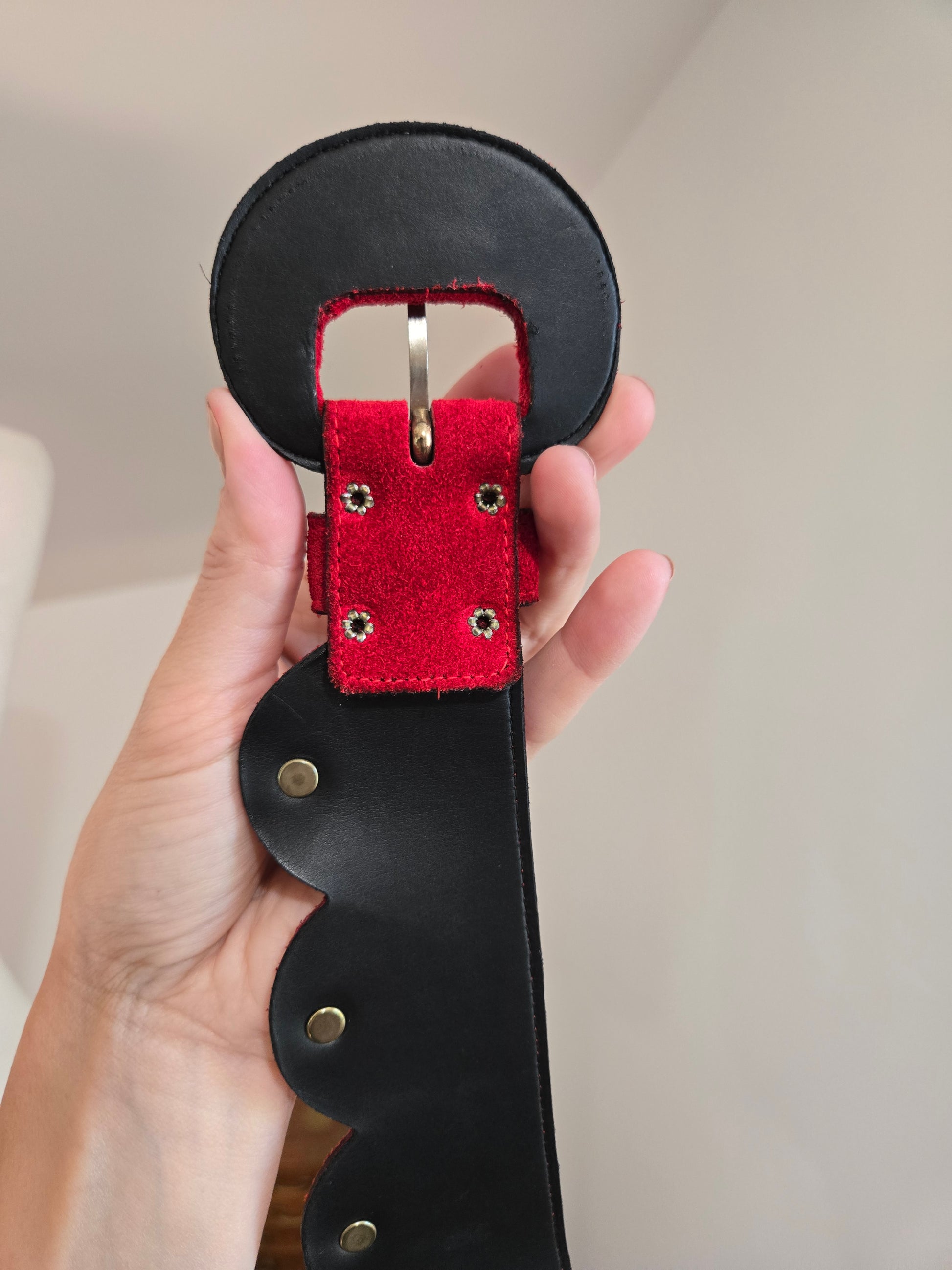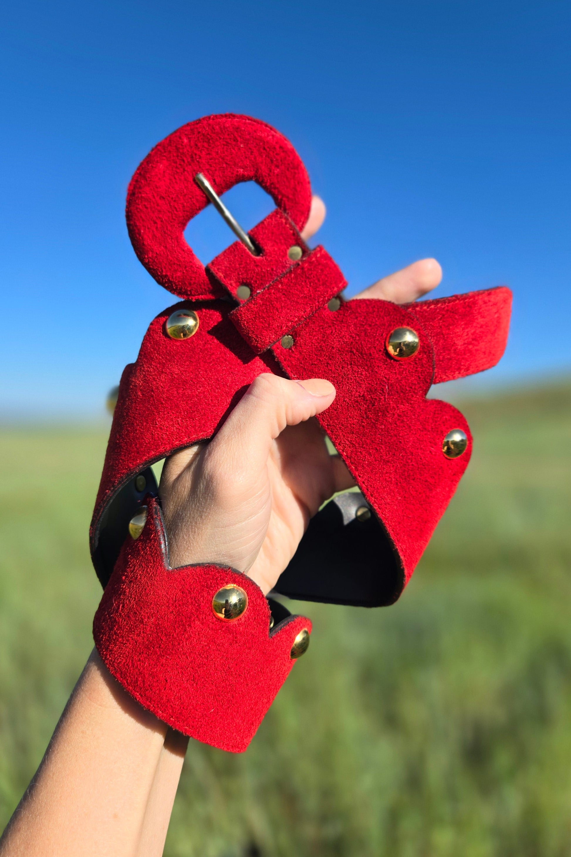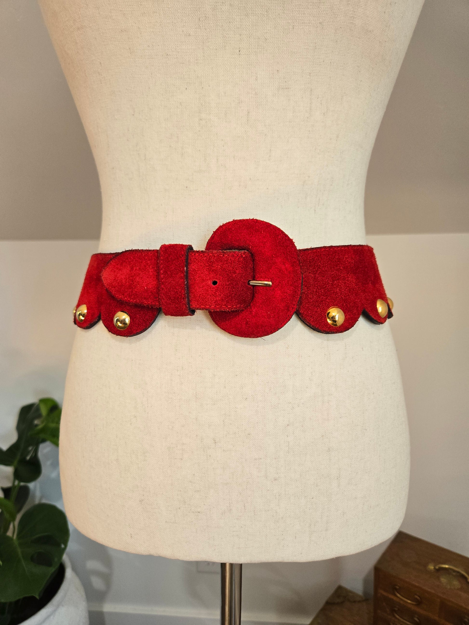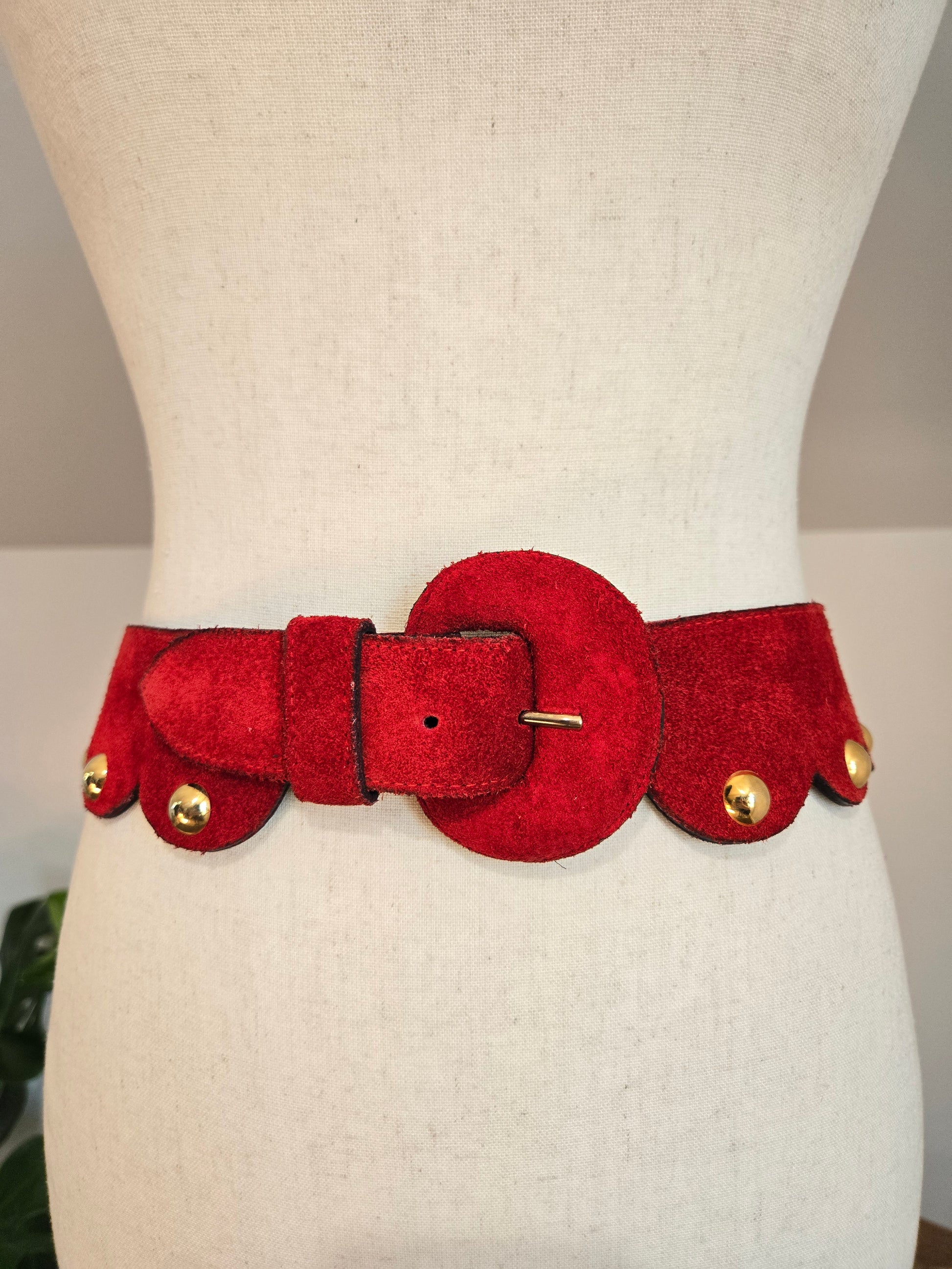 Vintage Genuine Red Suede Leather Belt with Gold Studs - W30-32"