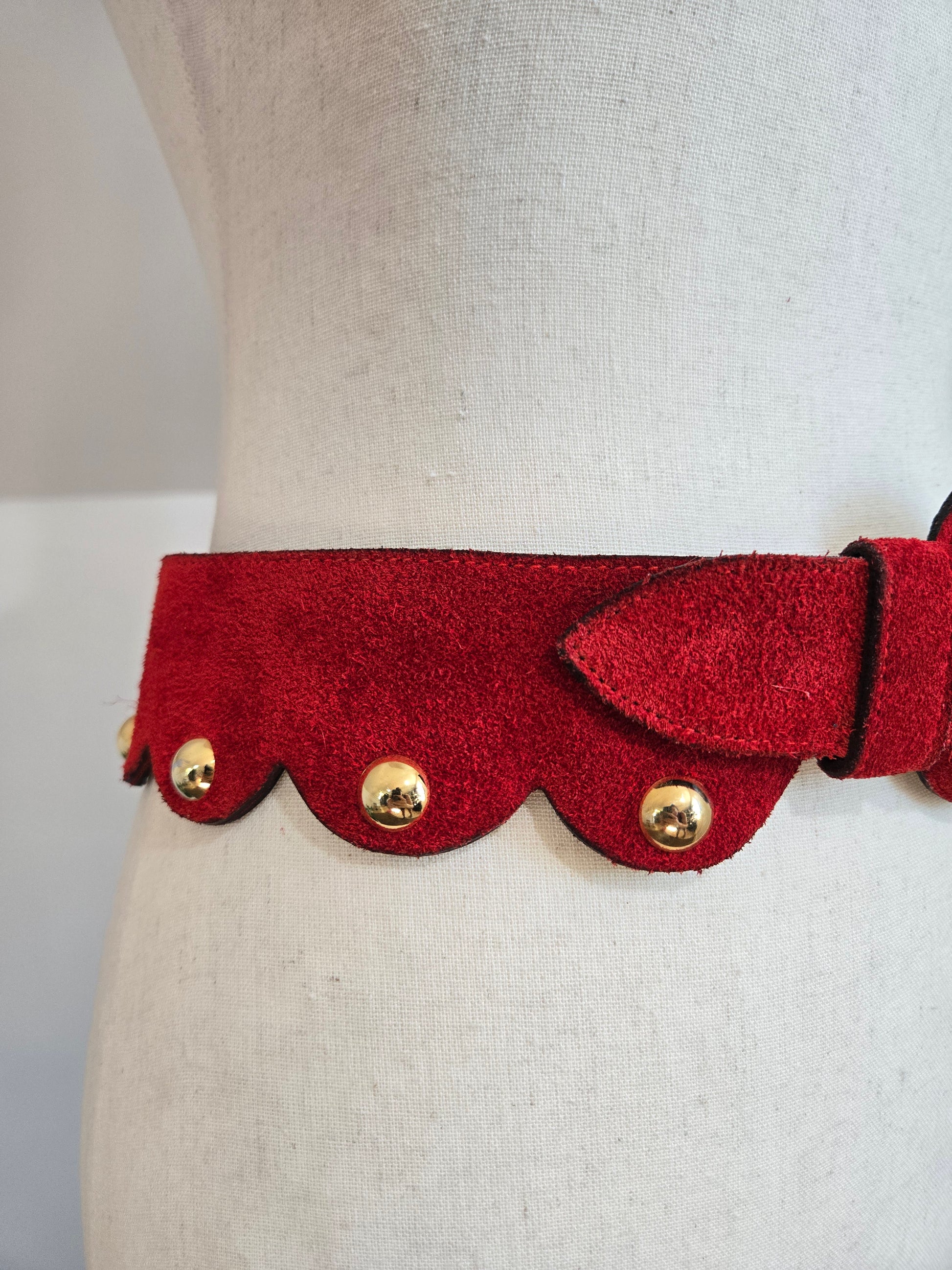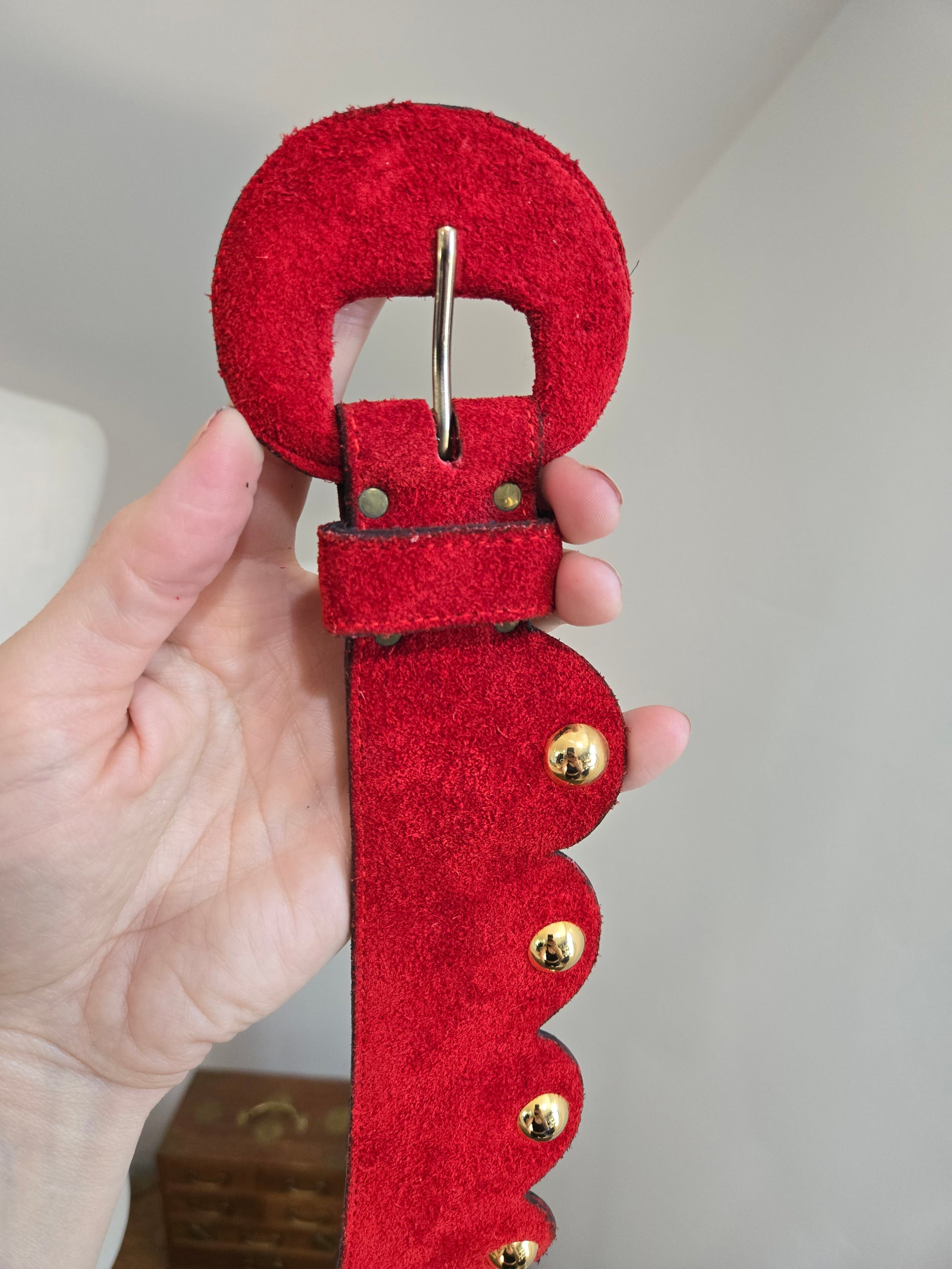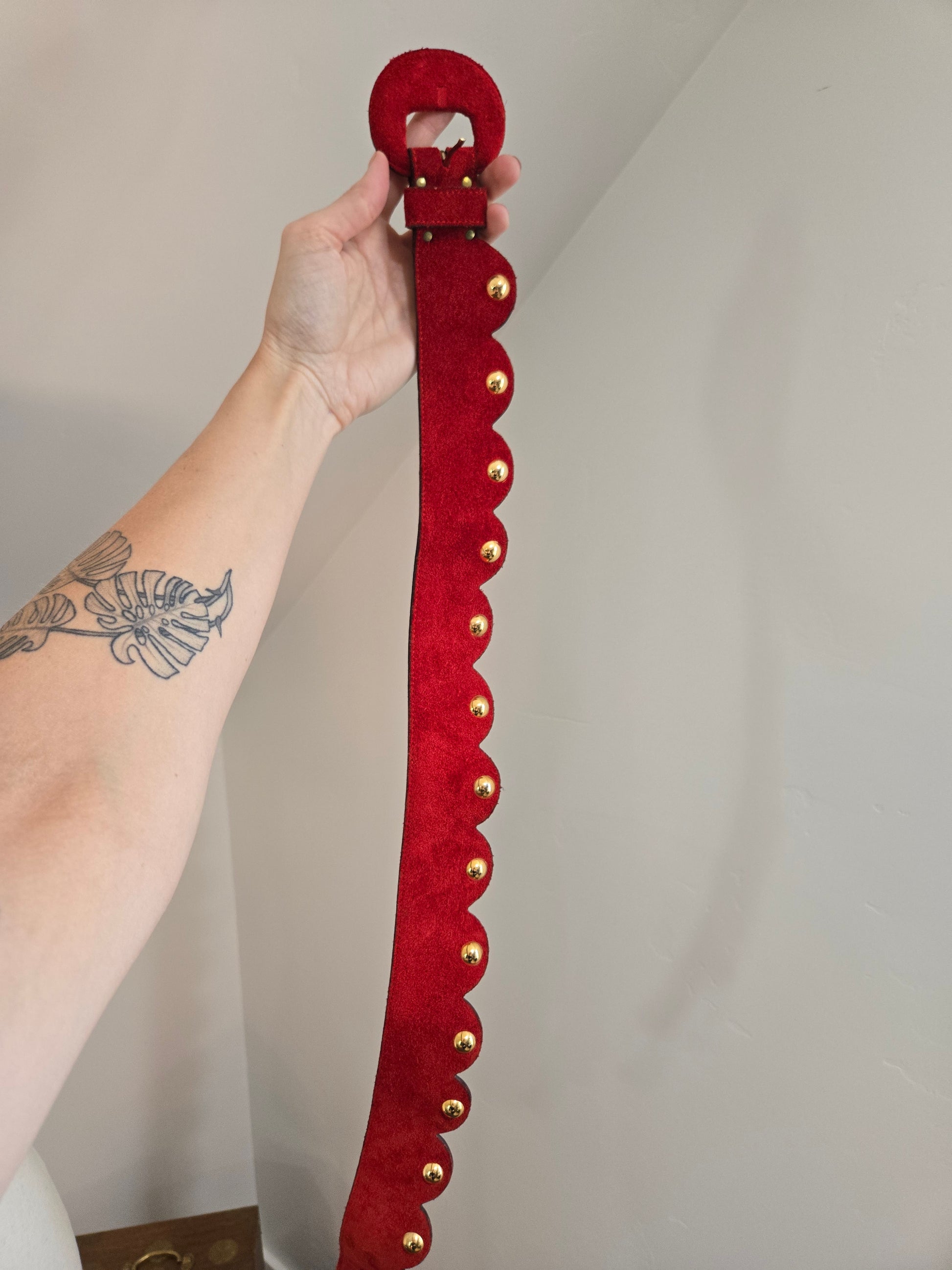 Vintage genuine red suede leather scalloped edge curved belt. It has gold tone studs throughout all the scallops that are completely studded through the material. It is in like new condition with no signs of wear. Tagged a size small.