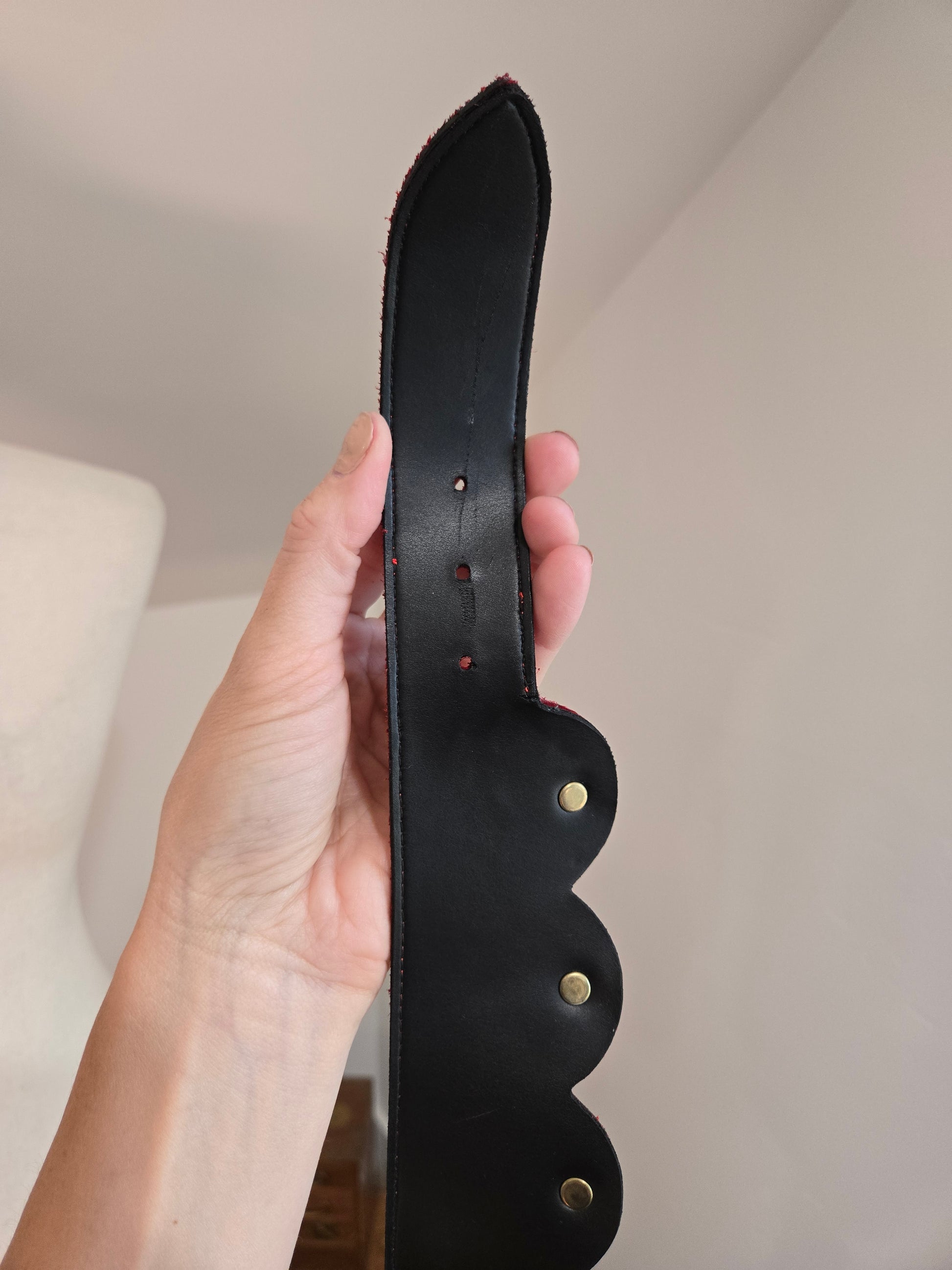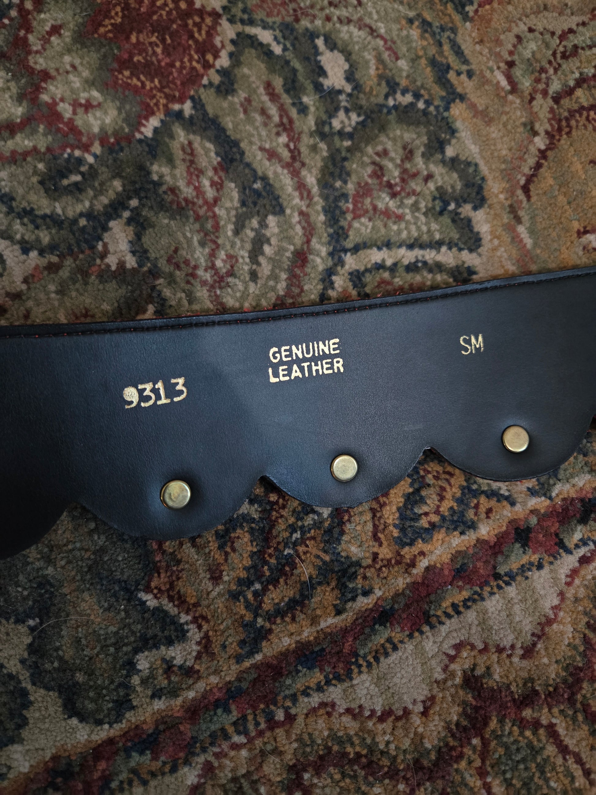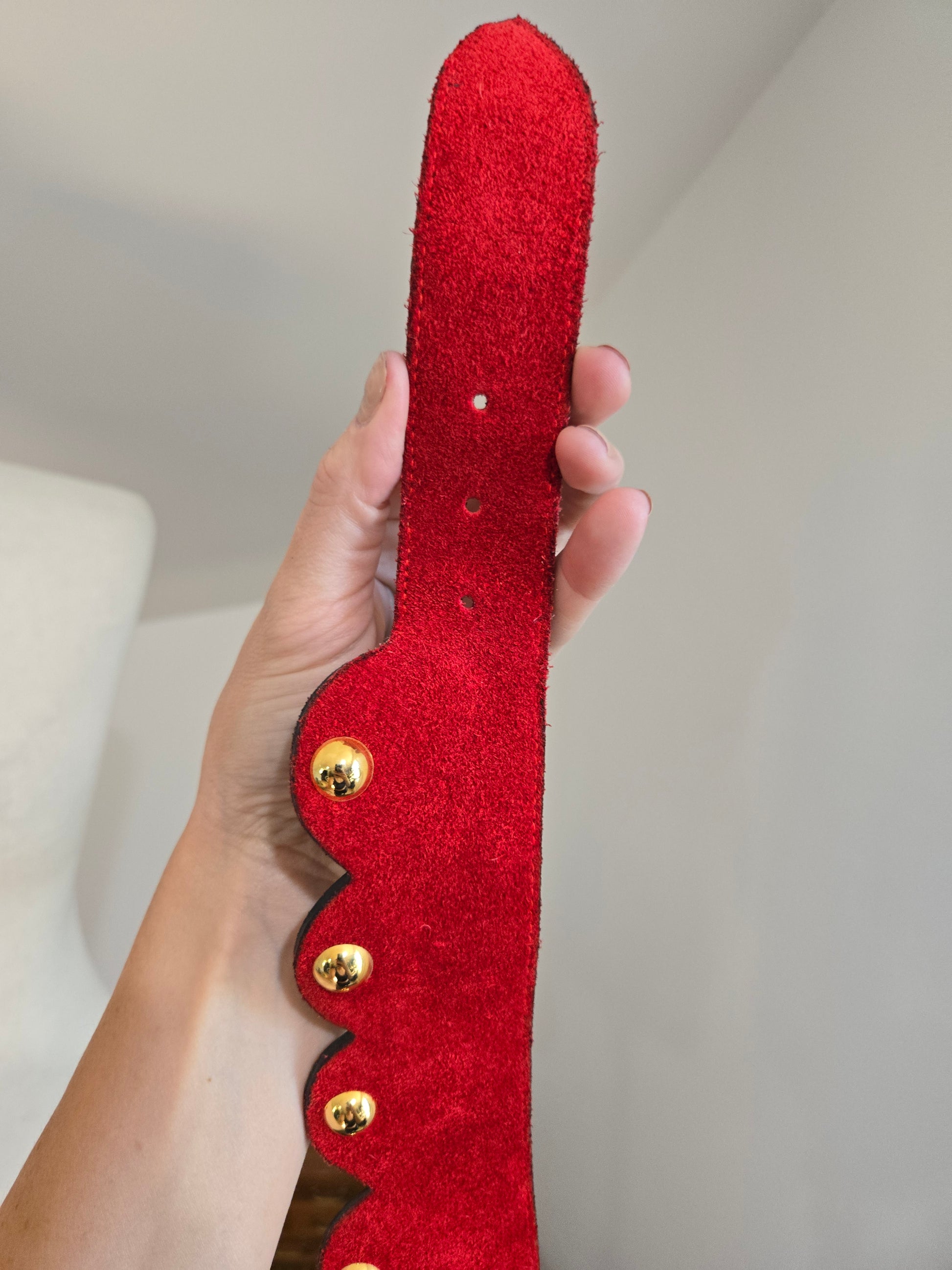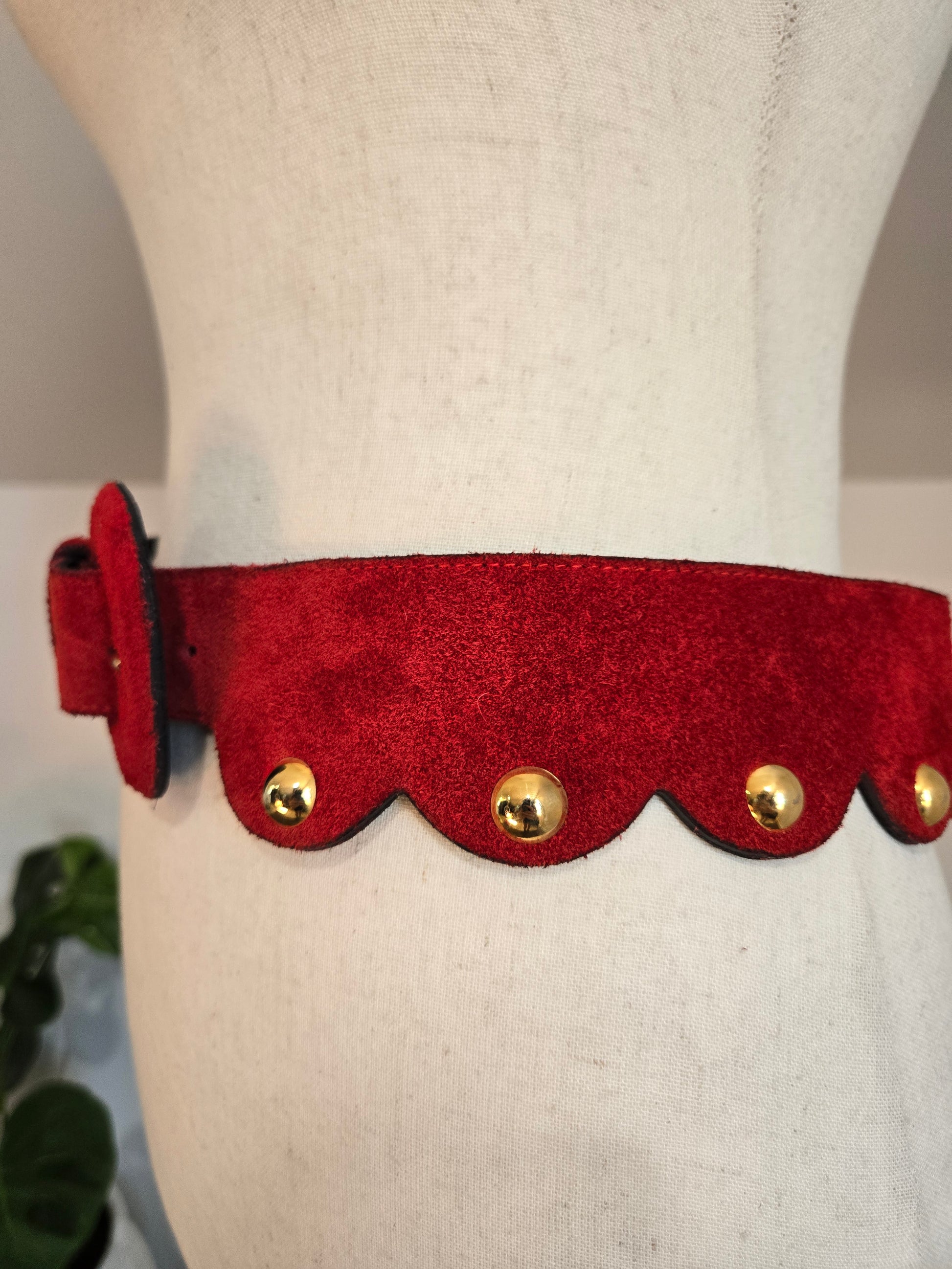 Vintage genuine red suede leather scalloped edge curved belt. It has gold tone studs throughout all the scallops that are completely studded through the material. It is in like new condition with no signs of wear. Tagged a size small.