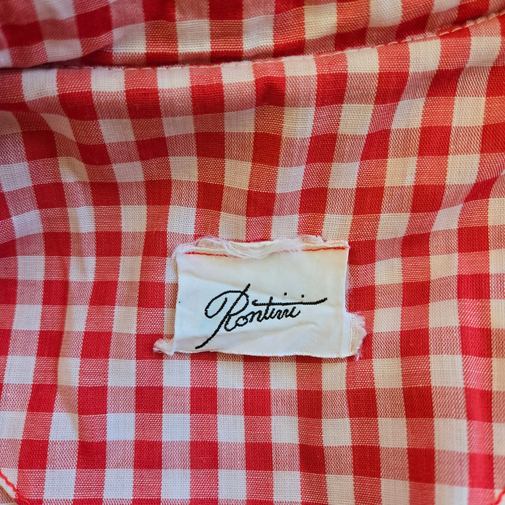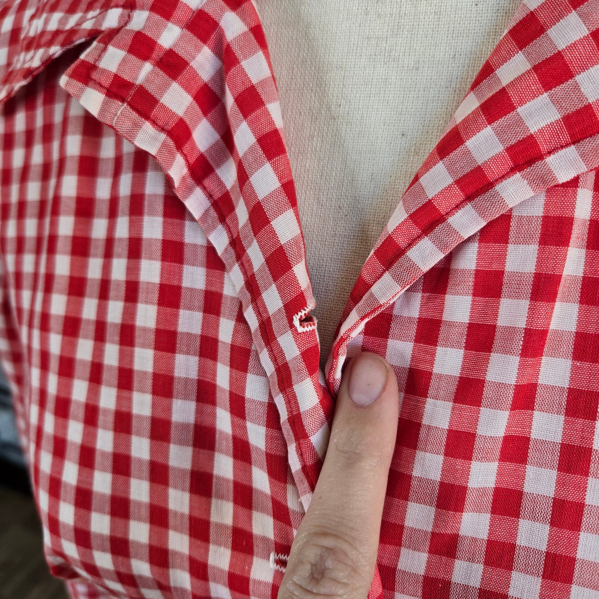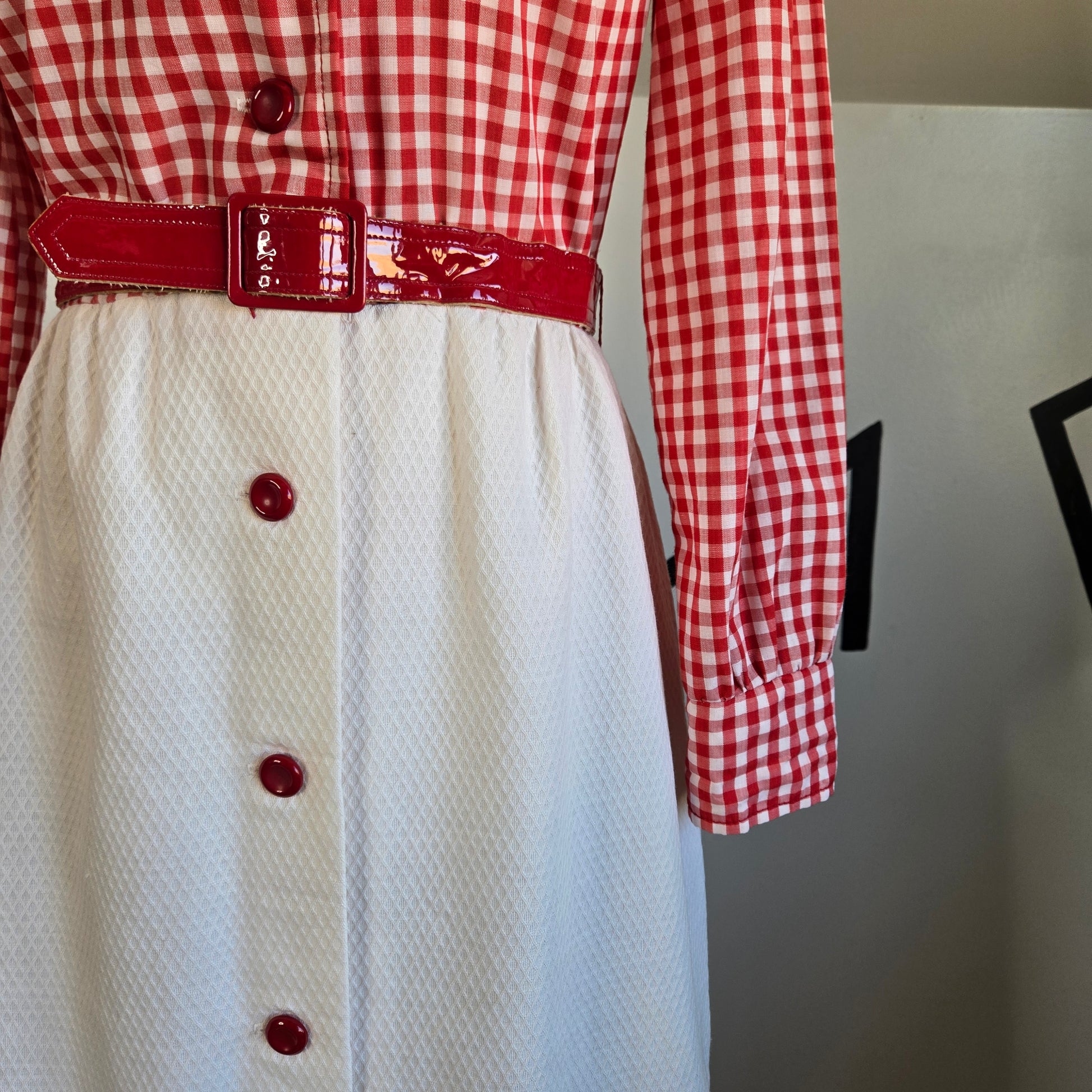Vintage Rontini cotton 70s dress with a white and red gingham plaid top and a textured white fabric bottom. It buttons down the front and can completely open up. It has plaid floral appliques surrounded by embroideries as well around the whole bottom of the dress. It comes with its red belt, but the belt is a little crinkly and stiff. It is missing it's top button, but it is not one that I think would be used much (pointing to location in picture).
