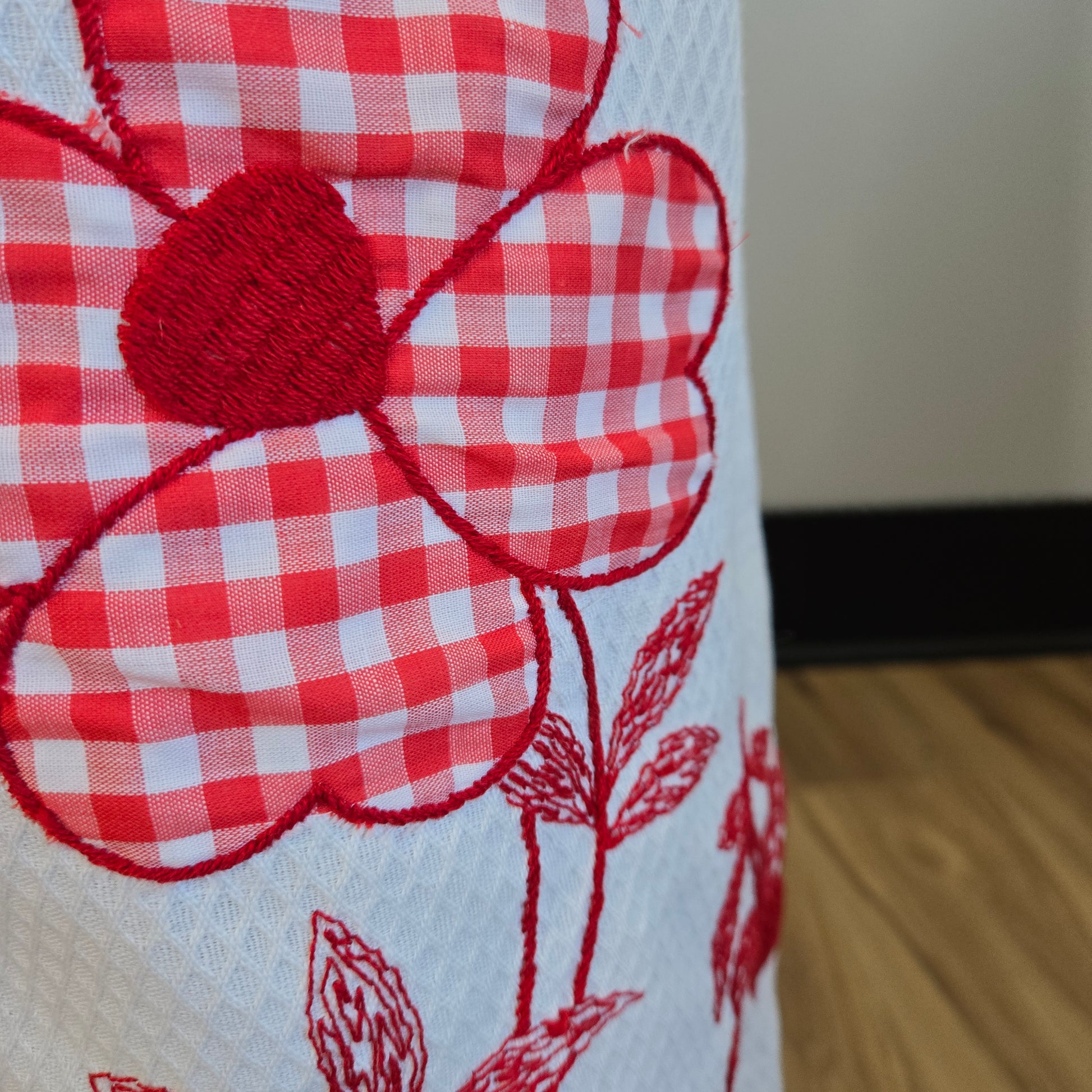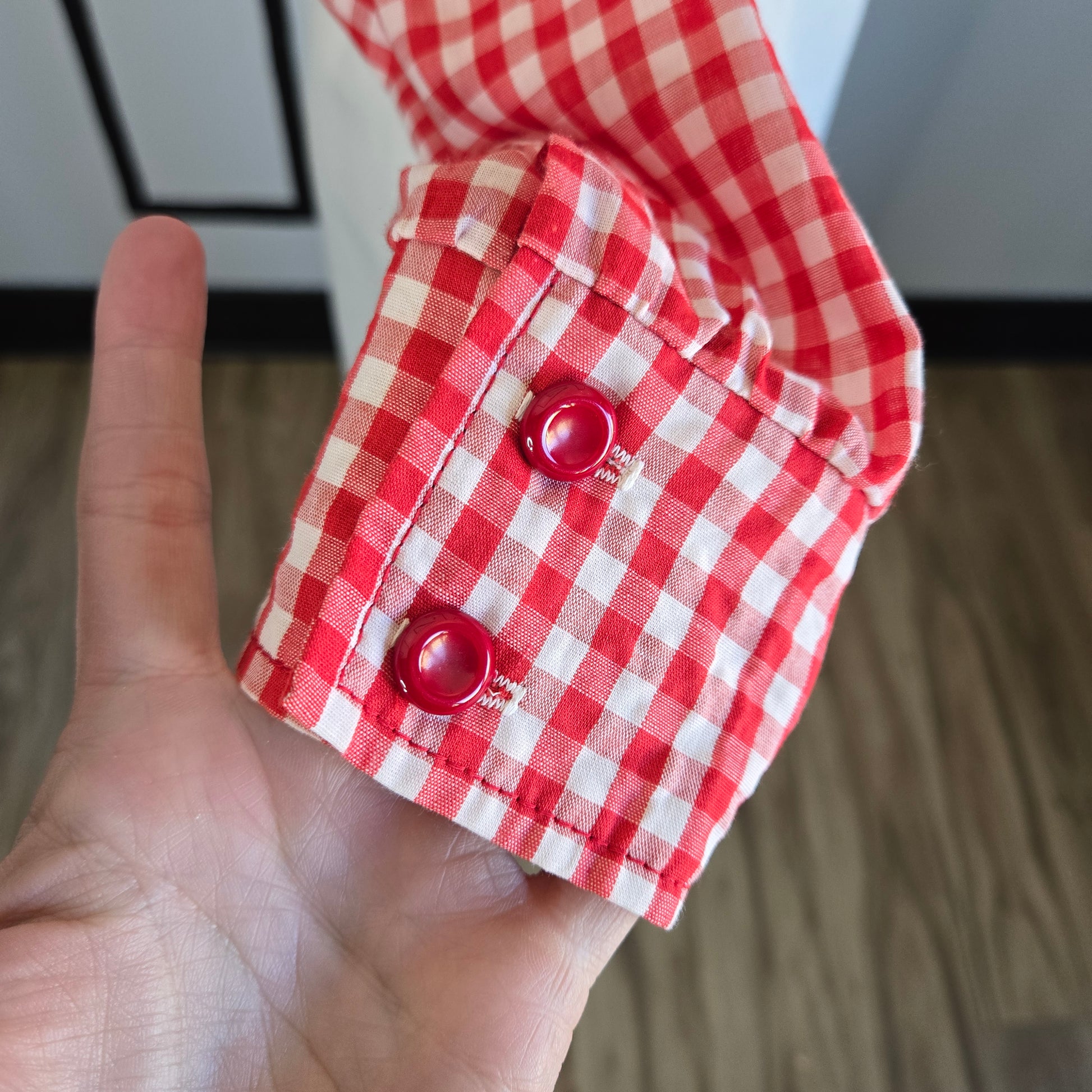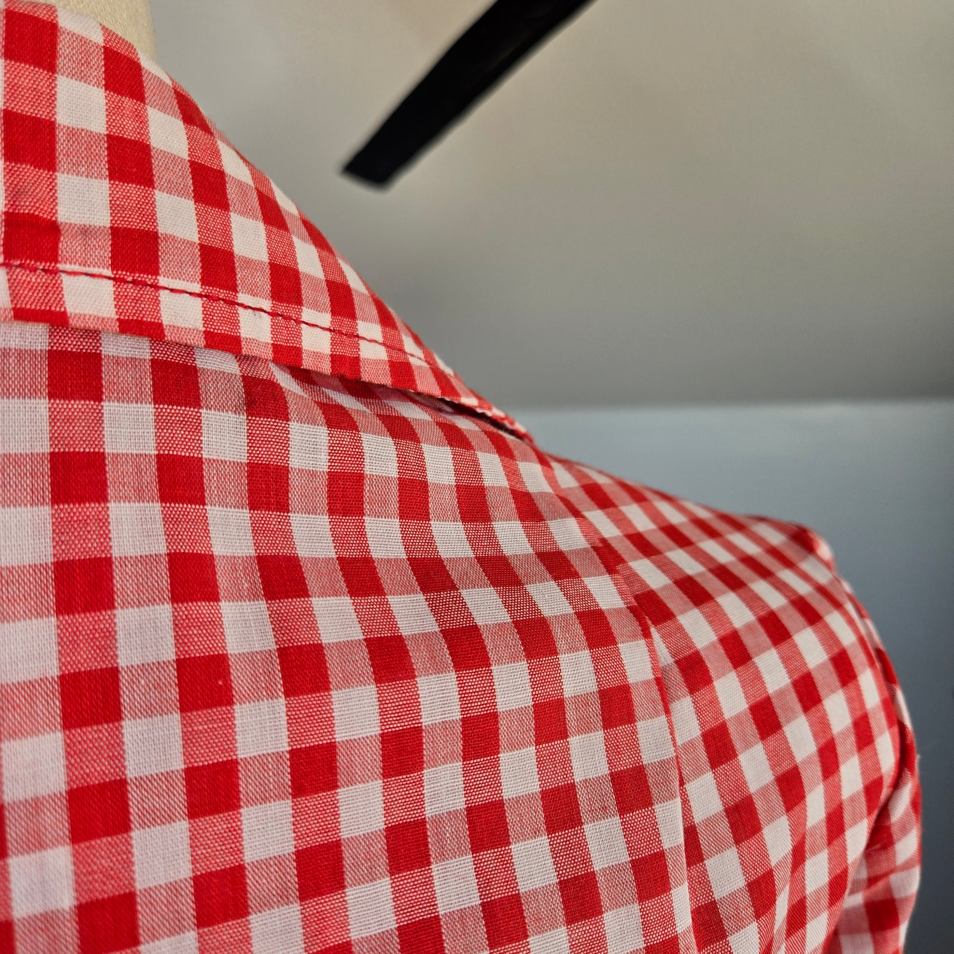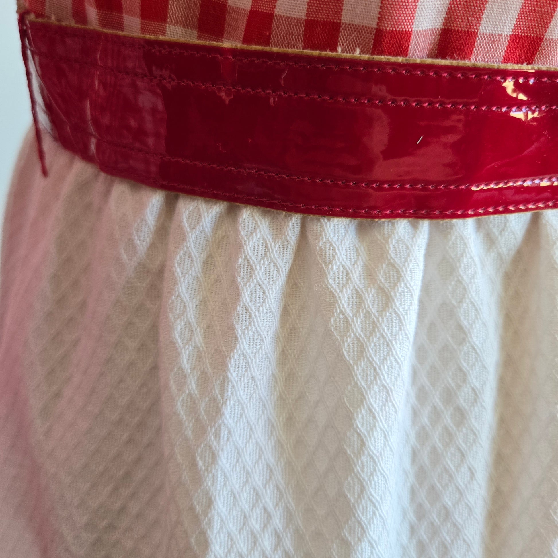 Vintage Rontini cotton 70s dress with a white and red gingham plaid top and a textured white fabric bottom. It buttons down the front and can completely open up. It has plaid floral appliques surrounded by embroideries as well around the whole bottom of the dress. It comes with its red belt, but the belt is a little crinkly and stiff. It is missing it's top button, but it is not one that I think would be used much (pointing to location in picture).