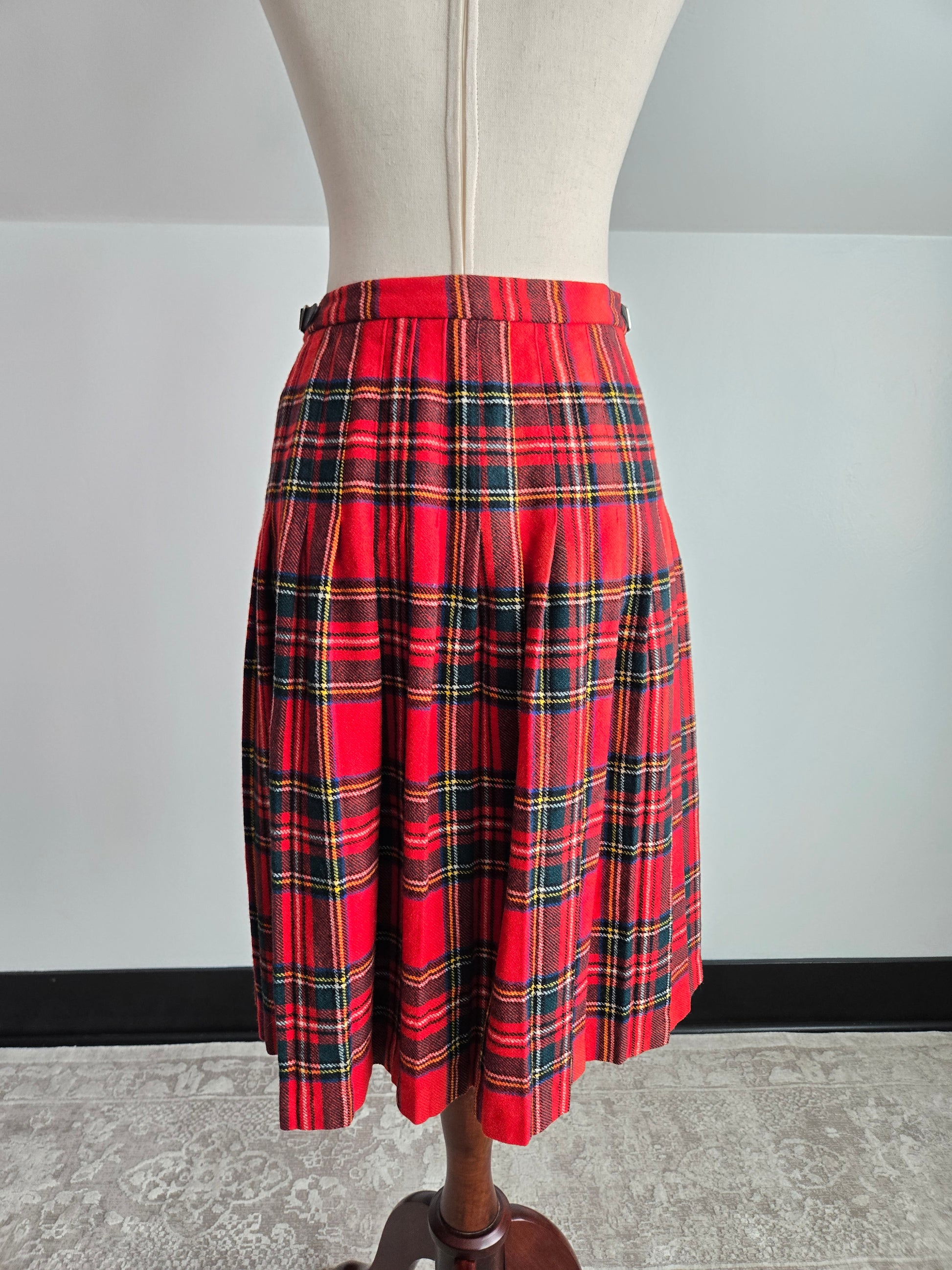 Vintage Pitlochry Scottish wool stewart plaid kilt skirt. It has functional leather straps on both sides that can adjust a few inches, reflecting in the size range. It is a flat wrap front and a pleated back. This skirt has been fully laundered and steamed, so it is clean and ready to wear. Leather straps have also been conditioned with leather cleaner. Perfect condition. Made in Scotland.