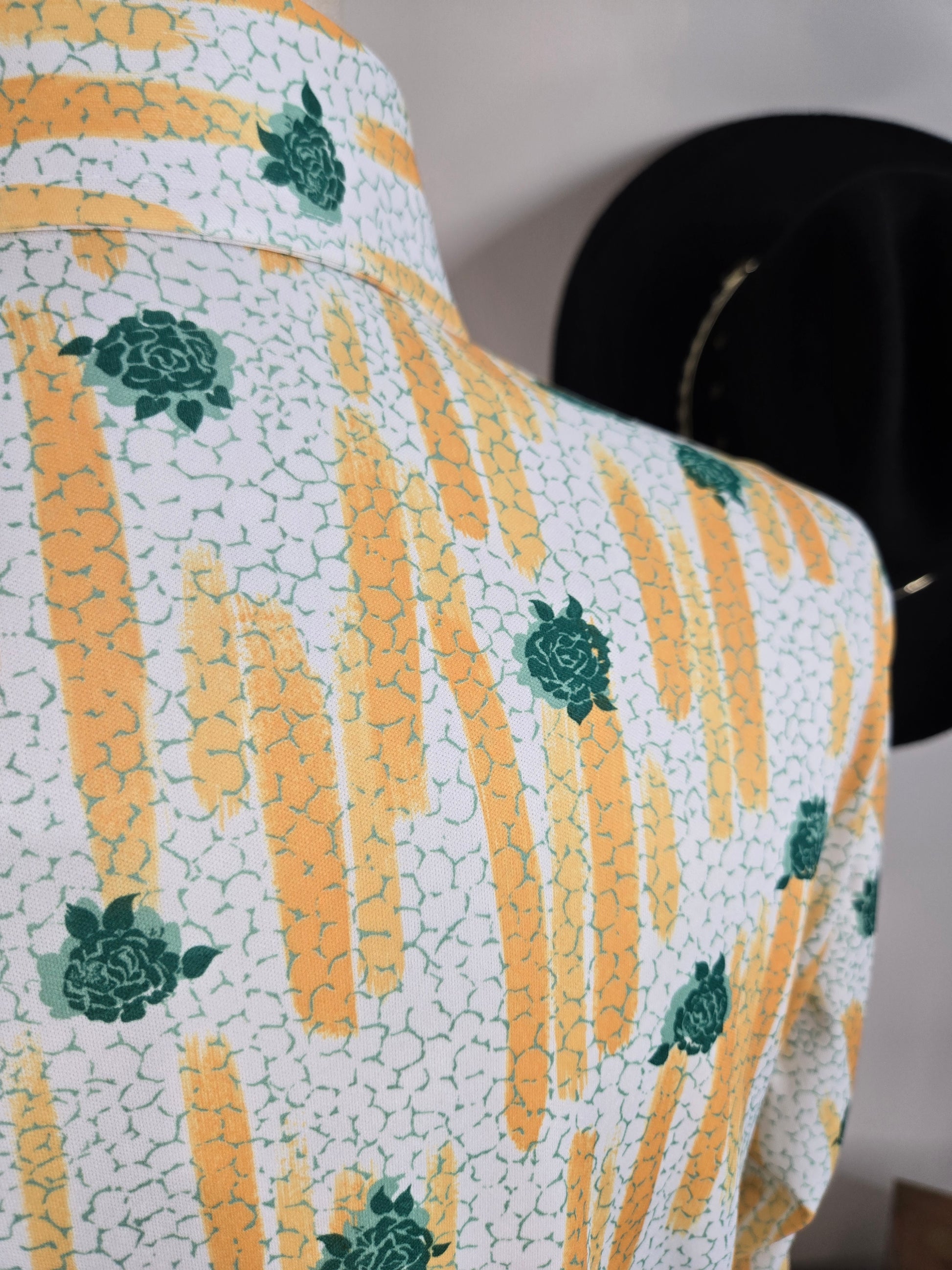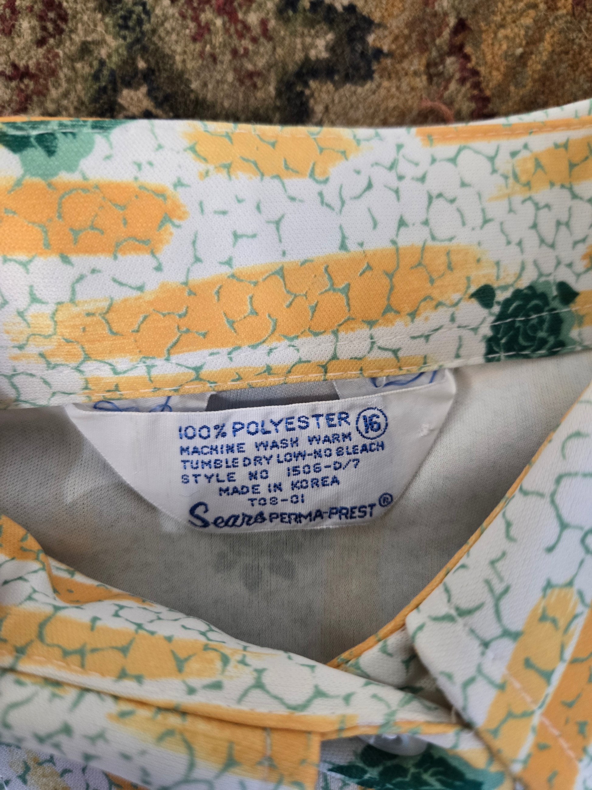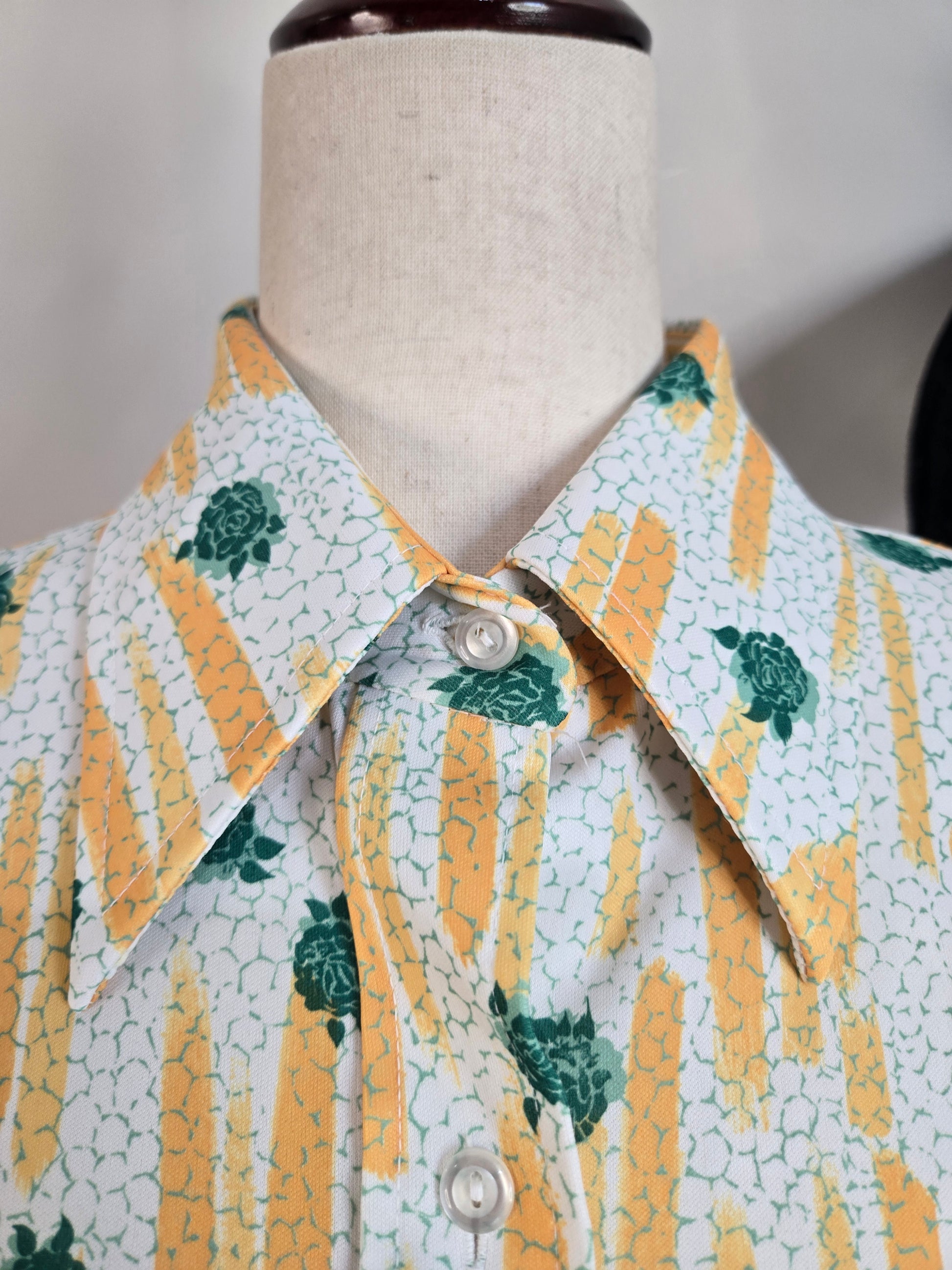 Sears vintage 1970s white nylon button down top with an abstract yellow shapes and green roses print. I am calling it: Raining Roses! Perfect condition and freshly laundered and steamed.