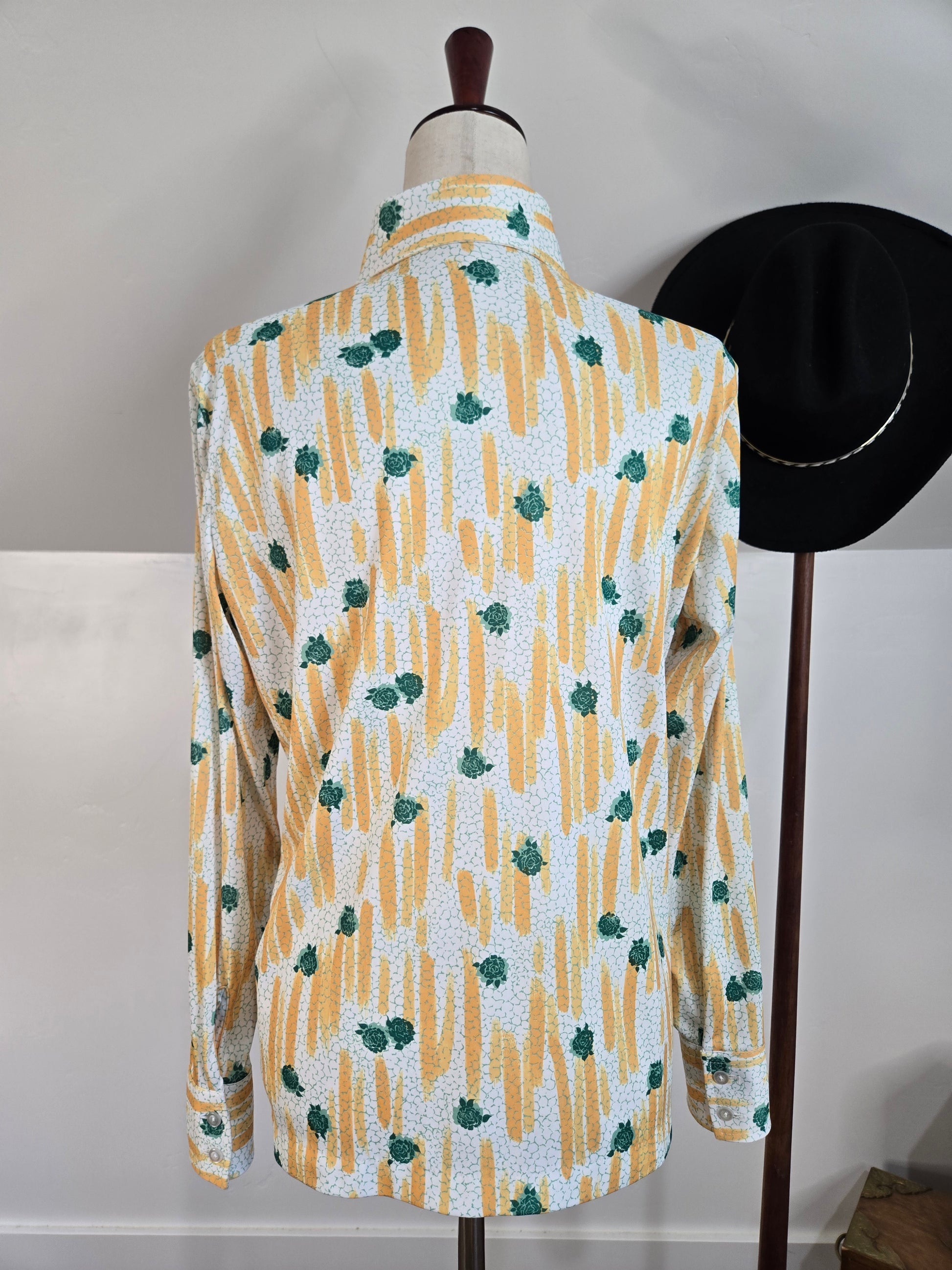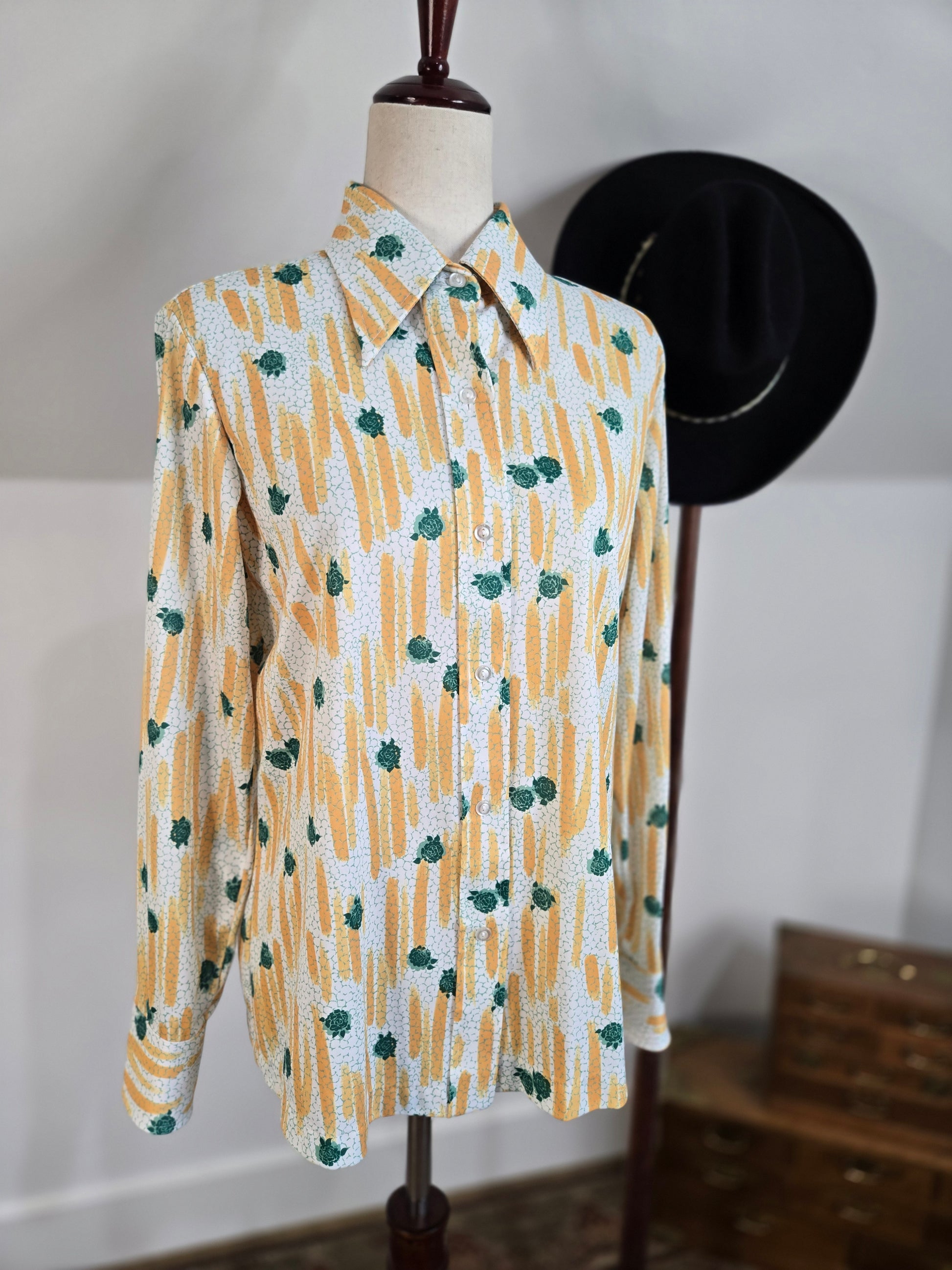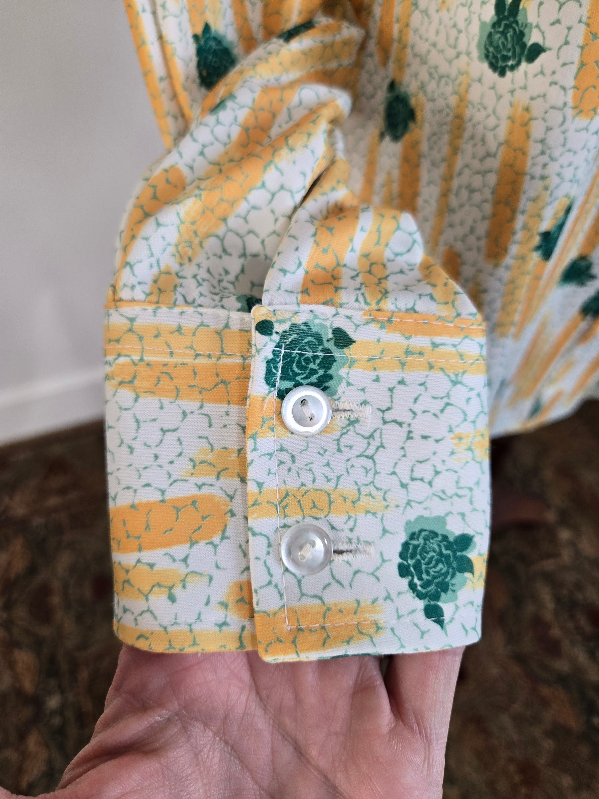 Sears vintage 1970s white nylon button down top with an abstract yellow shapes and green roses print. I am calling it: Raining Roses! Perfect condition and freshly laundered and steamed.