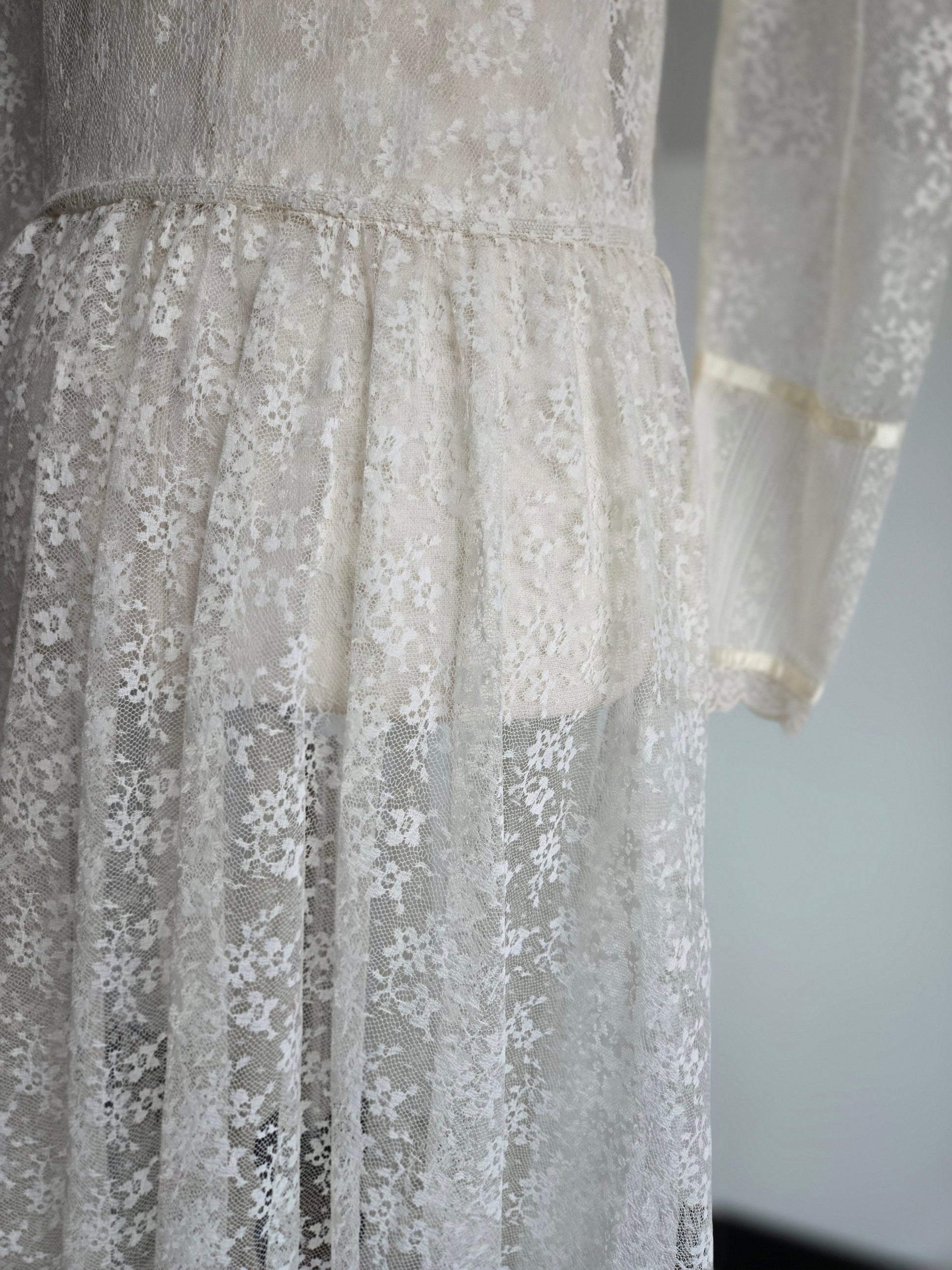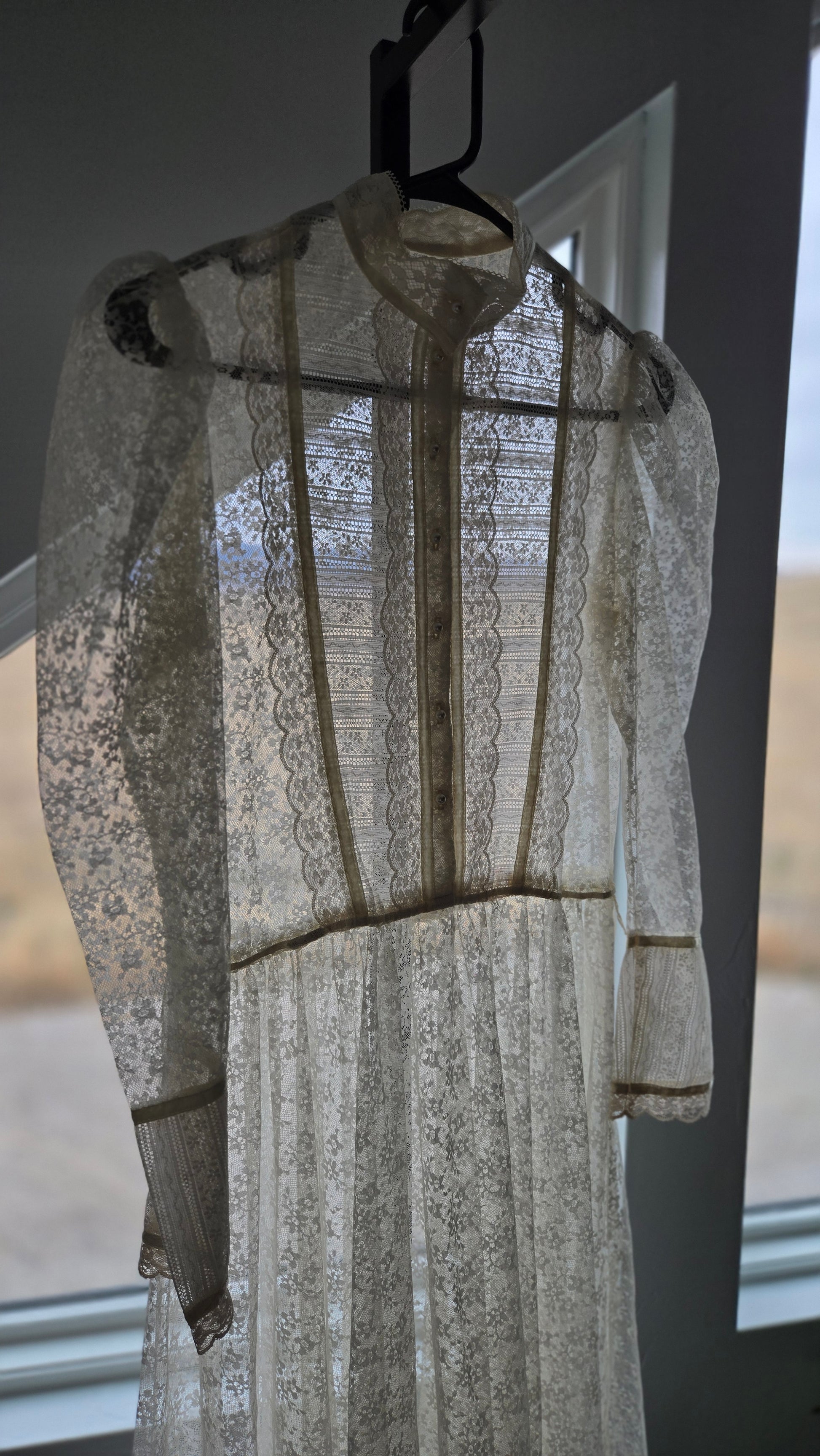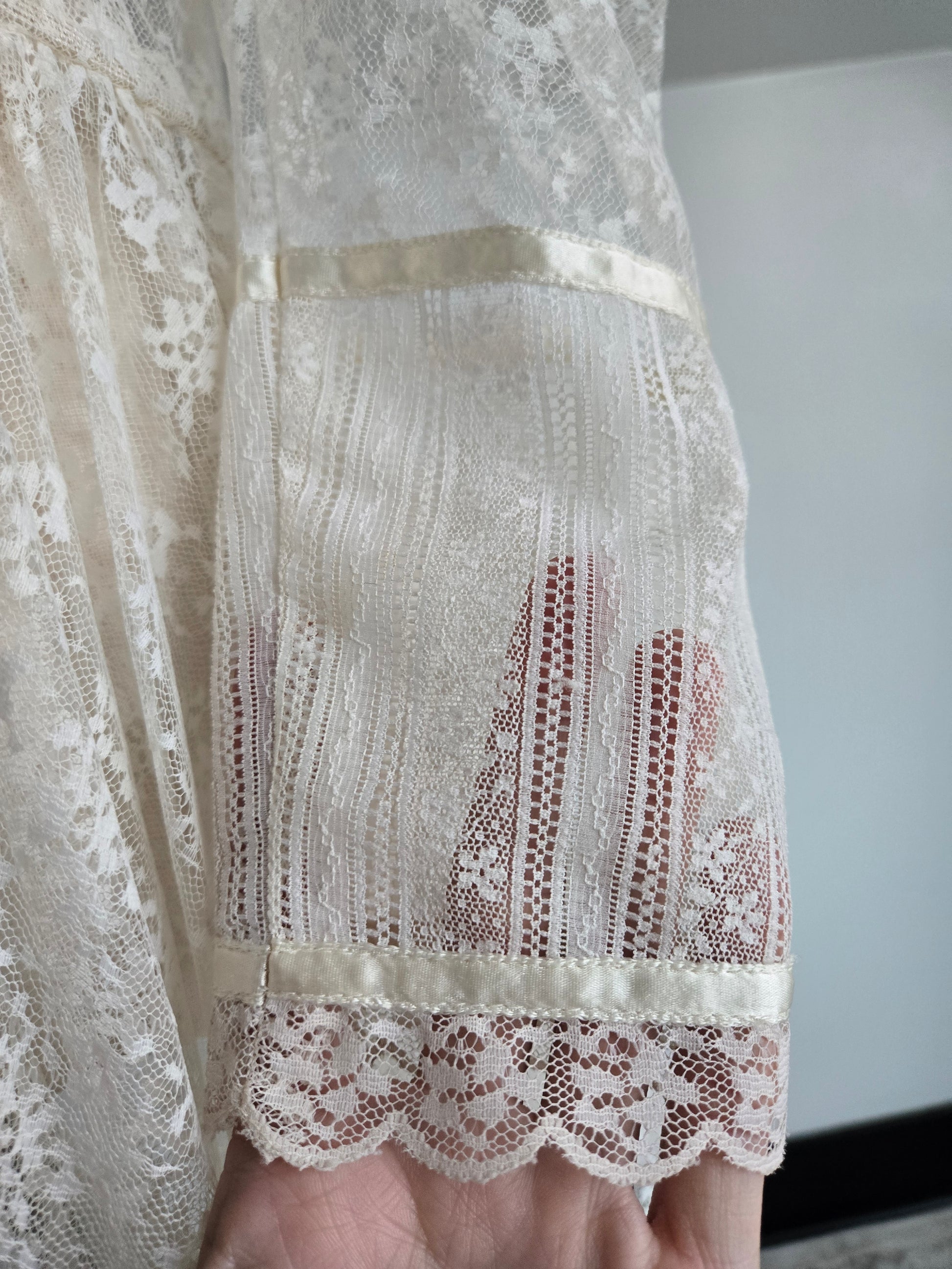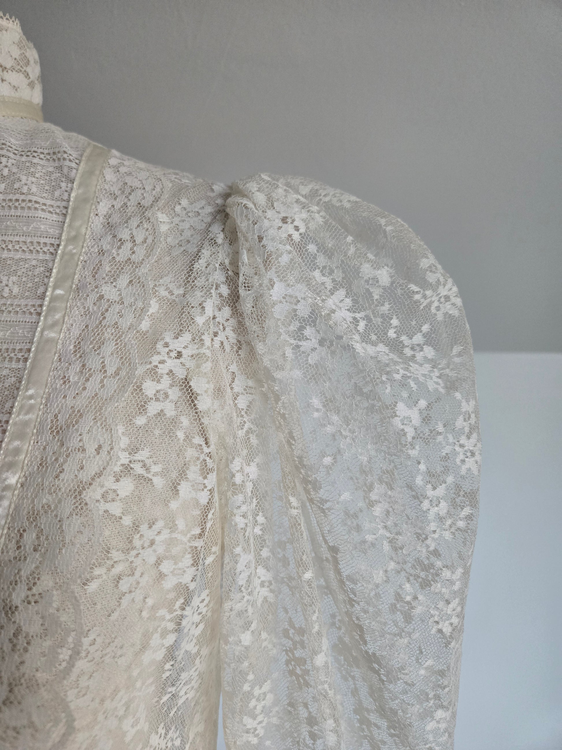 This dress does not have an internal label, but based off my knowledge, where I got the dress, constructions, fabrics, trims, size of cute tag, etc, I do believe this is an authentic Gunne Sax dress. It is amazing either way, but will be priced appropriately since it does not have it's tag. I have to imagine the tag was cut because it is a fully shear lace dress, but I understand it is not ideal. This lace is absolutely gorgeous and in great condition. It has a puff shoulder and tapered sleeve, with the classic Gunne Sax pearl buttons down the front. The waistband is stationary (so no stretch) and it has a fully skirt for some volume after the waistline. I have never seen such beautiful quality lace. It is truly mesmerizing and in perfect condition. This dress has been dry cleaned by me and is ready to wear.
