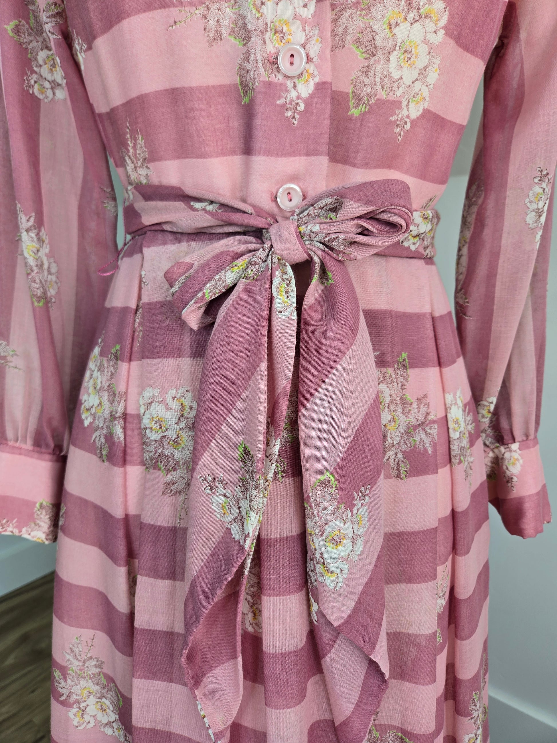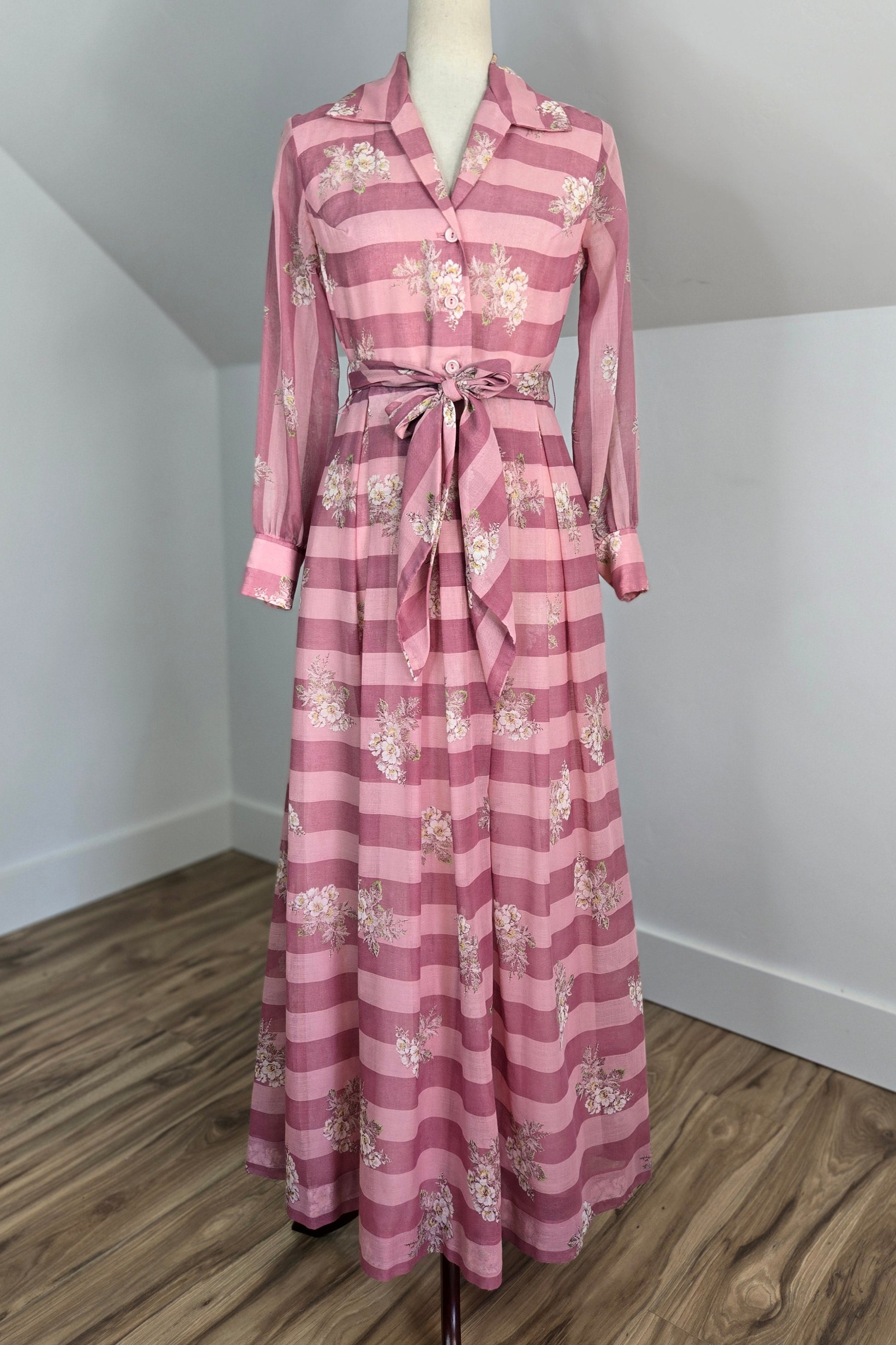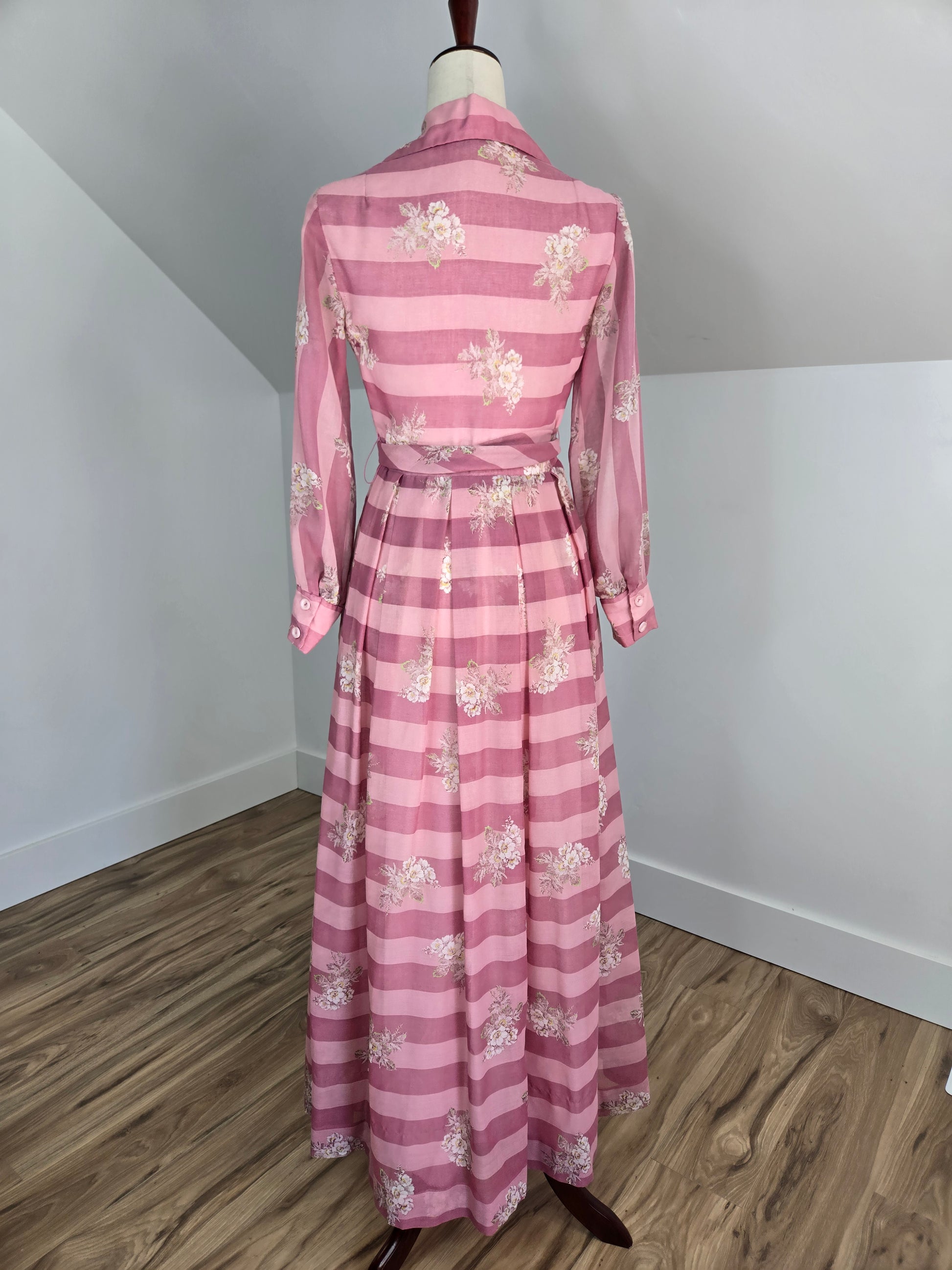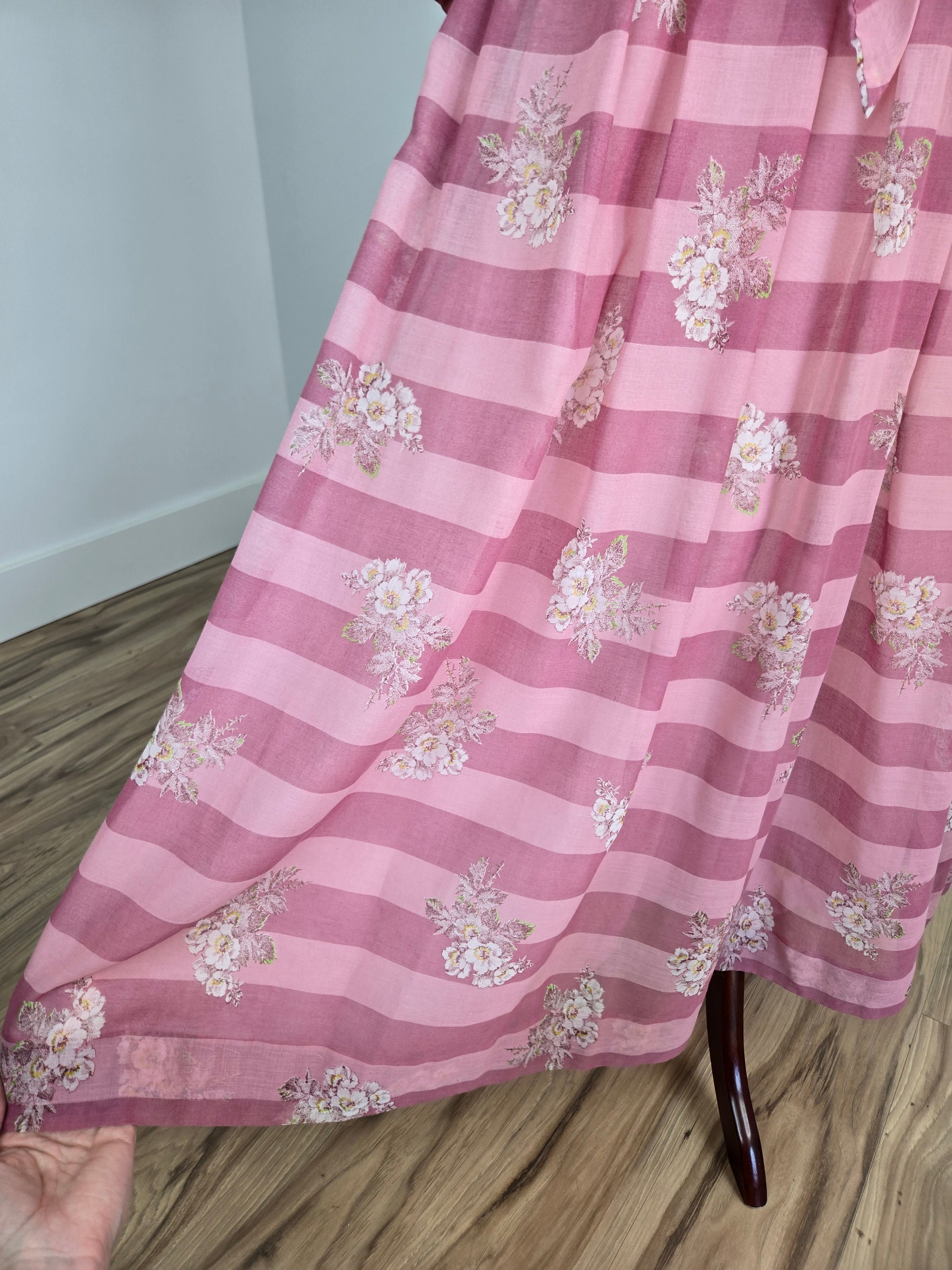 Solo San Francisco vintage 1970s maxi dress in a mauve pink with florals and stripes in the print. It has a button down front and then small hook closure at the waist. The sleeves are a shear material, while the body and skirt are fully lined. Fabric waist belt is removable. She is in great condition and is washed and ready to wear! What a beauty!