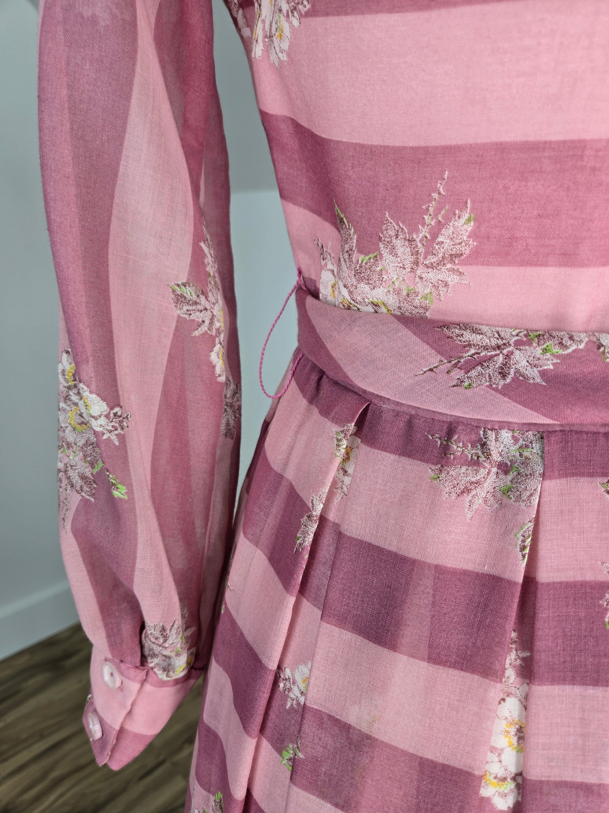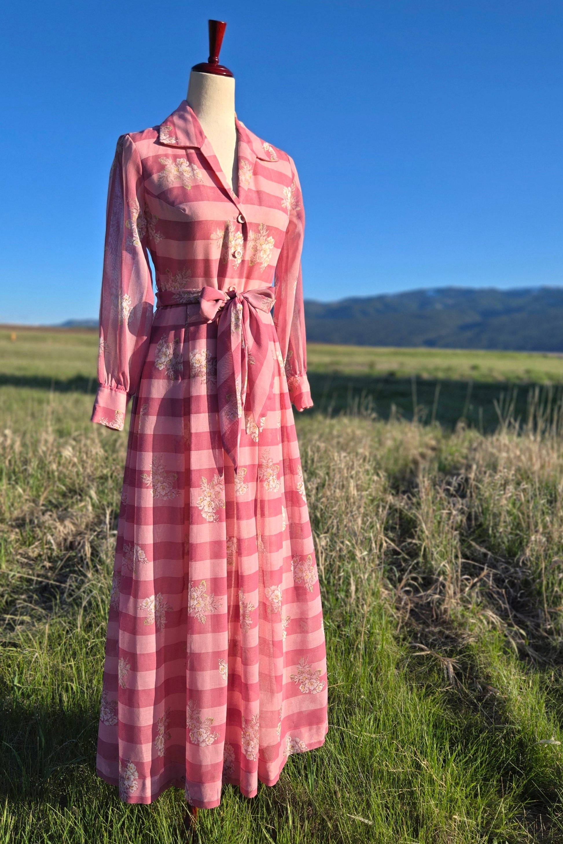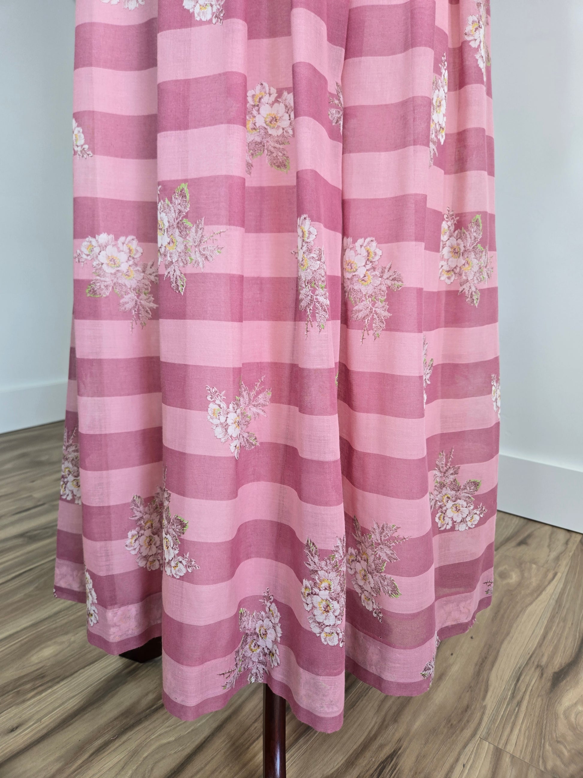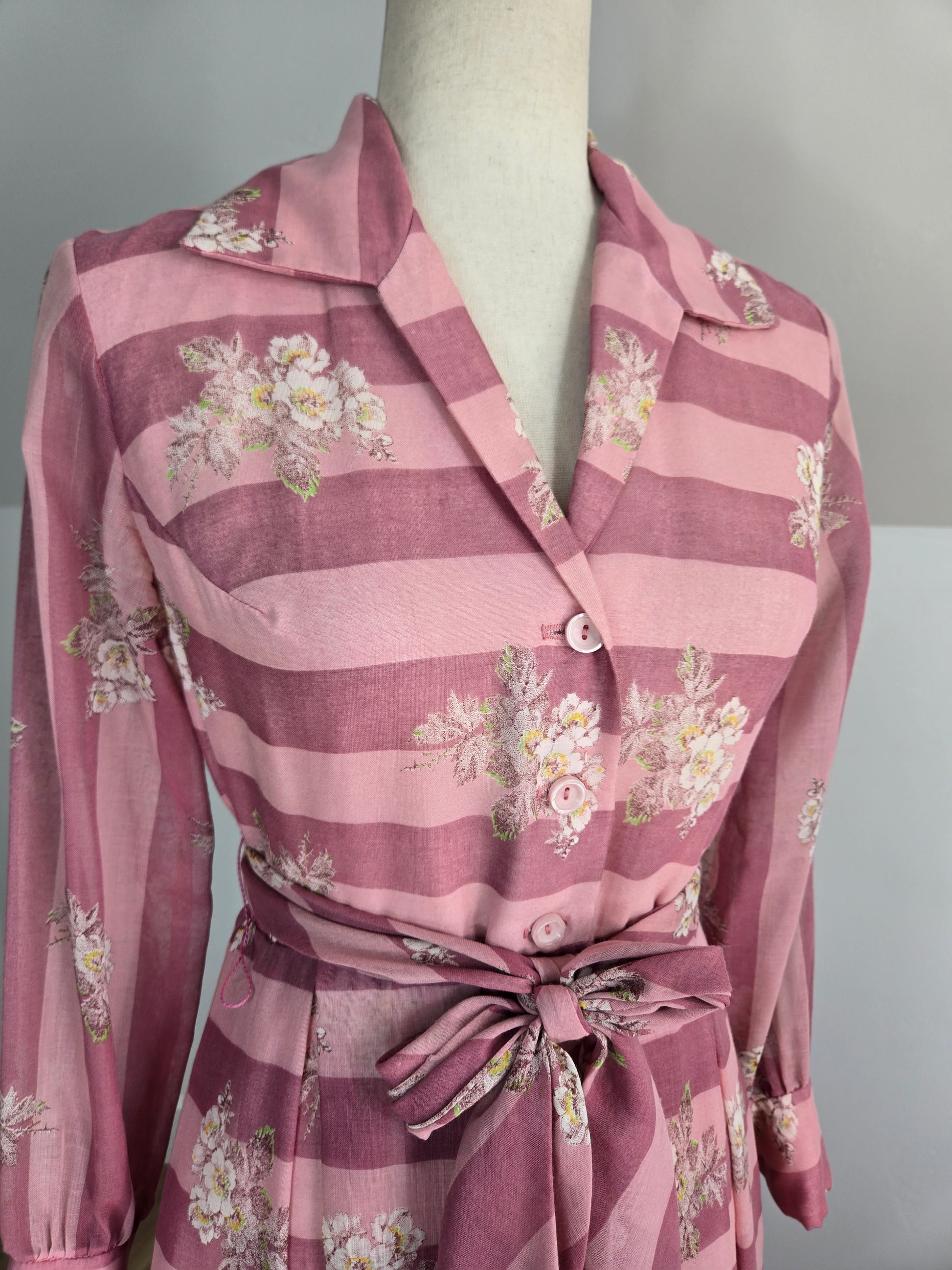 Solo San Francisco vintage 1970s maxi dress in a mauve pink with florals and stripes in the print. It has a button down front and then small hook closure at the waist. The sleeves are a shear material, while the body and skirt are fully lined. Fabric waist belt is removable. She is in great condition and is washed and ready to wear! What a beauty!