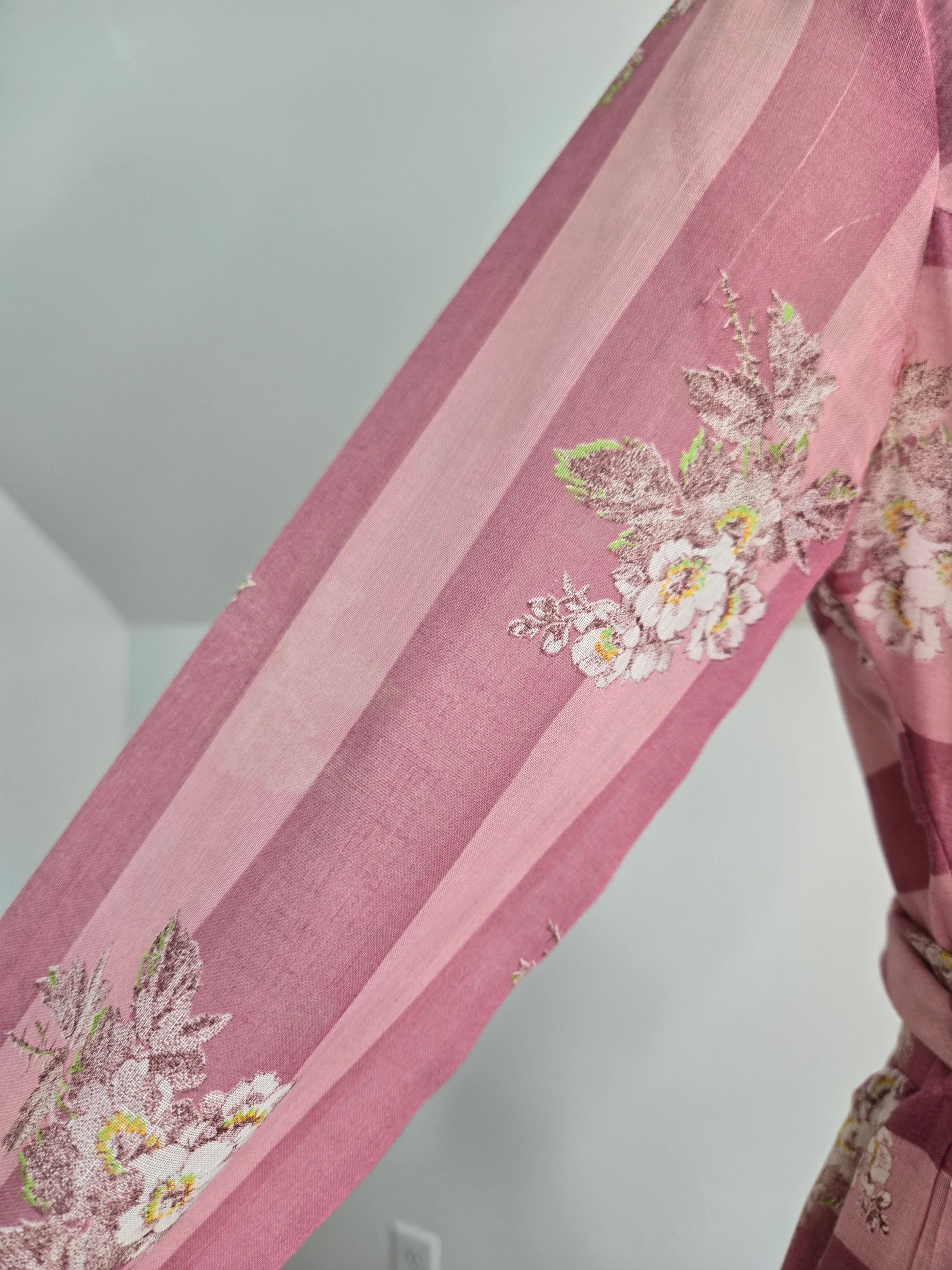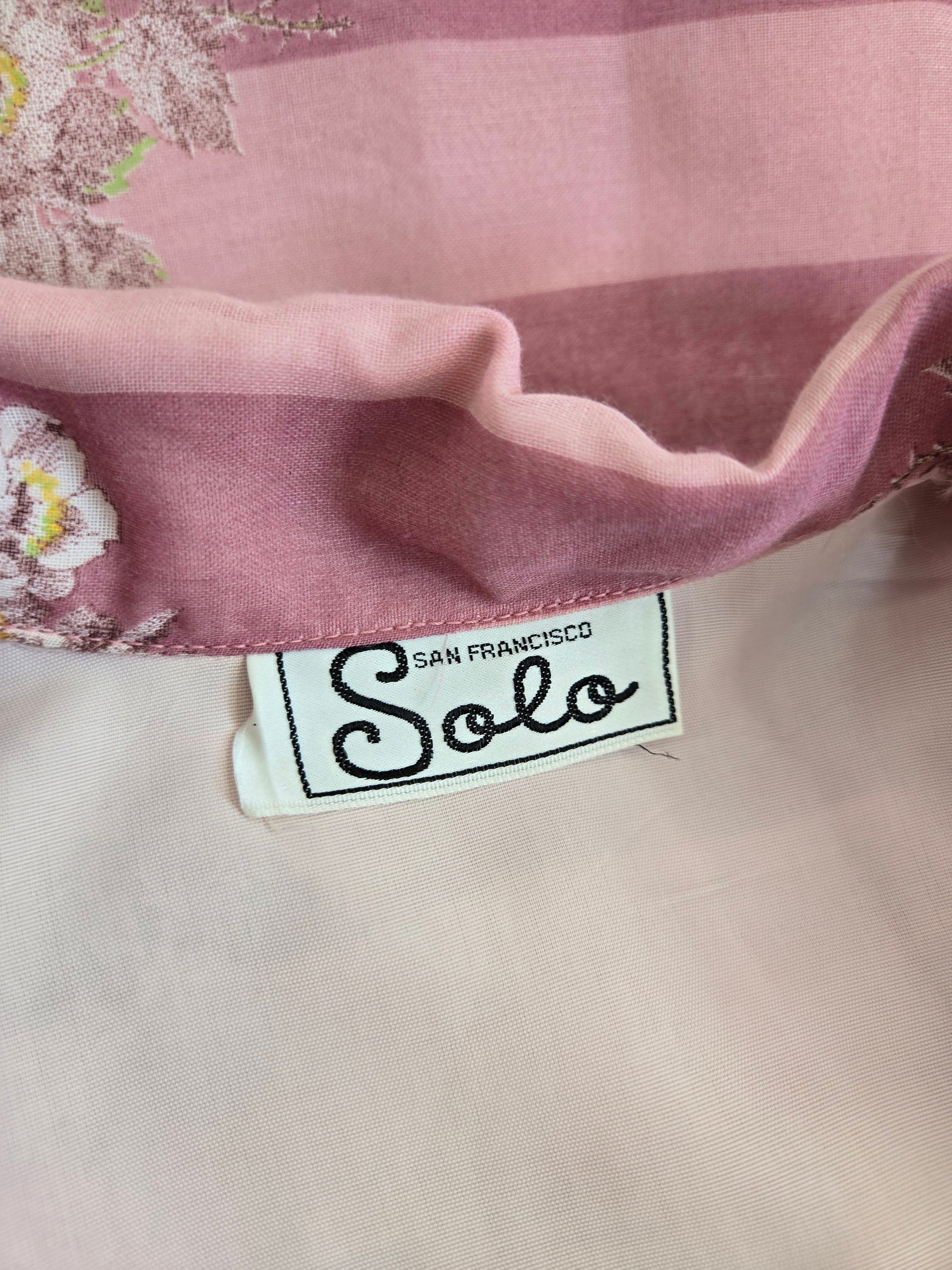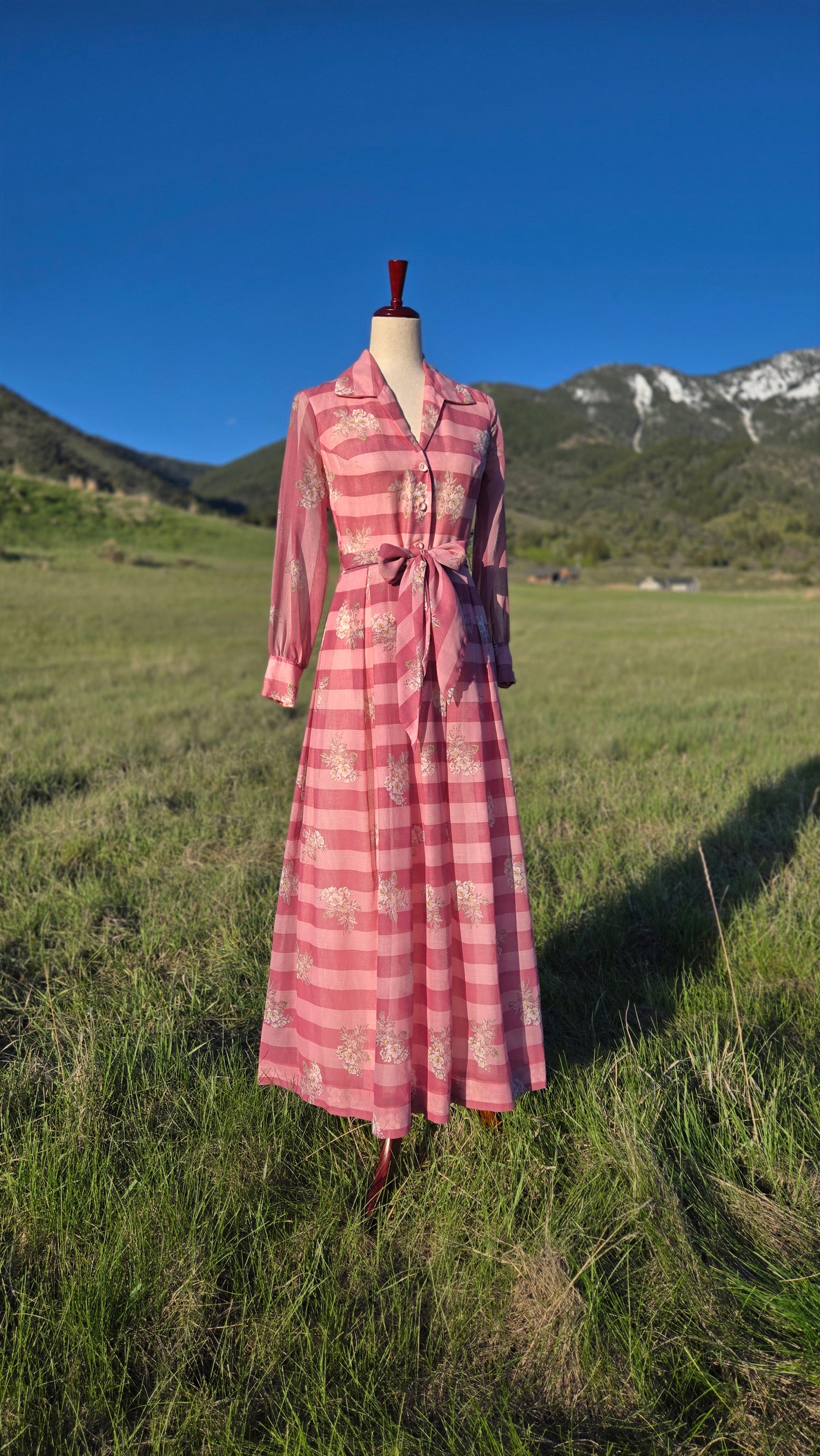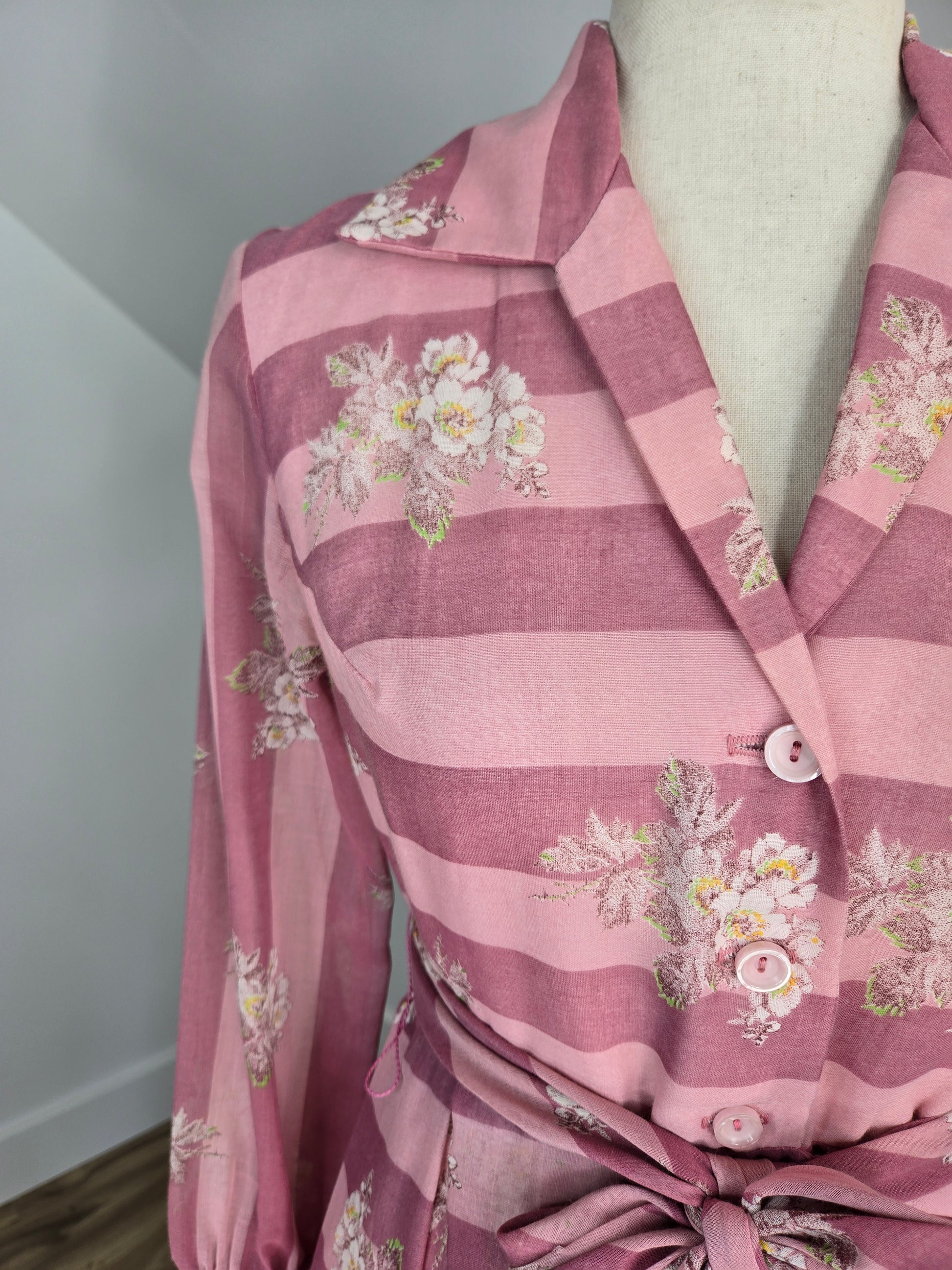 Solo San Francisco vintage 1970s maxi dress in a mauve pink with florals and stripes in the print. It has a button down front and then small hook closure at the waist. The sleeves are a shear material, while the body and skirt are fully lined. Fabric waist belt is removable. She is in great condition and is washed and ready to wear! What a beauty!