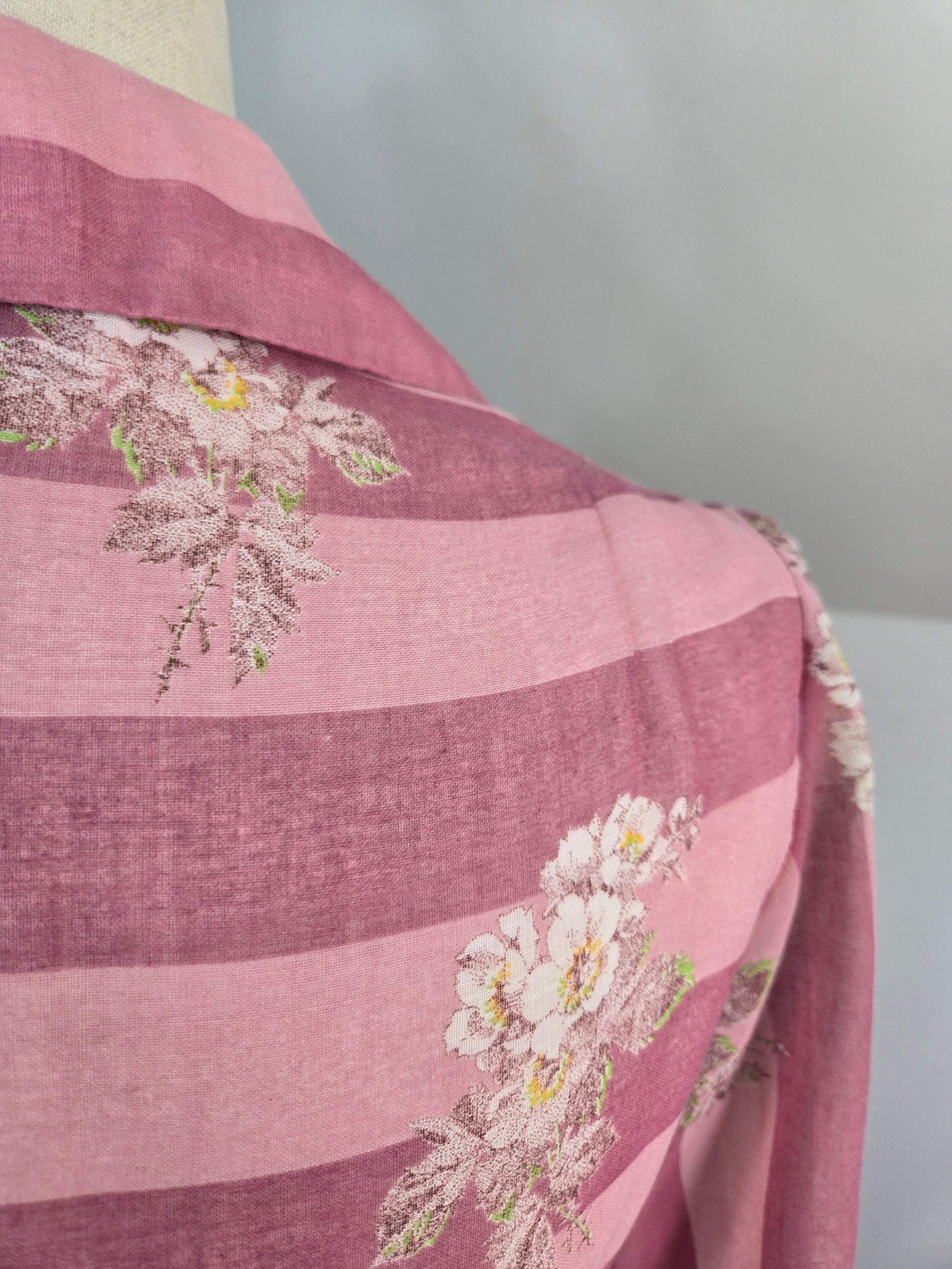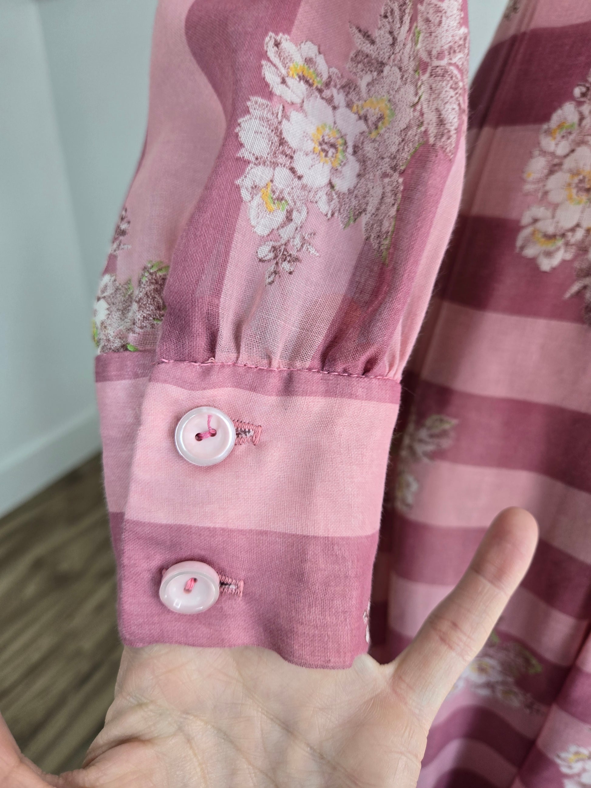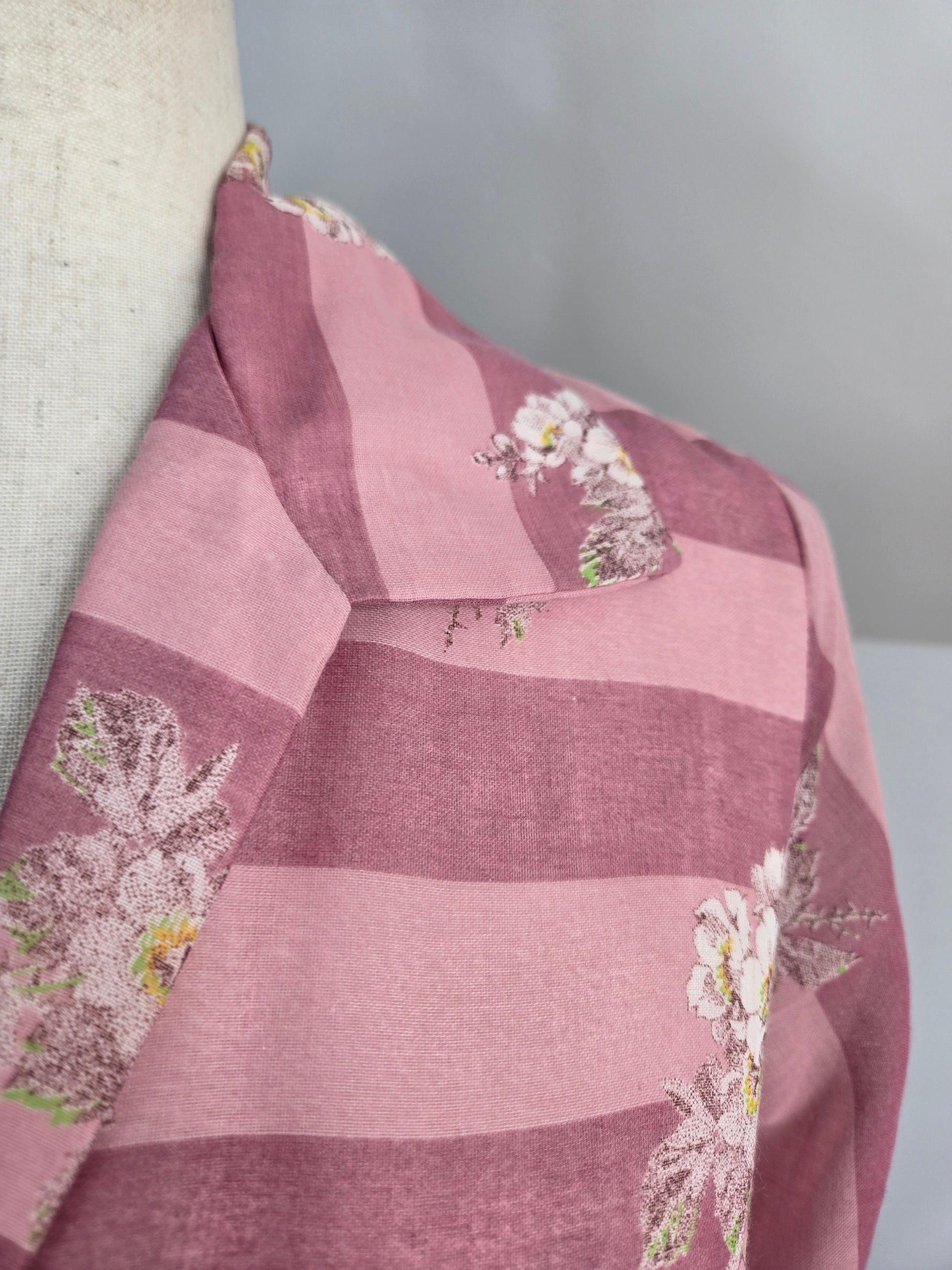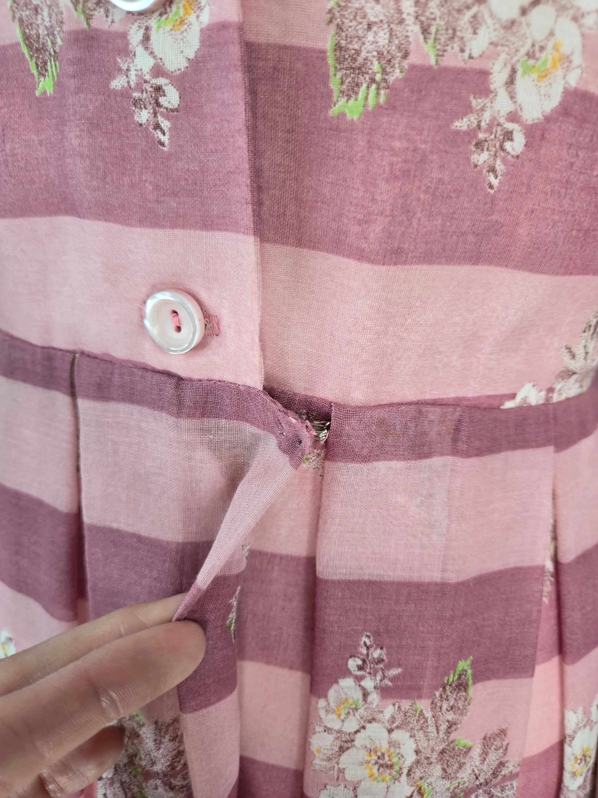 Solo San Francisco vintage 1970s maxi dress in a mauve pink with florals and stripes in the print. It has a button down front and then small hook closure at the waist. The sleeves are a shear material, while the body and skirt are fully lined. Fabric waist belt is removable. She is in great condition and is washed and ready to wear! What a beauty!