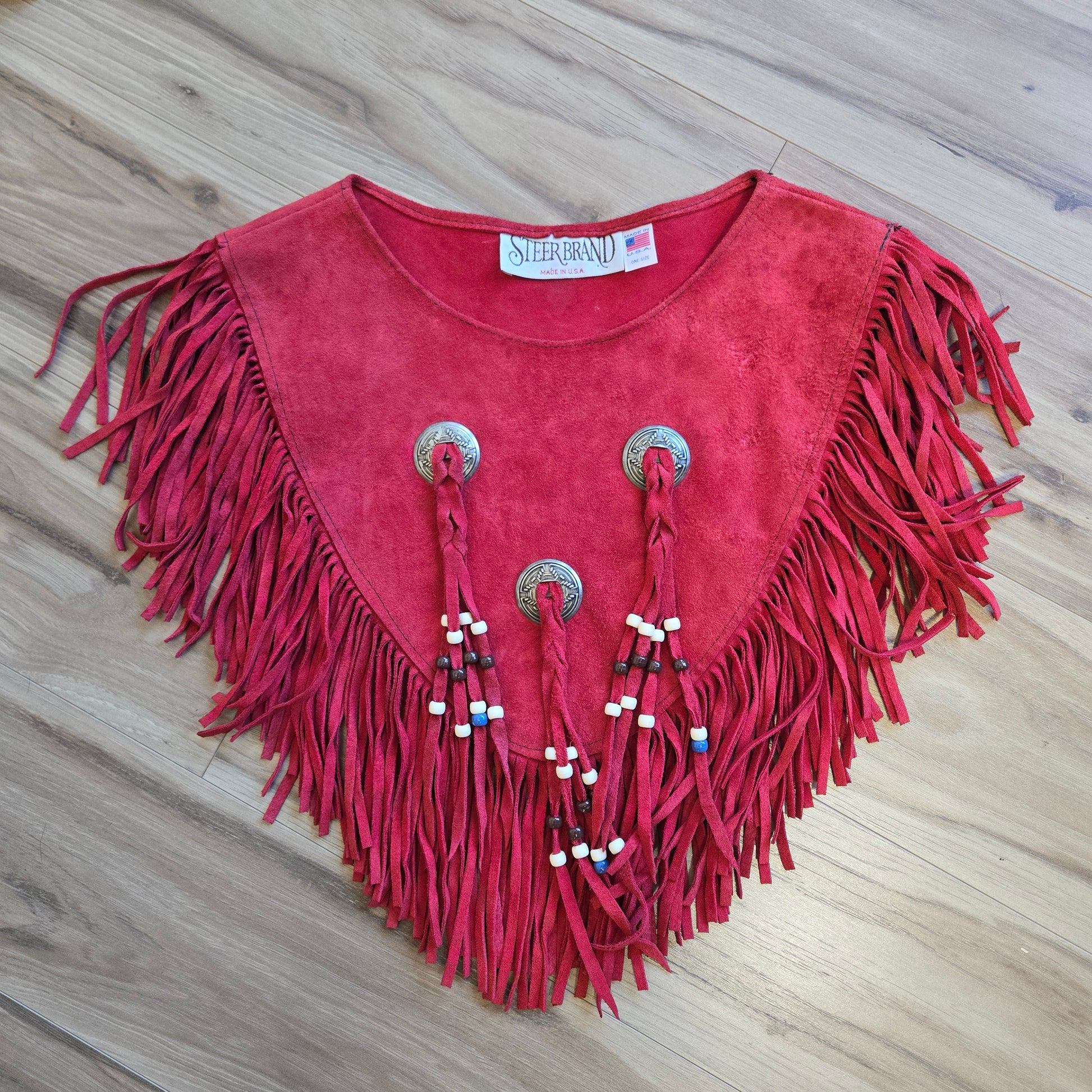 Vintage Steer Brand genuine suede leather fringe cape with silver concho style decoration buttons and fringe with beading at the end. This one is in near perfect condition with no signs of wear. Made in the USA.