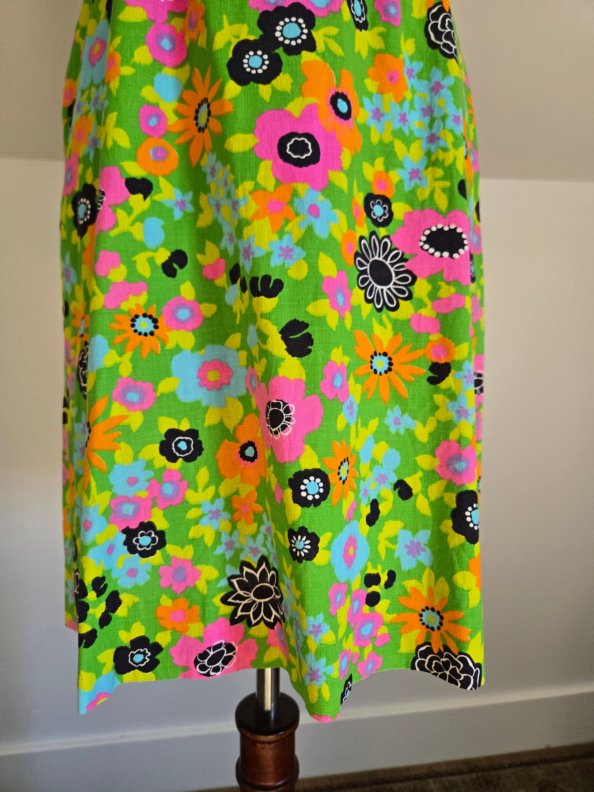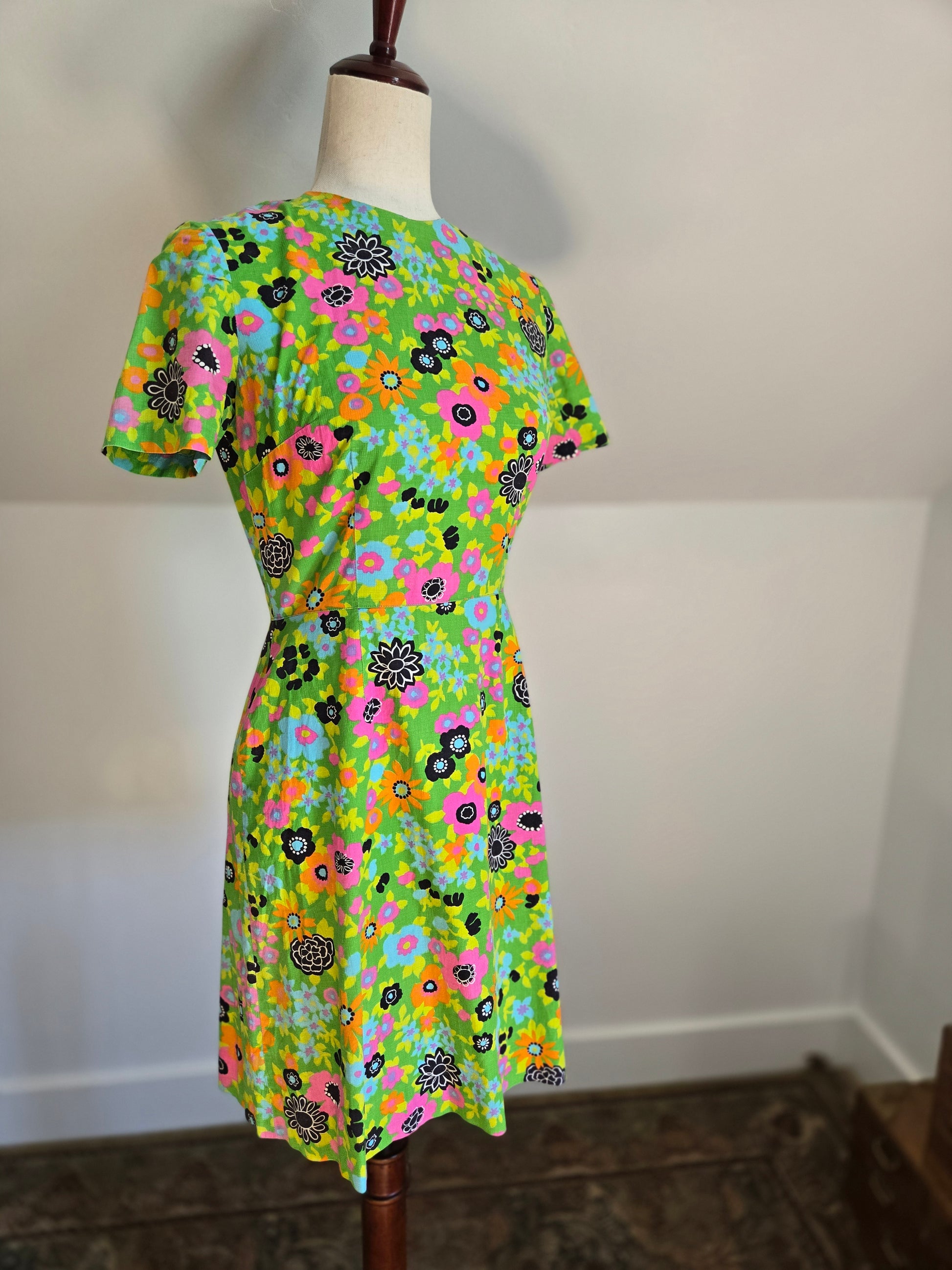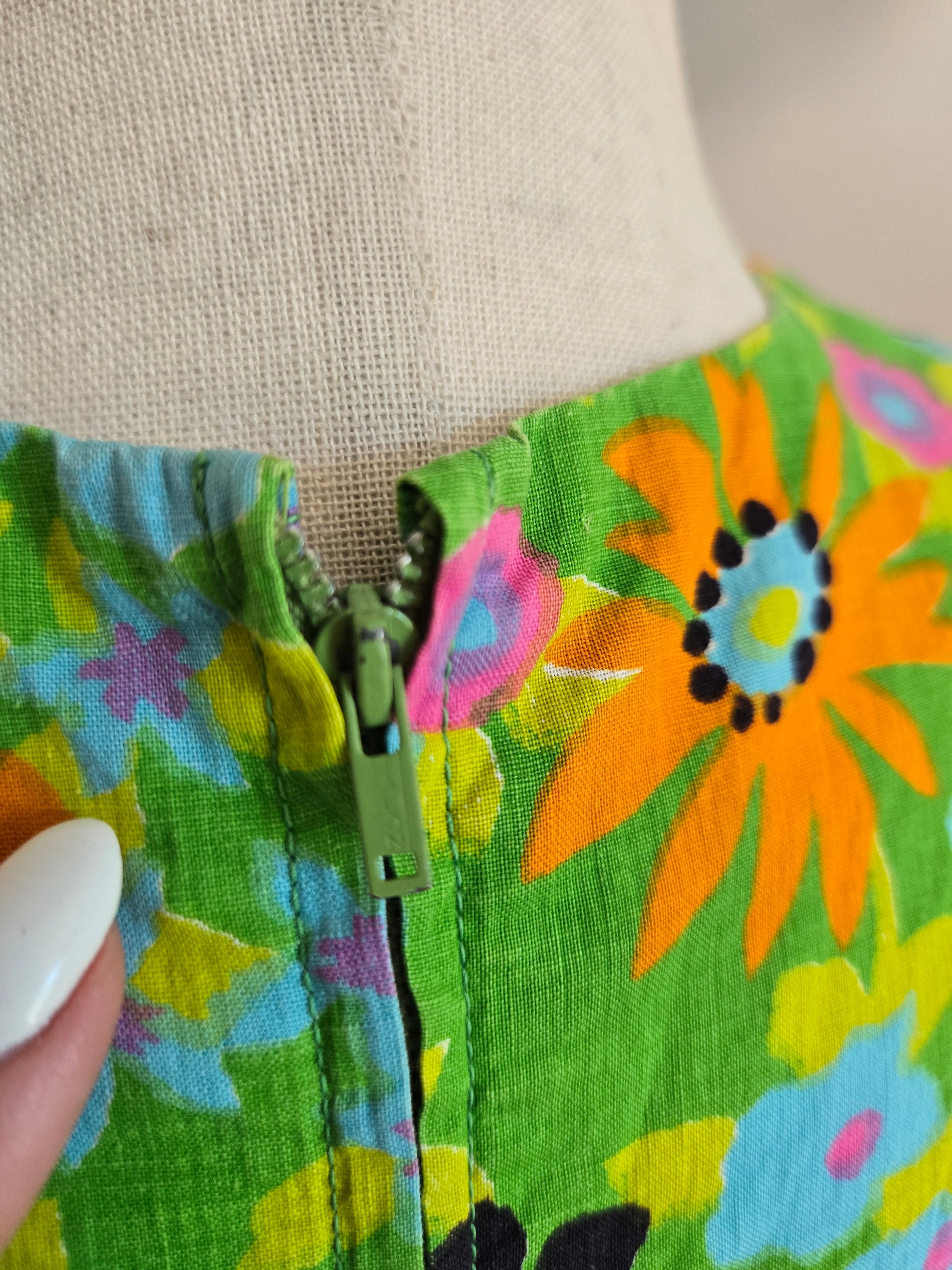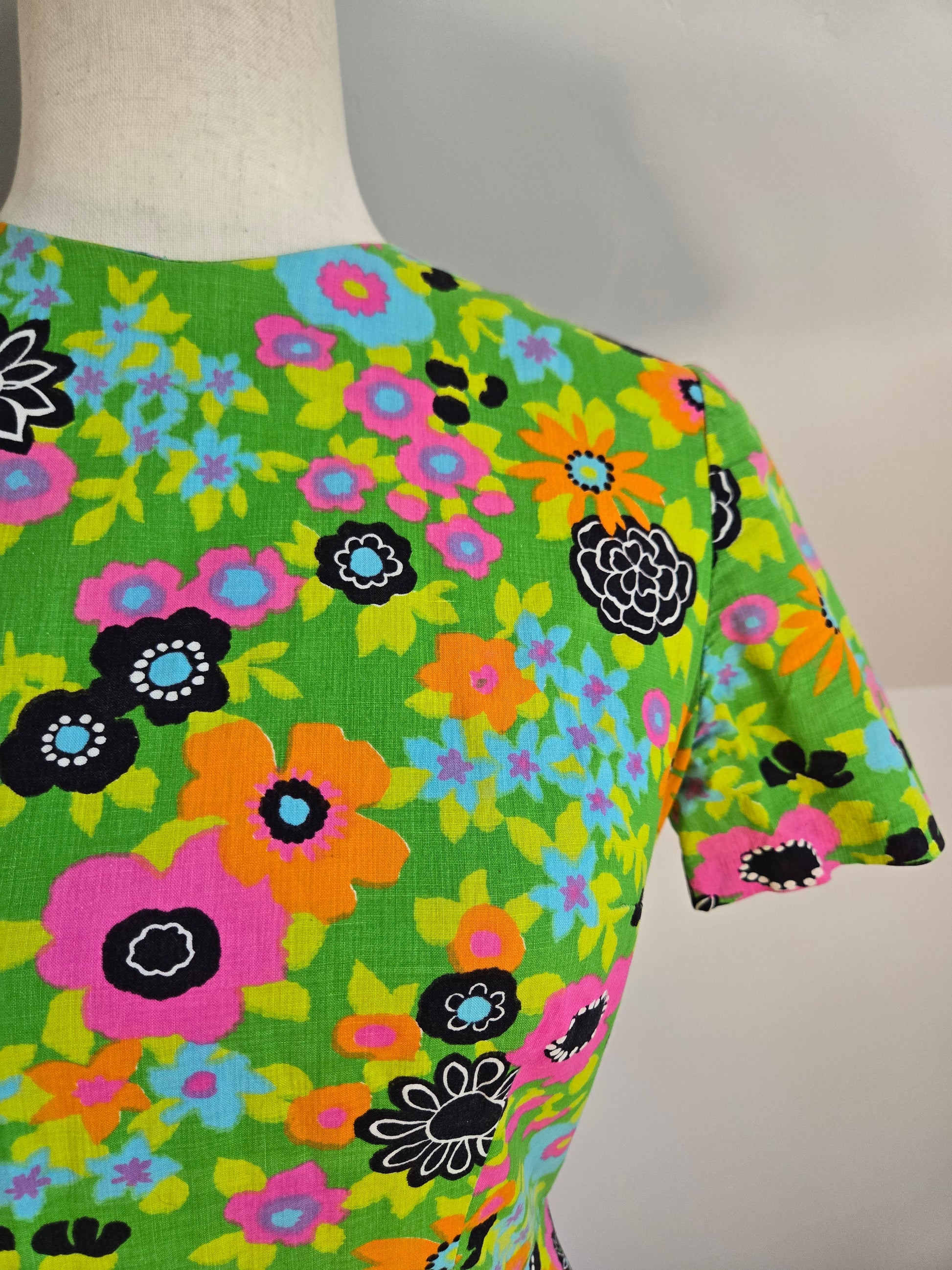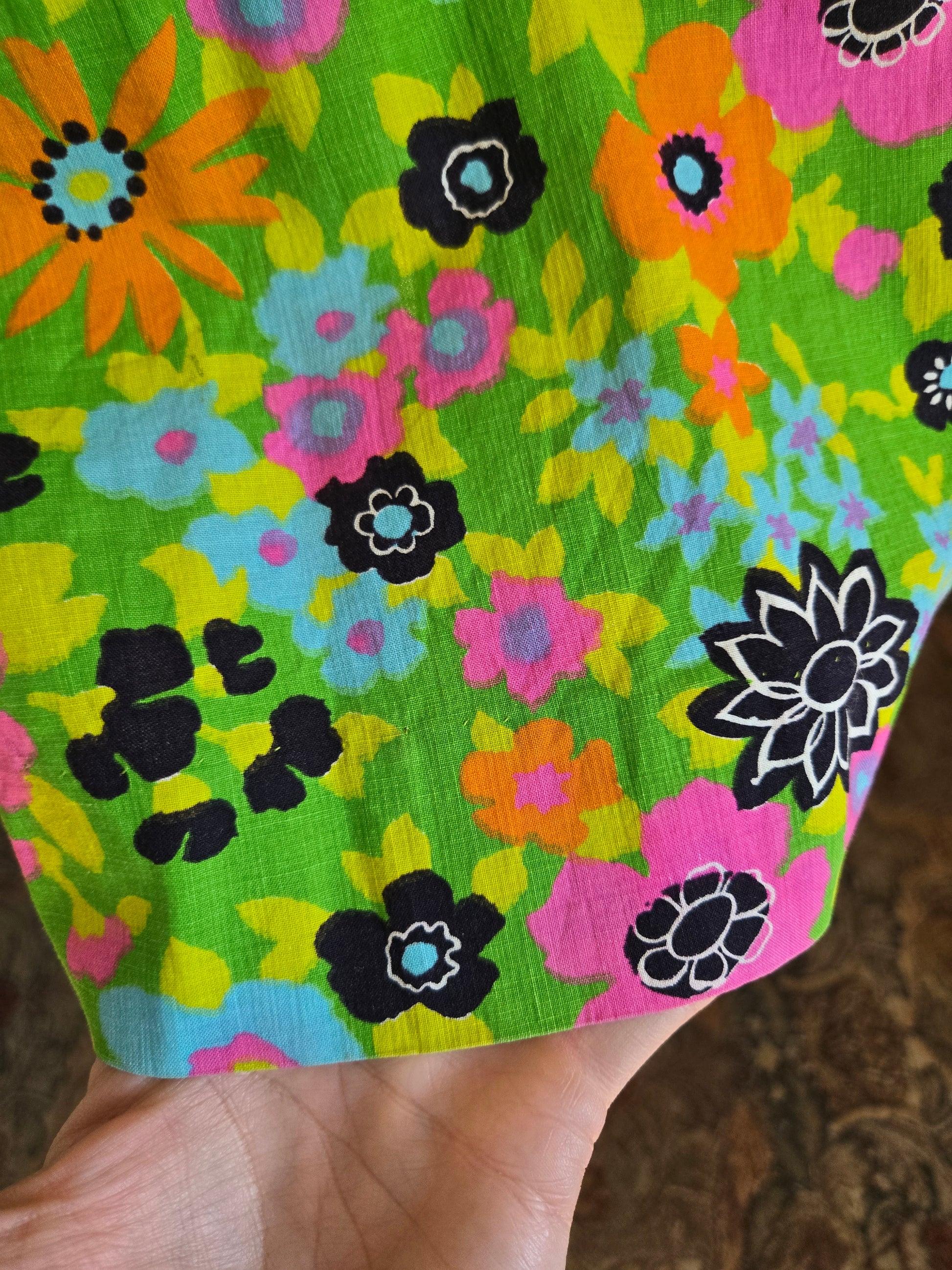 Vintage hand made dayglo cotton flower power print mini dress. It has a metal Talon zipper in the back with a structured waistline (no stretch) and a little fit and flare silhouette. It is in perfect condition.