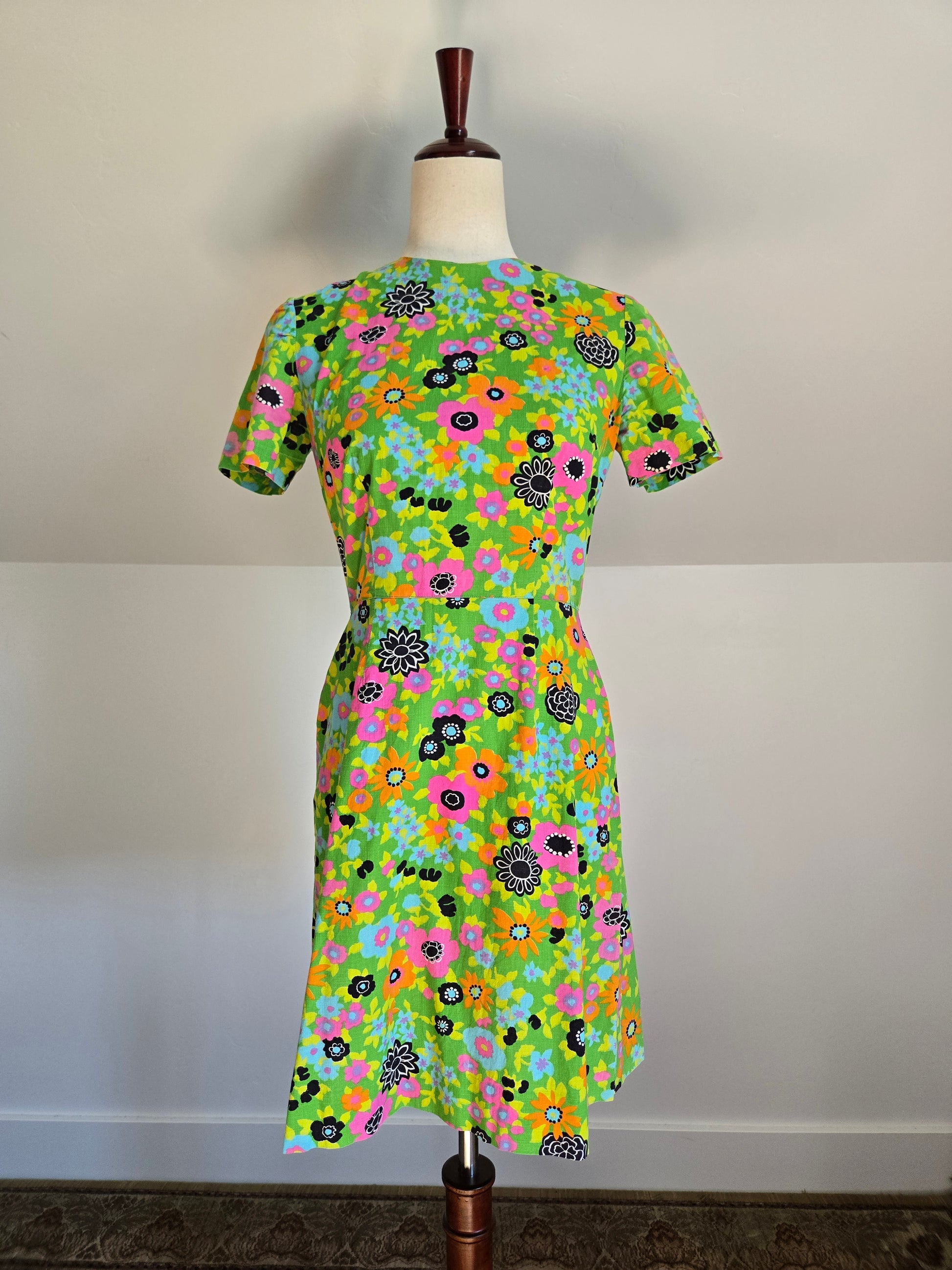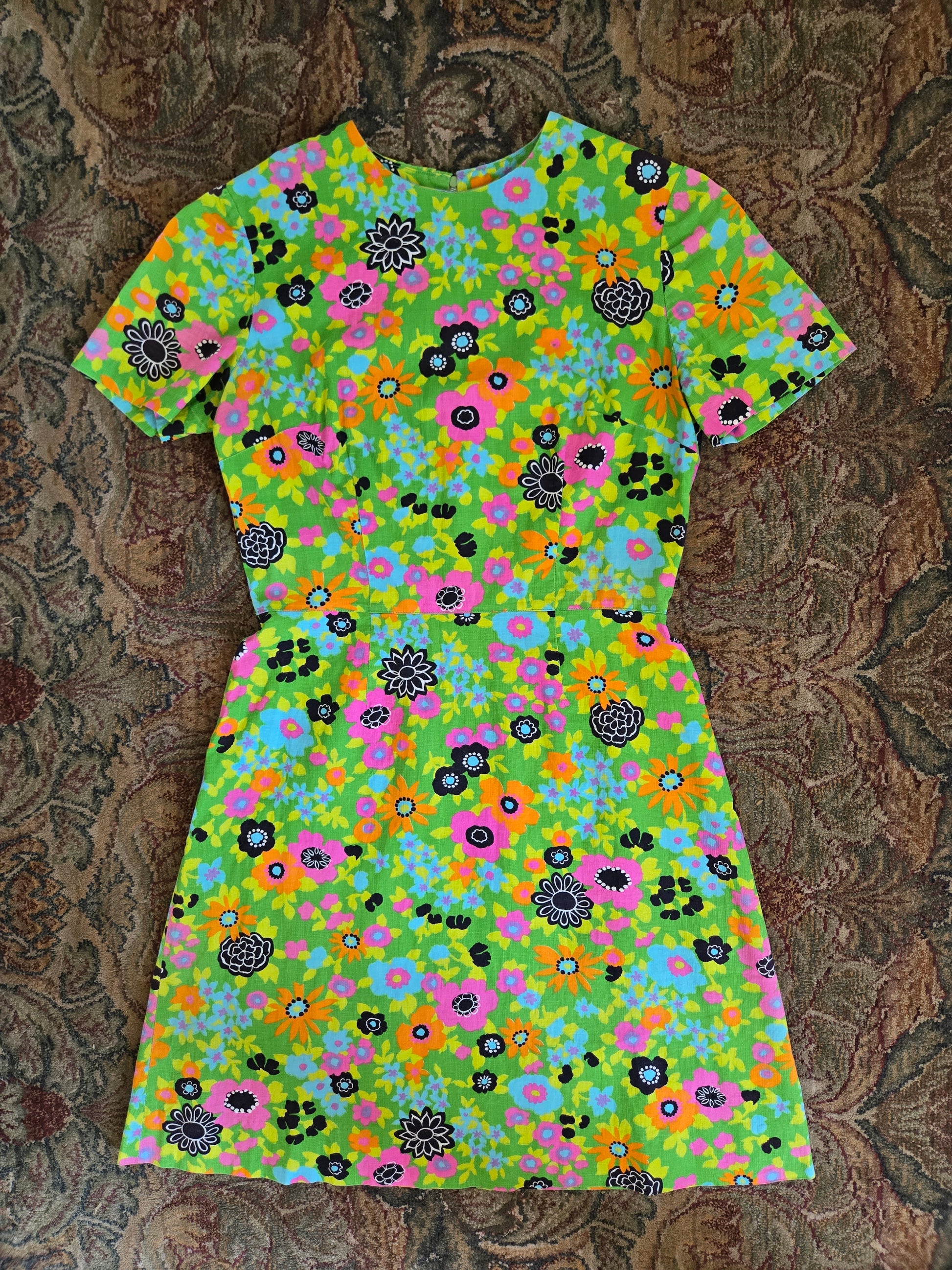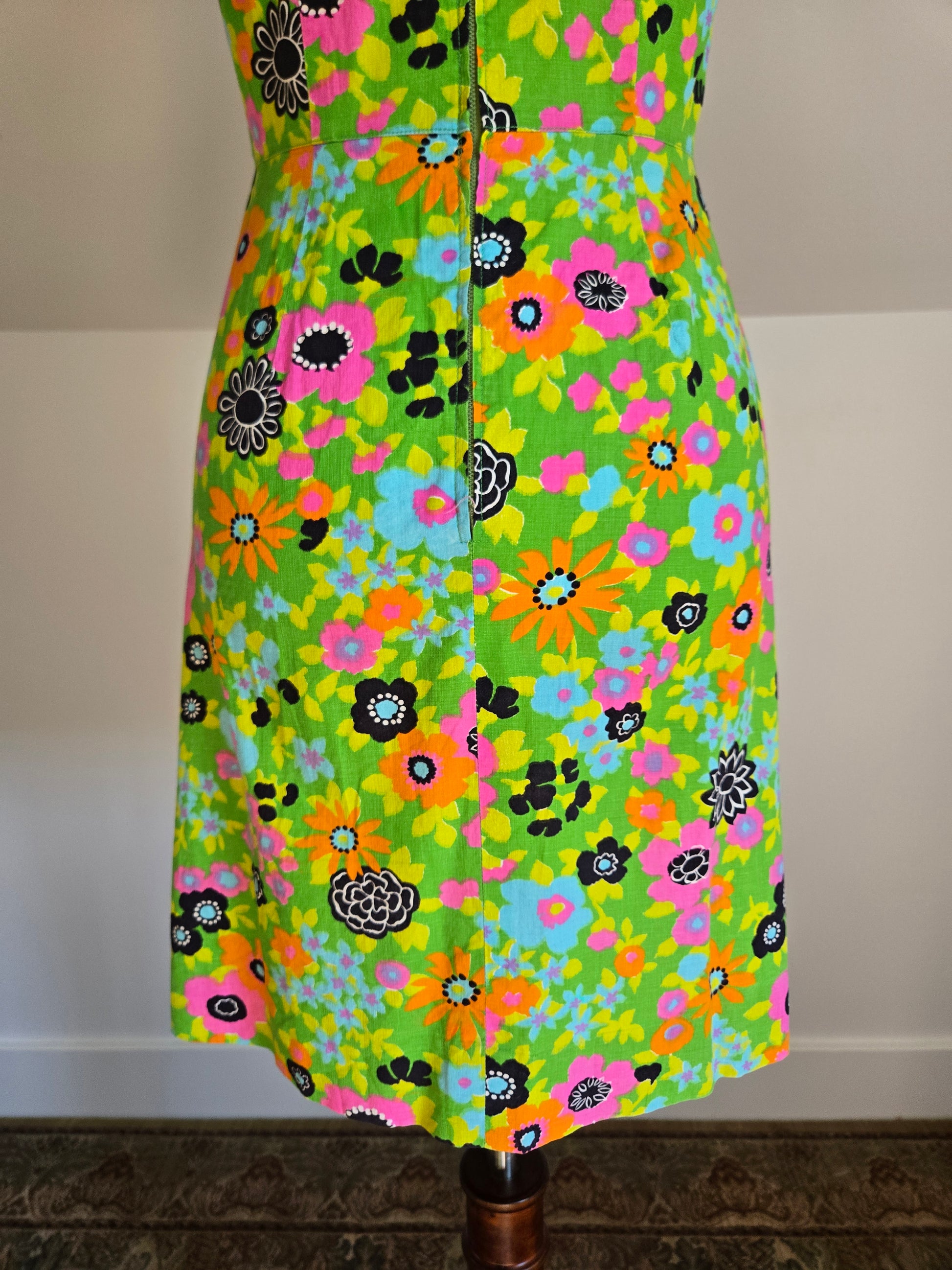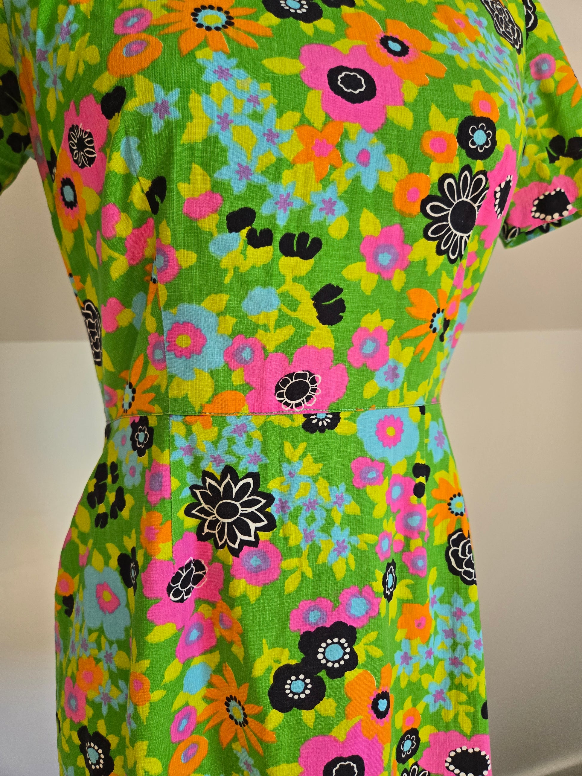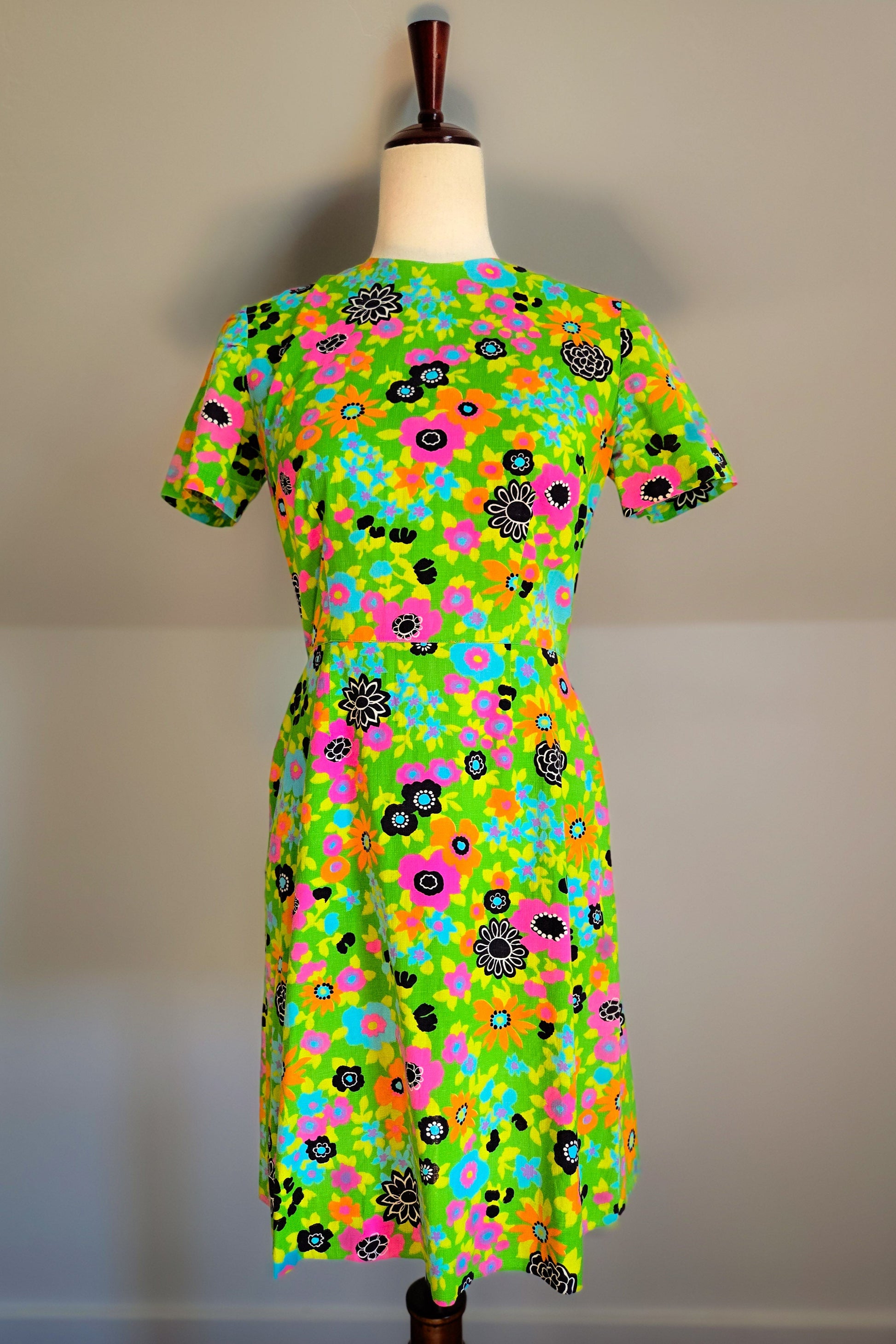 Vintage hand made dayglo cotton flower power print mini dress. It has a metal Talon zipper in the back with a structured waistline (no stretch) and a little fit and flare silhouette. It is in perfect condition.