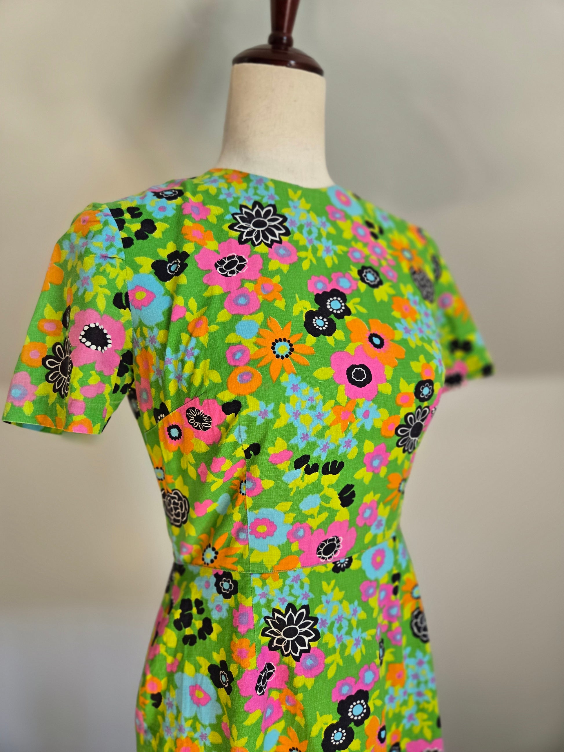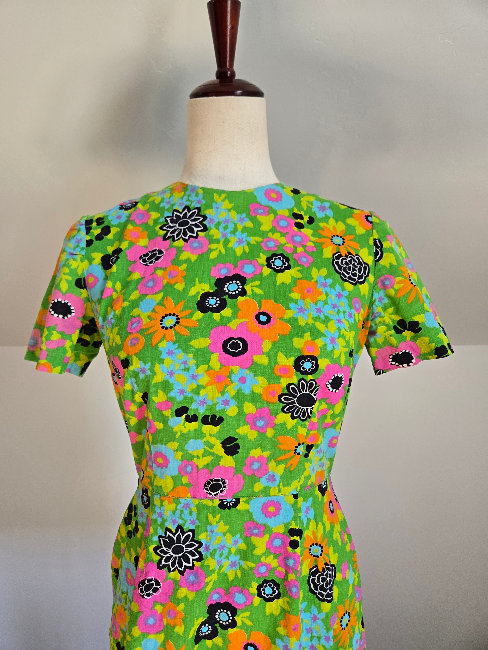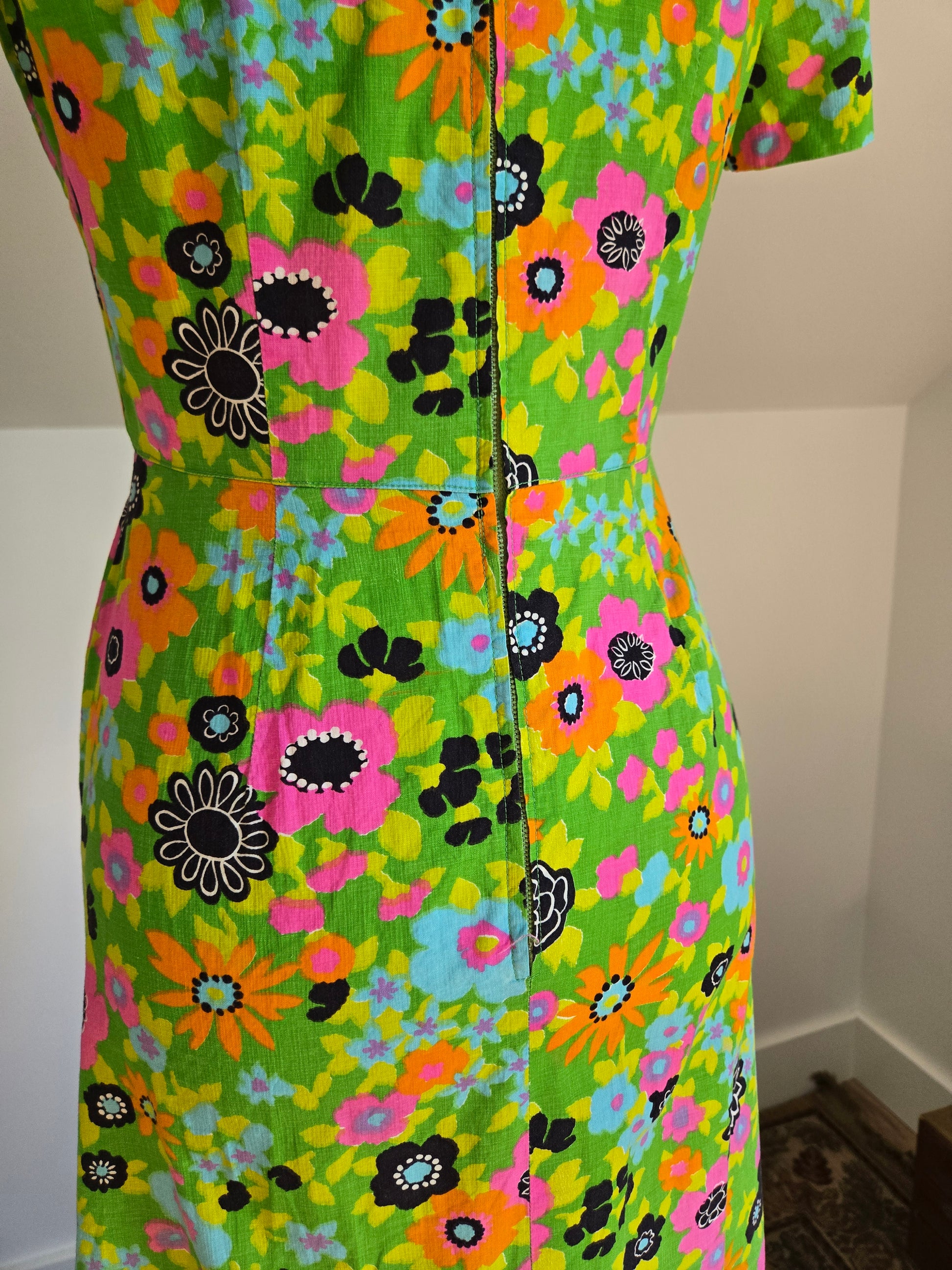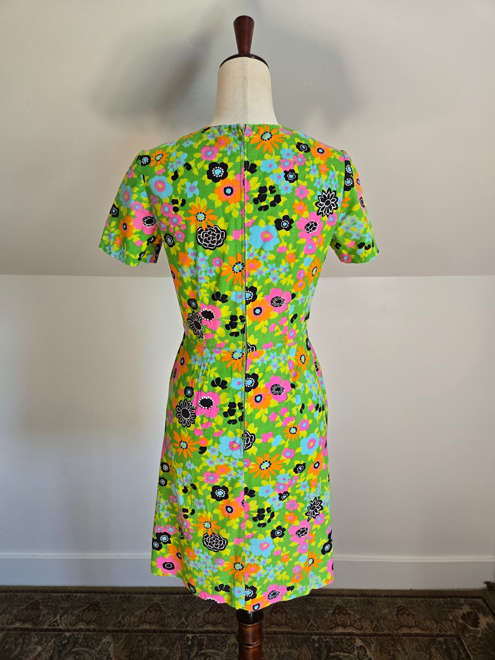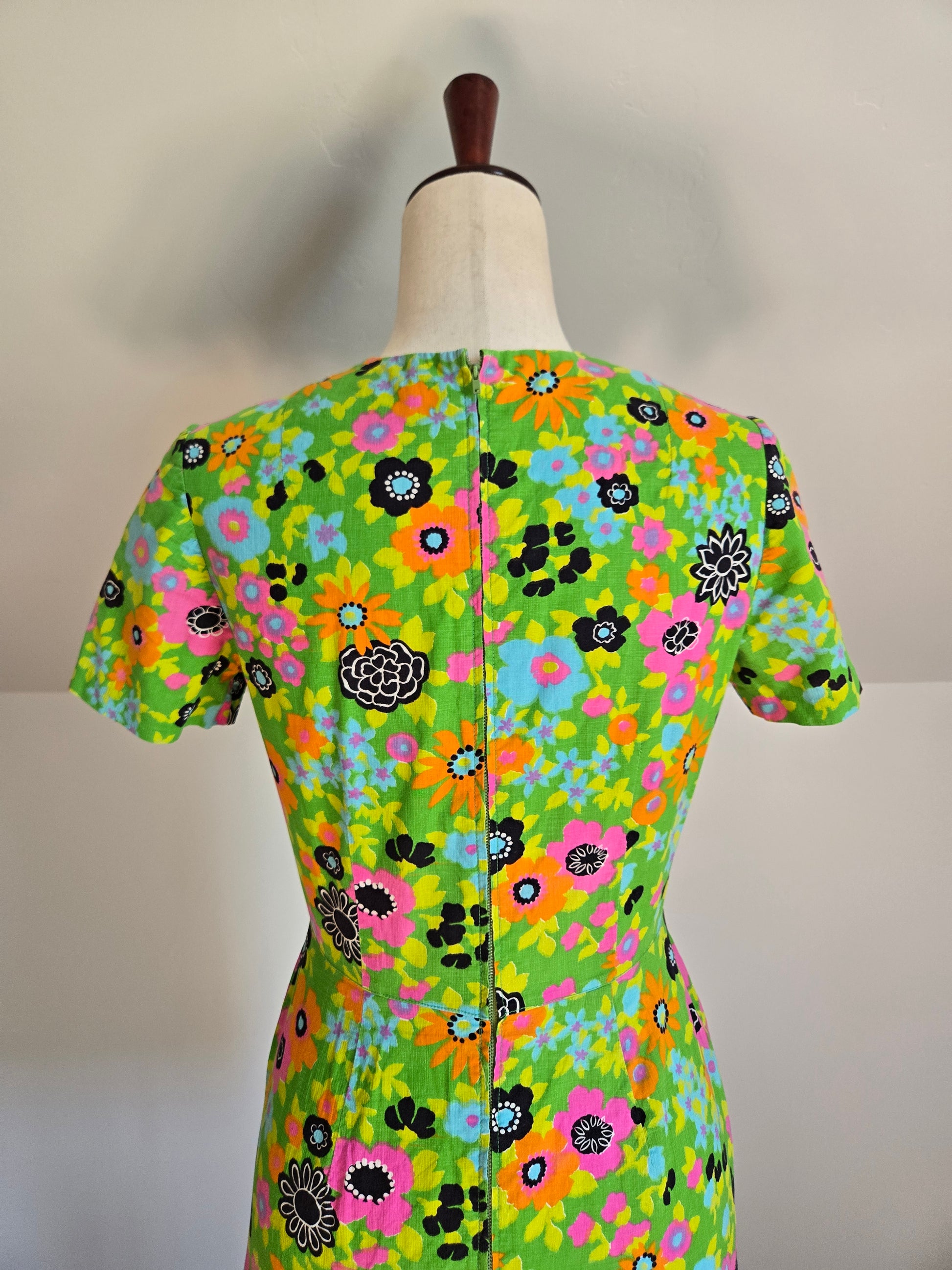 Vintage hand made dayglo cotton flower power print mini dress. It has a metal Talon zipper in the back with a structured waistline (no stretch) and a little fit and flare silhouette. It is in perfect condition.