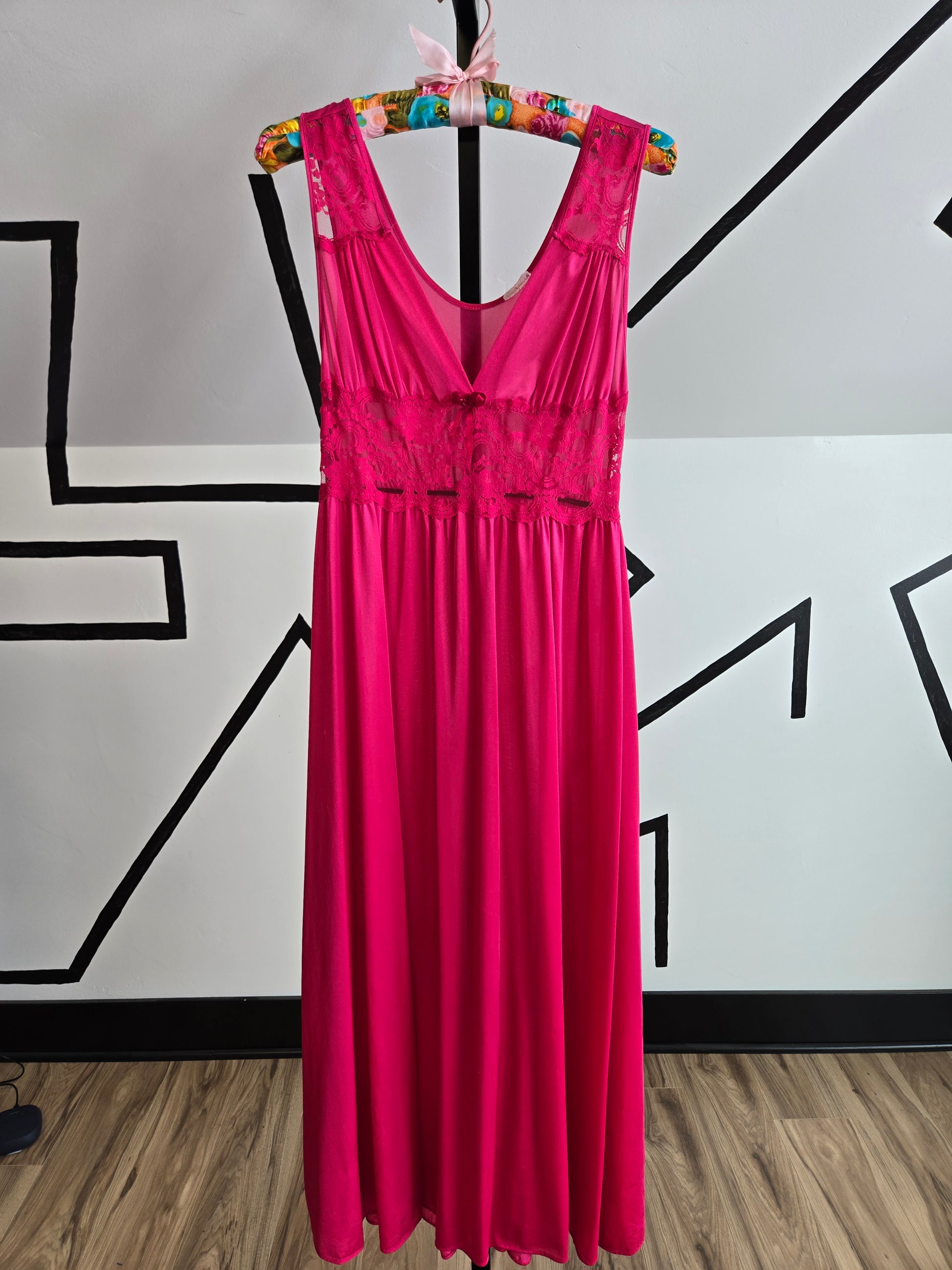 Vintage Fuchsia Pink Peignoir Maxi Dress with Lace Middle - small