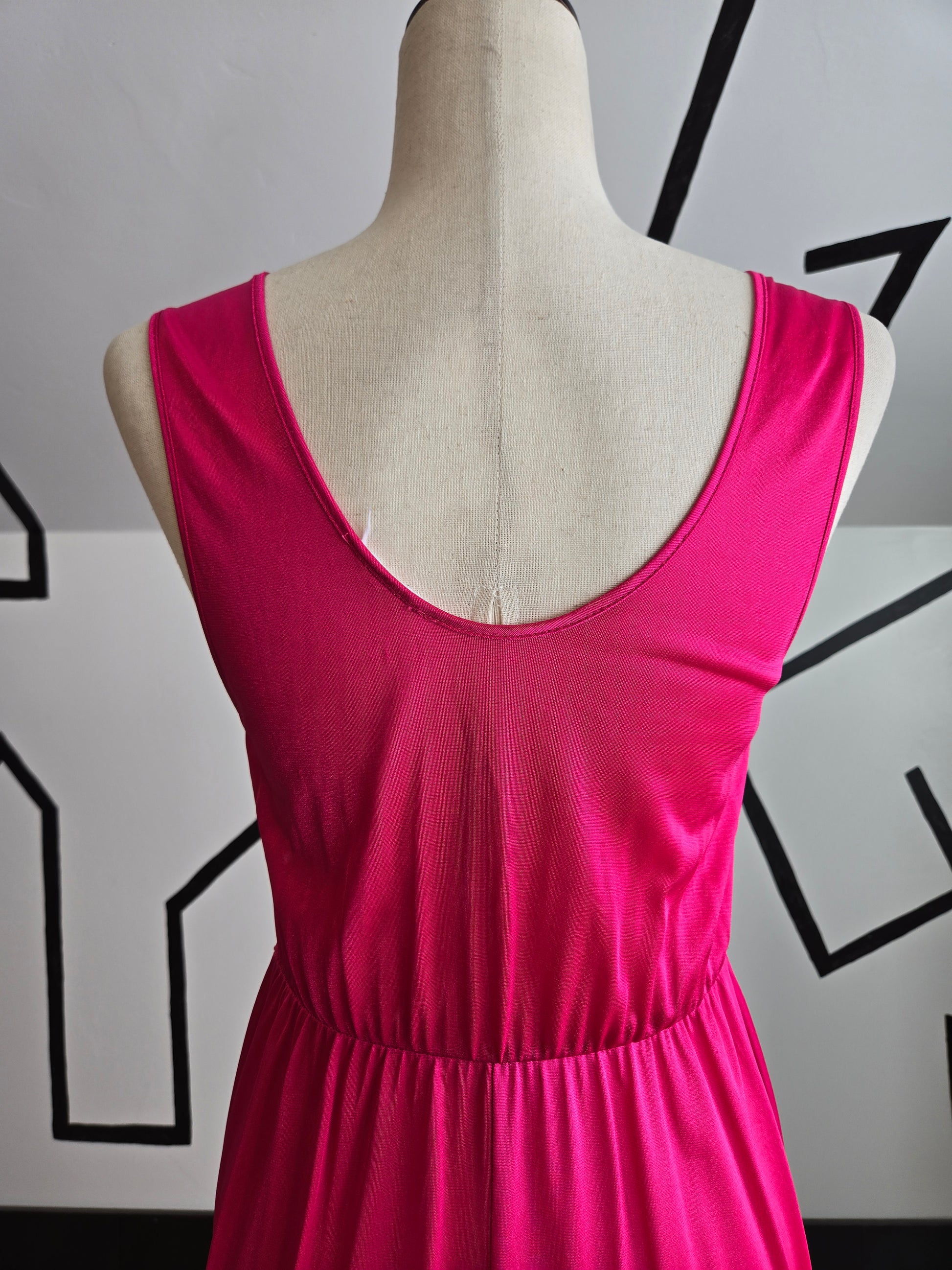 Vintage fuchsia pink maxi dress with beautiful shear lace at the straps and also at the mid section. It is stretchy and has a nice heavy drape with no imperfections to note, but it is missing its tags.