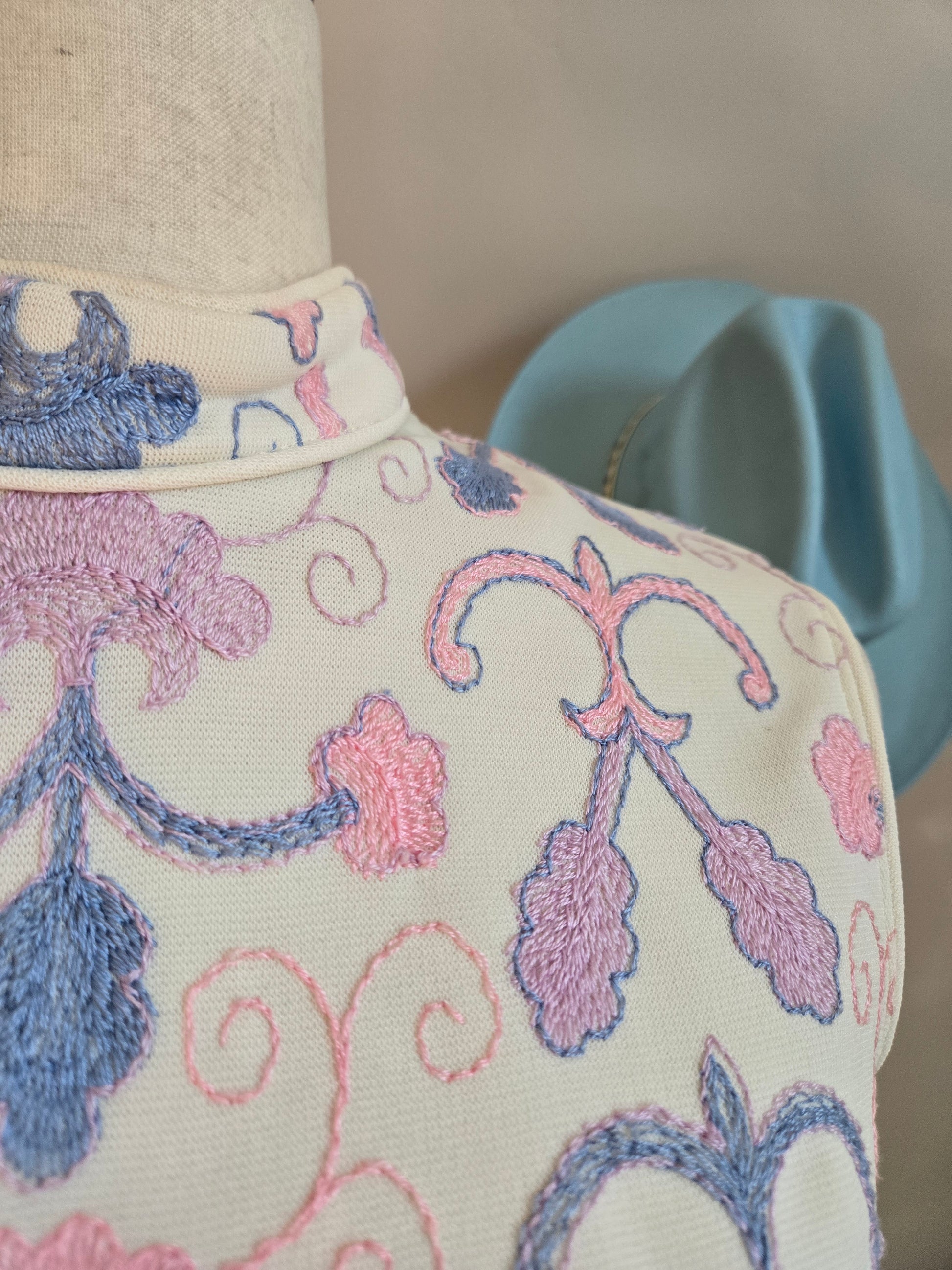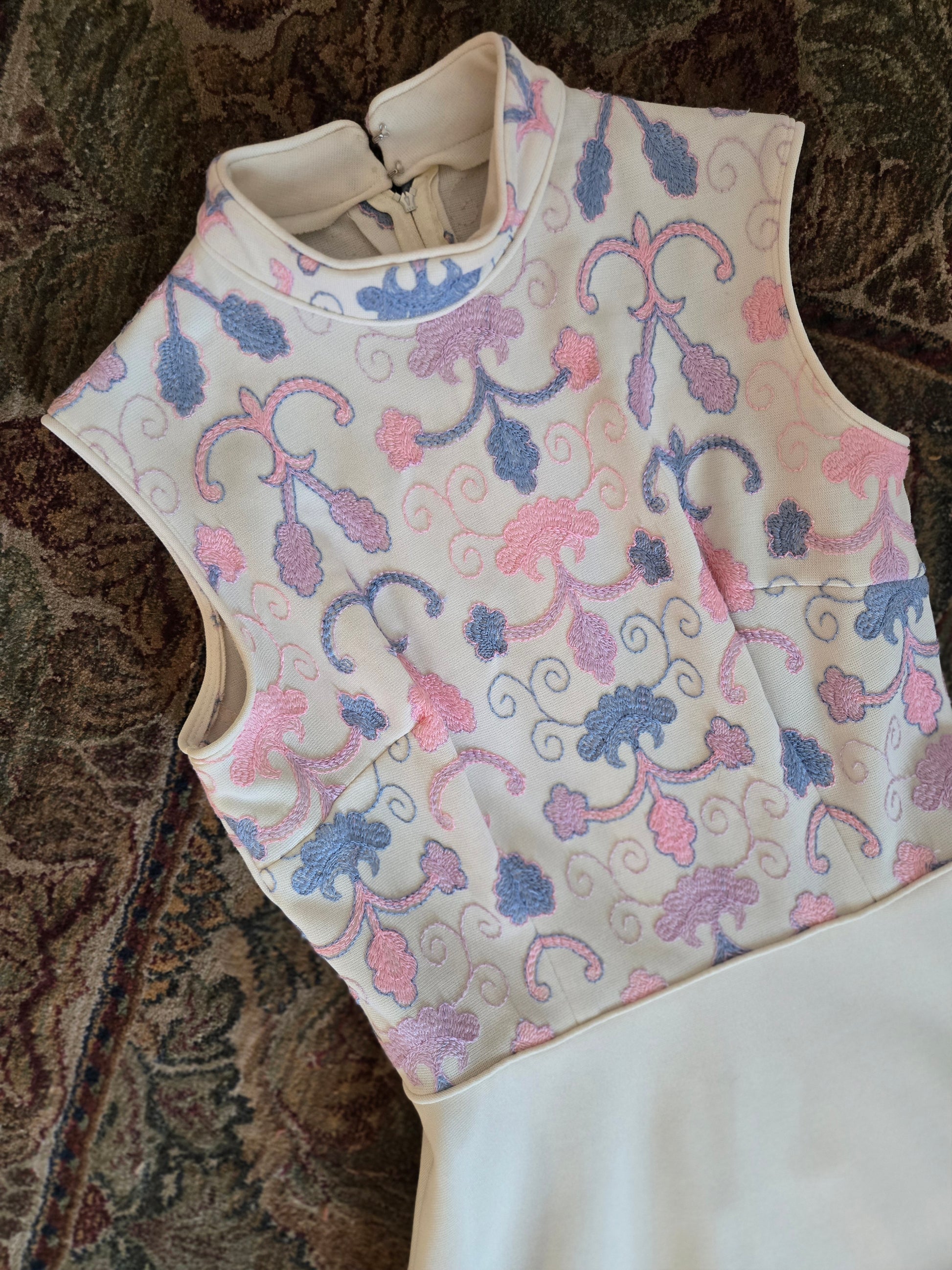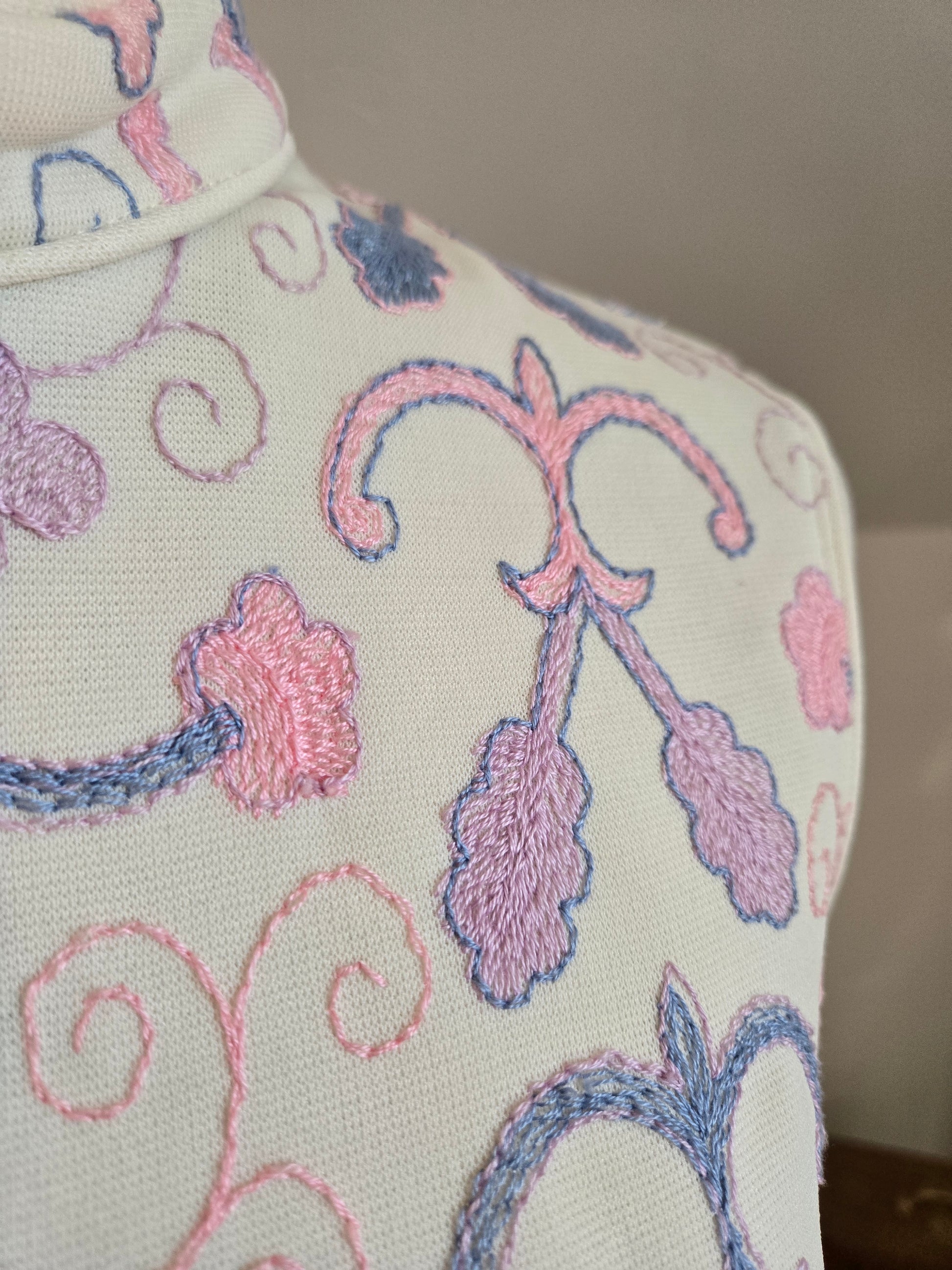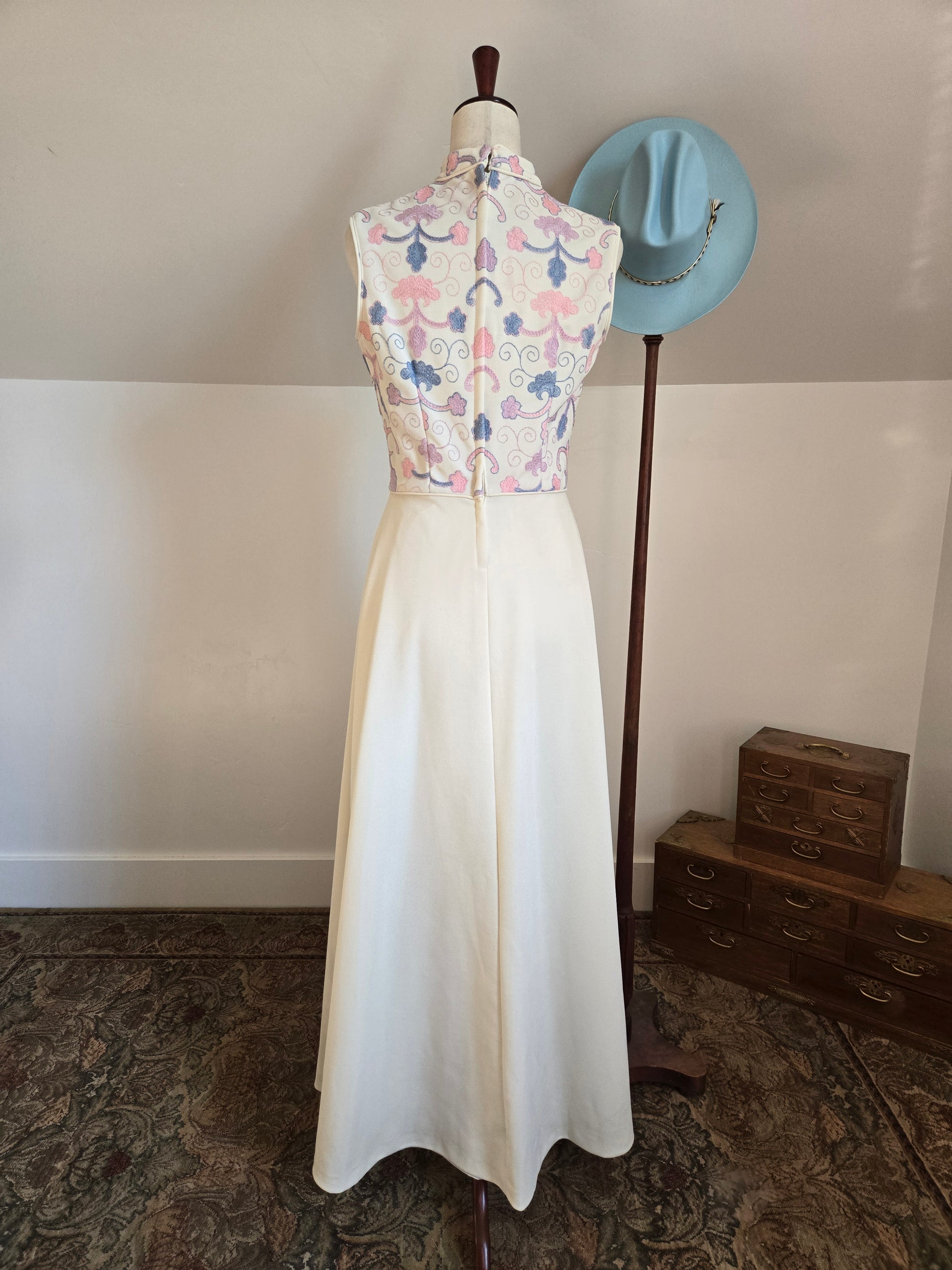 Vicky Vaughn vintage 70s poly knit maxi dress with hand embroideries throughout the top and a full cotton liner on the bottom. It is extremely well made and feels very high quality. I love the light pink and blue embroidery design placement on the top creating a beautiful and flattering look. Zips up the back and is in amazing condition.
