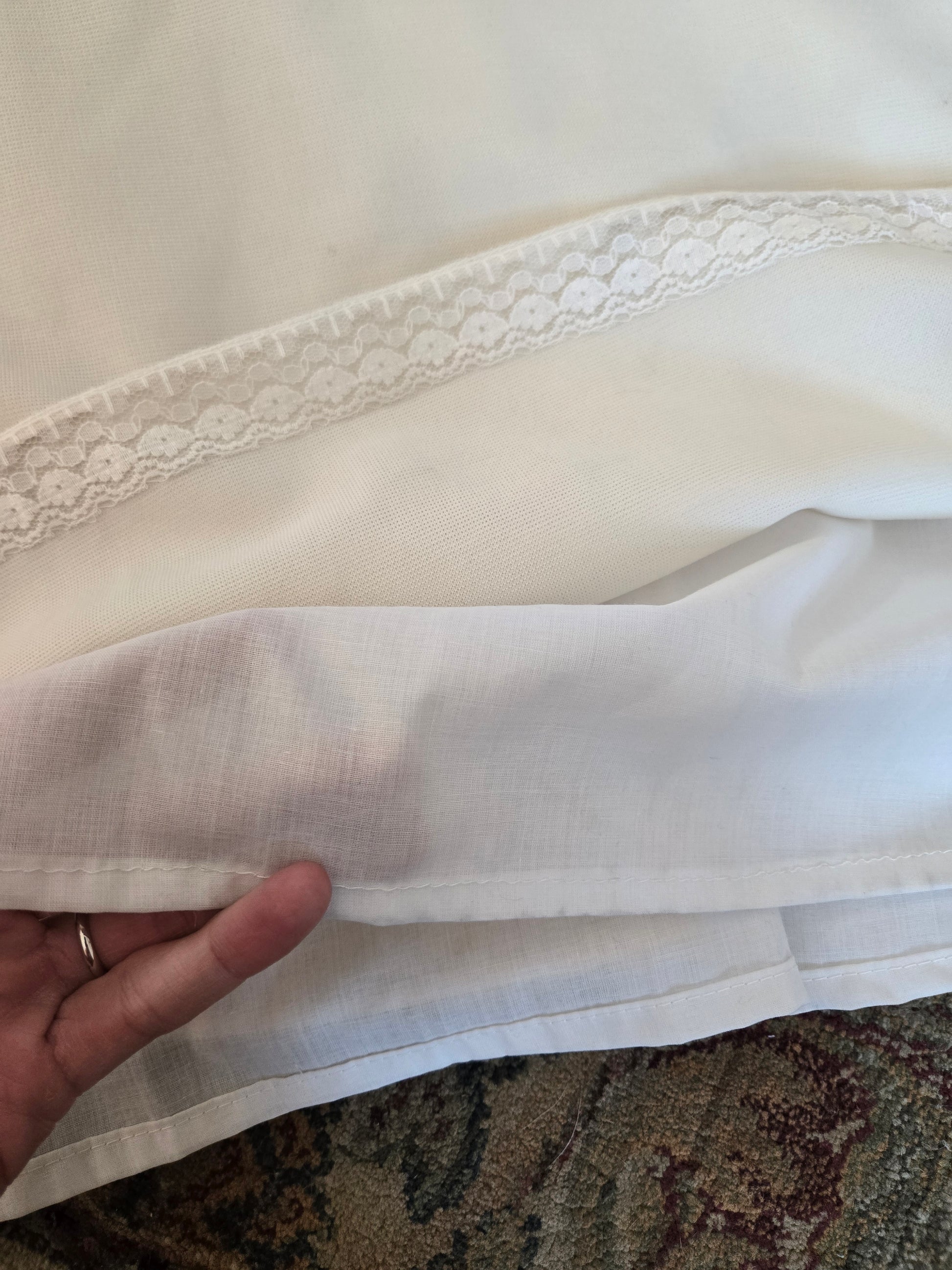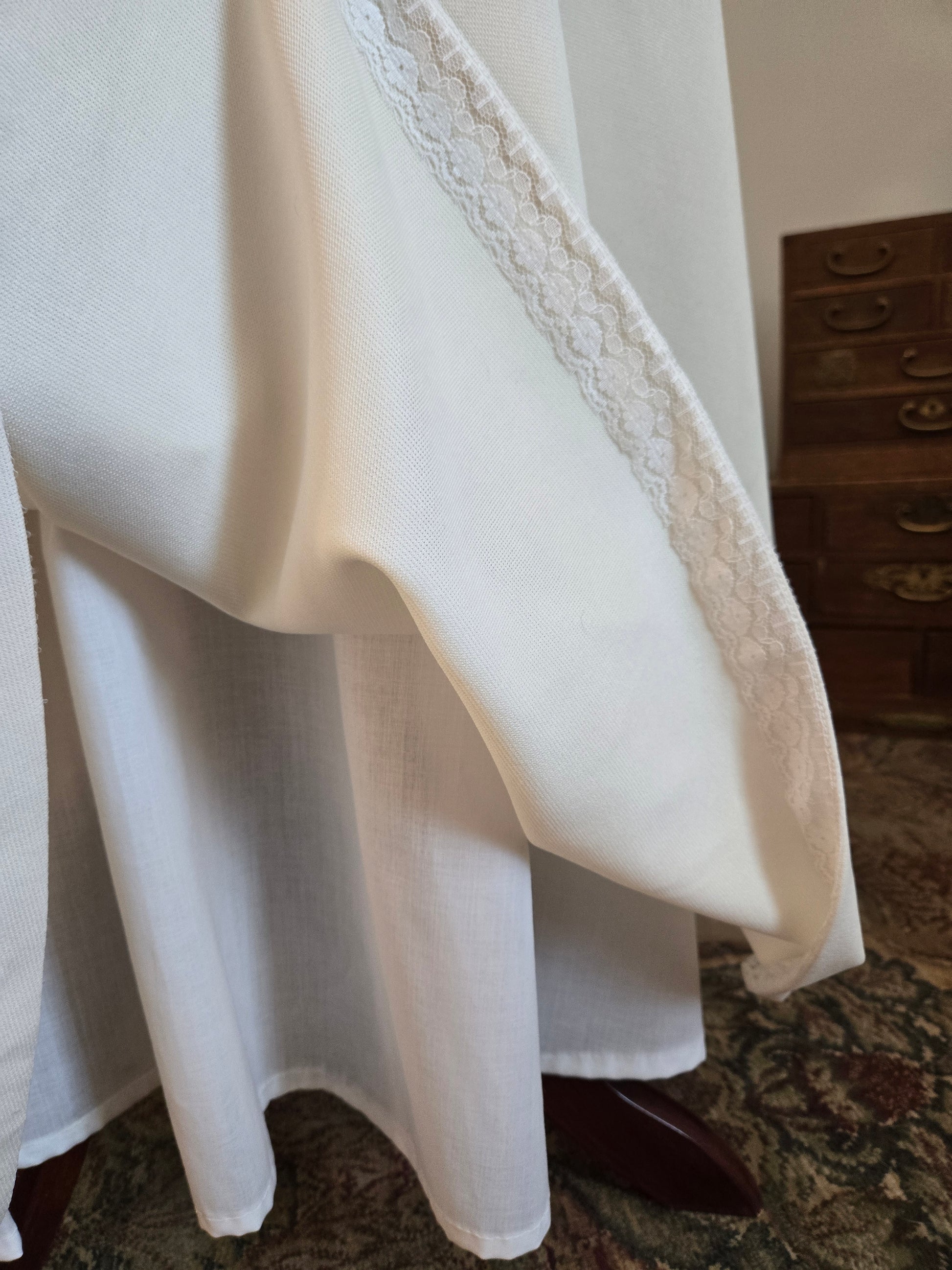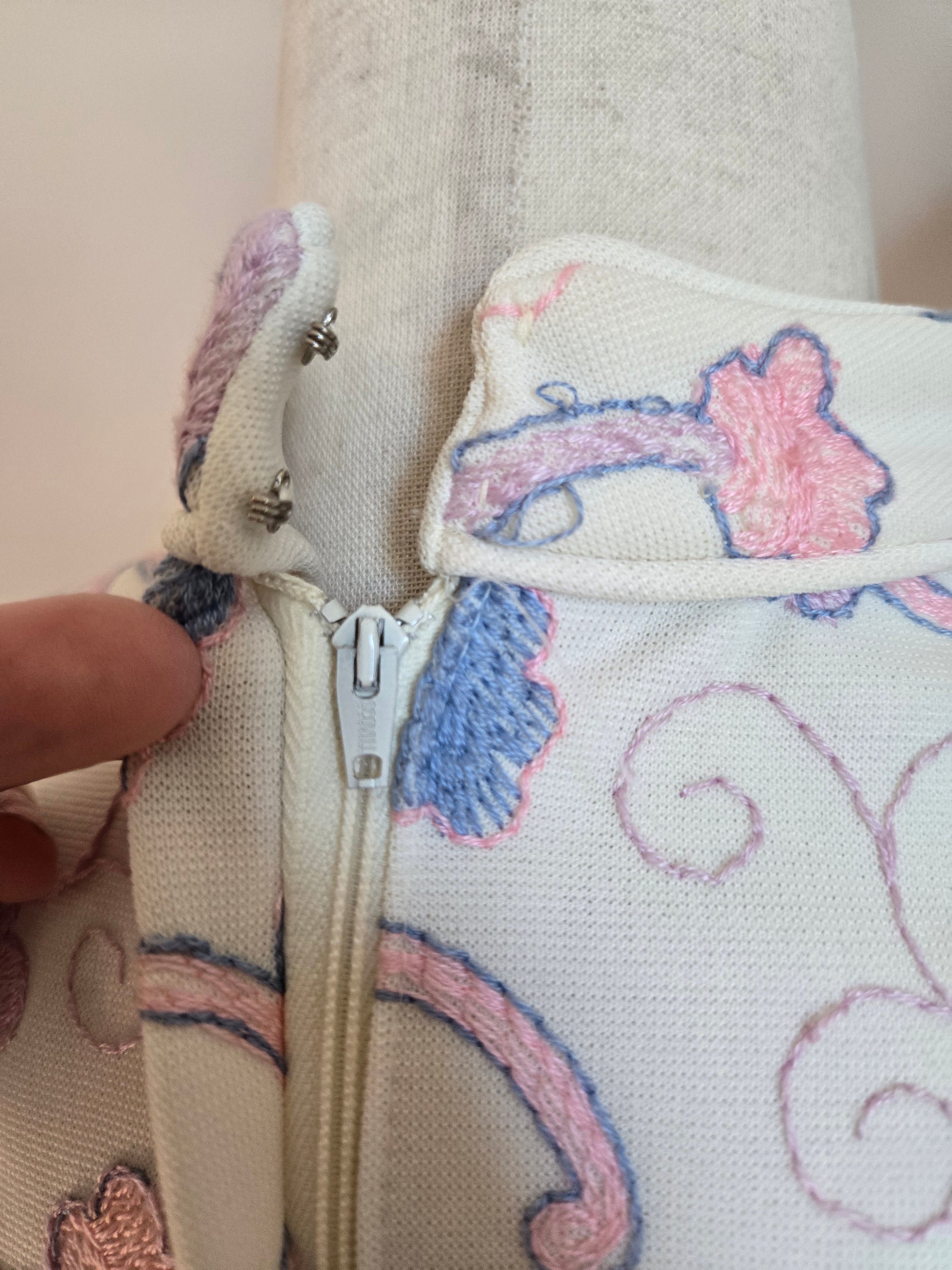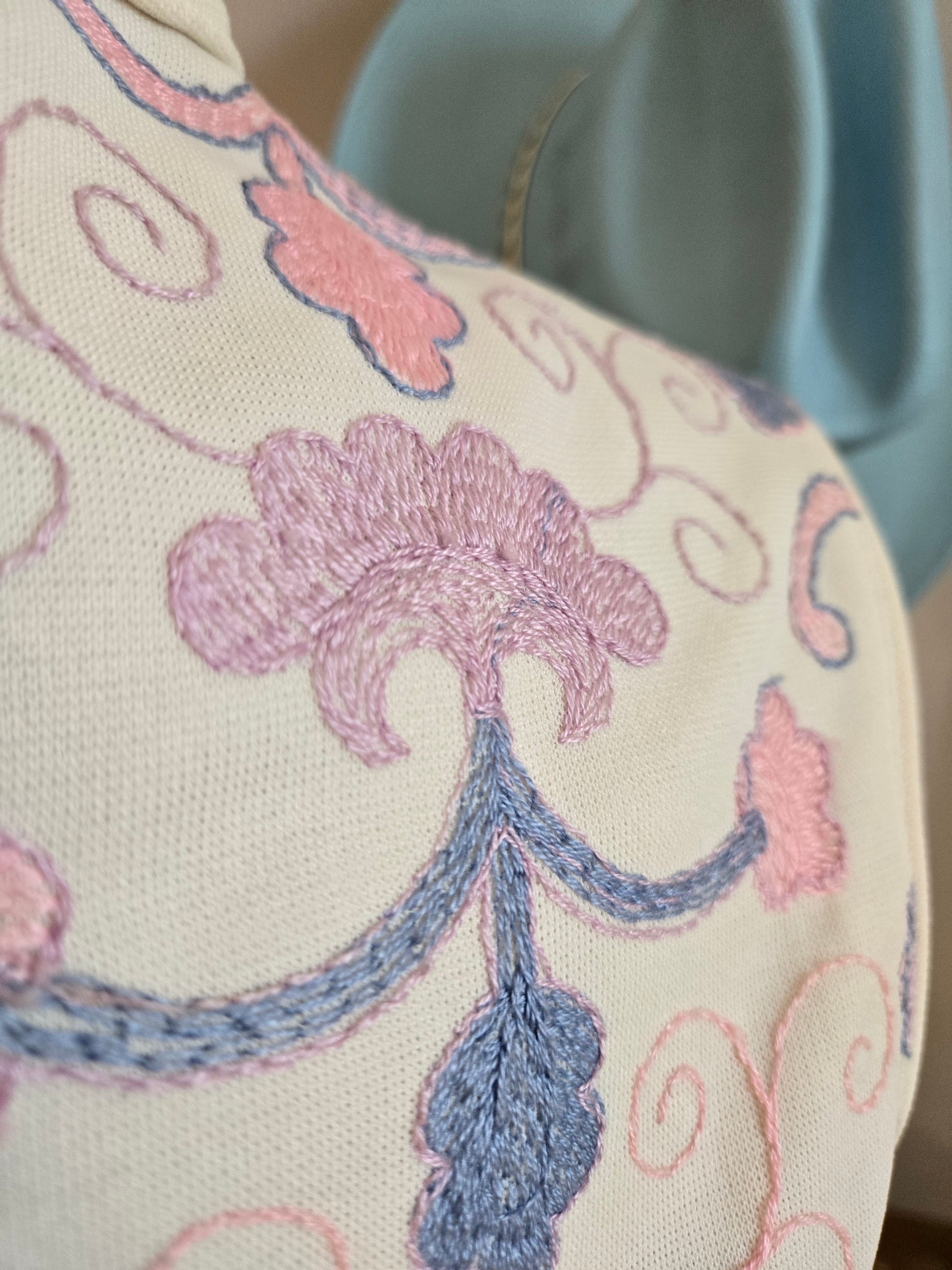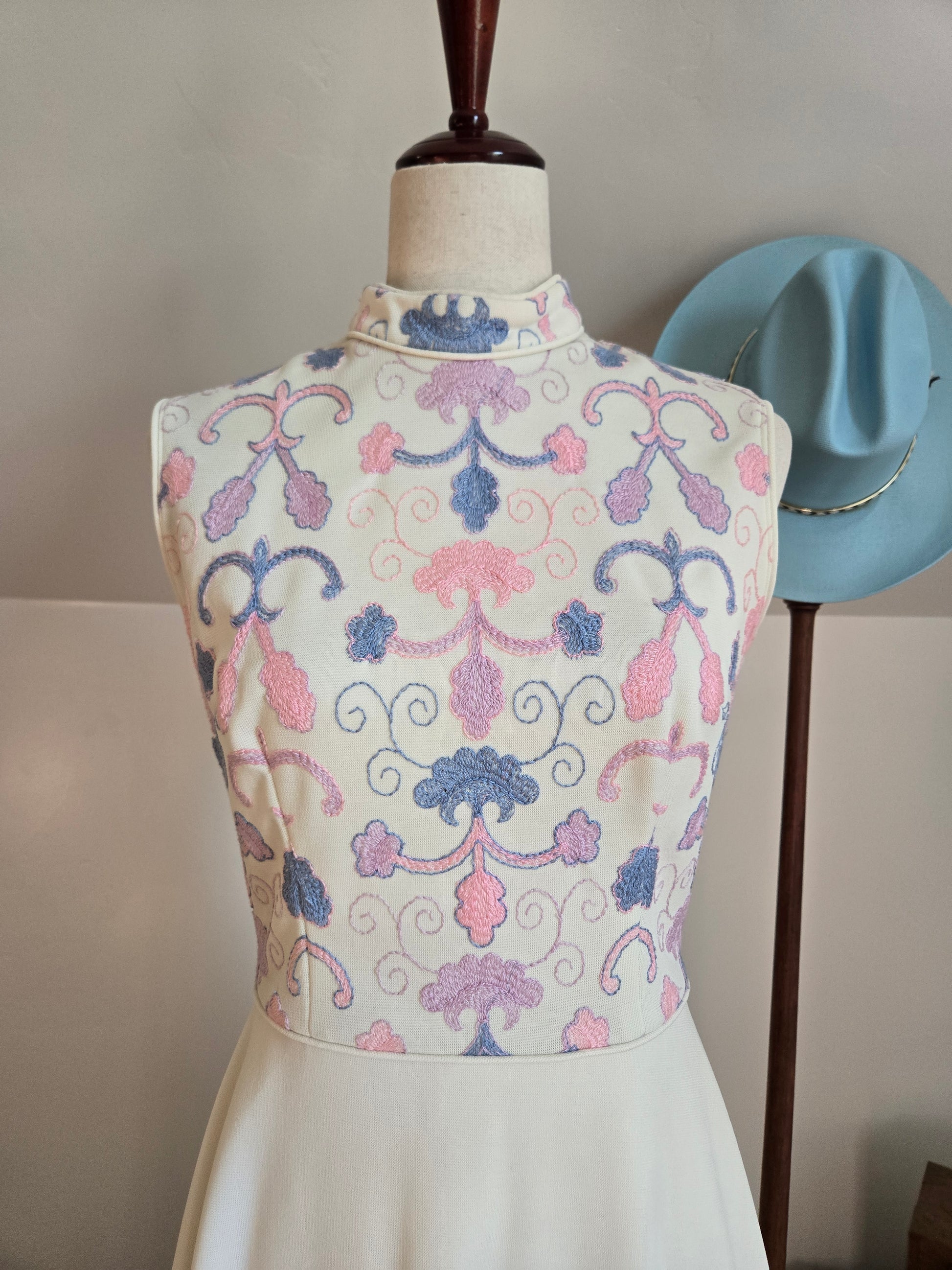 Vicky Vaughn vintage 70s poly knit maxi dress with hand embroideries throughout the top and a full cotton liner on the bottom. It is extremely well made and feels very high quality. I love the light pink and blue embroidery design placement on the top creating a beautiful and flattering look. Zips up the back and is in amazing condition.