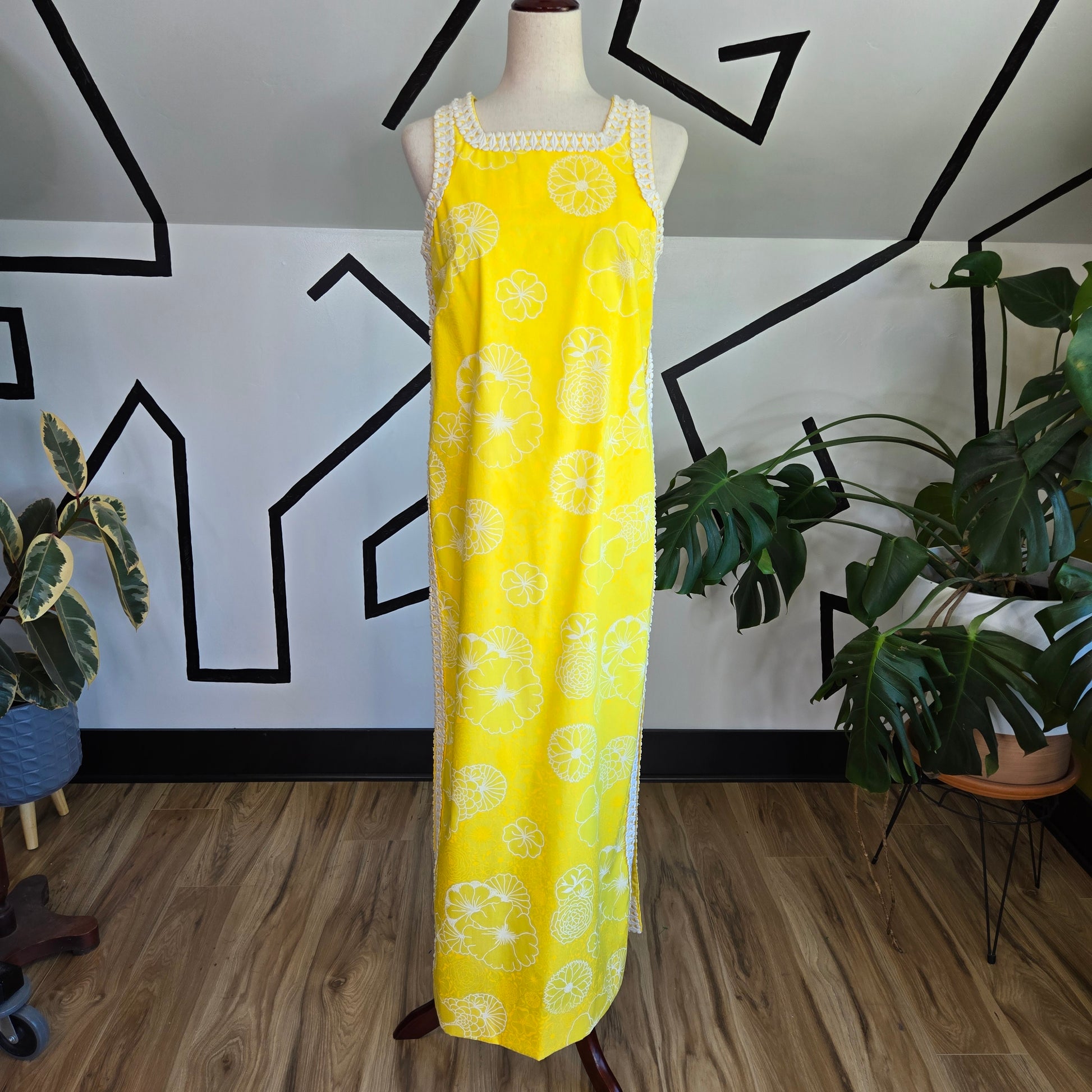 Very rare vintage The Lilly 1970s yellow and white floral Lilly Pulitzer Inc two piece set. The top is a long dress like silhouette with a large side slit up to the hip. All edges are trimmed with a white embroidered lace detail and square neckline. It also has a center back metal zipper. The shorts have an elastic waistband.