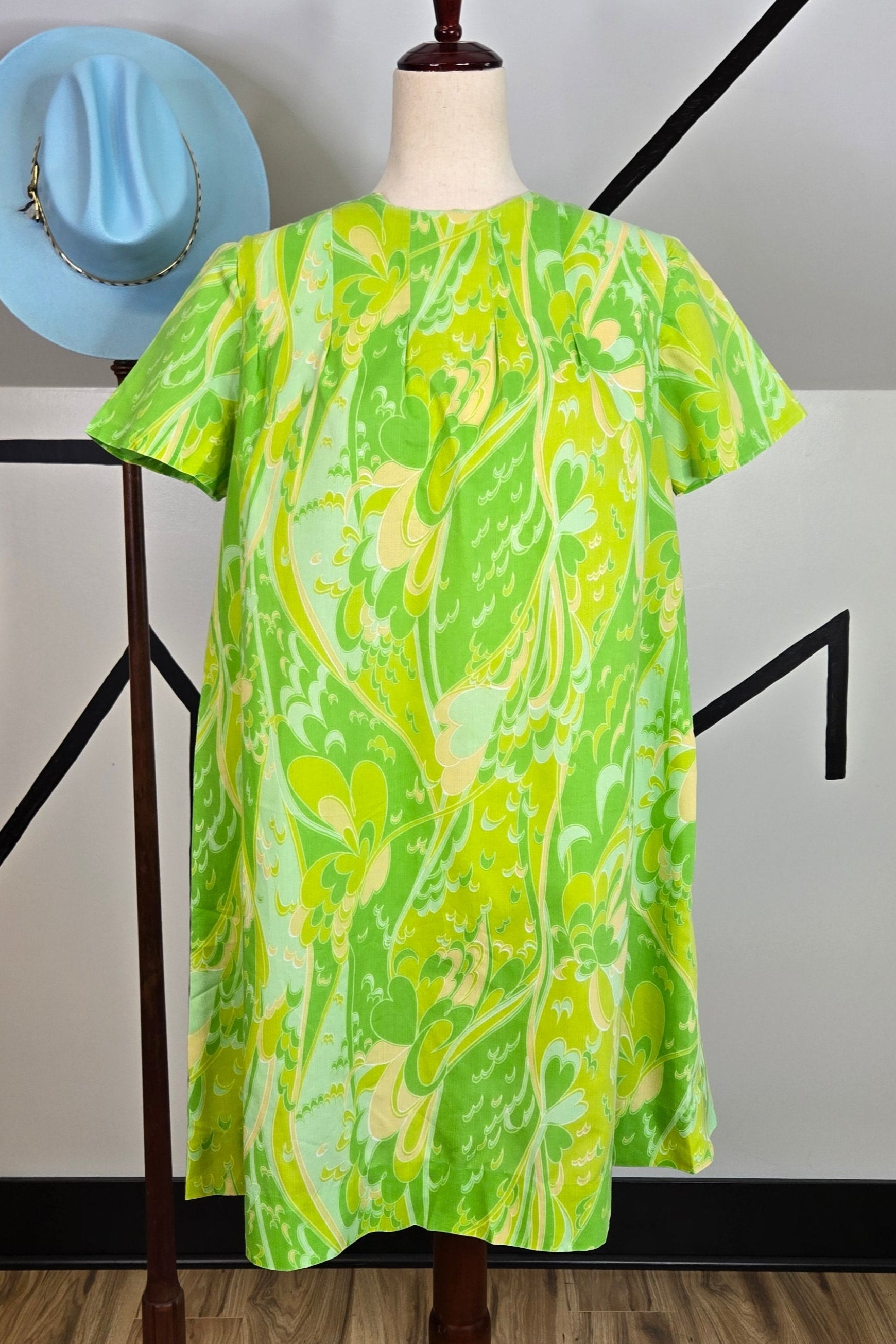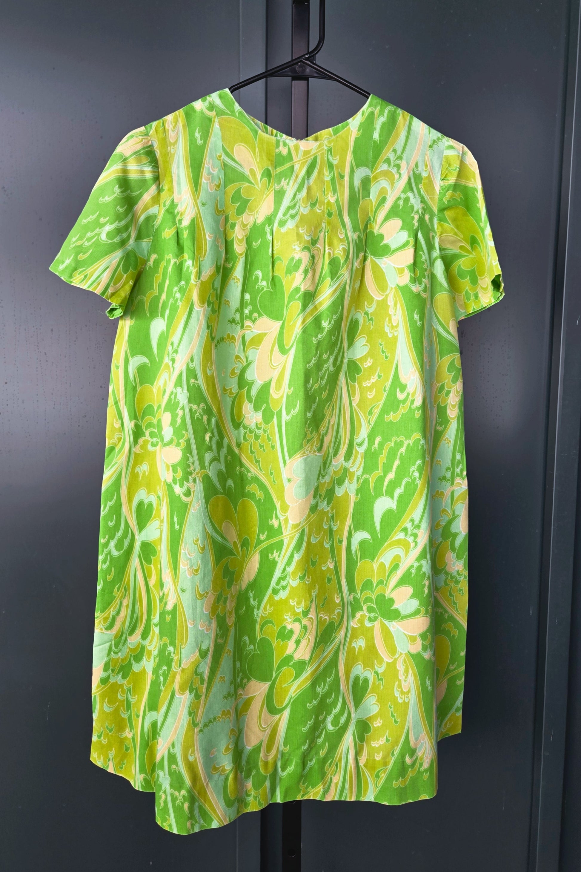 Vintage 50s handmade lime green, yellow, and mint blue cotton gauzy shift dress with a slight flare and cap sleeve. It has a zipper closure in the back and a single stitch hem. There are darted seams at the shoulders to create a little bit of volume. It is in great condition for its age and very well made.
