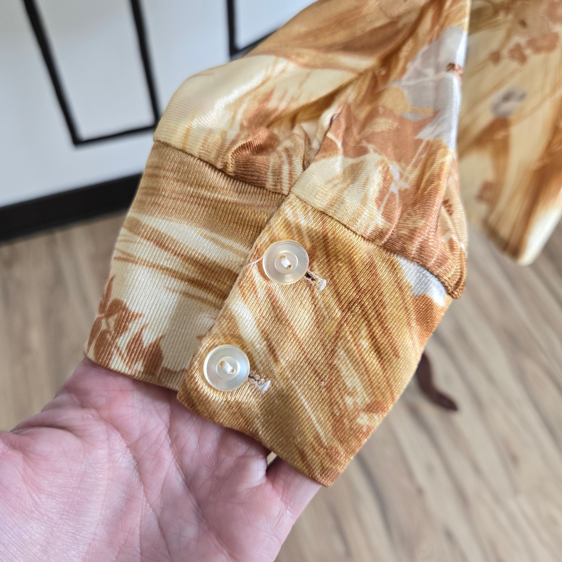 Vintage Brown Floral 1960s Shiny Nylon Sharp Dagger Collar Top - medium/large