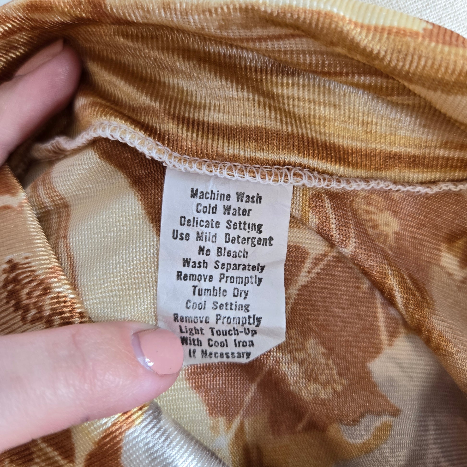 Rare vintage 1960s brown floral top in a shiny nylon material with the sharpest dagger collar! The flowers are a white and gray color and the base of the shirt is all brown with slightly gold tones. It is in great condition!