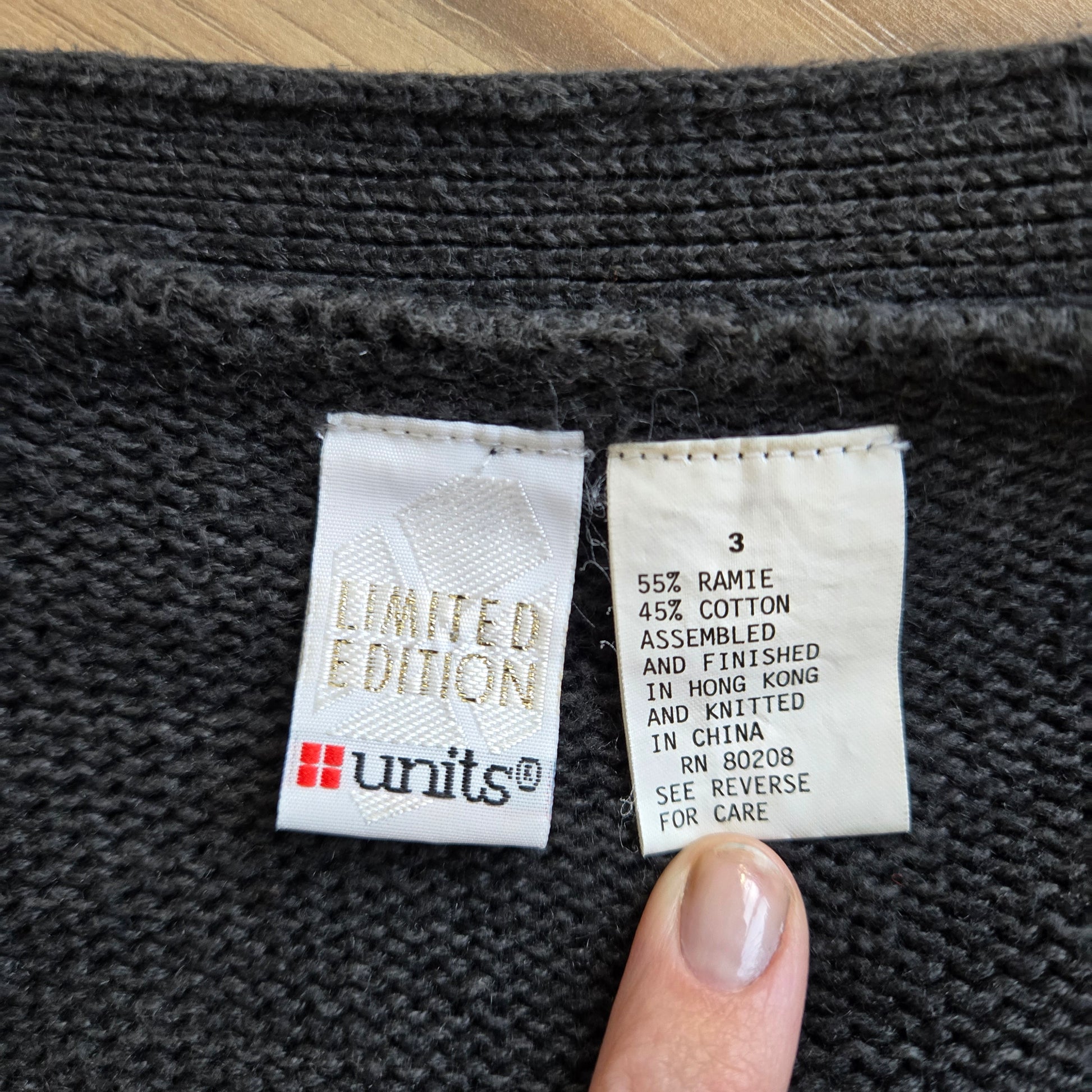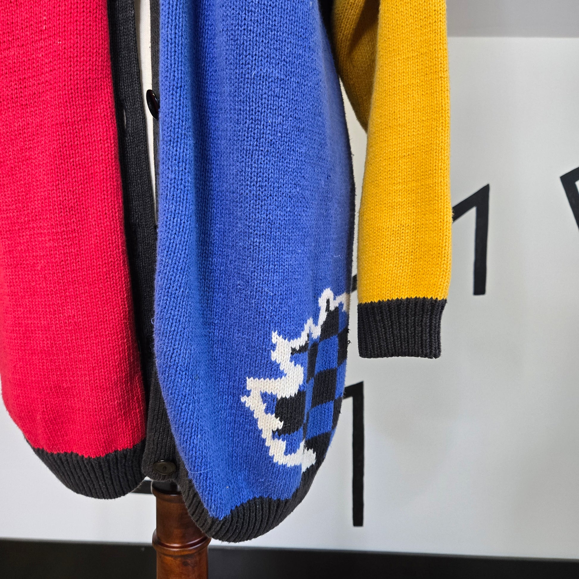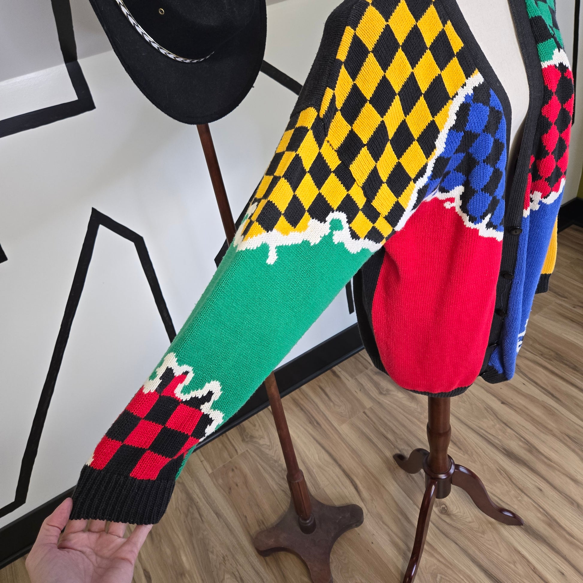 Vintage 80s Limited Edition cotton/ramie blend checkered primary color button down cardigan. It is black, white, red, blue, yellow, and green with a really unique knit pattern of different sections of checkers. Assembled and finished in Hong Kong, knitted in China. Great condition!