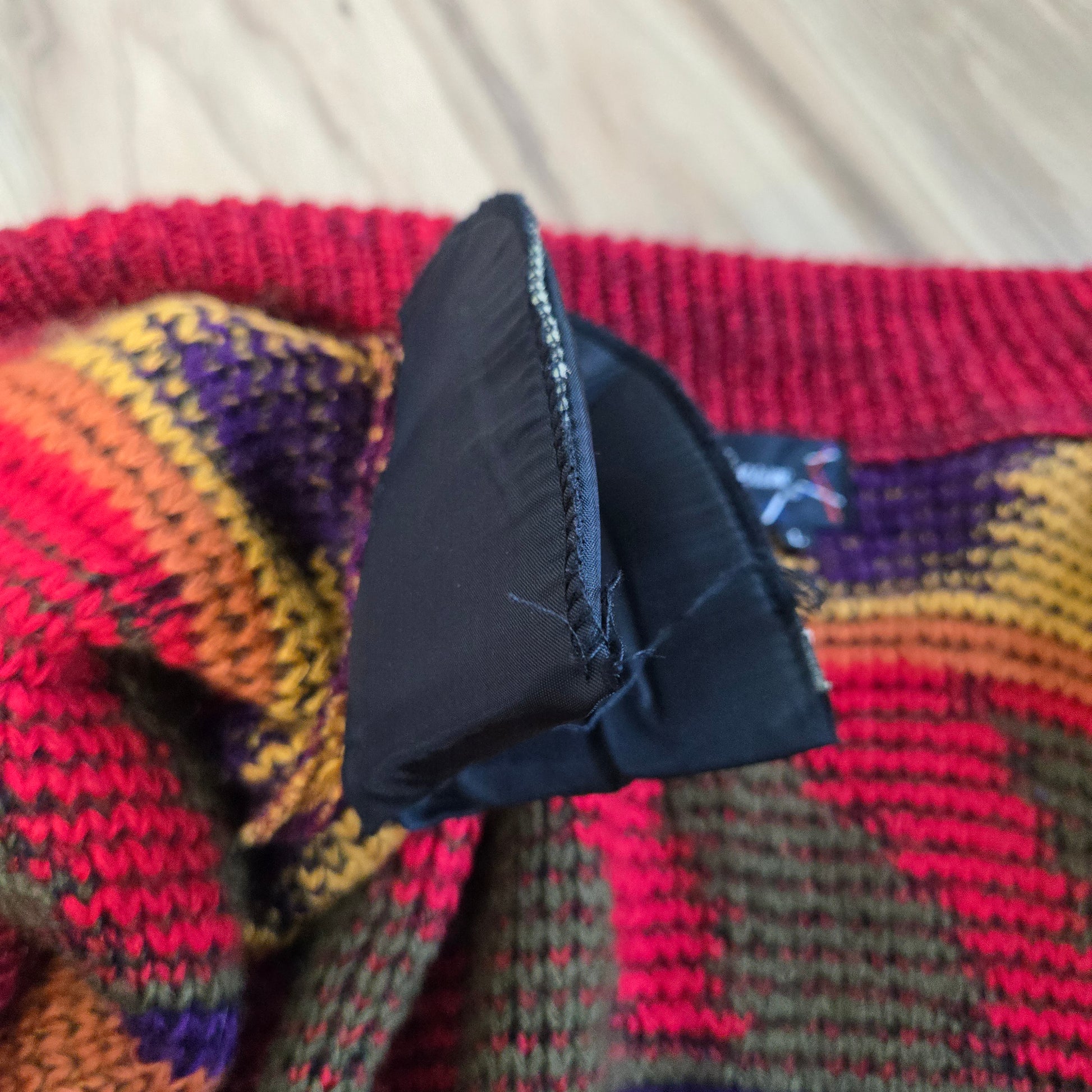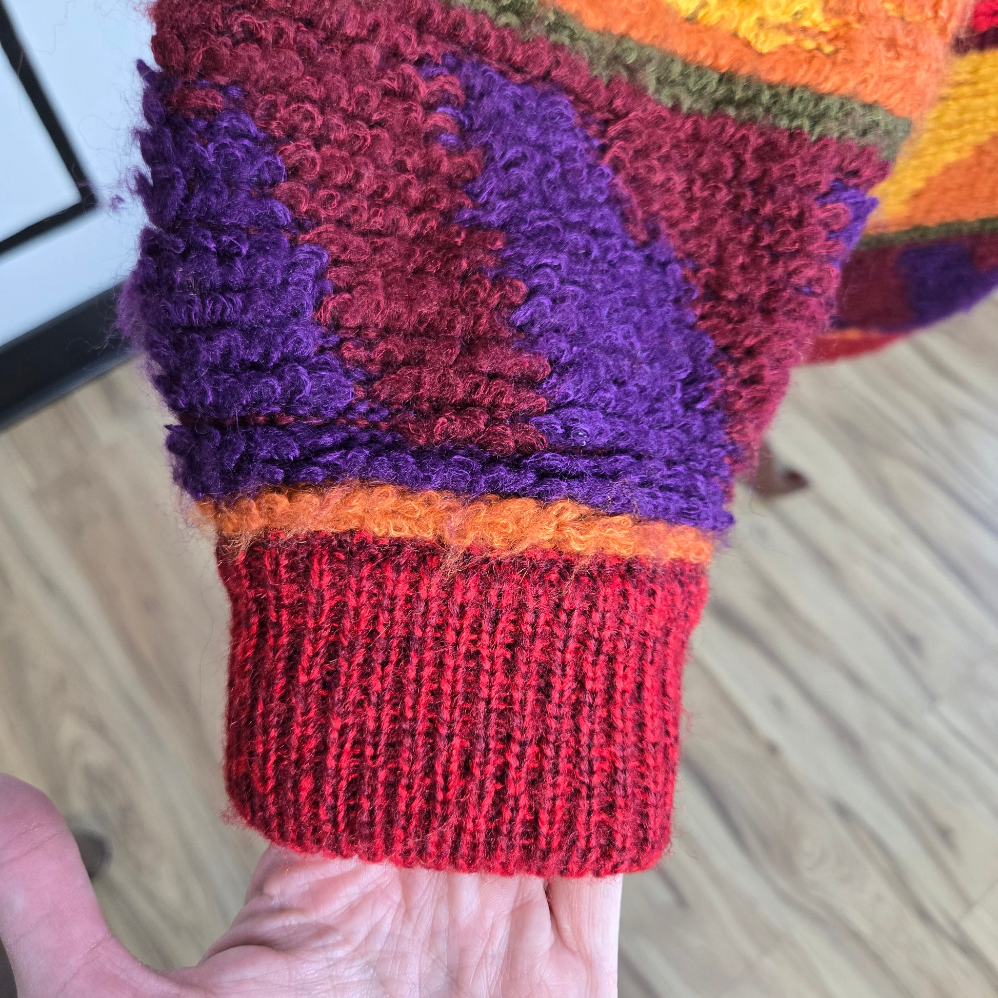 Vintage JJ Browne funky design chunky knit oversized cardigan. It is very soft and has big sleeves and a rounded hem. No closures at center front, so meant to be worn open. The color palette is super fun in a southwest vibe of mustard yellow, orange, burgundy, purple, and green. It has shoulder pads that would be easily removable and is in amazing condition.