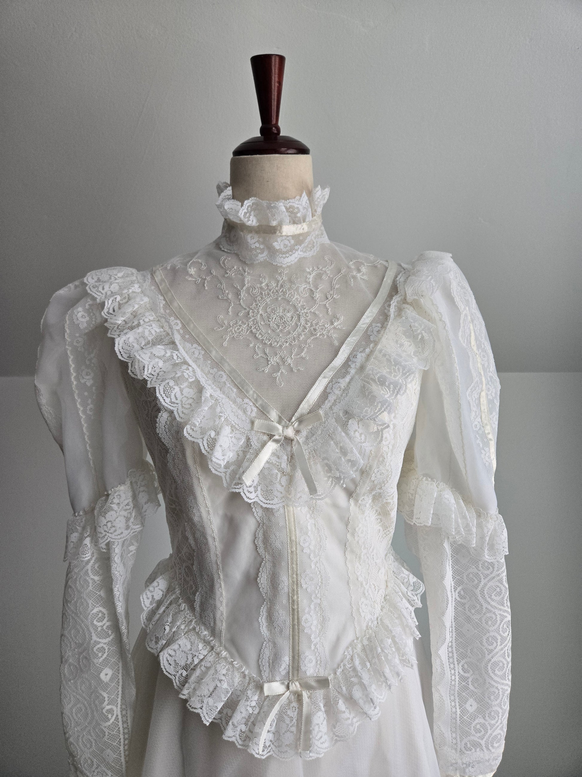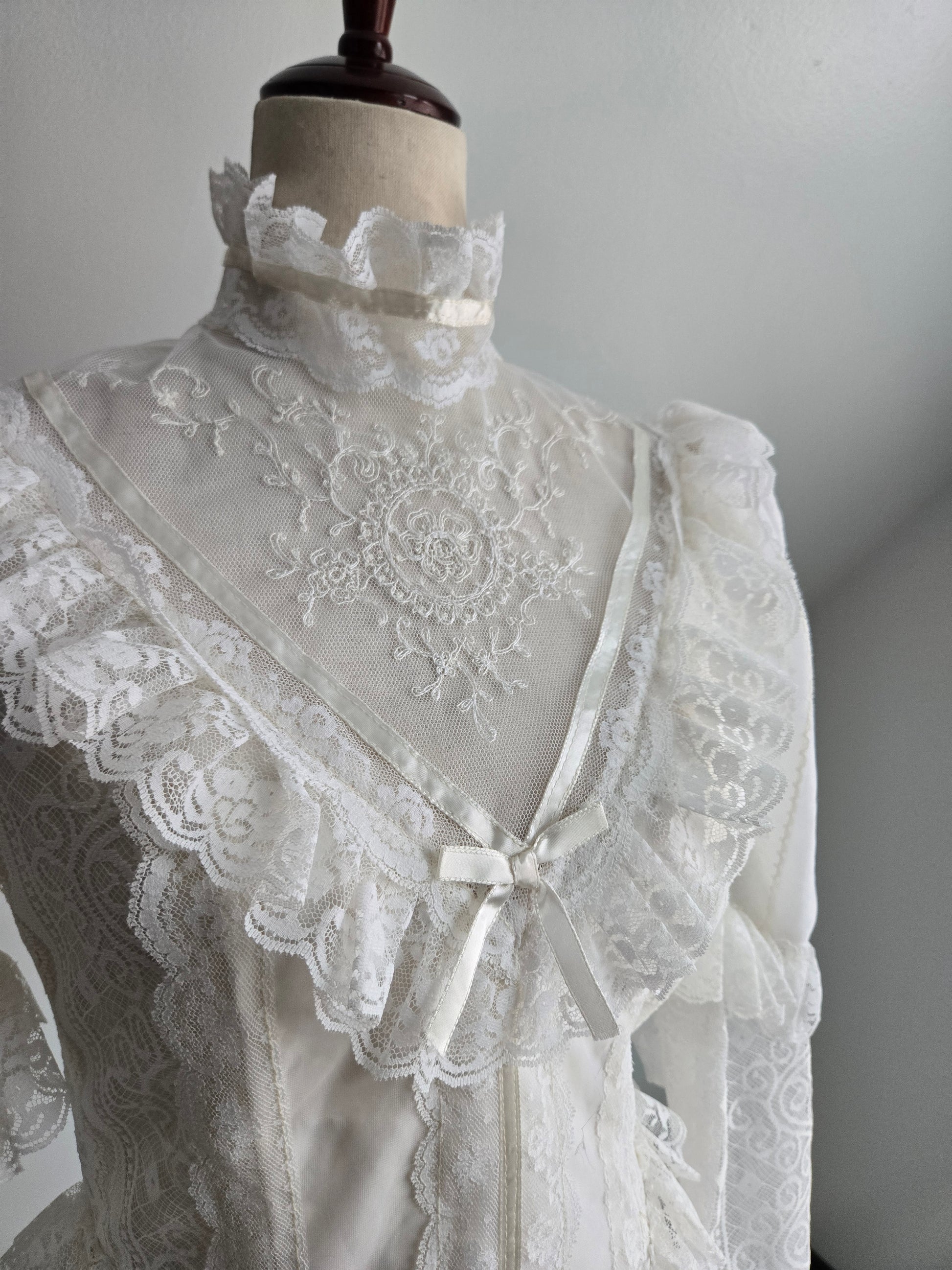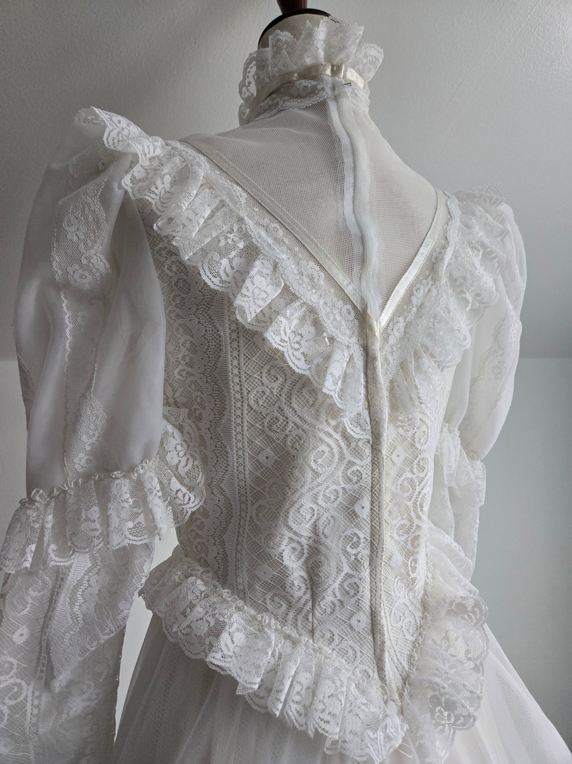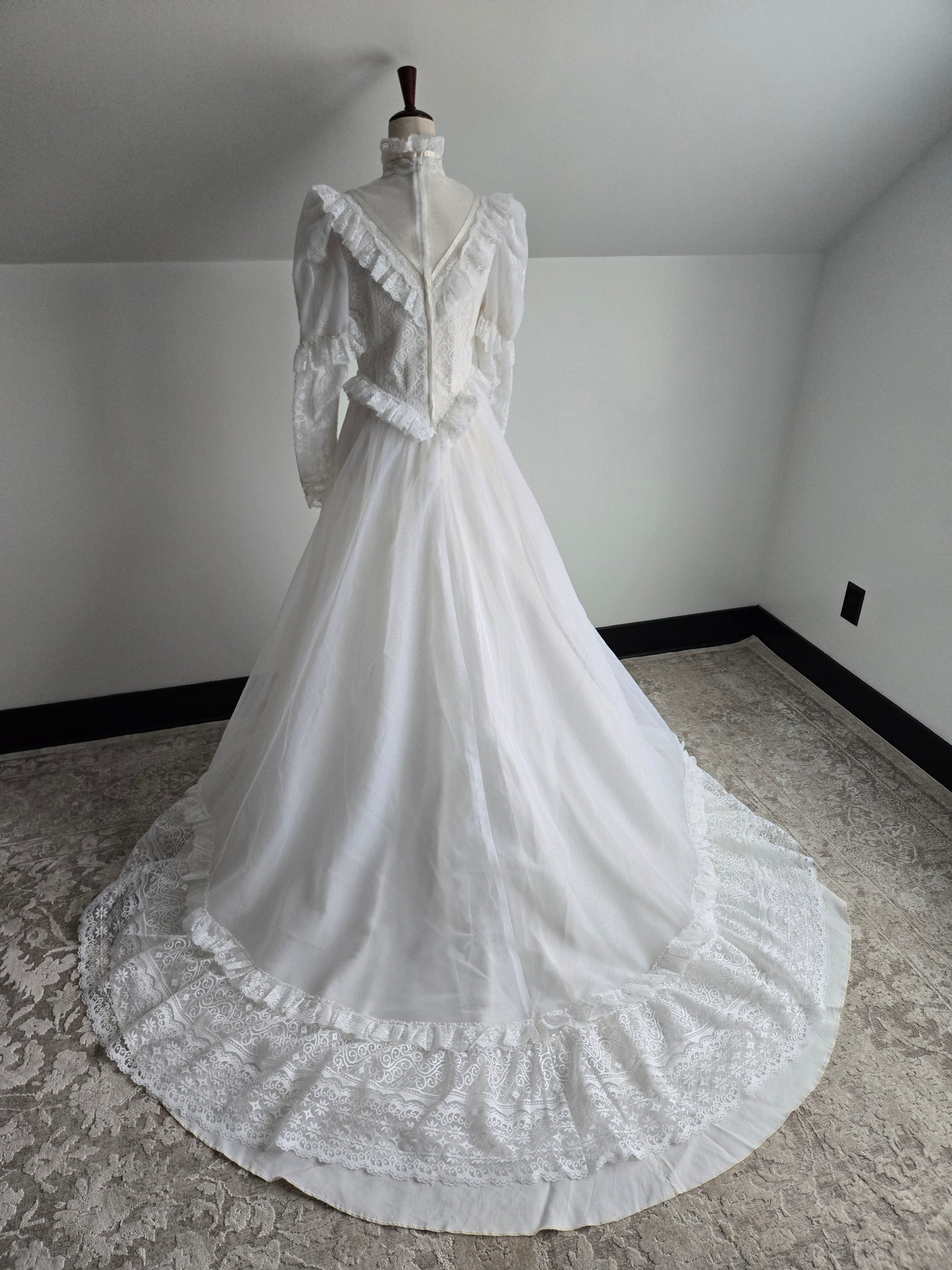 Vintage 1985 JcPenney wedding/formal dress in a gorgeous Victorian style with lace details everywhere. It is very Gunne style and inspired in it's styling and placement of lve and ruffles. It is in amazing condition with nothing to note besides some dust around the bottom hem. Would love to see this worn as a wedding dress again, but there are endless possibilities with altering that could restyle her into a lot of fun different pieces. Original catalog page included in the photos.
