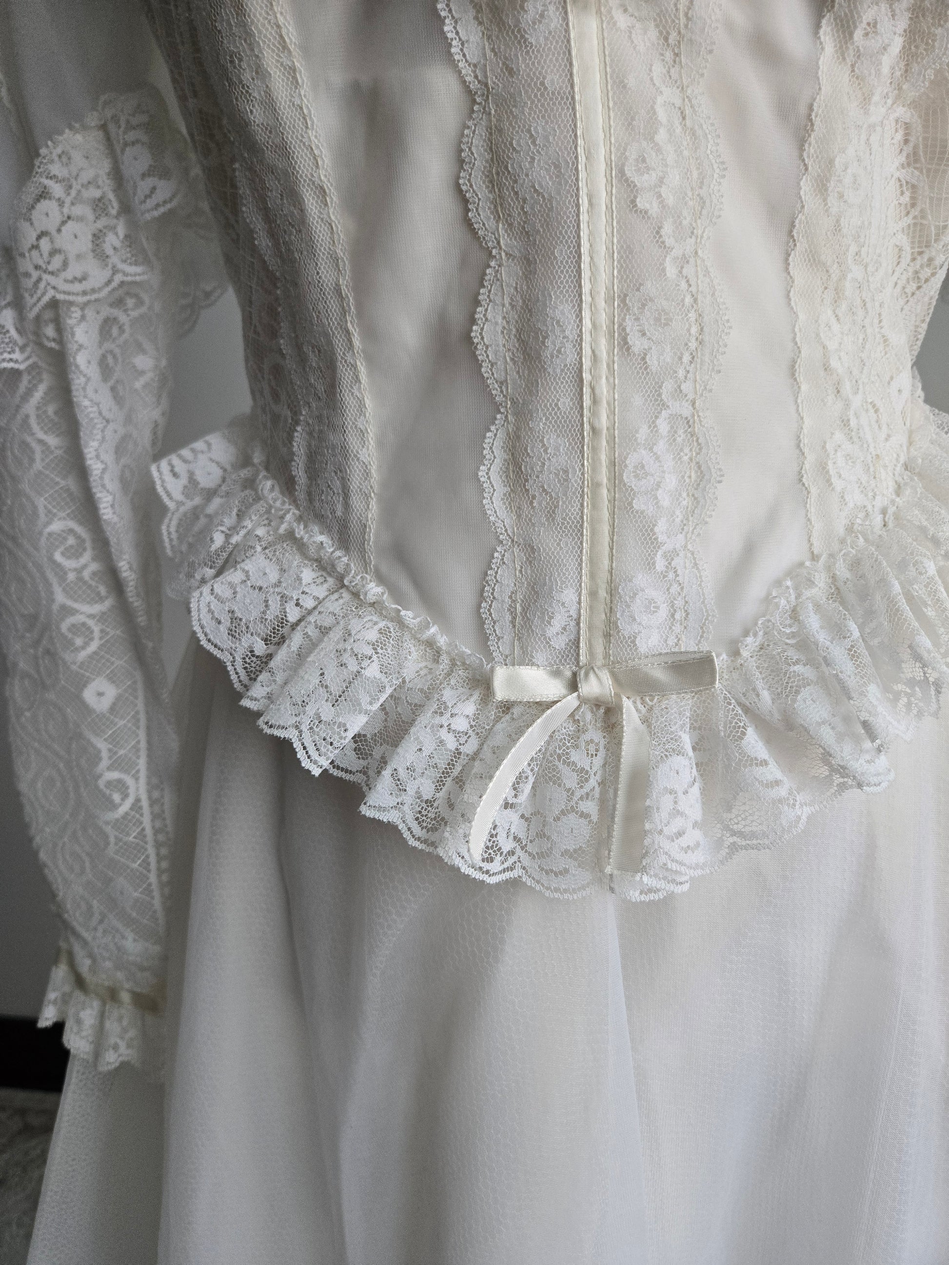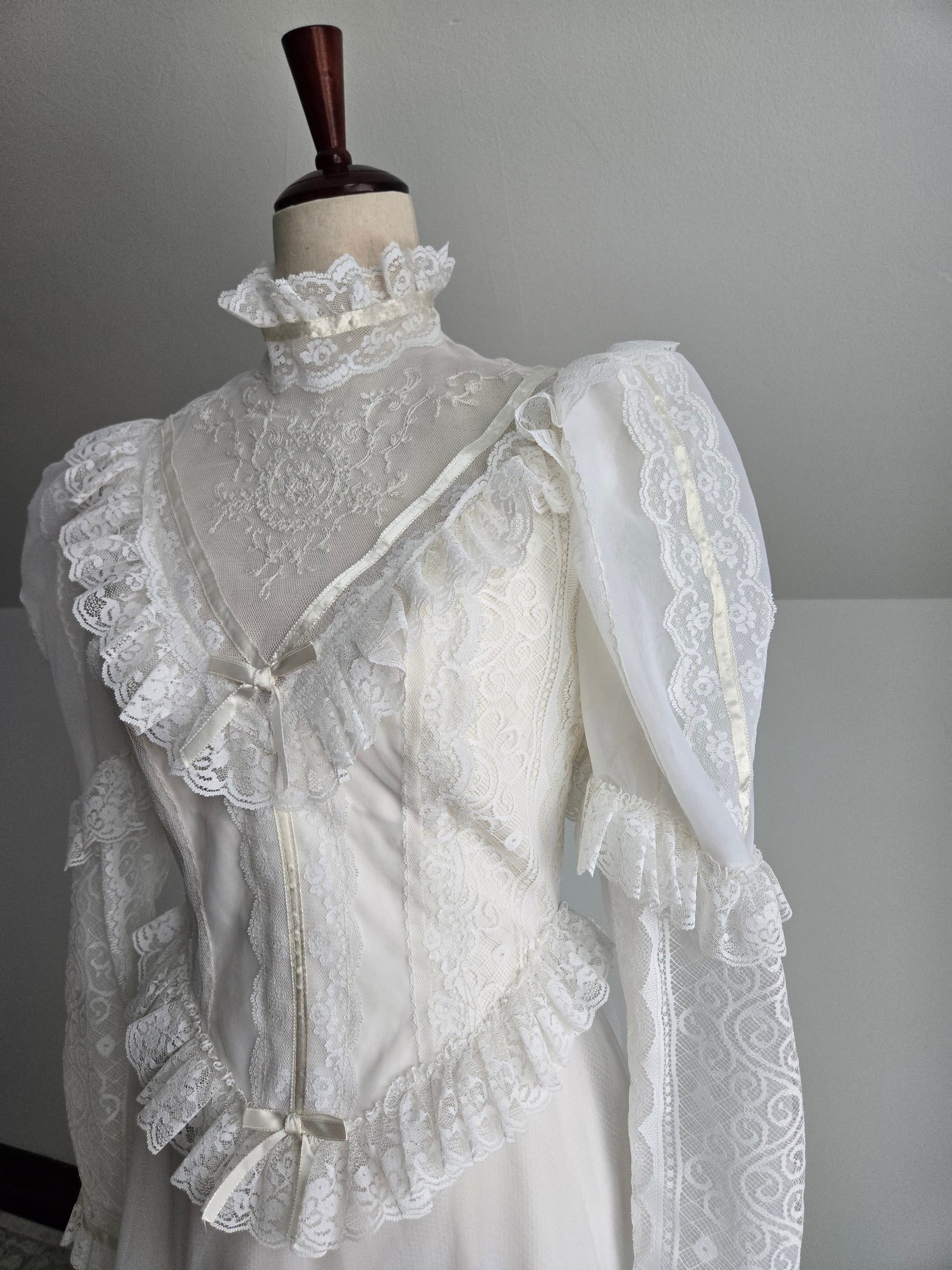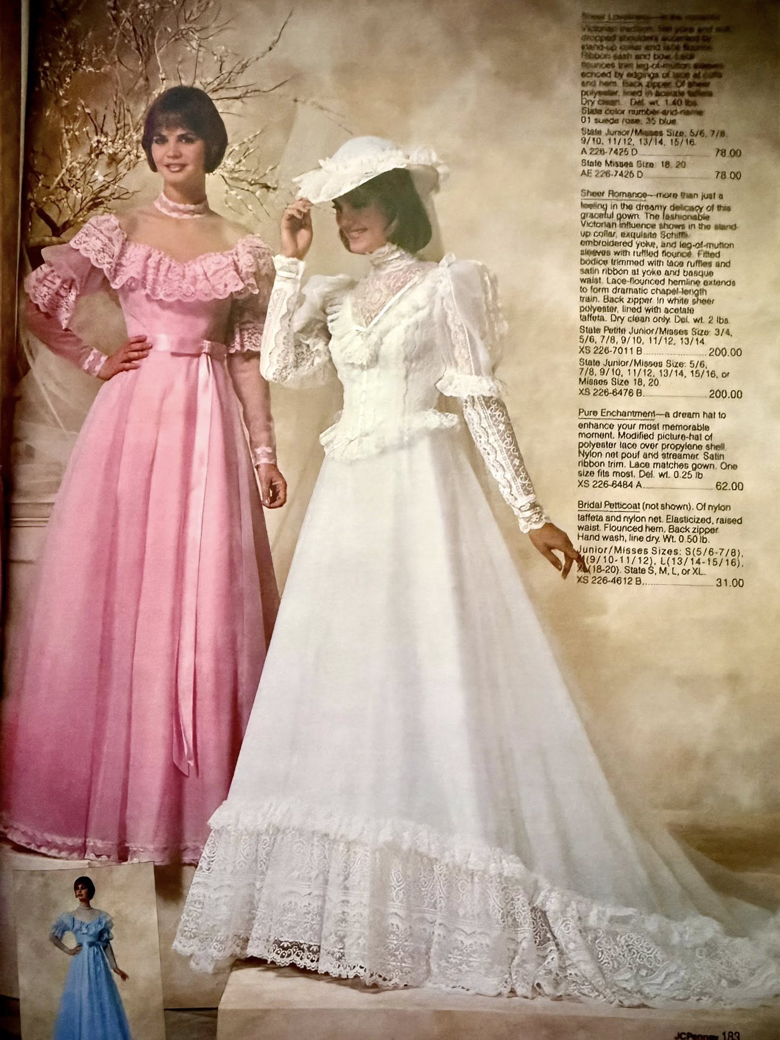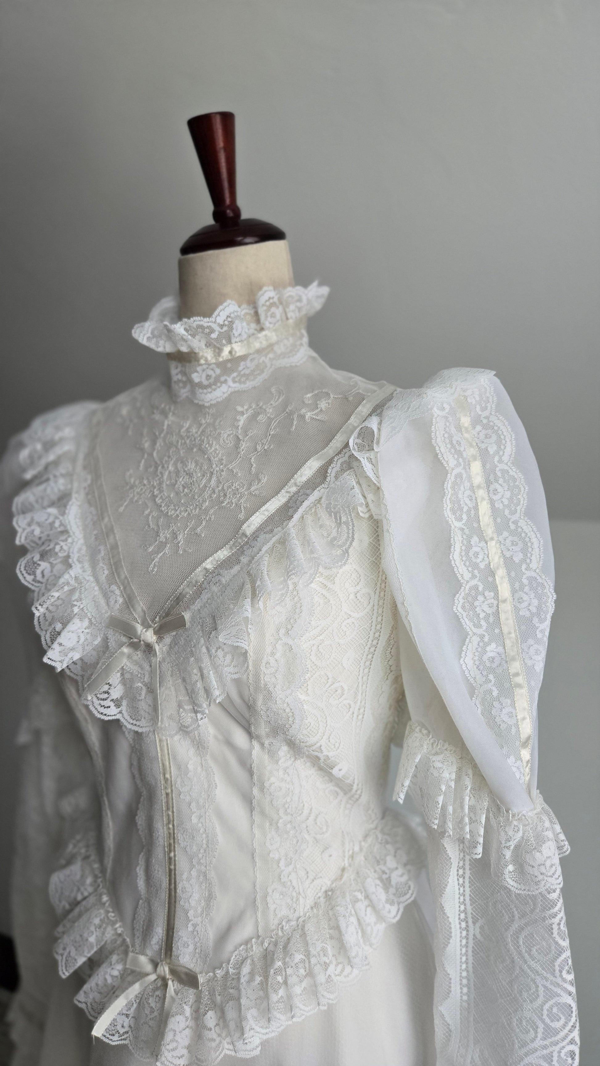 Vintage 1985 JcPenney wedding/formal dress in a gorgeous Victorian style with lace details everywhere. It is very Gunne style and inspired in it's styling and placement of lve and ruffles. It is in amazing condition with nothing to note besides some dust around the bottom hem. Would love to see this worn as a wedding dress again, but there are endless possibilities with altering that could restyle her into a lot of fun different pieces. Original catalog page included in the photos.
