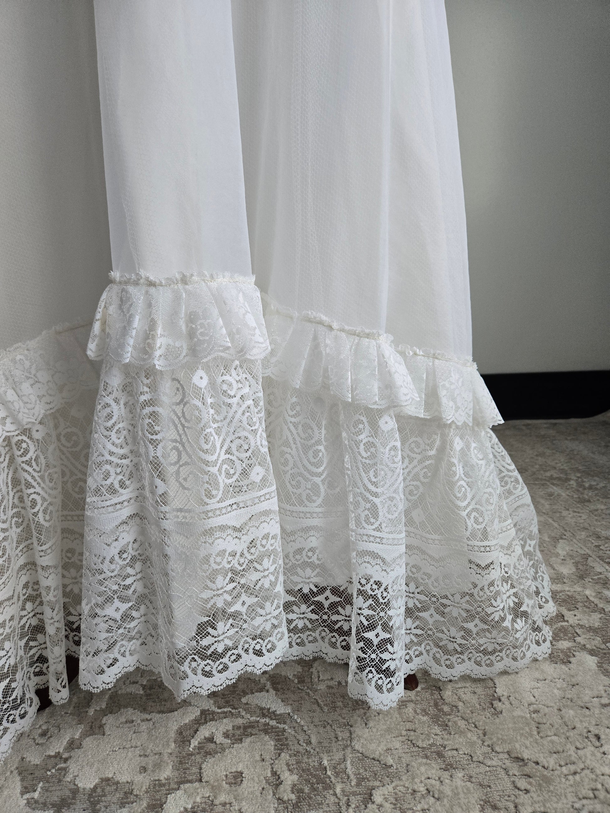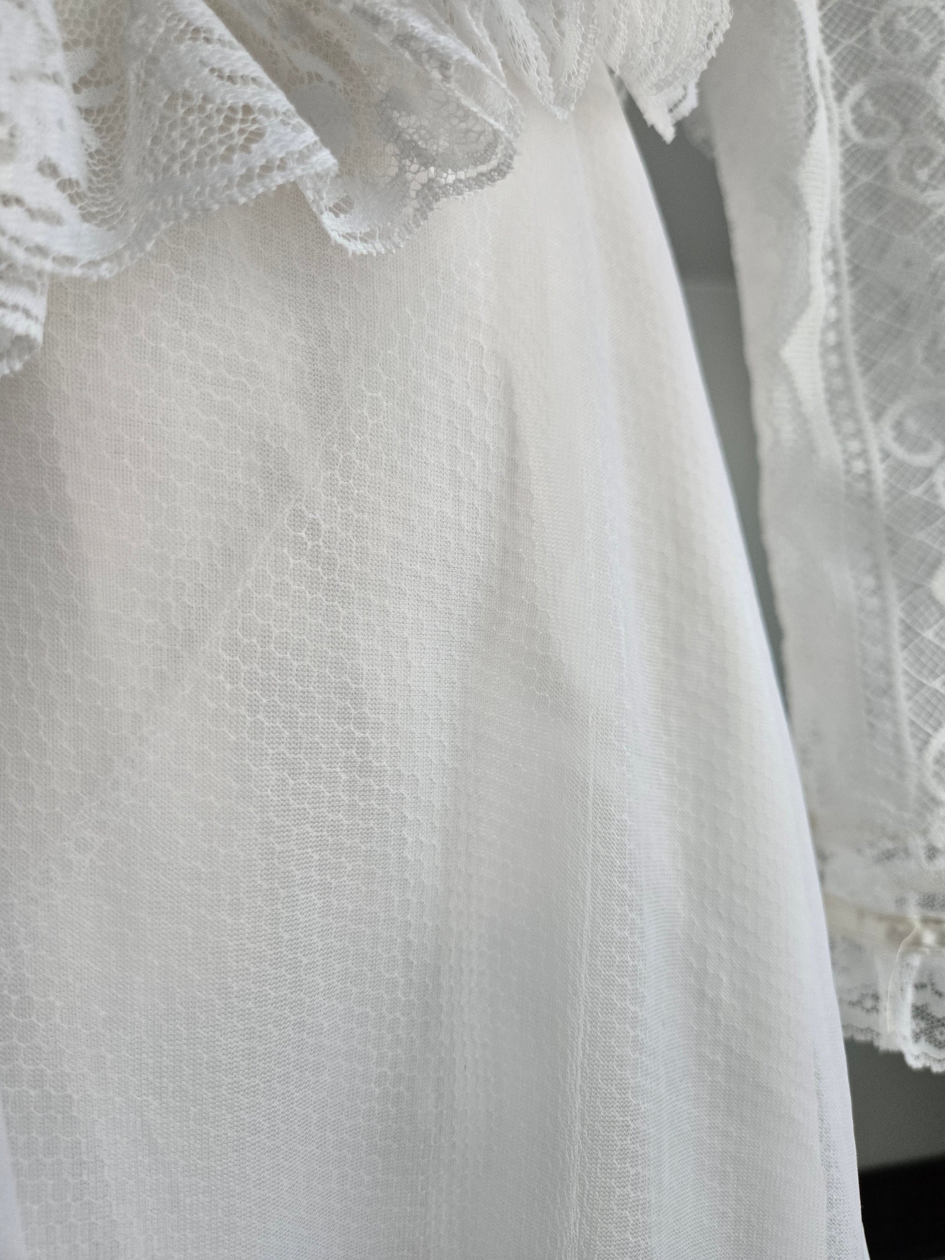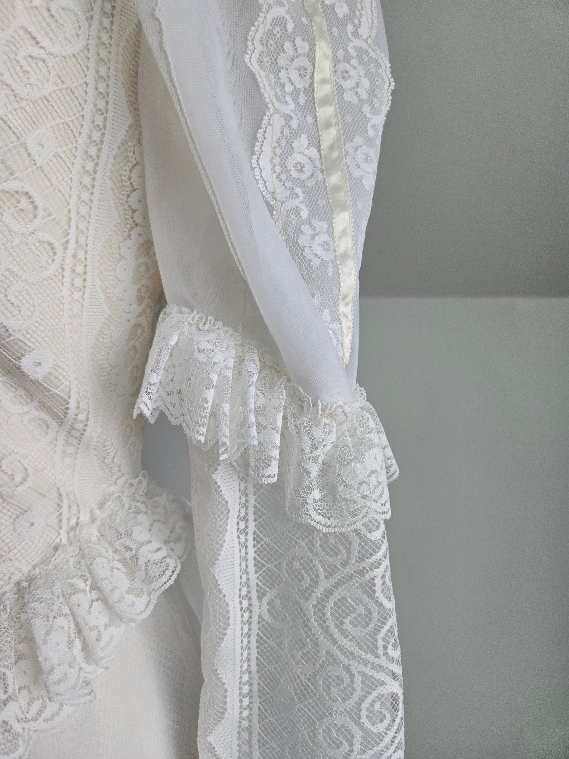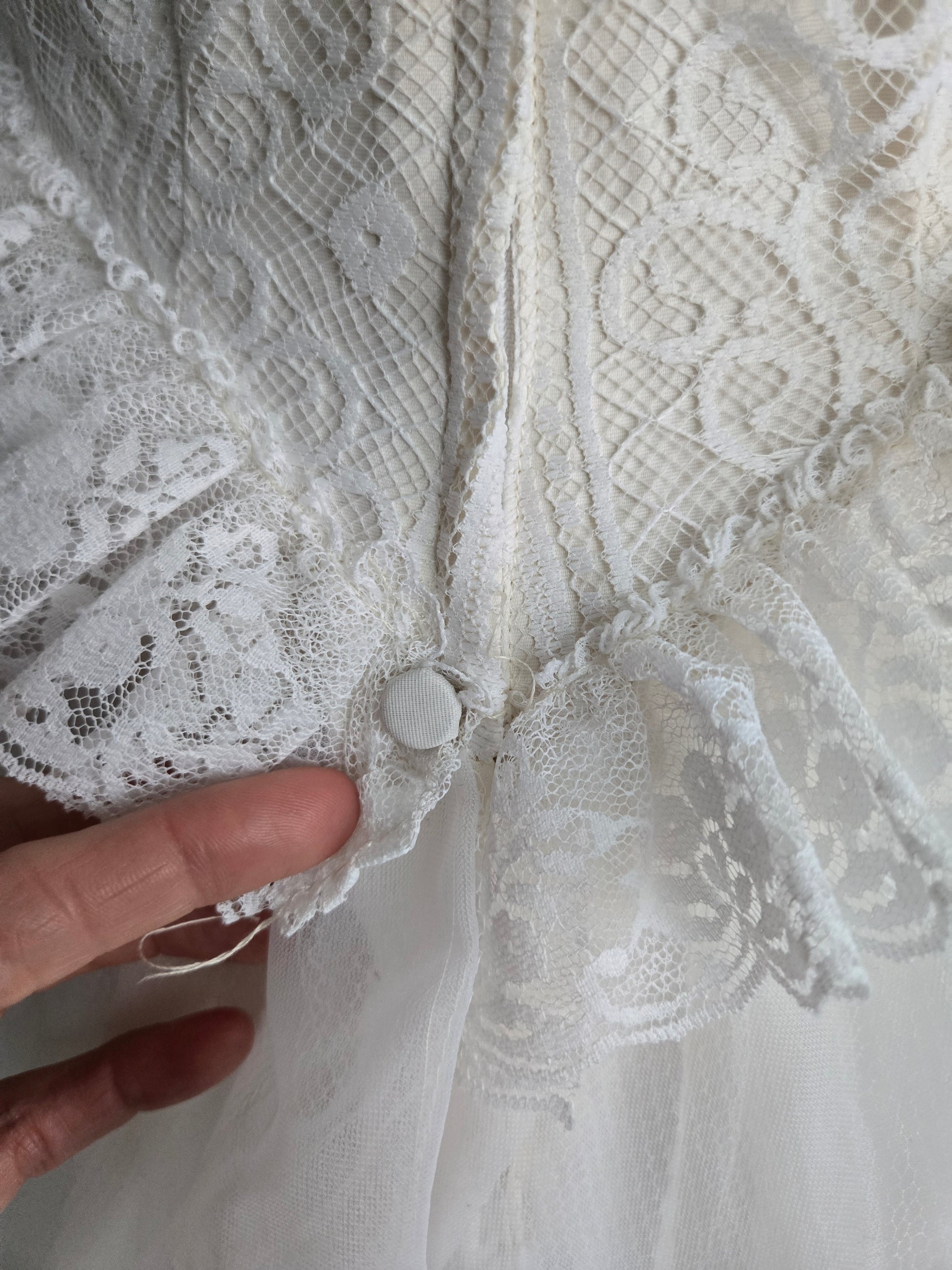 Vintage 1985 JcPenney wedding/formal dress in a gorgeous Victorian style with lace details everywhere. It is very Gunne style and inspired in it's styling and placement of lve and ruffles. It is in amazing condition with nothing to note besides some dust around the bottom hem. Would love to see this worn as a wedding dress again, but there are endless possibilities with altering that could restyle her into a lot of fun different pieces. Original catalog page included in the photos.