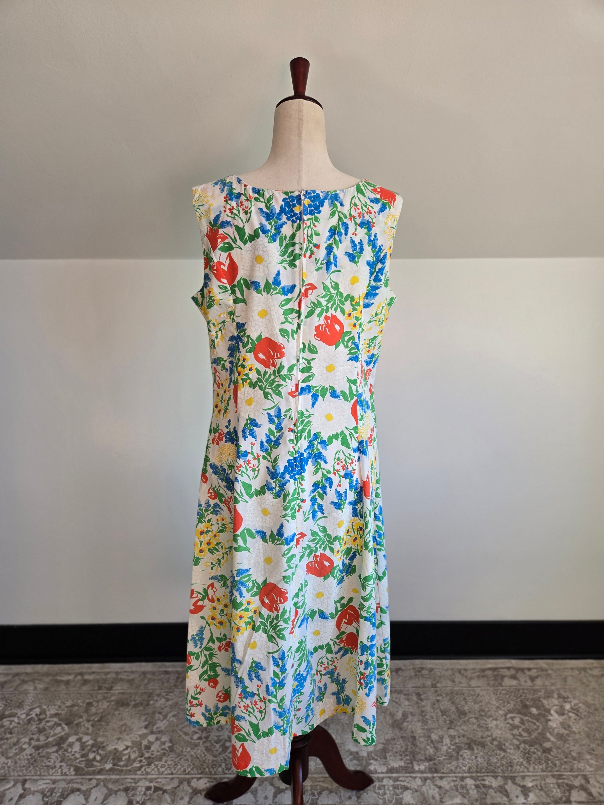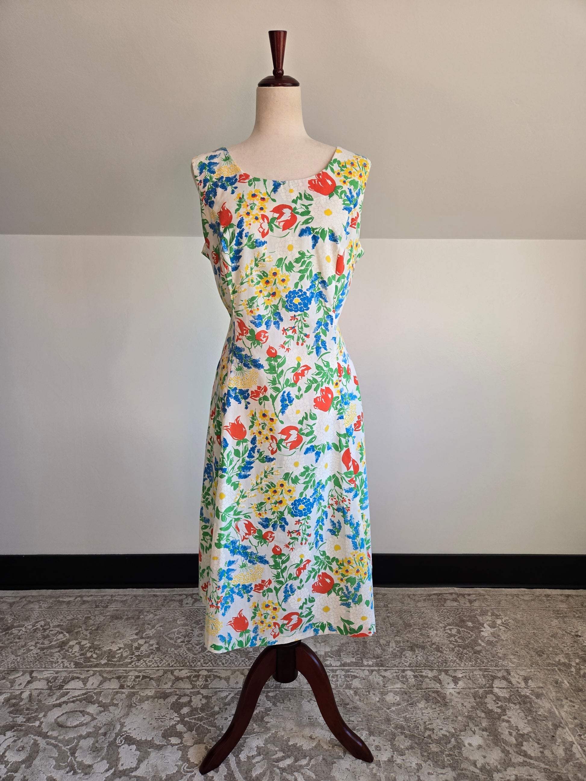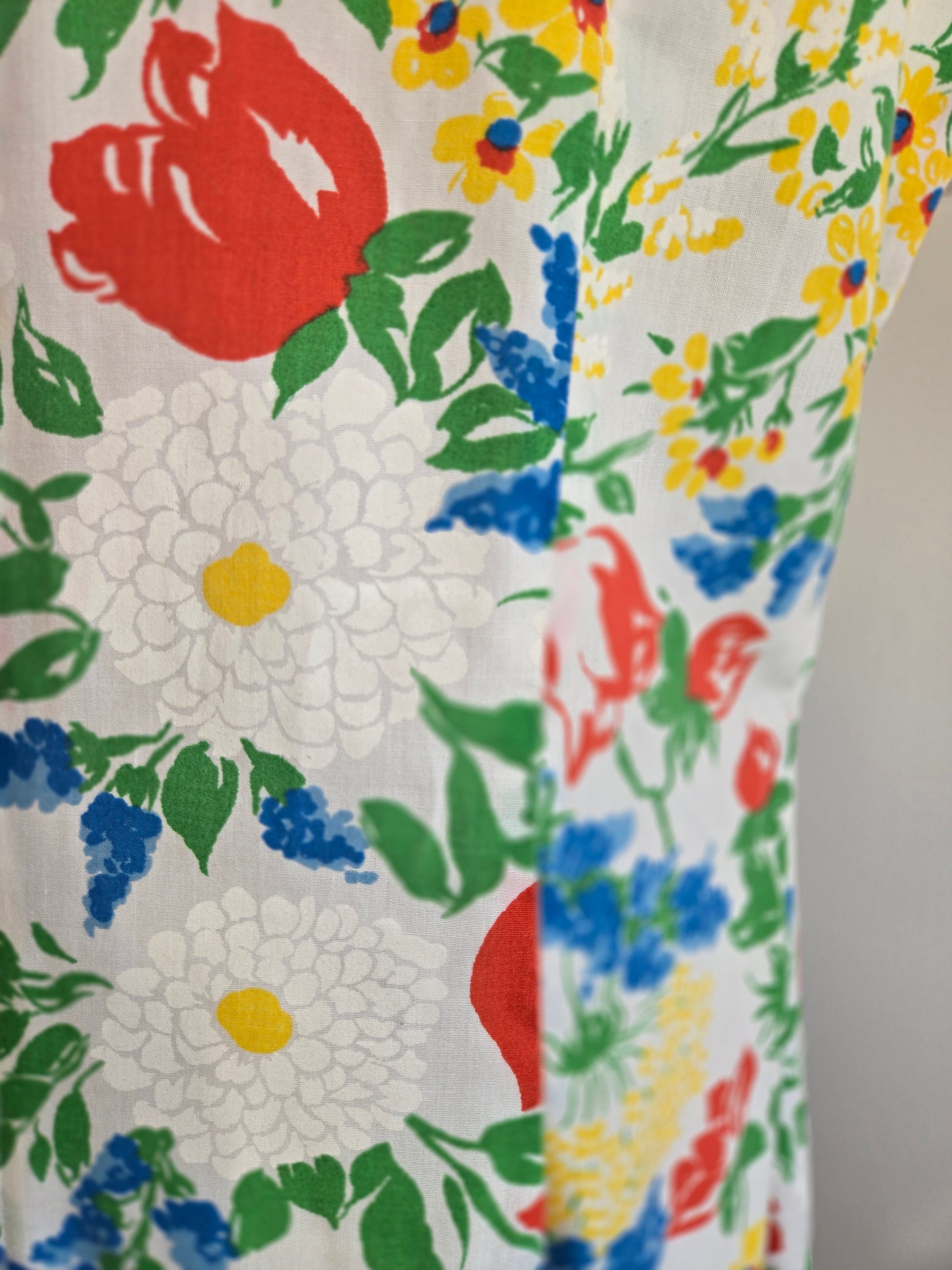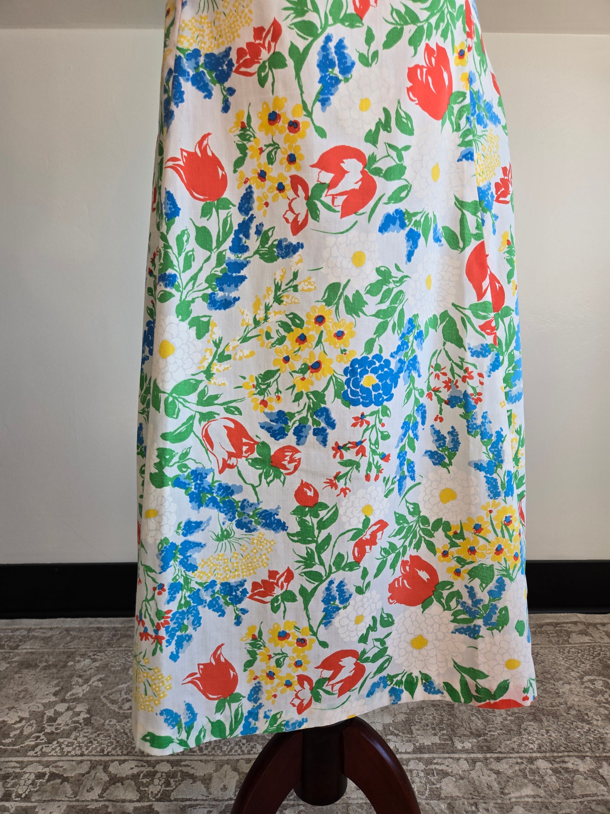 Rosemary Long for New Perspective vintage primary color floral print 60s dress. It is a white base and has a really cute shape. It zips in the back and has been washed and steamed. It is in perfect condition.