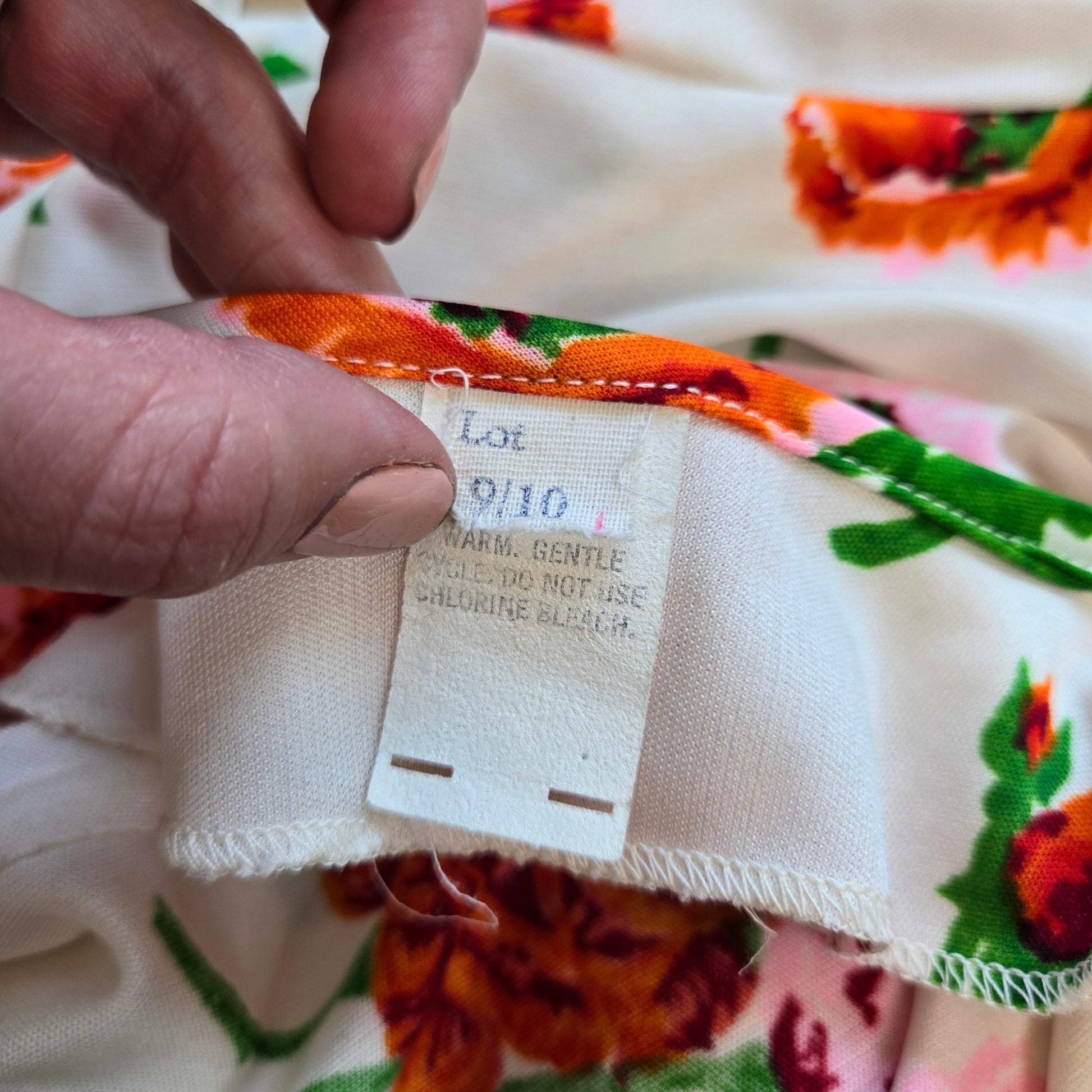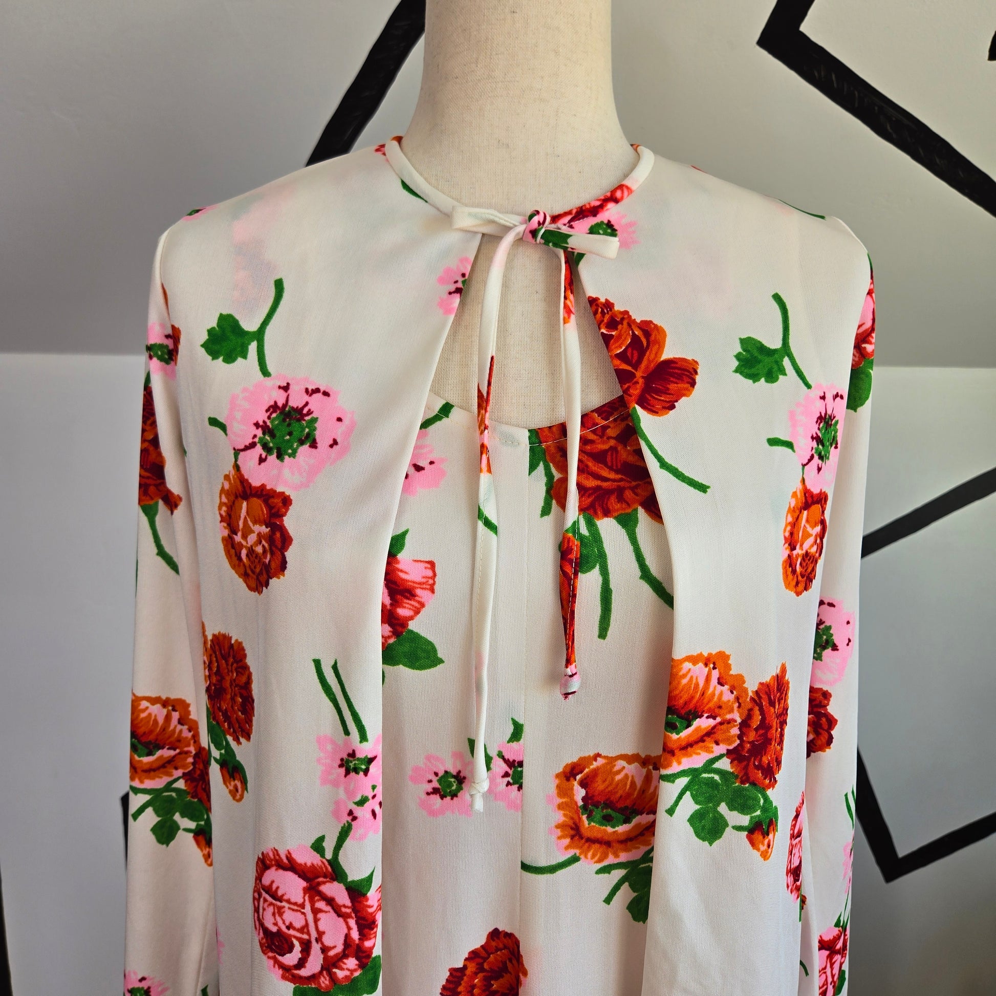 Vintage 1970s white based sleeveless maxi dress with pink and red florals. It has a matching little jacket/cardigan that has a tie at the collar in the center front. The dress zips down the back. It is in perfect condition.
