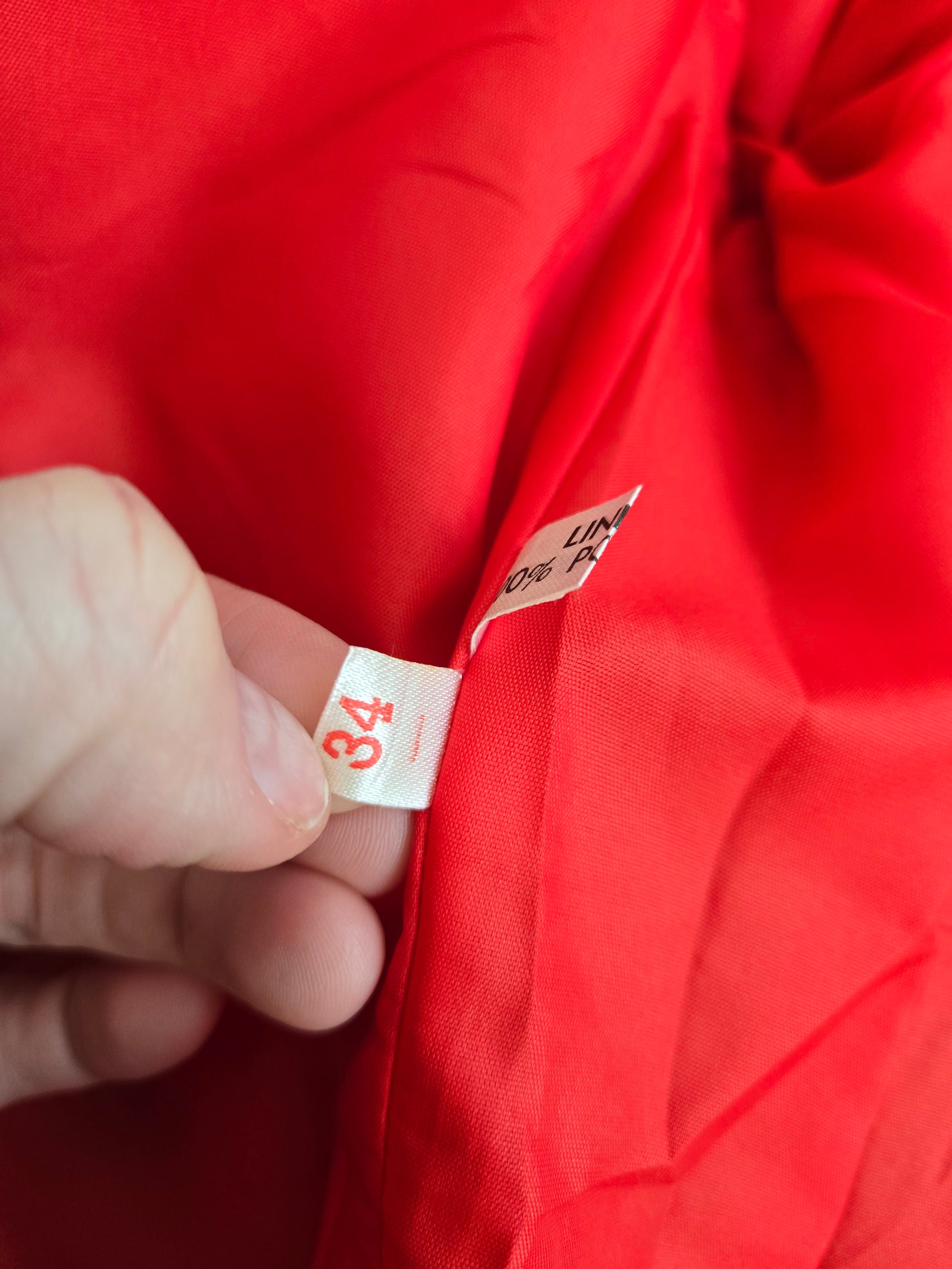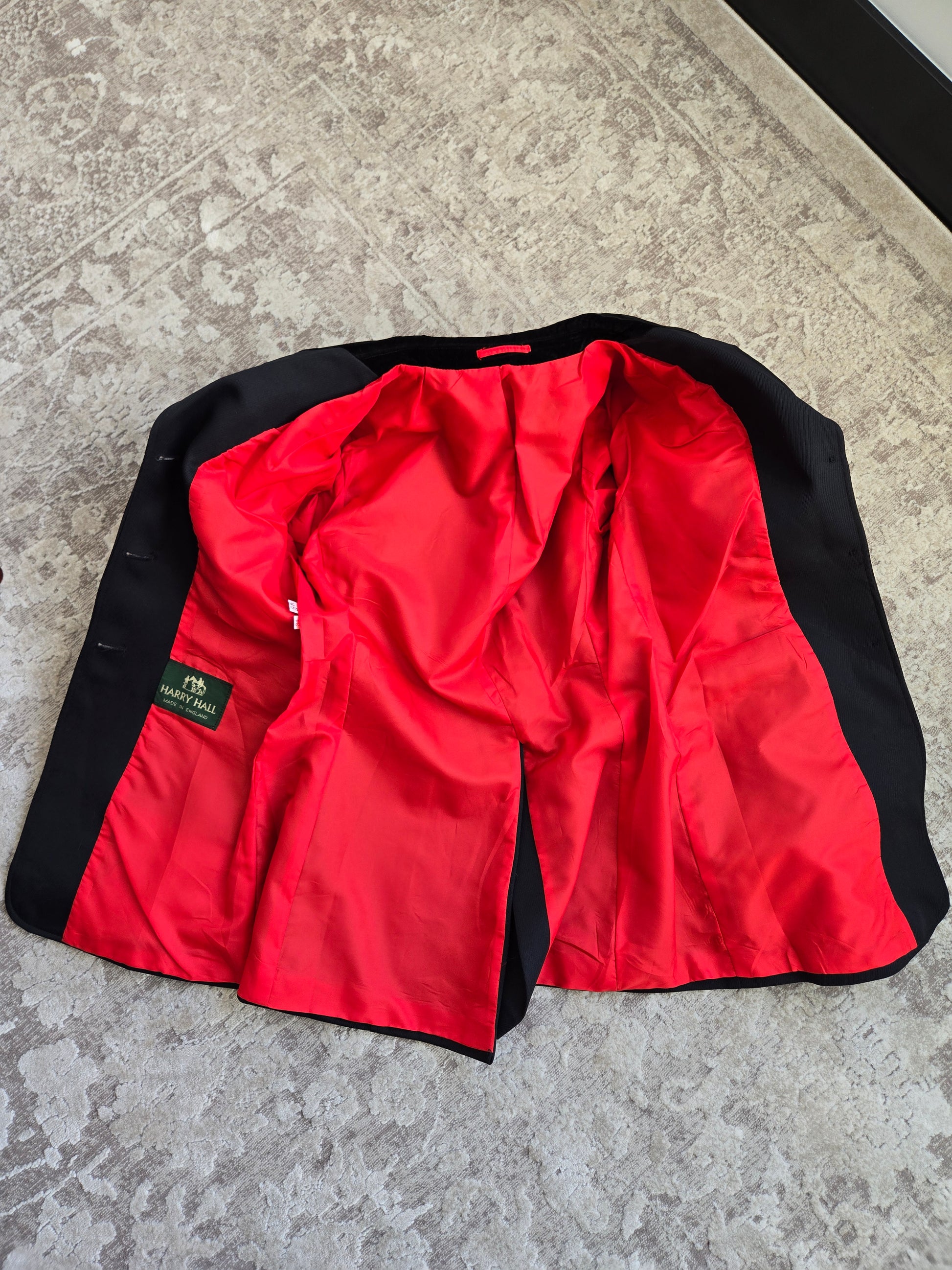 Harry Hall deadstock black equestrian blazer made in England. It is a very tailored and beautiful blazer with equestrian accents like the buttons on the back and the kick split in the tail. It has a bright red silky liner for a gorgeous color pop. All tags are still in tact, and it is in perfect condition.