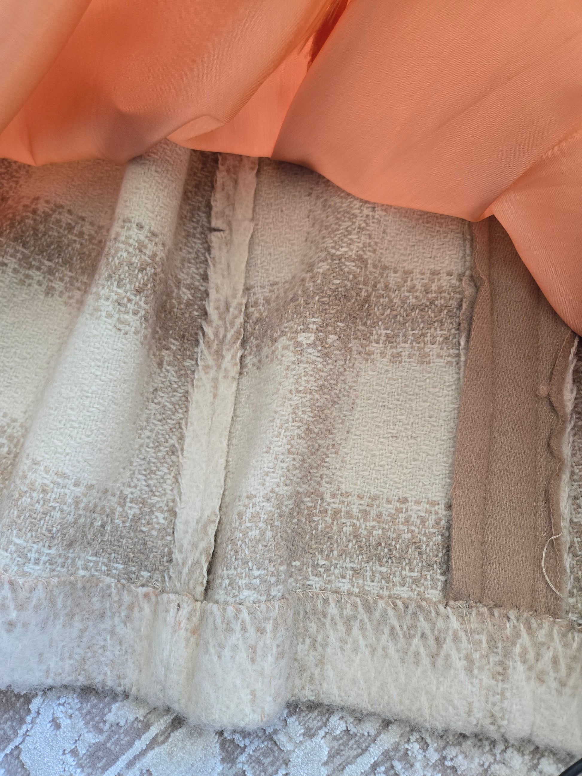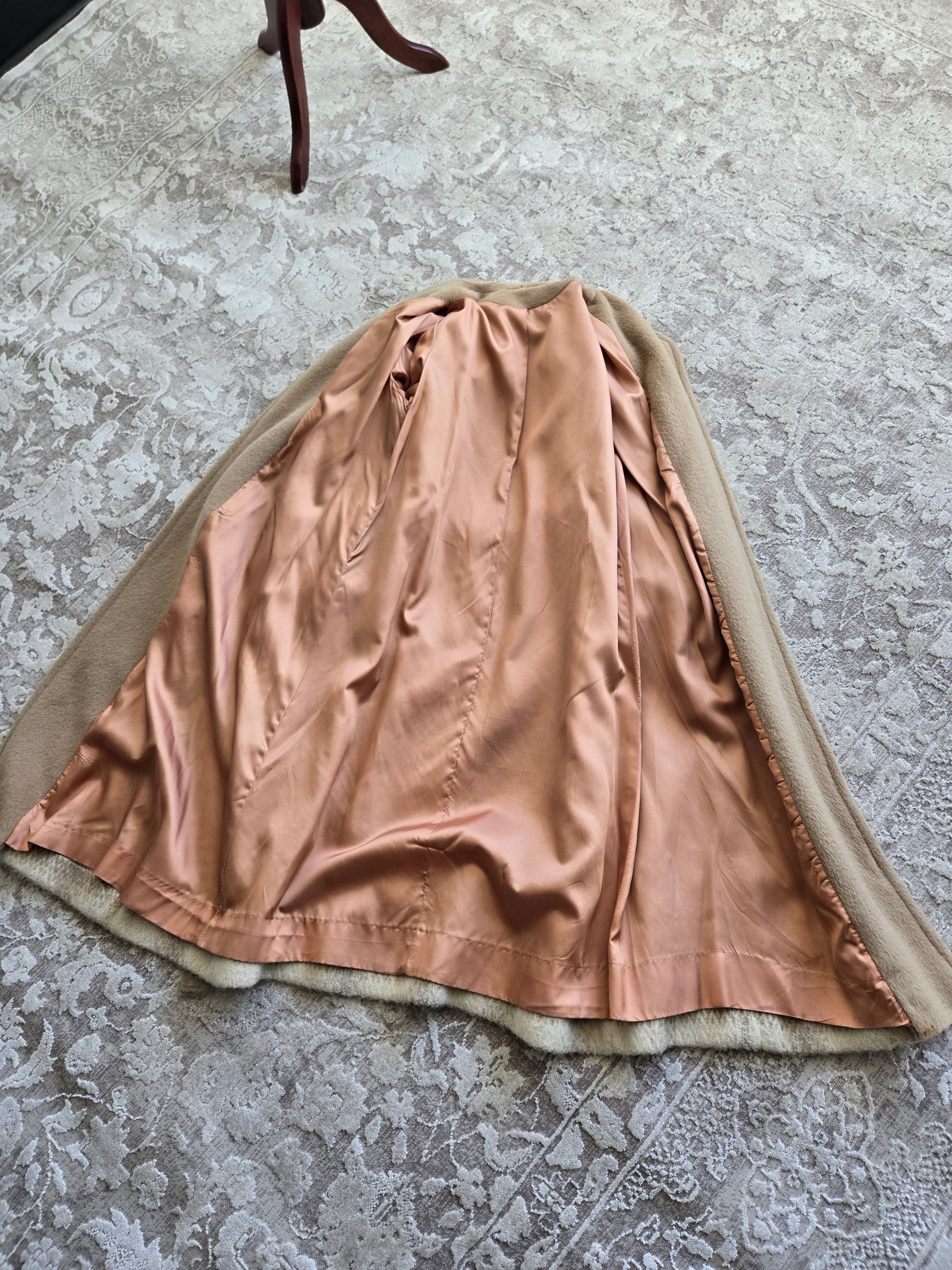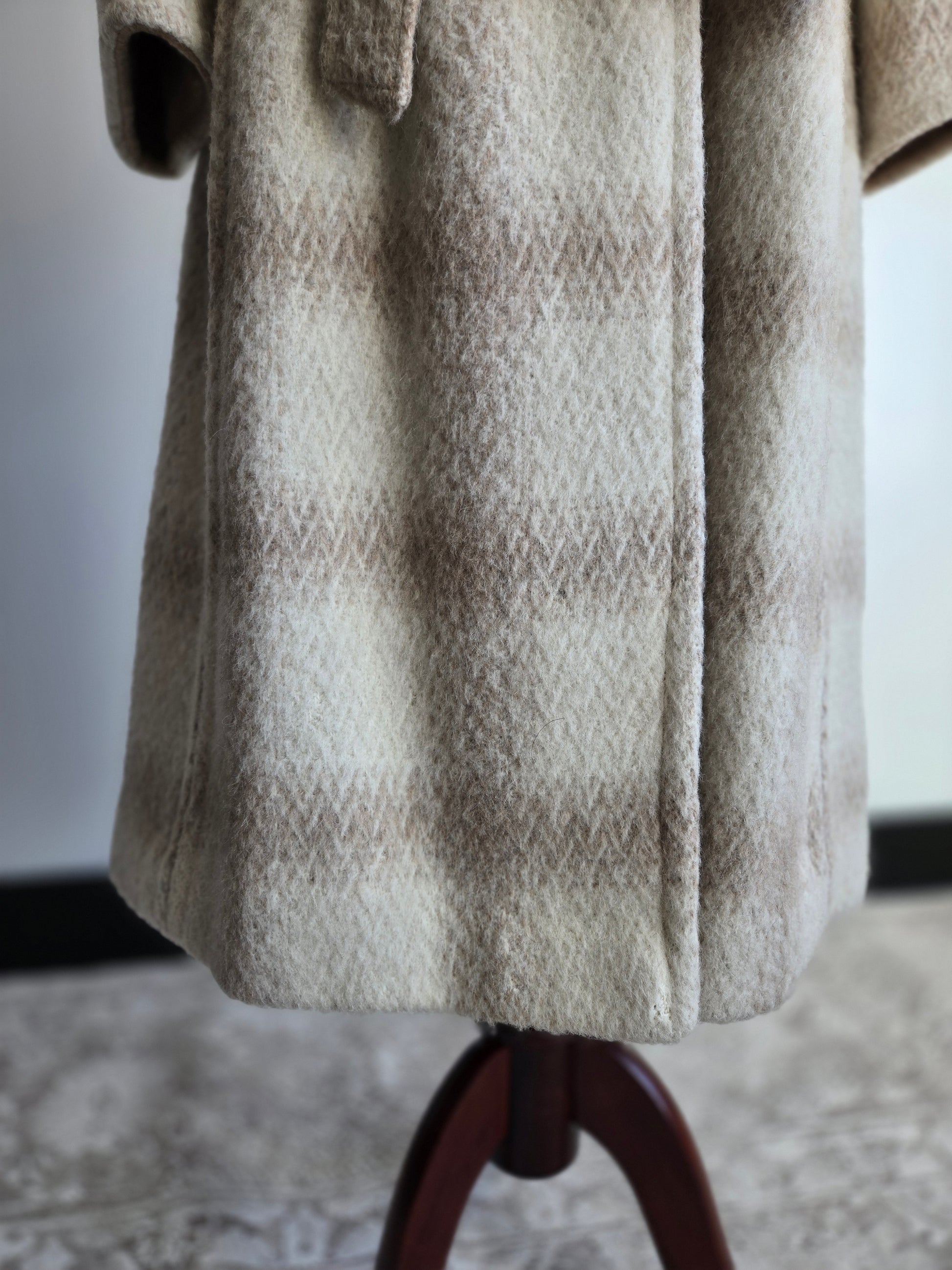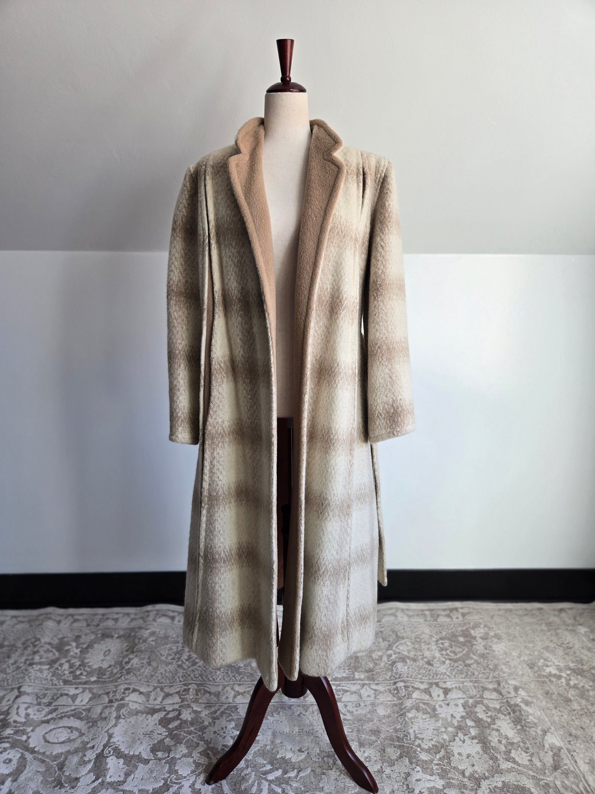 Gorgeous 1950s wool over coat in a tan and ivory plaid with a stunning mod neckline and ruching at shoulder seams. It has a matching waist tie for the closure at center front. No other closures or buttons. There is unique pleat work down each side of the jacket that hides the hand pockets into the design. There is a peachy colored satin liner on the inside that is in amazing condition for it's age.