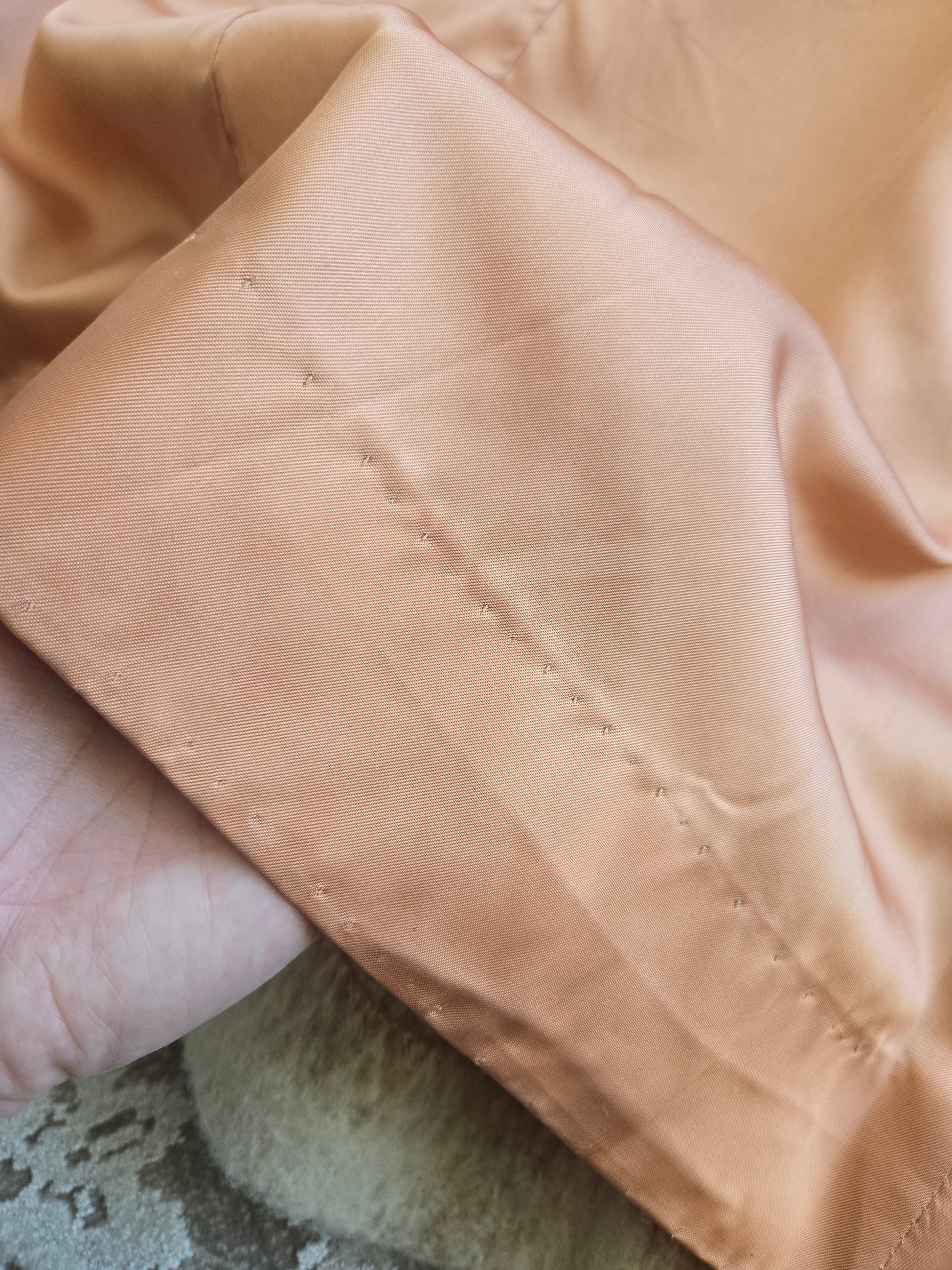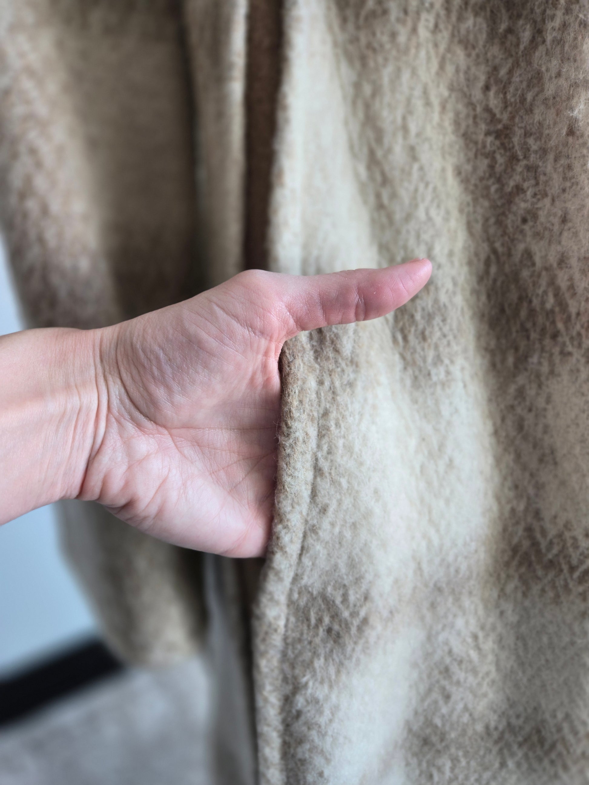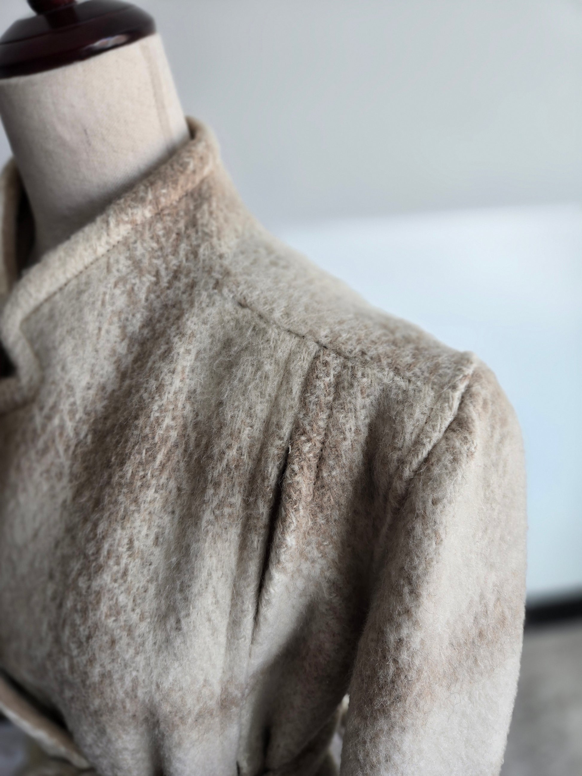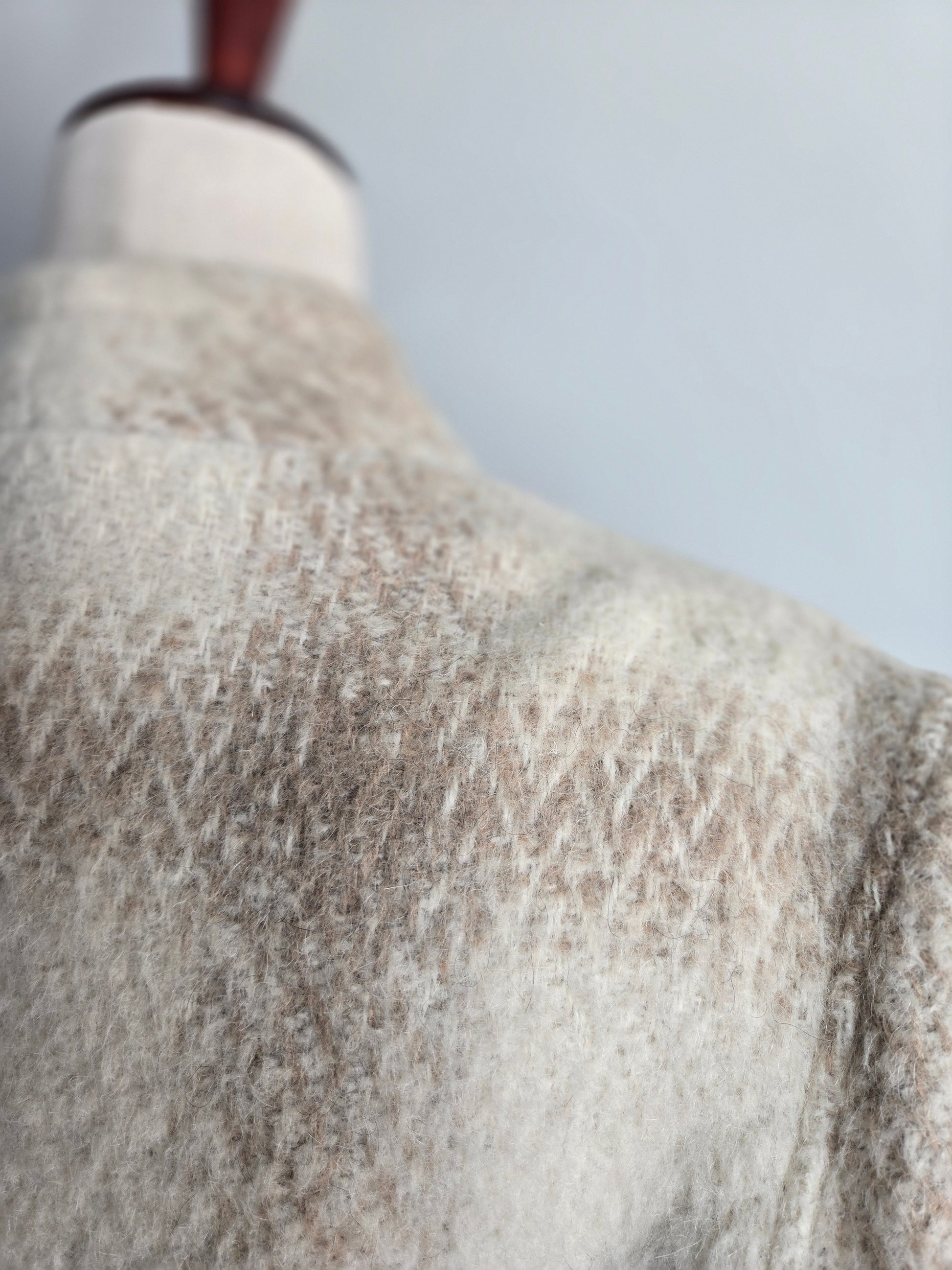 Gorgeous 1950s wool over coat in a tan and ivory plaid with a stunning mod neckline and ruching at shoulder seams. It has a matching waist tie for the closure at center front. No other closures or buttons. There is unique pleat work down each side of the jacket that hides the hand pockets into the design. There is a peachy colored satin liner on the inside that is in amazing condition for it's age.