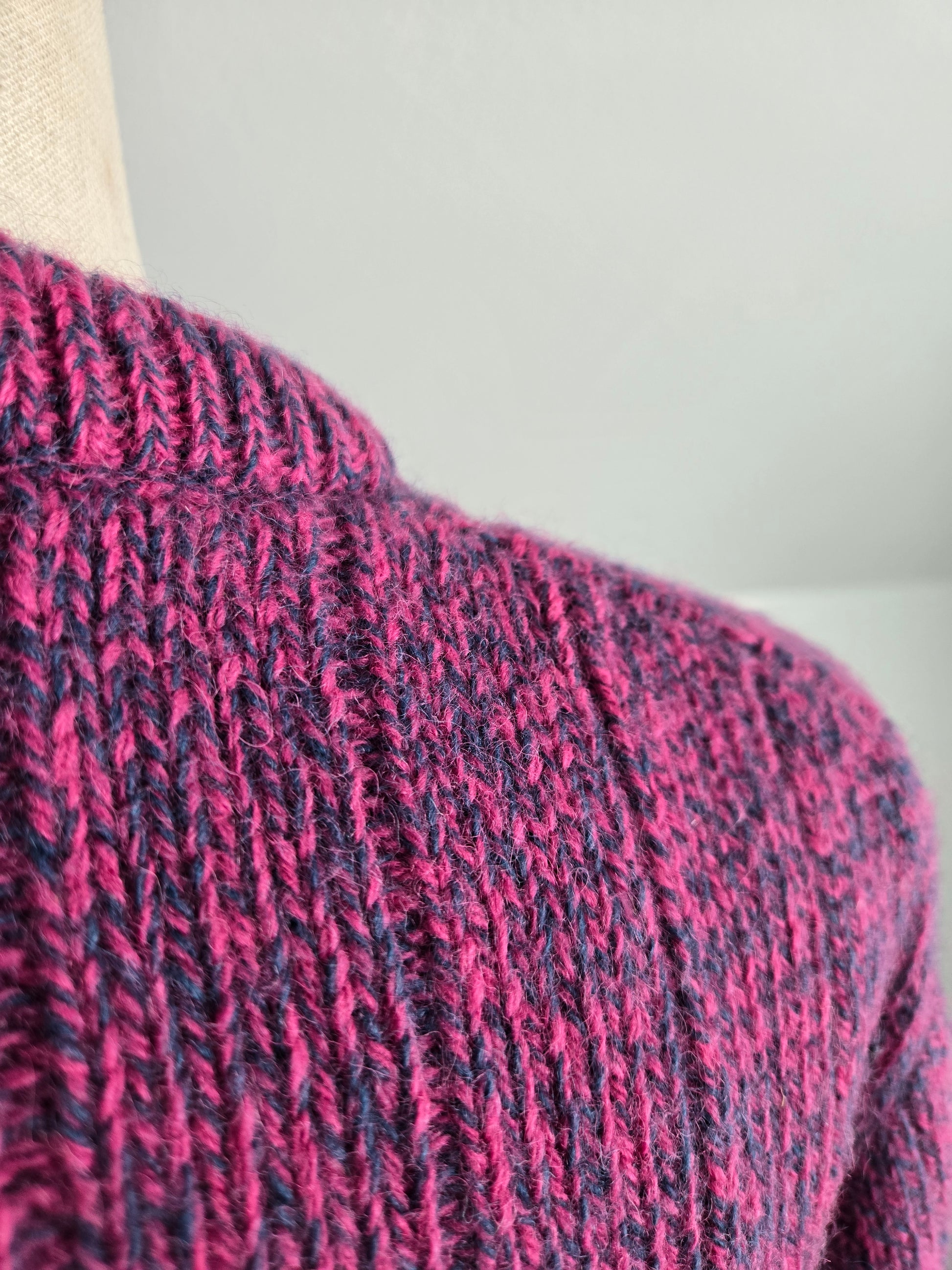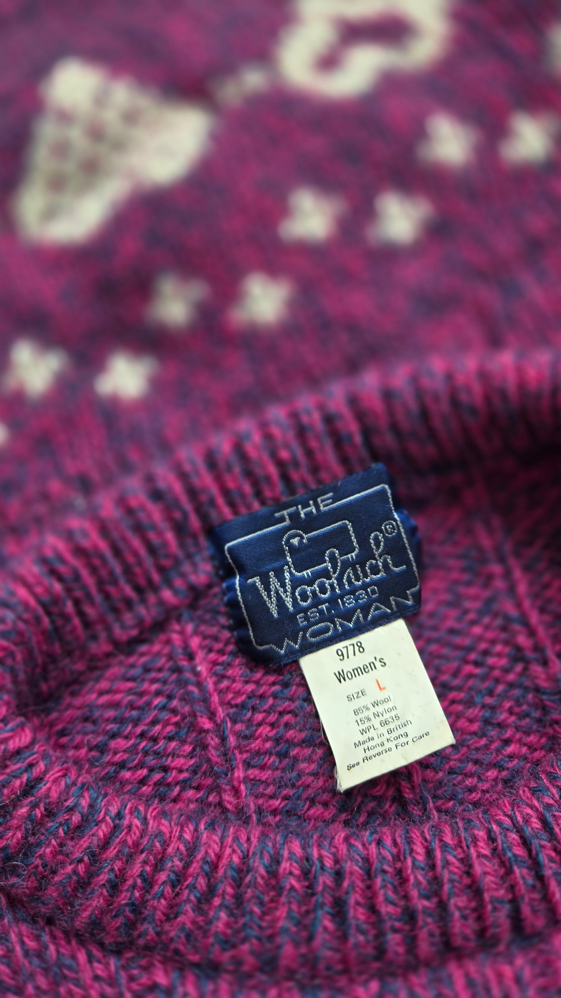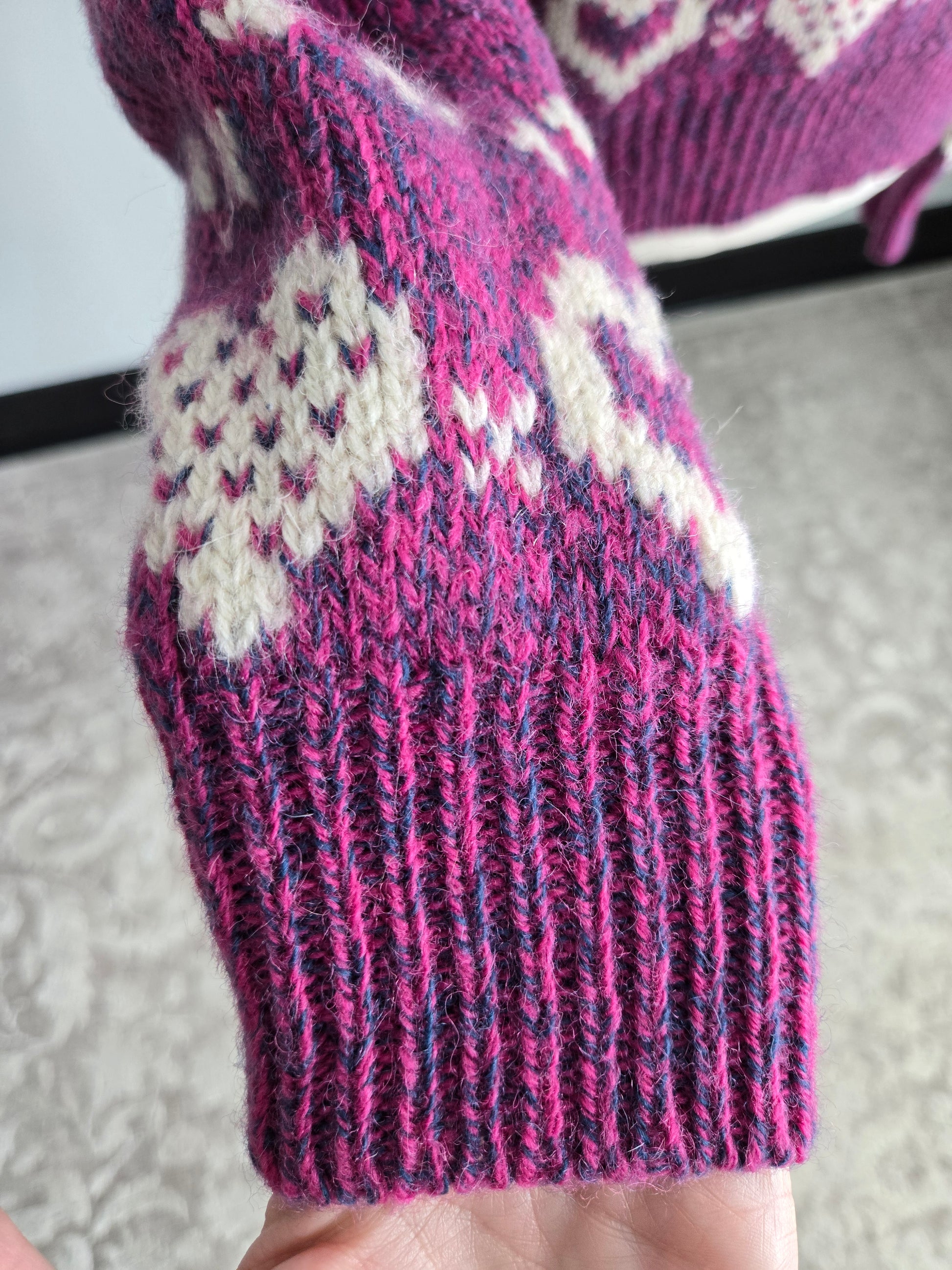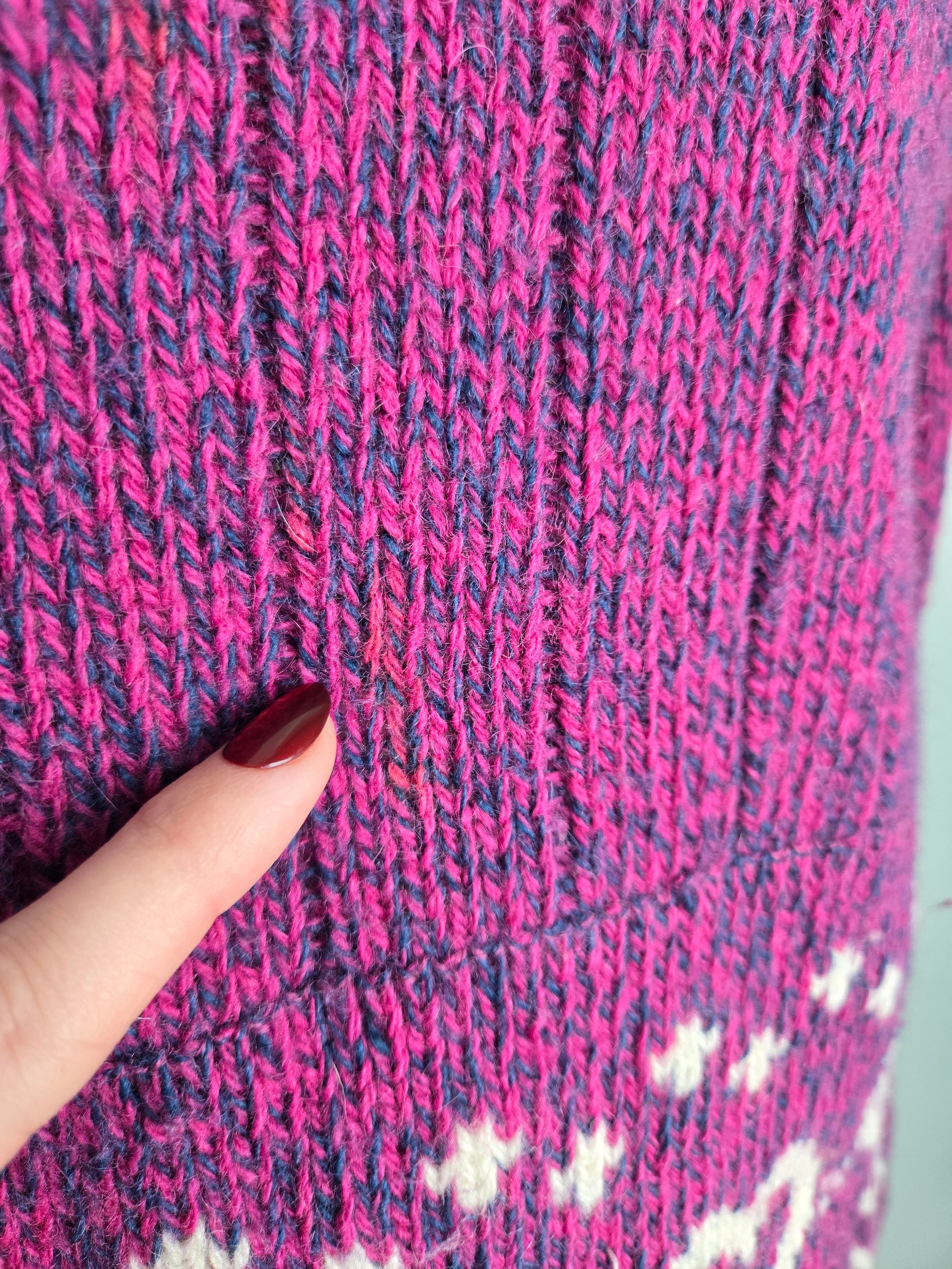 Vintage 1980s Woolrich sweater with hearts knitted in around the bottom hem and sleeves. Rob knit cuff and collar and a pink and purple heather yarn. Has been fully washed and depilled, but there is a small faint spot on the front that did not come out fully. It is pictured in the last picture. Very subtle but price reflects.
