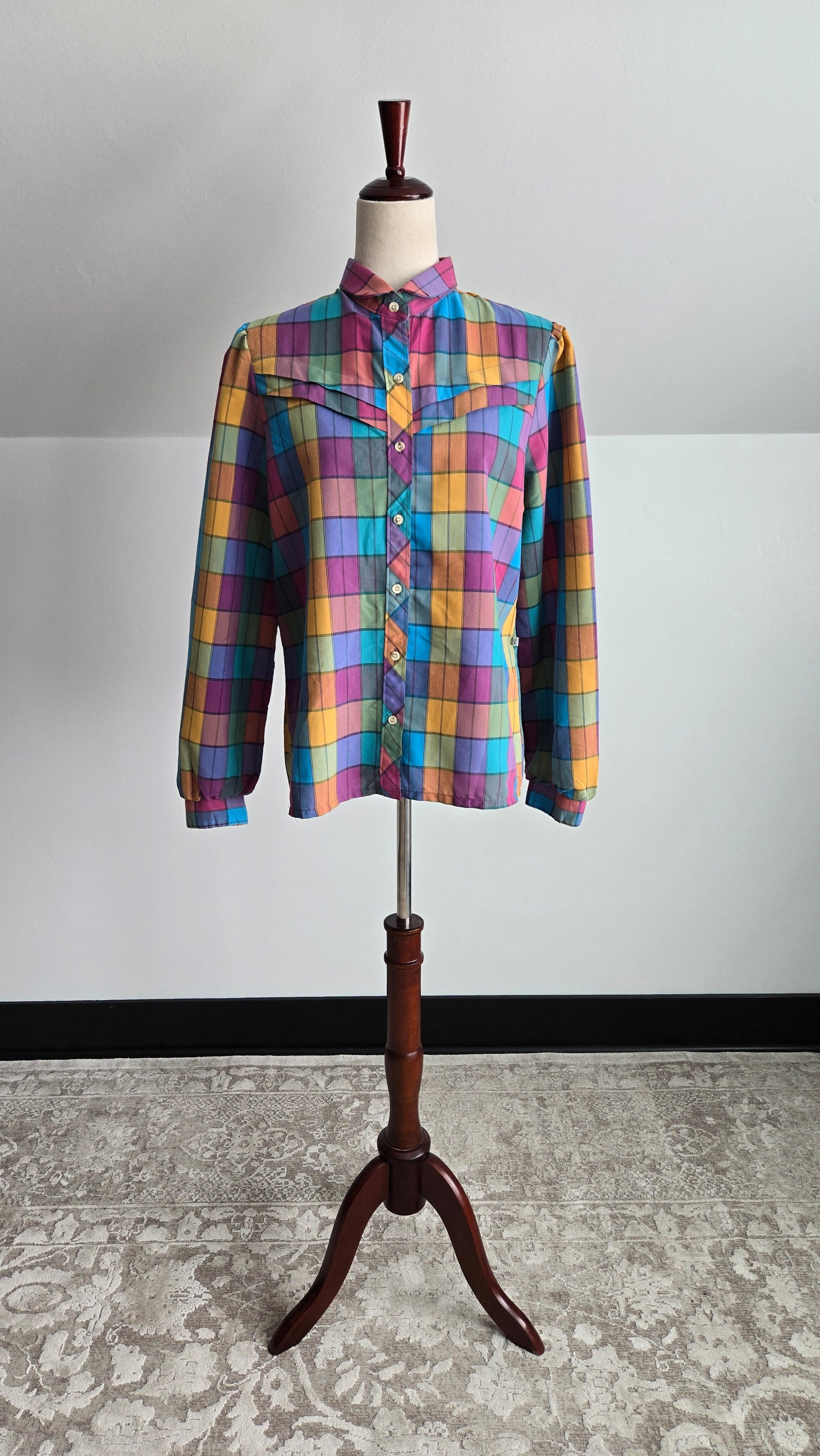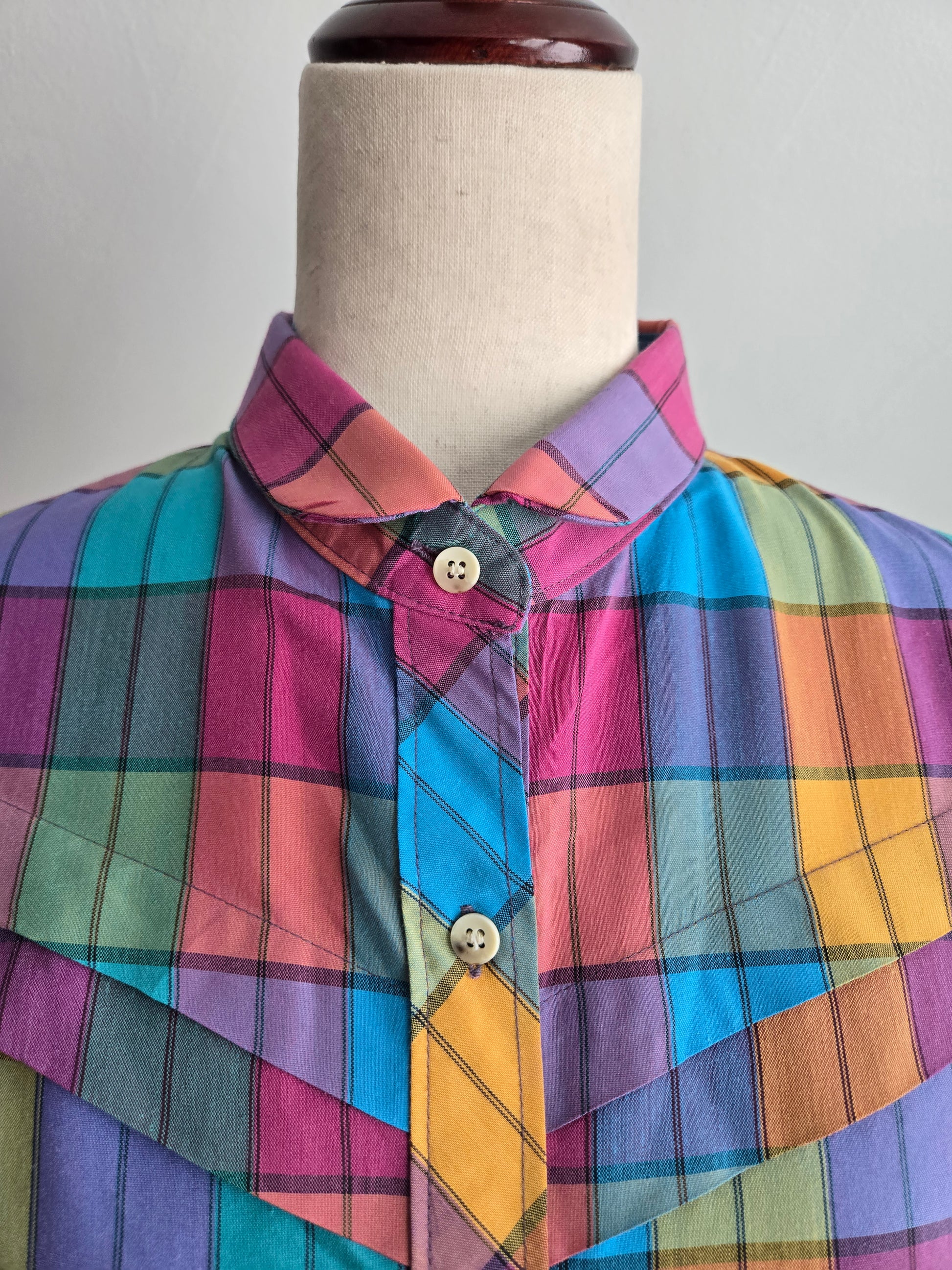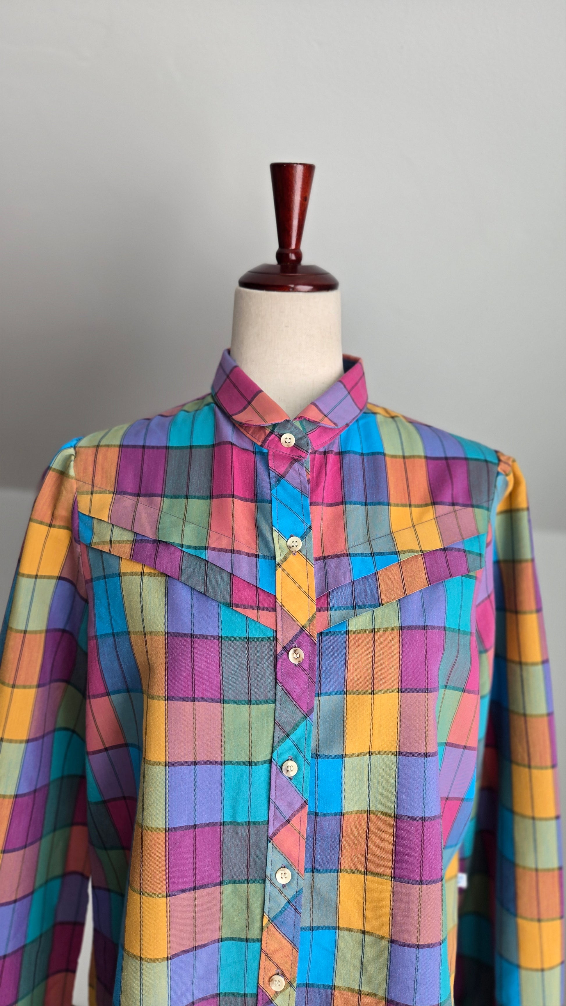 Wrangler vintage 70s colorful rainbow plaid button down western shirt. It has western pleated seam lines at the front and buttoned cuffs. There is a small horse woven label at the side seam. It is in perfect condition and freshly laundered.